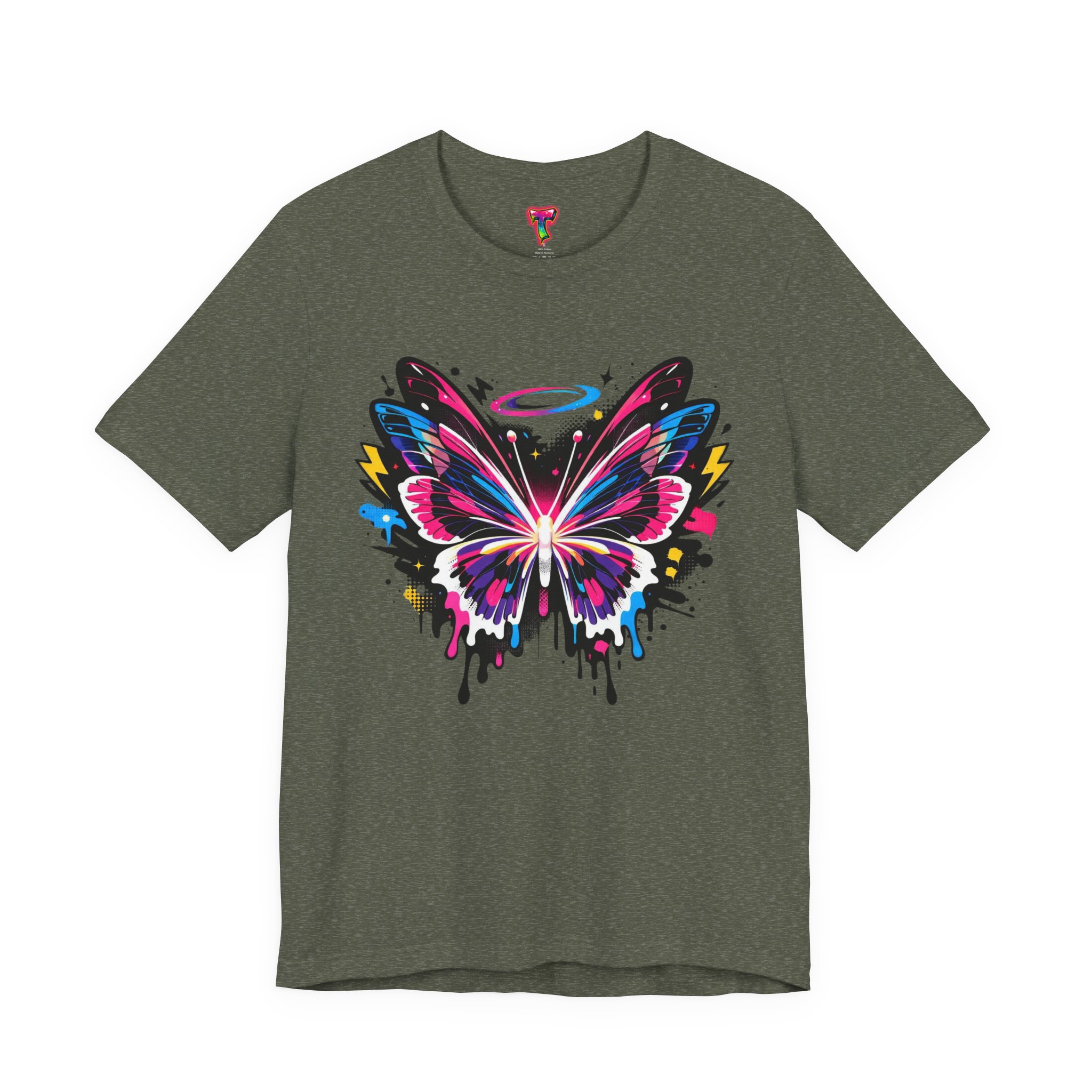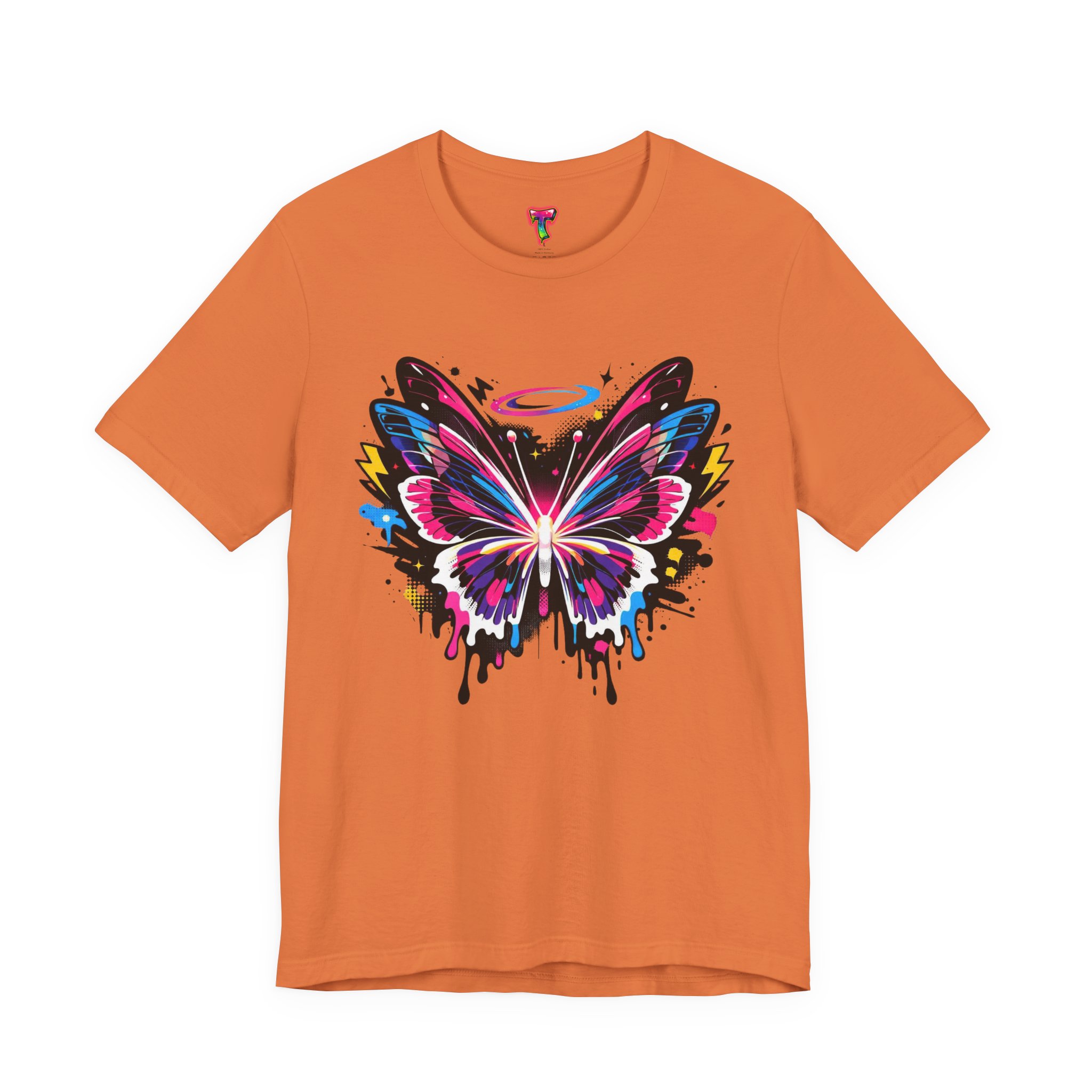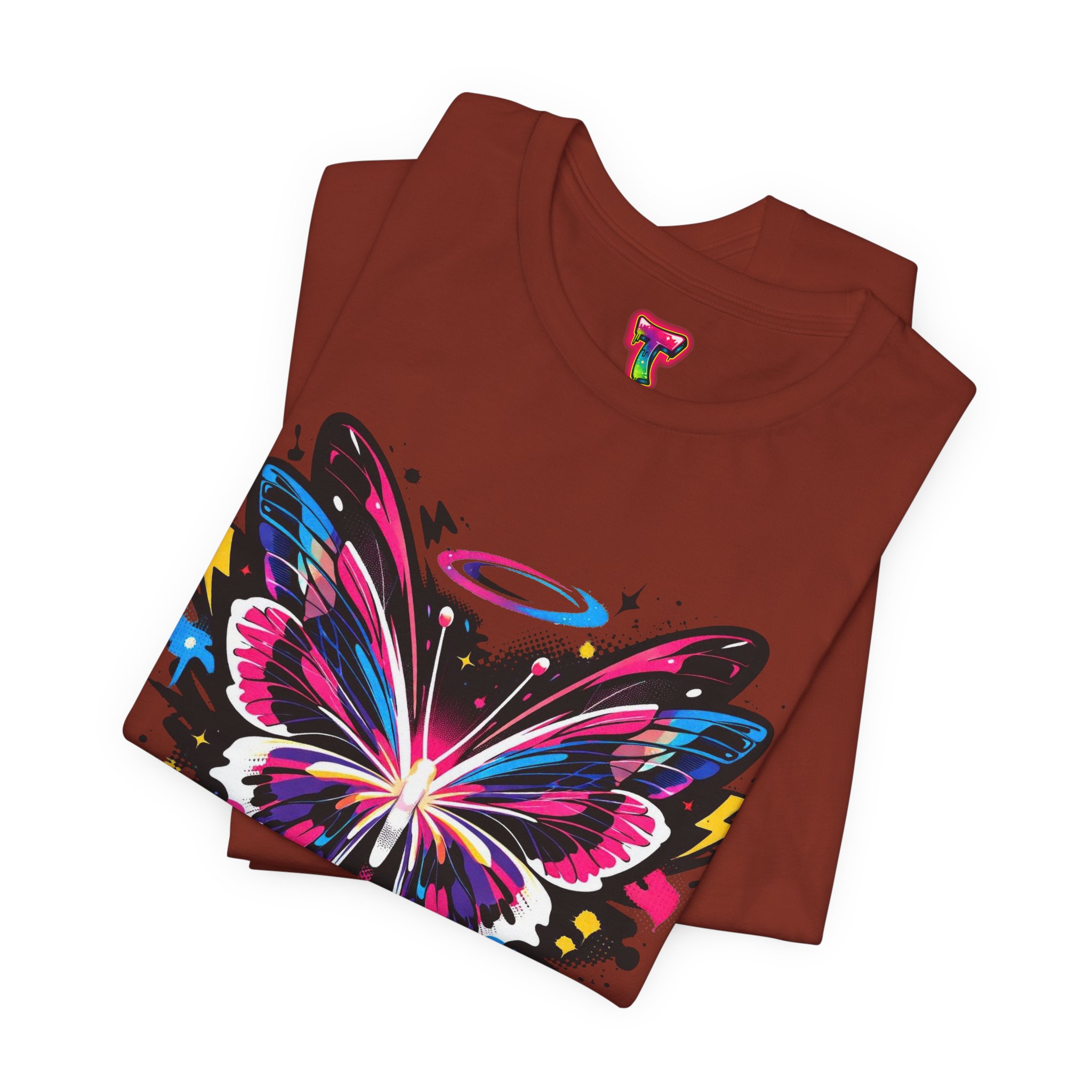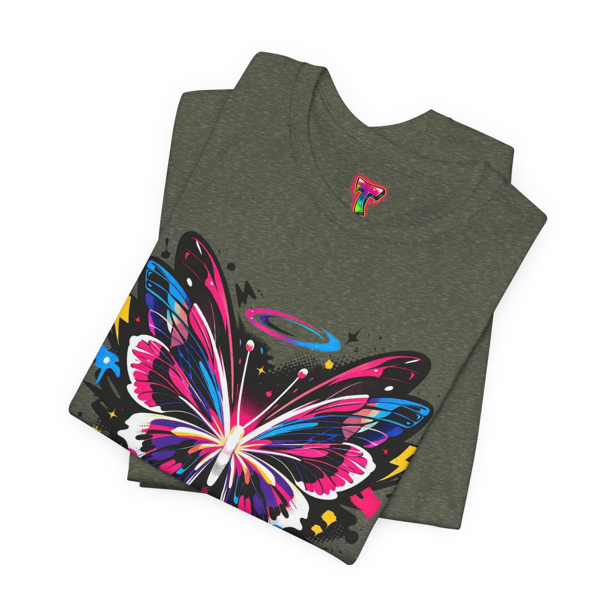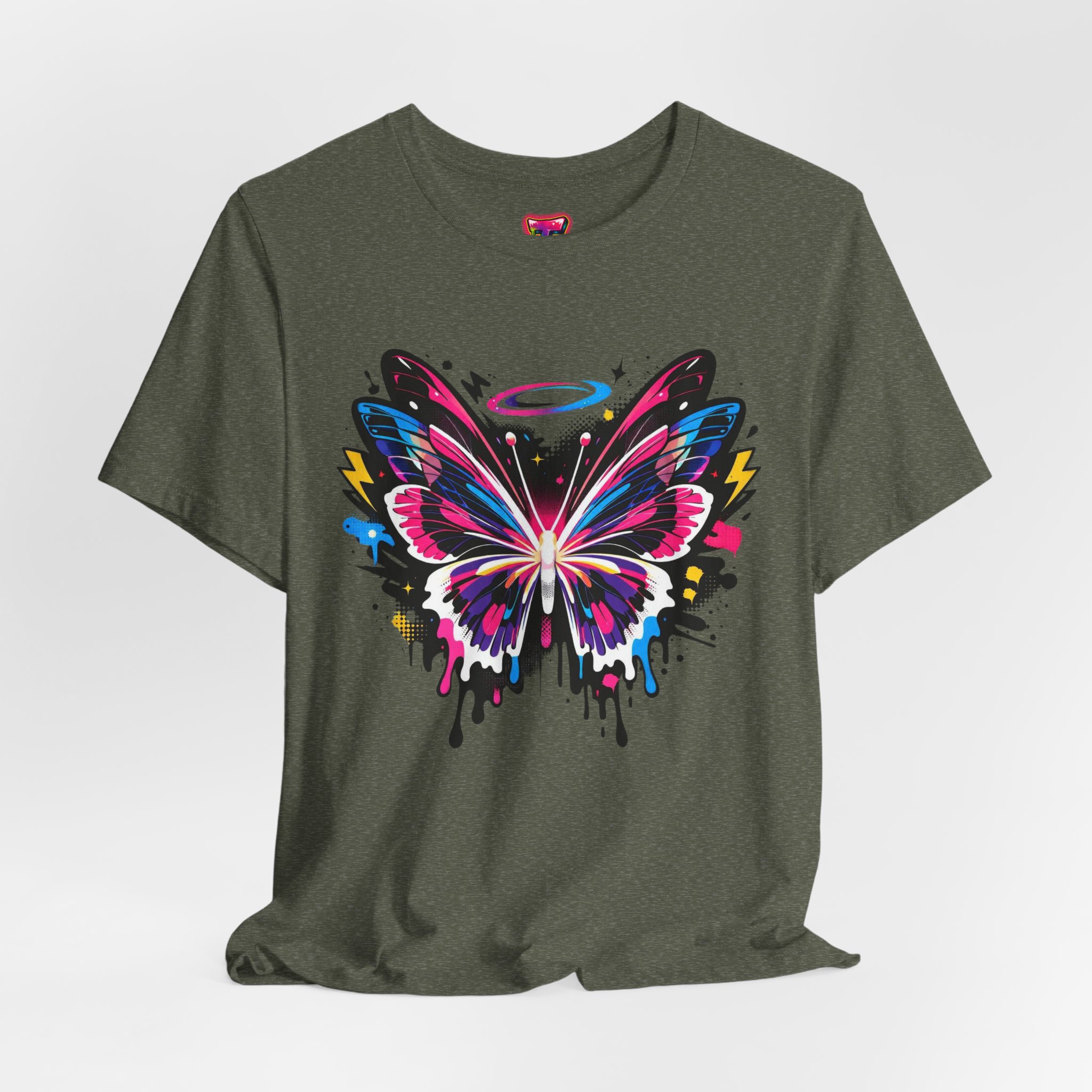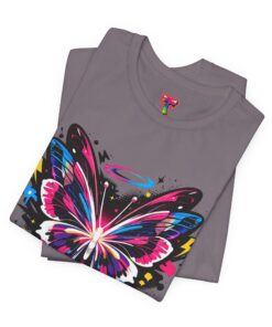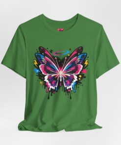 This lightweight jersey tee carries a bold, hand-illustrated butterfly that feels like an electric burst of color. Bright magenta and cyan blend with inky black drips and tiny star accents, giving the design an urban-street-art edge while keeping the silhouette clean and wearable. It settles comfortably at the shoulders and chest, then relaxes into a retail fit that layers easily under jackets or wears alone for a statement moment. The soft Airlume combed and ring-spun cotton feels smooth against skin, while the ribbed collar and side seams keep the shape crisp through repeated wear. Ethically produced and REACH certified, the shirt pairs expressive graphics with responsible manufacturing.