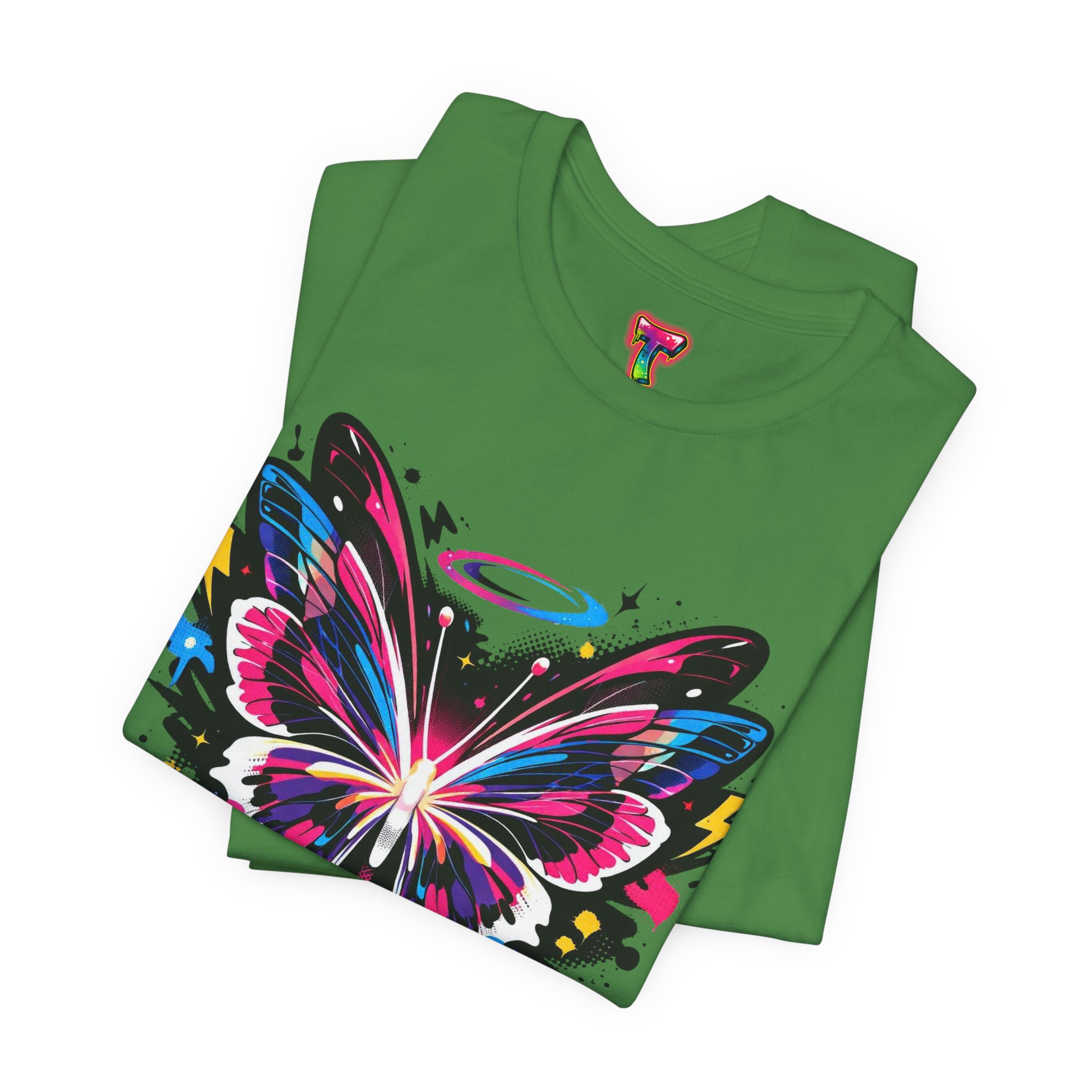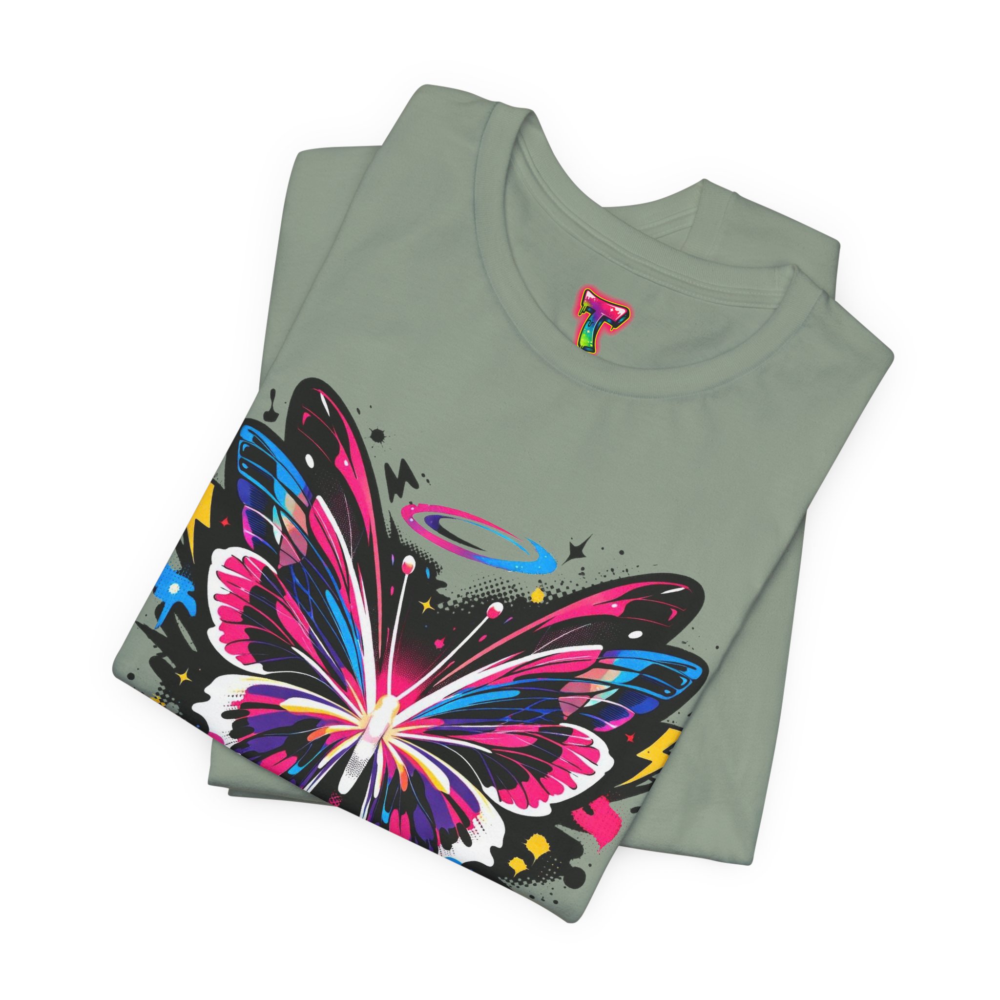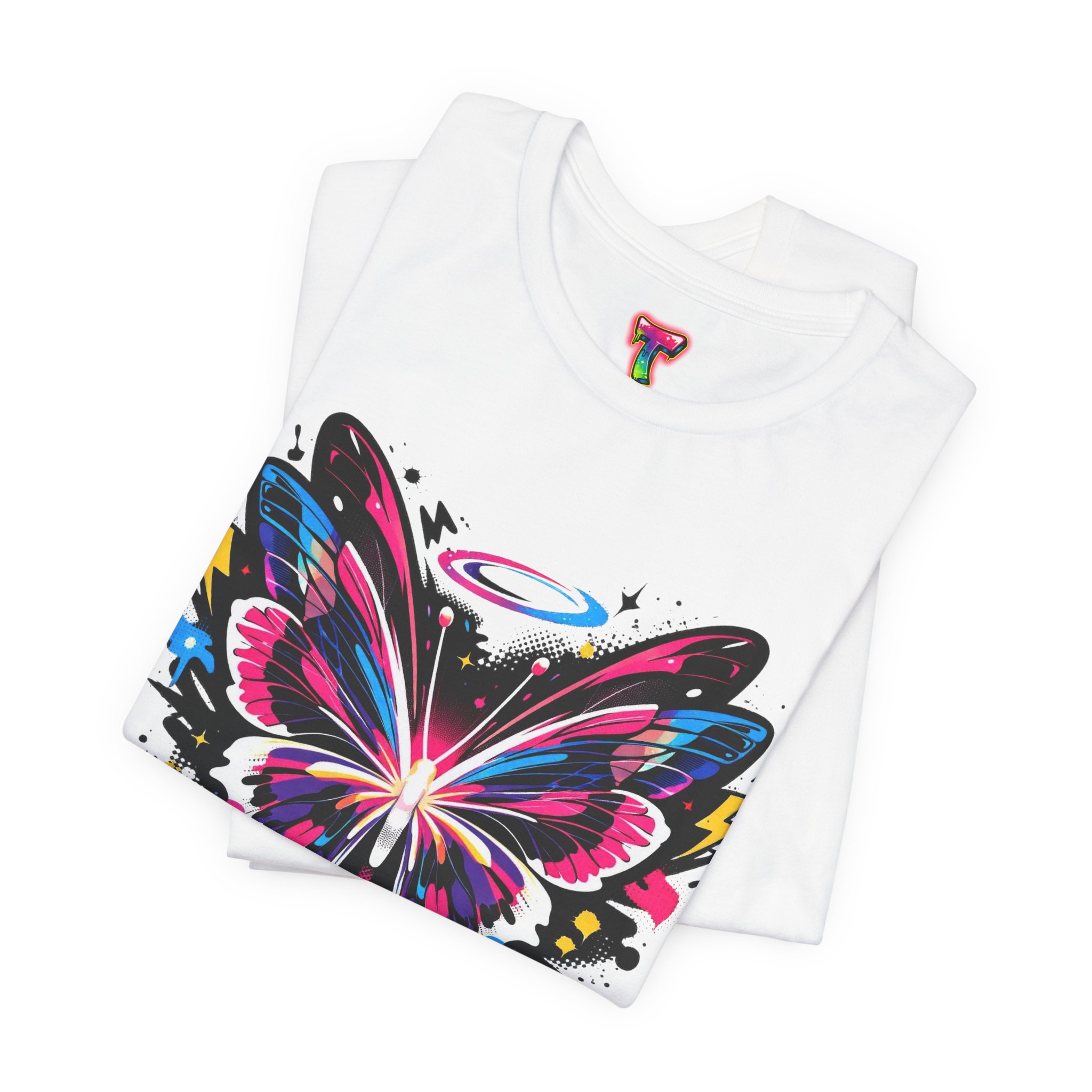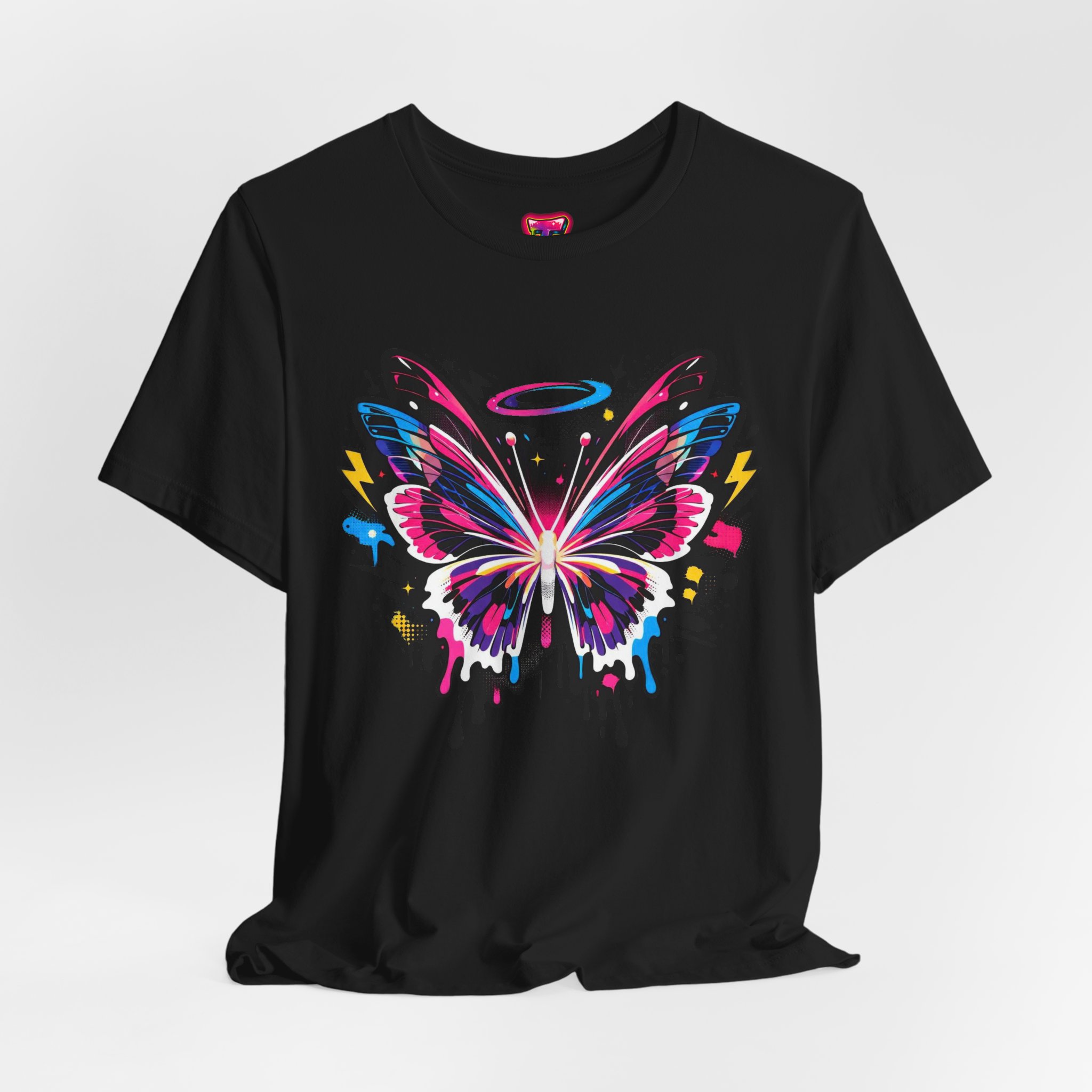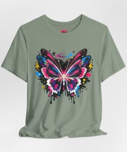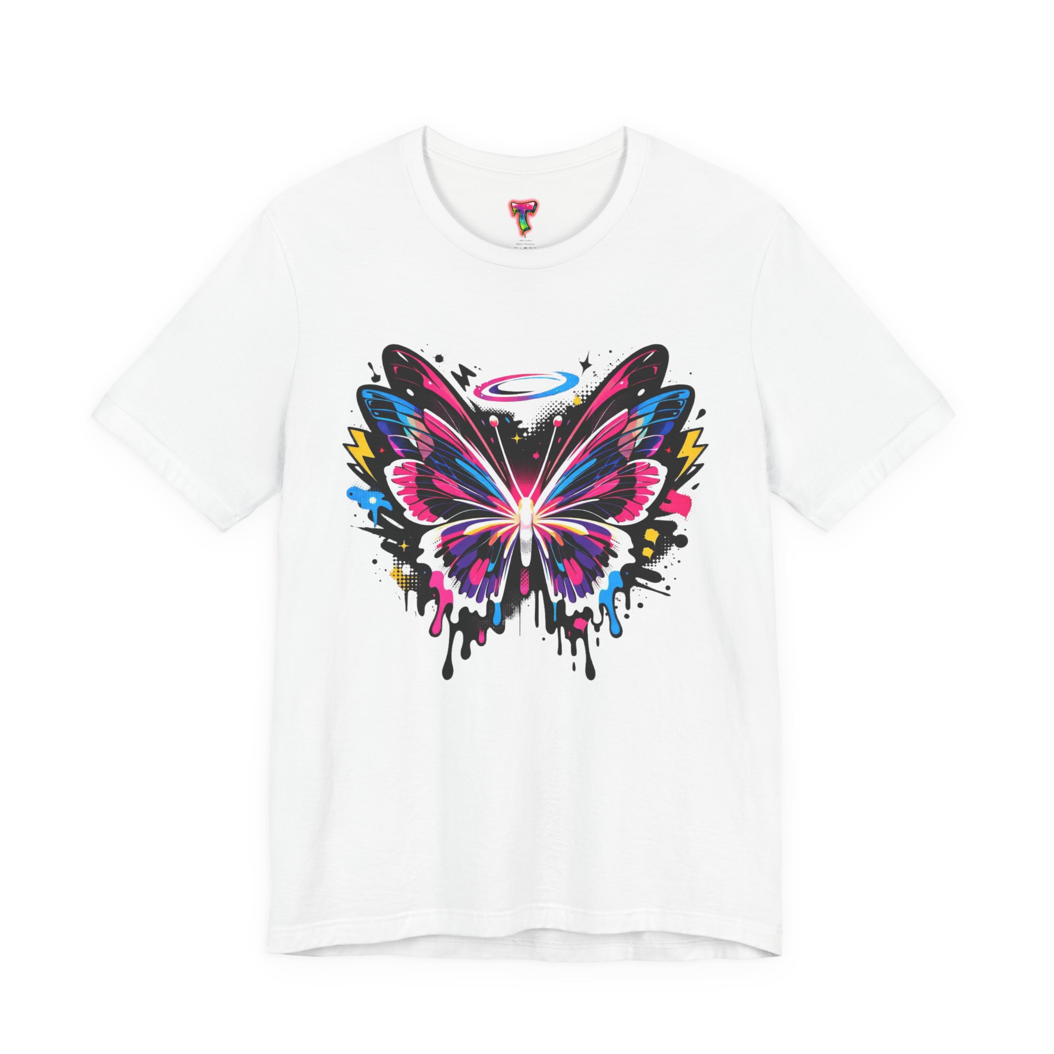 This lightweight jersey tee carries a bold, hand-illustrated butterfly that feels like an electric burst of color. Bright magenta and cyan blend with inky black drips and tiny star accents, giving the design an urban-street-art edge while keeping the silhouette clean and wearable. It settles comfortably at the shoulders and chest, then relaxes into a retail fit that layers easily under jackets or wears alone for a statement moment. The soft Airlume combed and ring-spun cotton feels smooth against skin, while the ribbed collar and side seams keep the shape crisp through repeated wear. Ethically produced and REACH certified, the shirt pairs expressive graphics with responsible manufacturing.