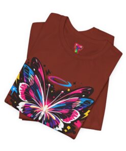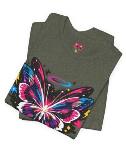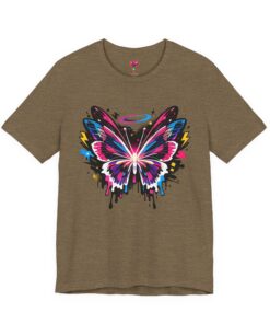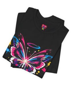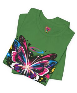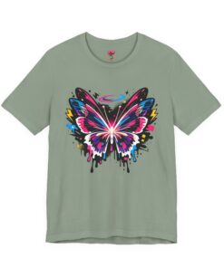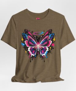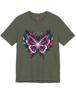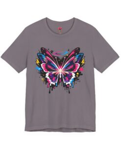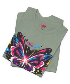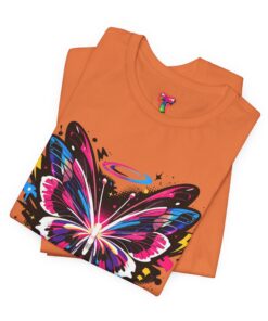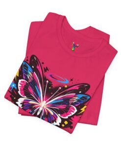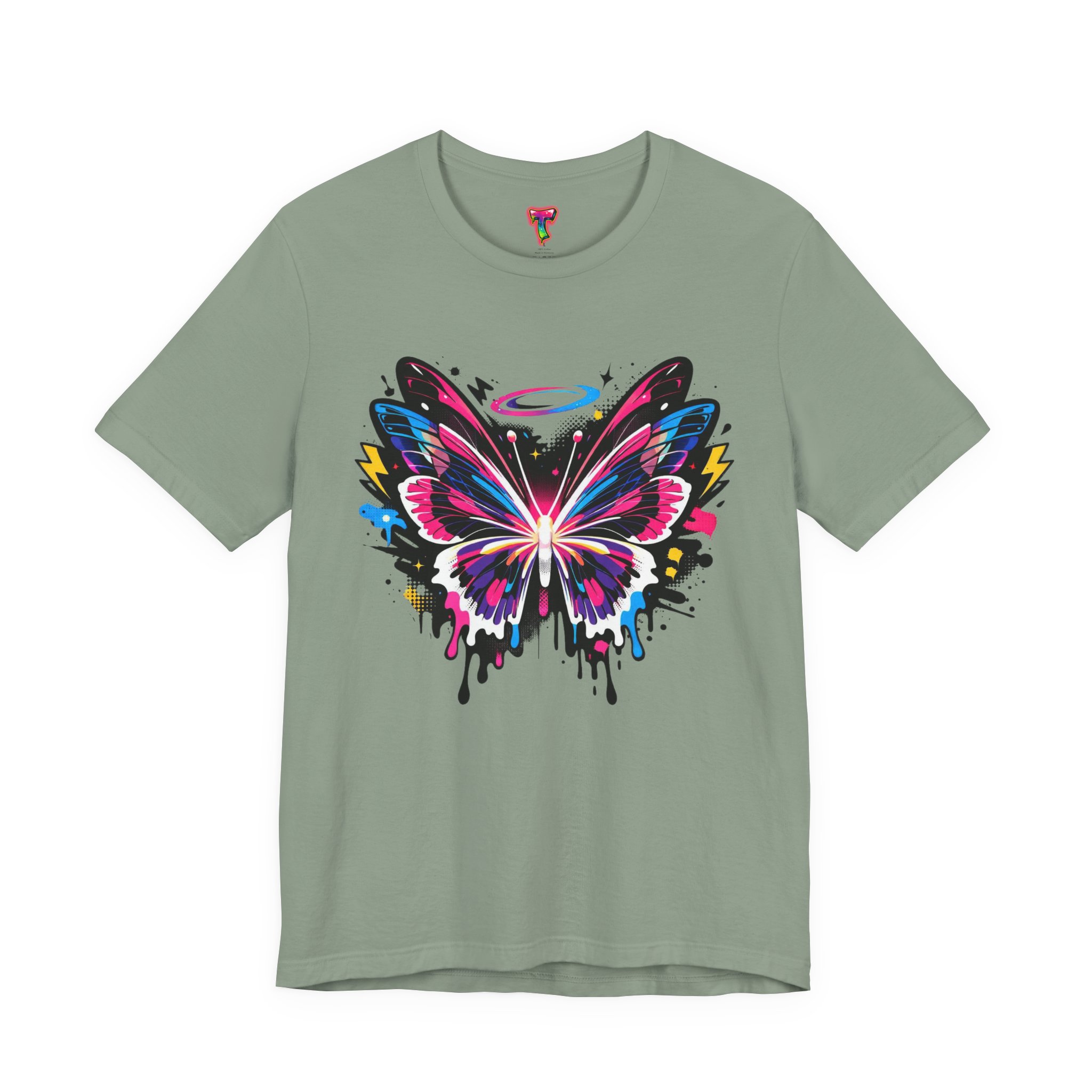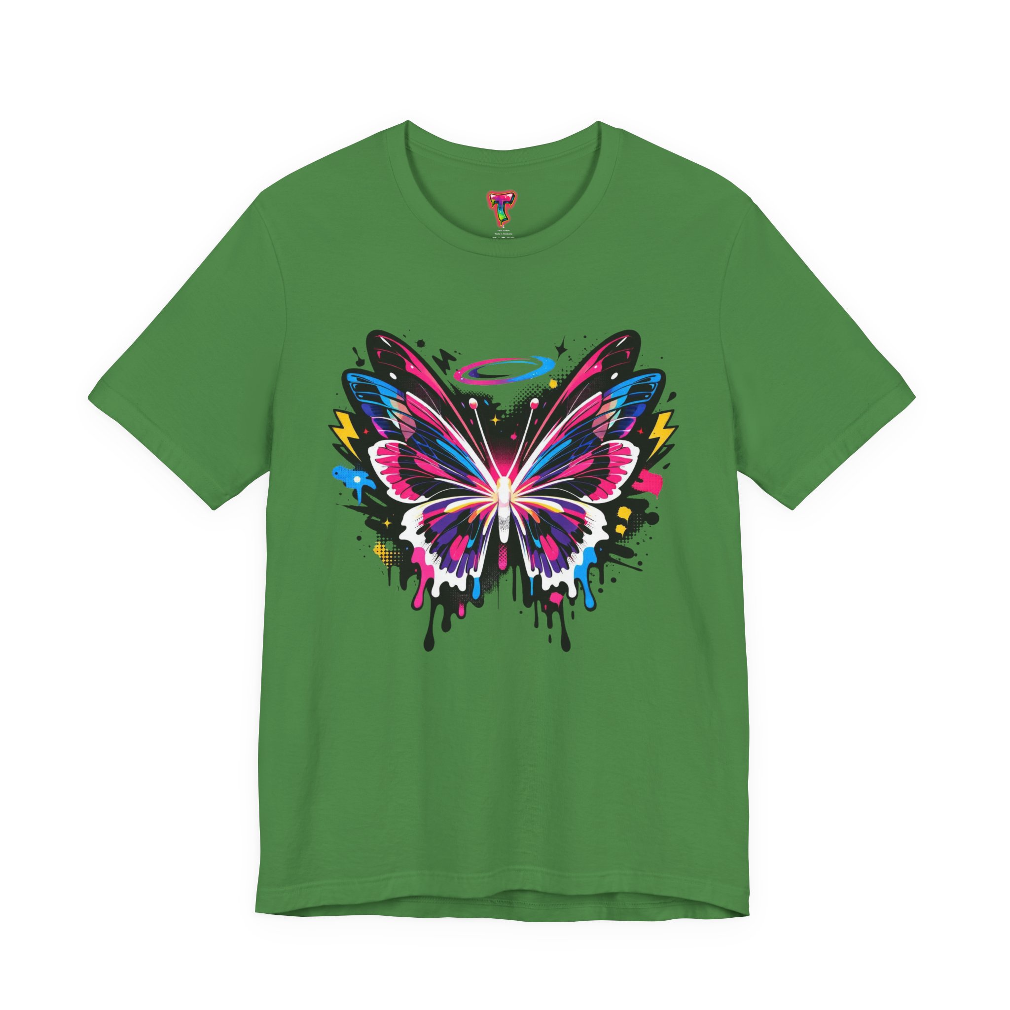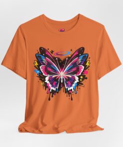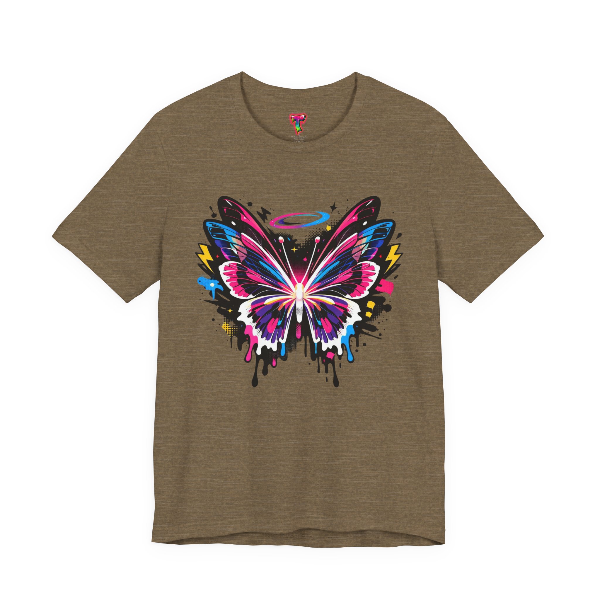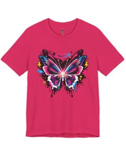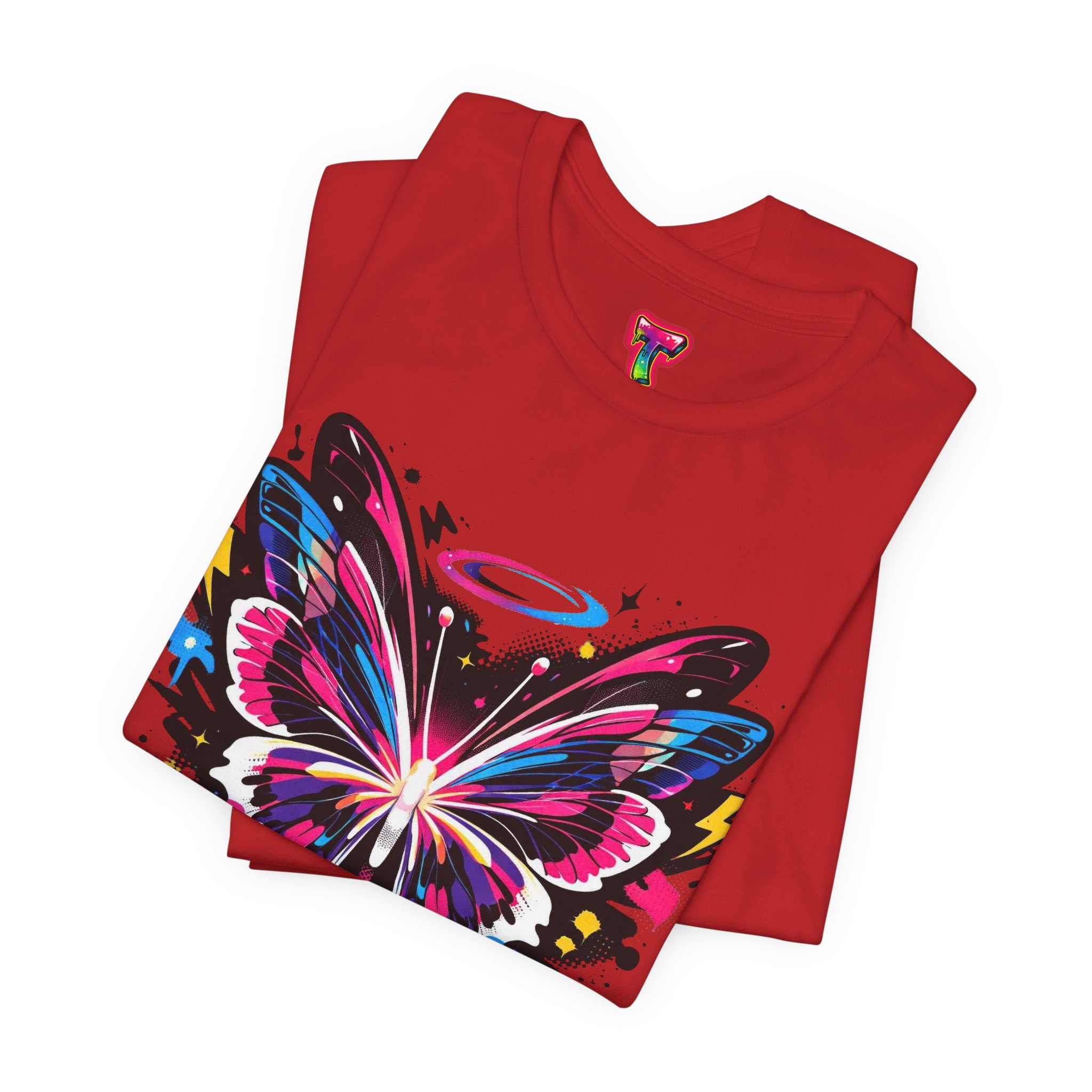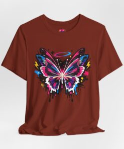This lightweight jersey tee carries a bold, hand-illustrated butterfly that feels like an electric burst of color. Bright magenta and cyan blend with inky black drips and tiny star accents, giving the design an urban-street-art edge while keeping the silhouette clean and wearable. It settles comfortably at the shoulders and chest, then relaxes into a retail fit that layers easily under jackets or wears alone for a statement moment. The soft Airlume combed and ring-spun cotton feels smooth against skin, while the ribbed collar and side seams keep the shape crisp through repeated wear. Ethically produced and REACH certified, the shirt pairs expressive graphics with responsible manufacturing.