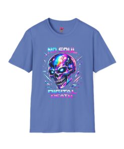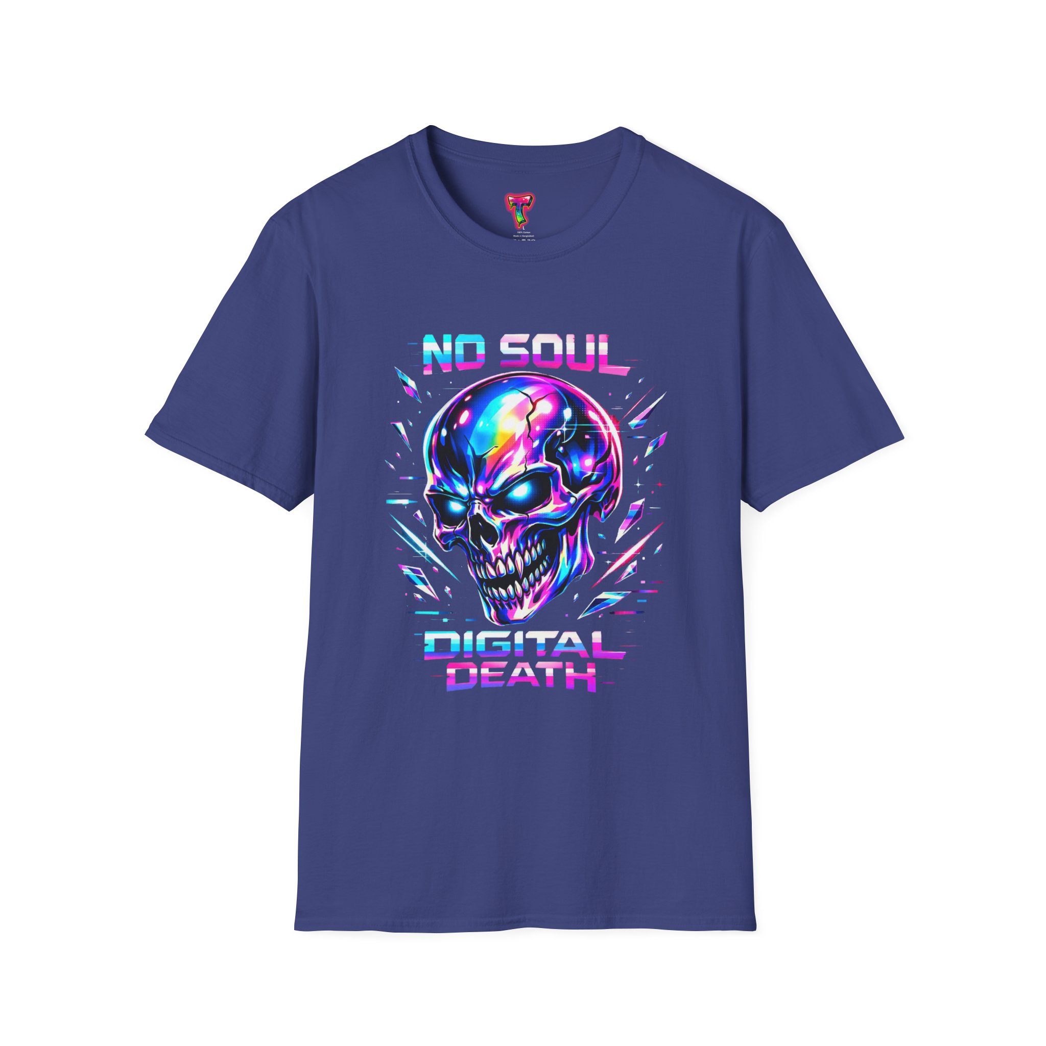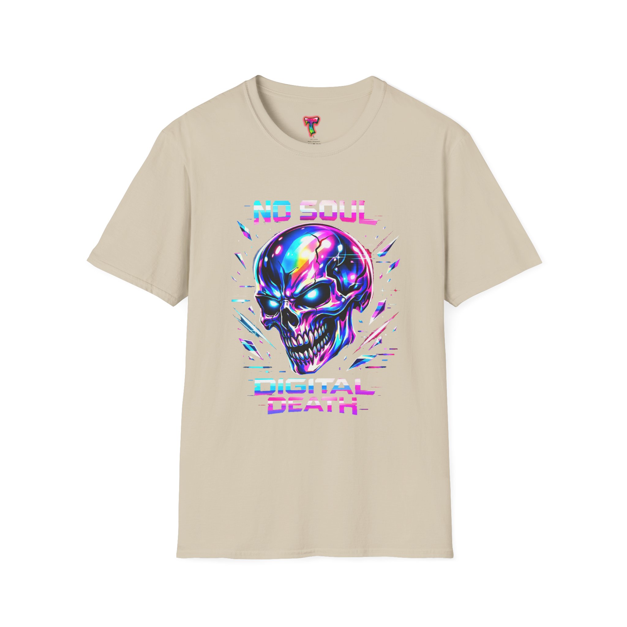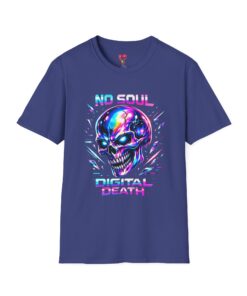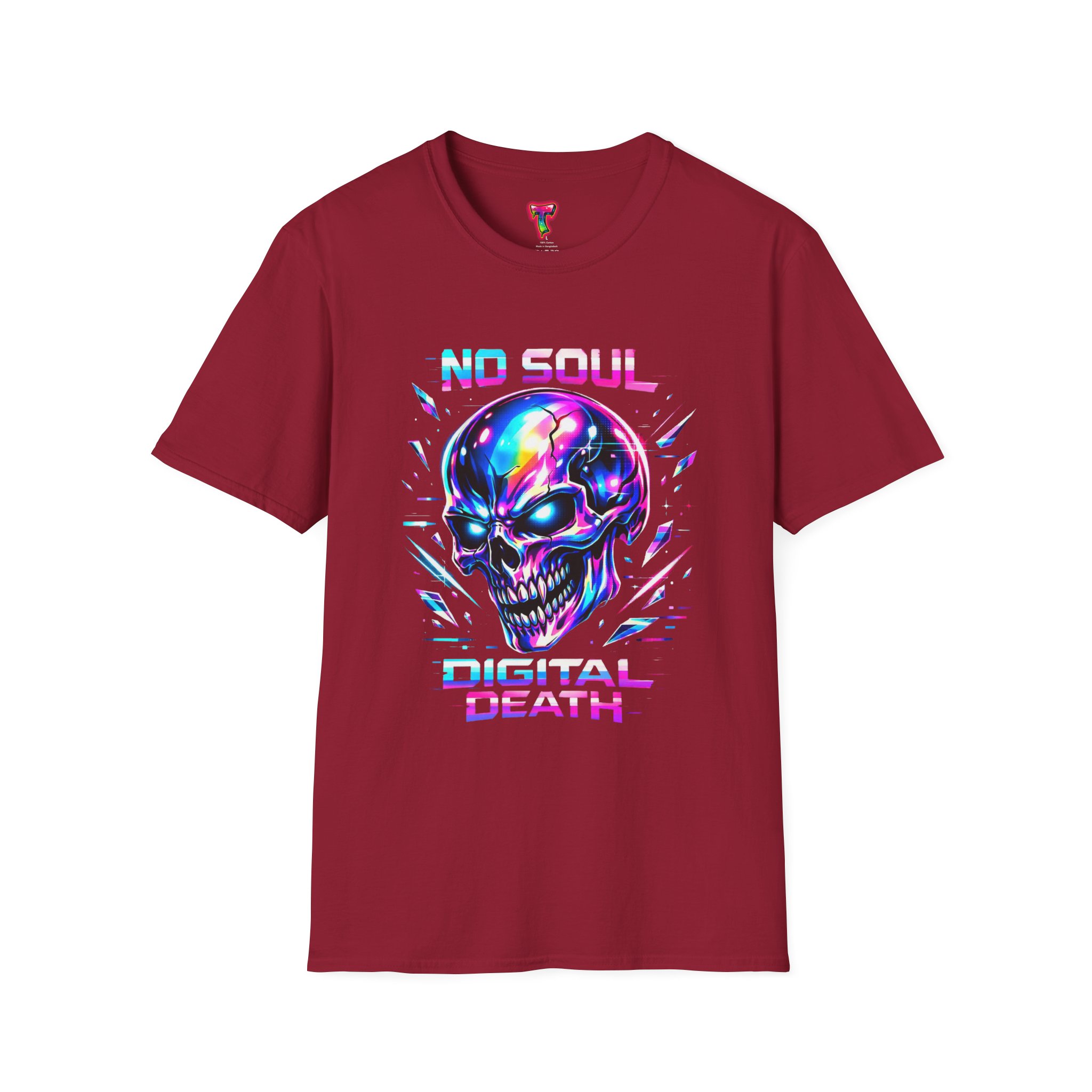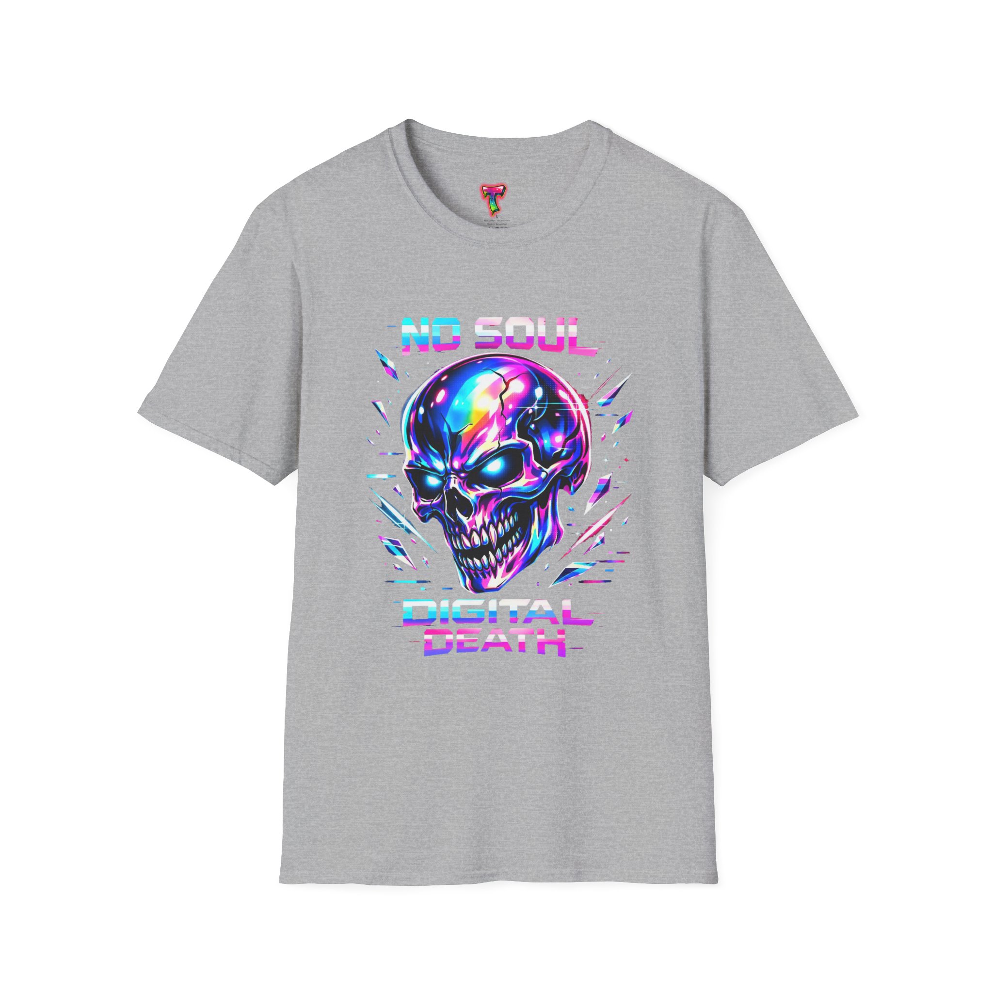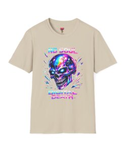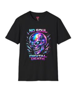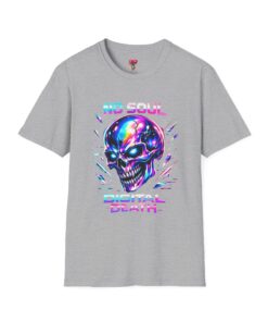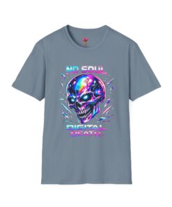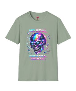 Wearable attitude for the neon-night crowd. This lightweight cotton tee puts a glossy, iridescent skull front-and-center with glitchy typography that reads like a cyberpunk manifesto. It sits cool and soft against the skin, draping in a classic crew silhouette while the vibrant, multicolored print catches light and turns heads. Slip it on for late-night shows, arcade runs, or when you want your outfit to speak in electric color—an easy layering piece under a denim jacket or over a long-sleeve for colder nights.