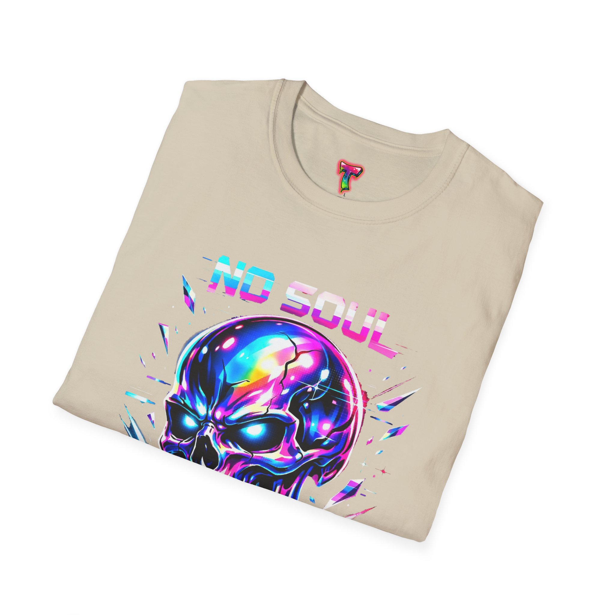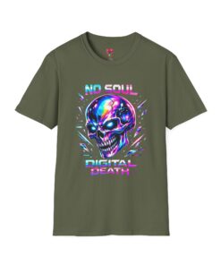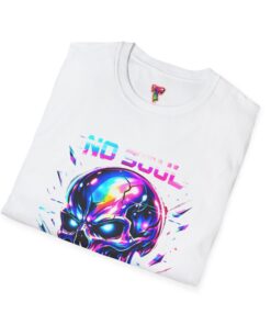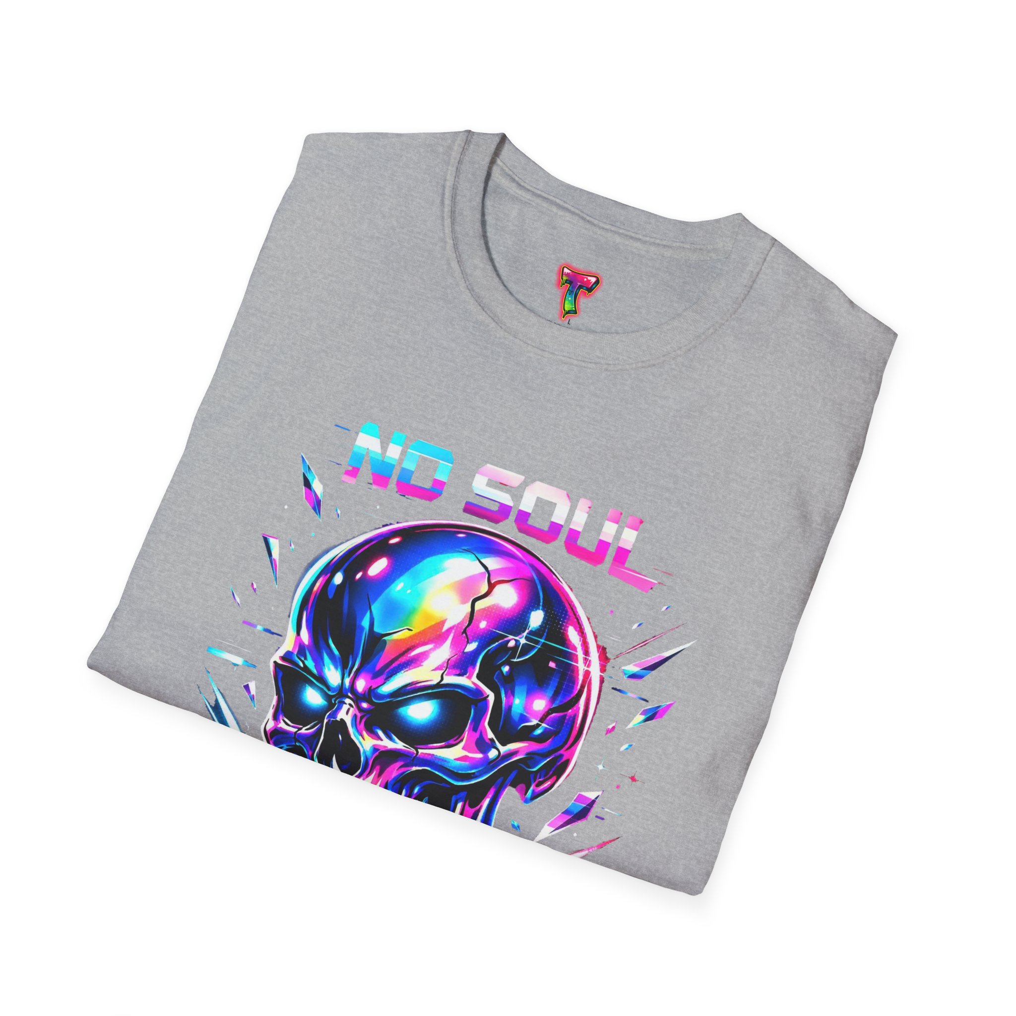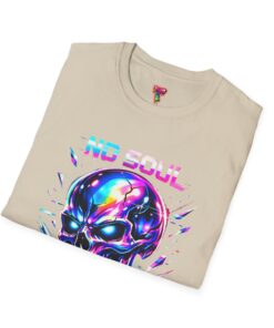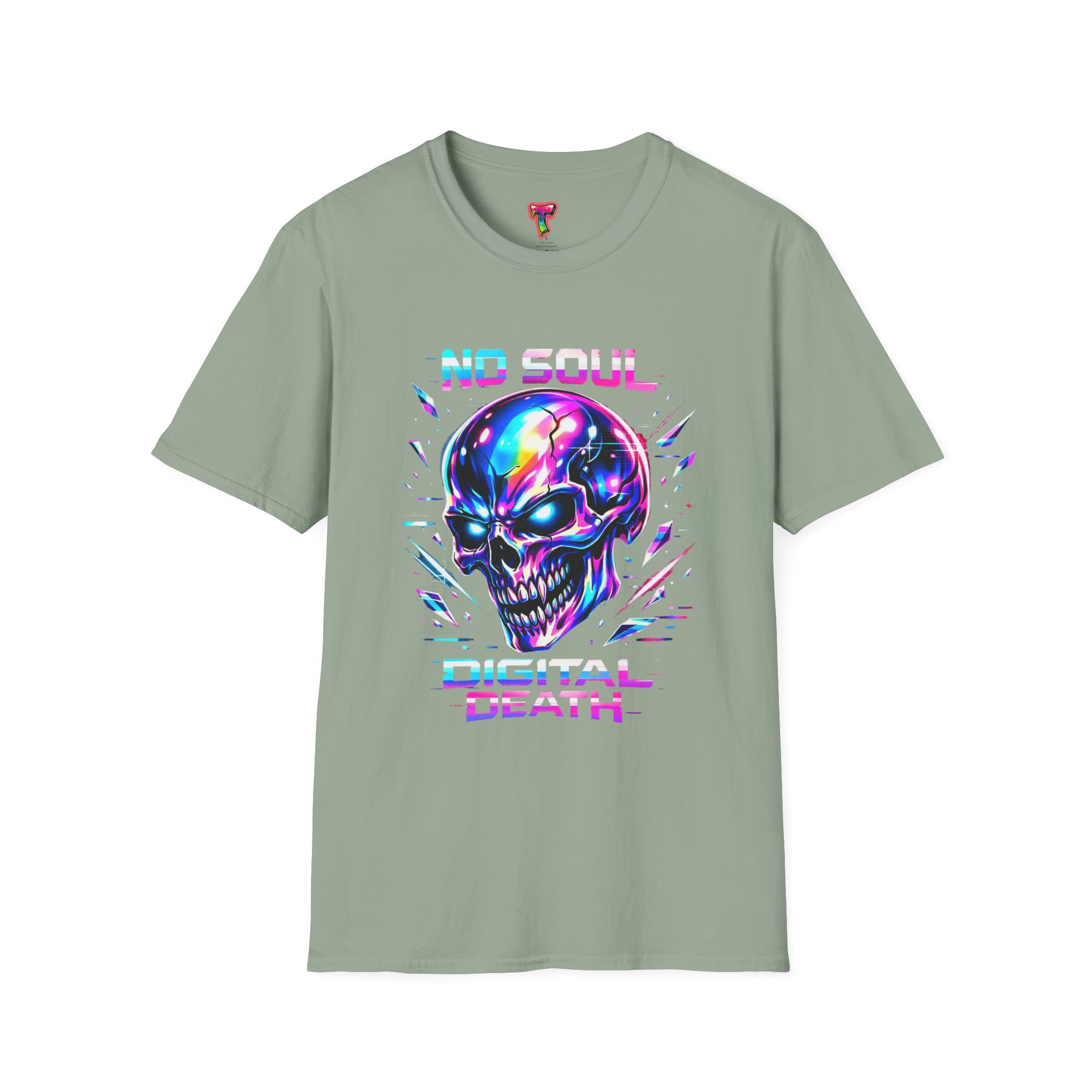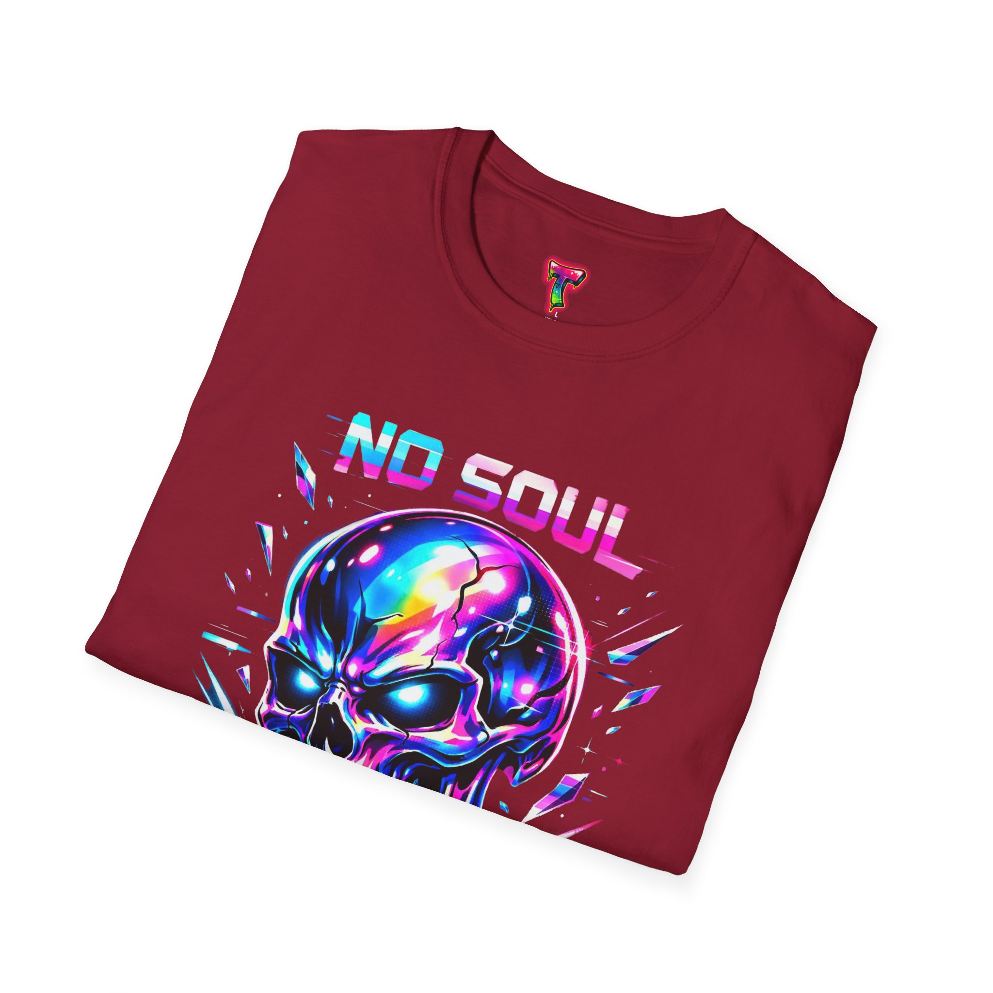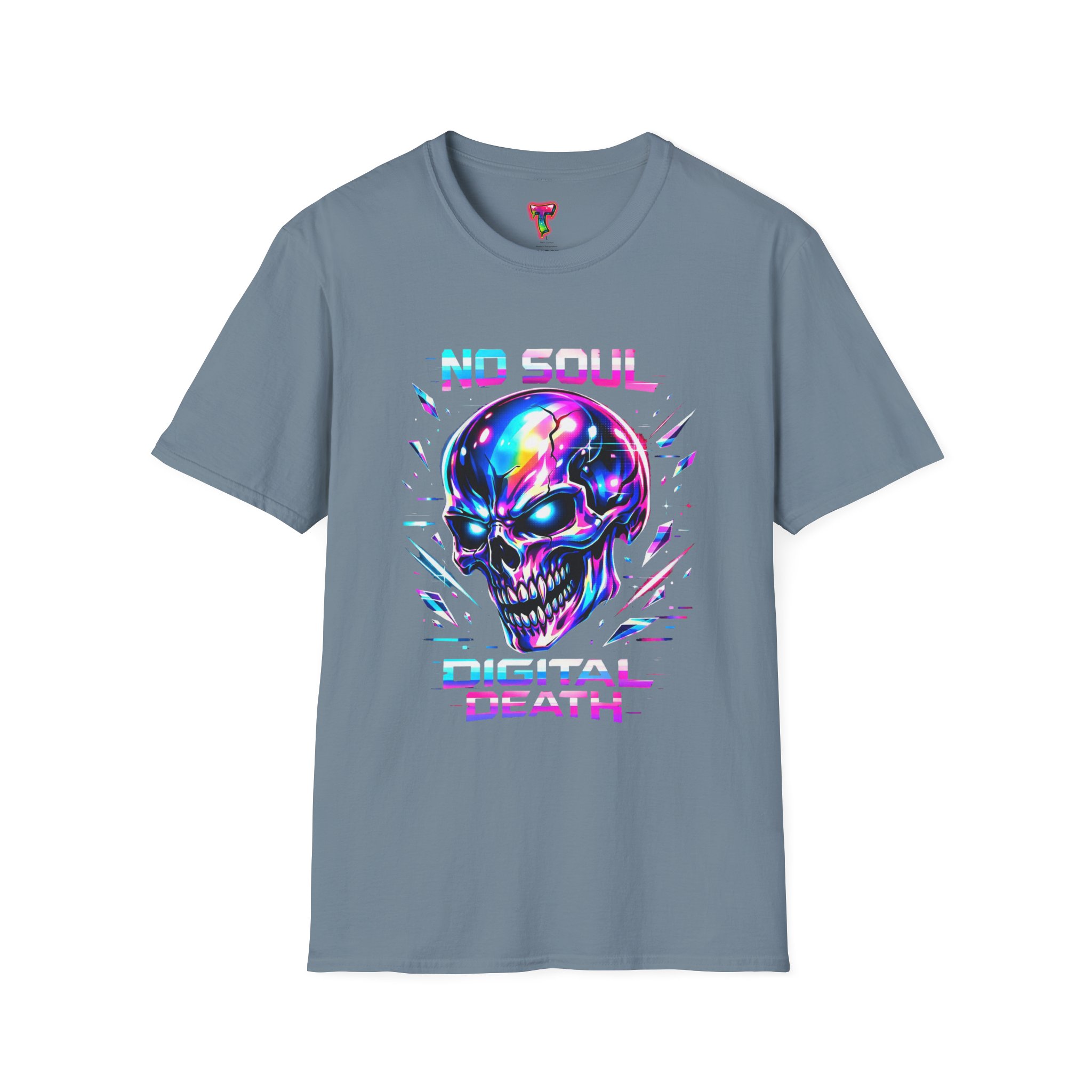 Wearable attitude for the neon-night crowd. This lightweight cotton tee puts a glossy, iridescent skull front-and-center with glitchy typography that reads like a cyberpunk manifesto. It sits cool and soft against the skin, draping in a classic crew silhouette while the vibrant, multicolored print catches light and turns heads. Slip it on for late-night shows, arcade runs, or when you want your outfit to speak in electric color—an easy layering piece under a denim jacket or over a long-sleeve for colder nights.
