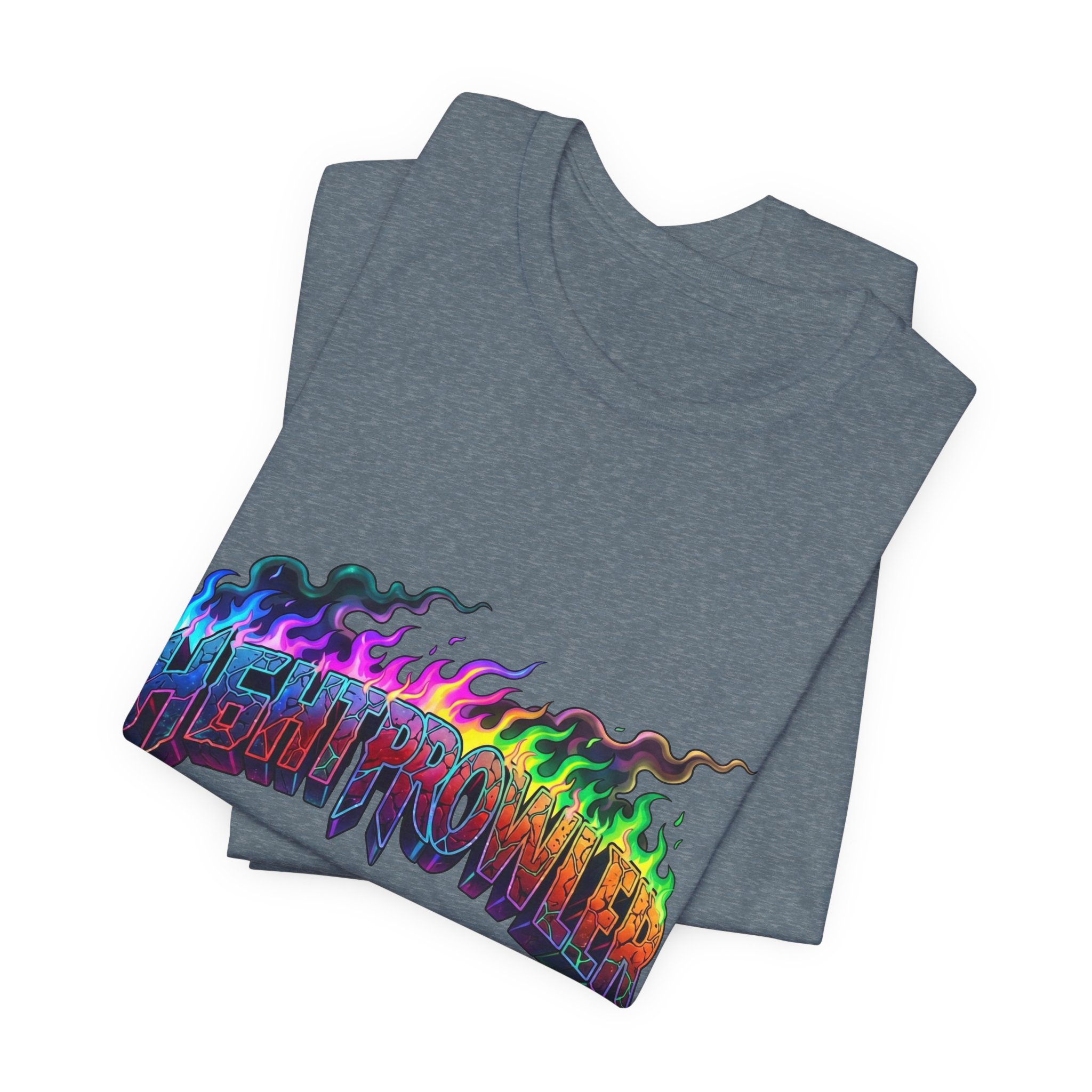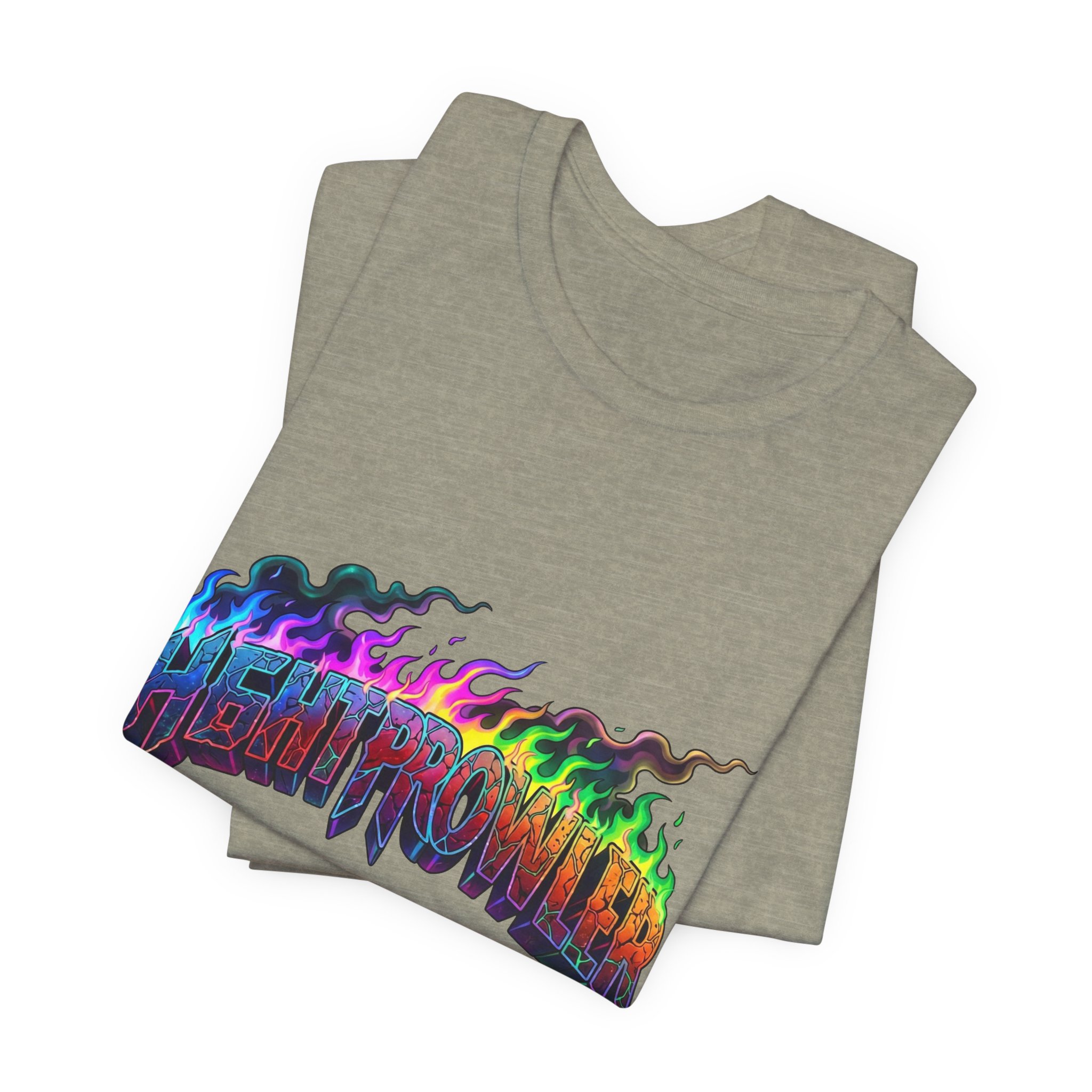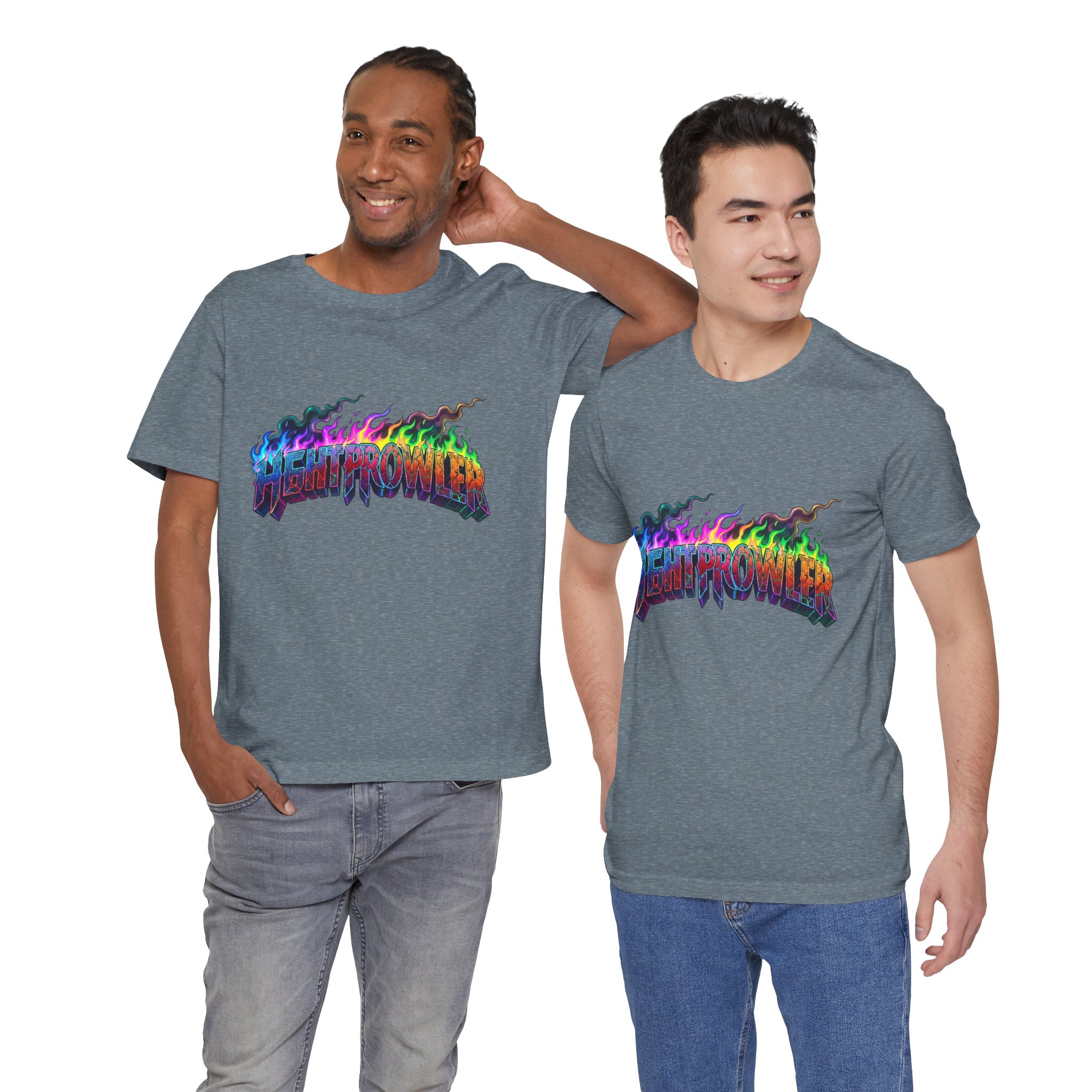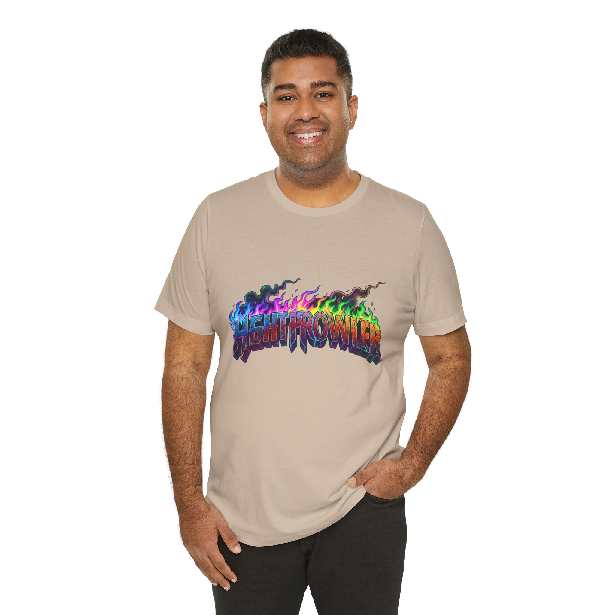 This lightweight cotton tee carries a bold, iridescent flame graphic that reads as an expression of late-night energy and creative fire. The soft, breathable fabric drapes casually while the retail fit and crew neckline keep the silhouette clean and wearable. Subtle details—side seams, ribbed collar, shoulder tape and a tear-away label—mean it holds shape and stays comfortable after many wears. Made from Airlume combed and ring-spun cotton with careful ethical manufacturing, this shirt pairs effortlessness with a loud, colorful attitude.