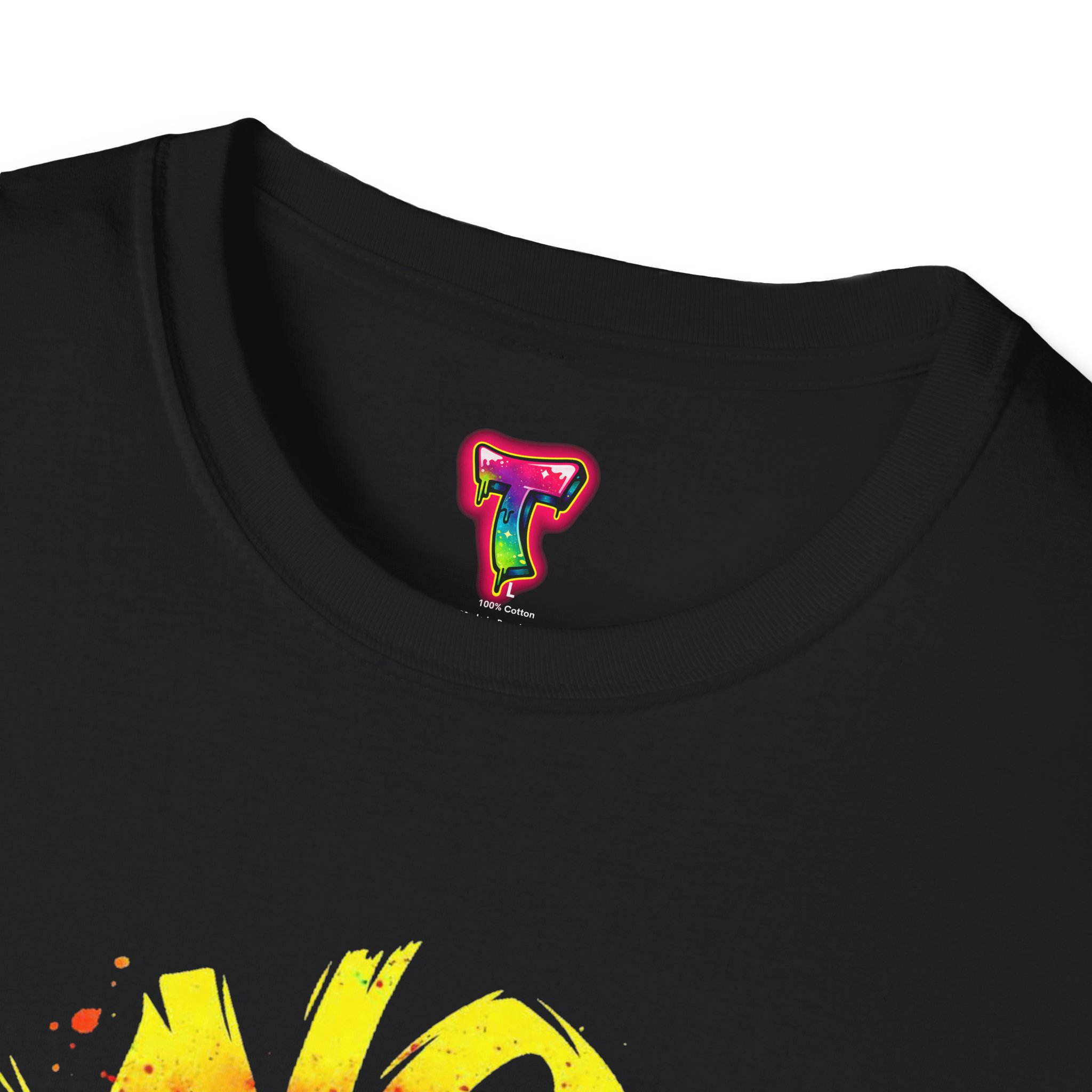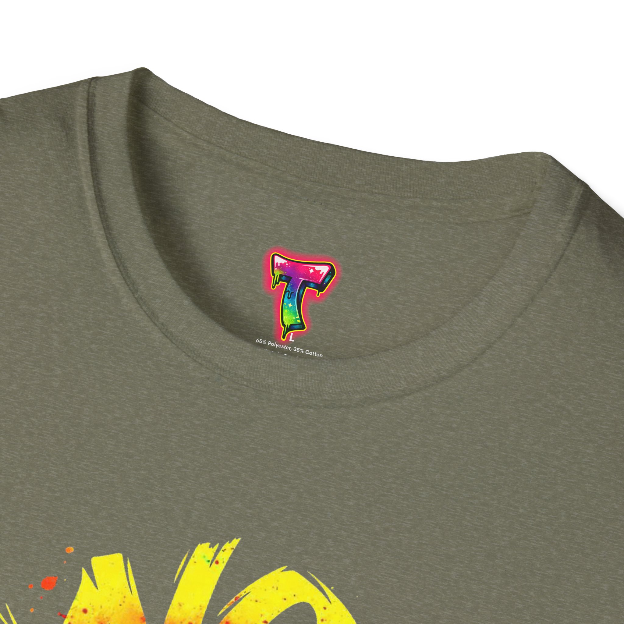 The design features vibrant graffiti typography in neon yellow, red, and blue tones, combined with dynamic paint splashes and drip effects. Set against a strong blue base, the colors pop with high contrast, creating an energetic and authentic streetwear vibe.
