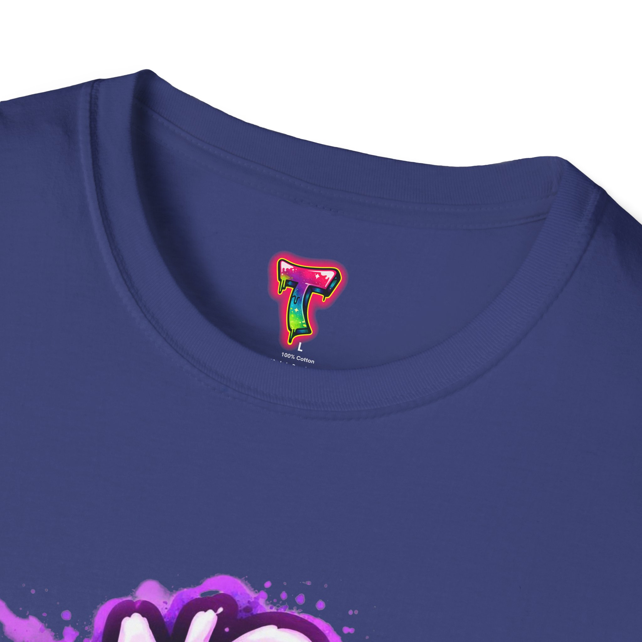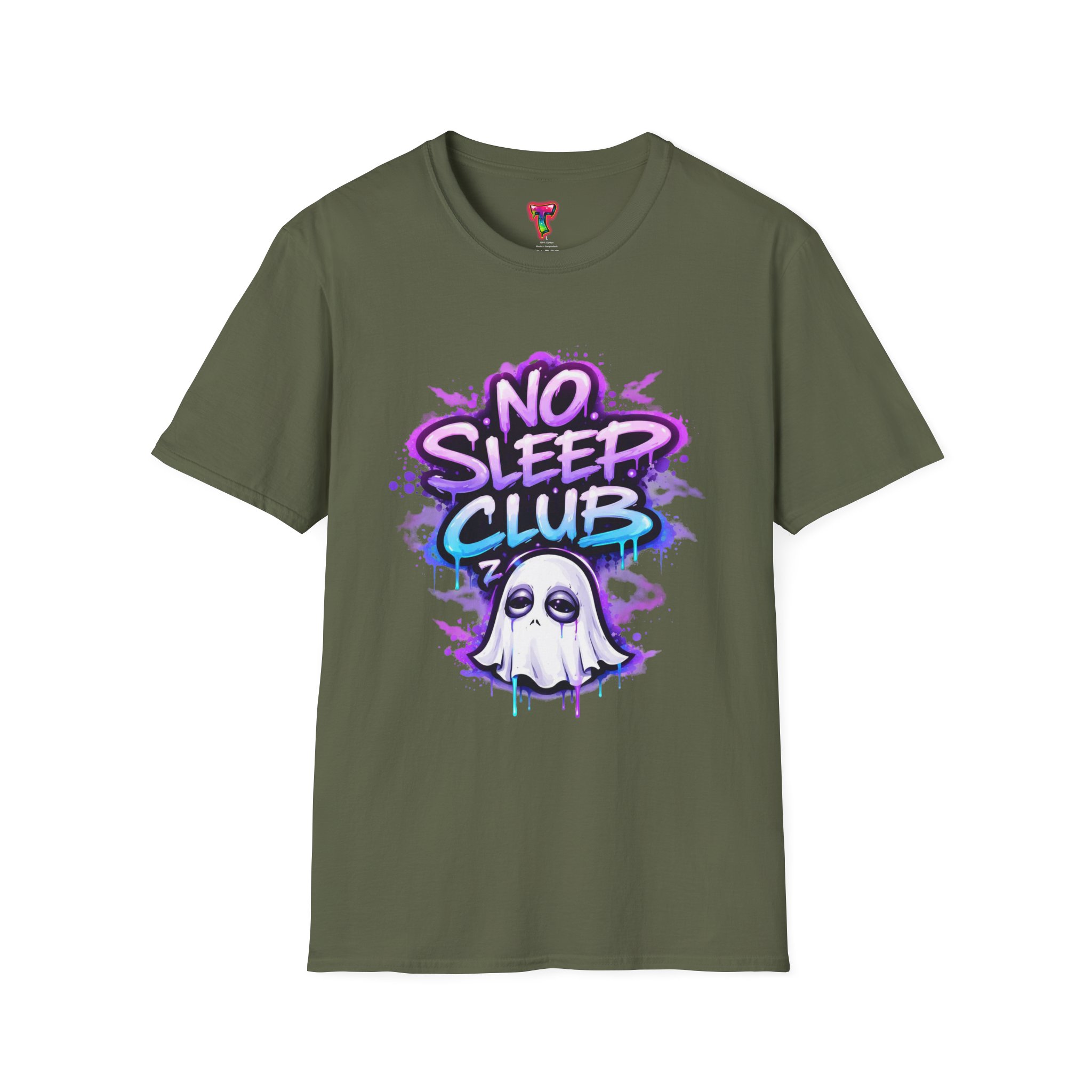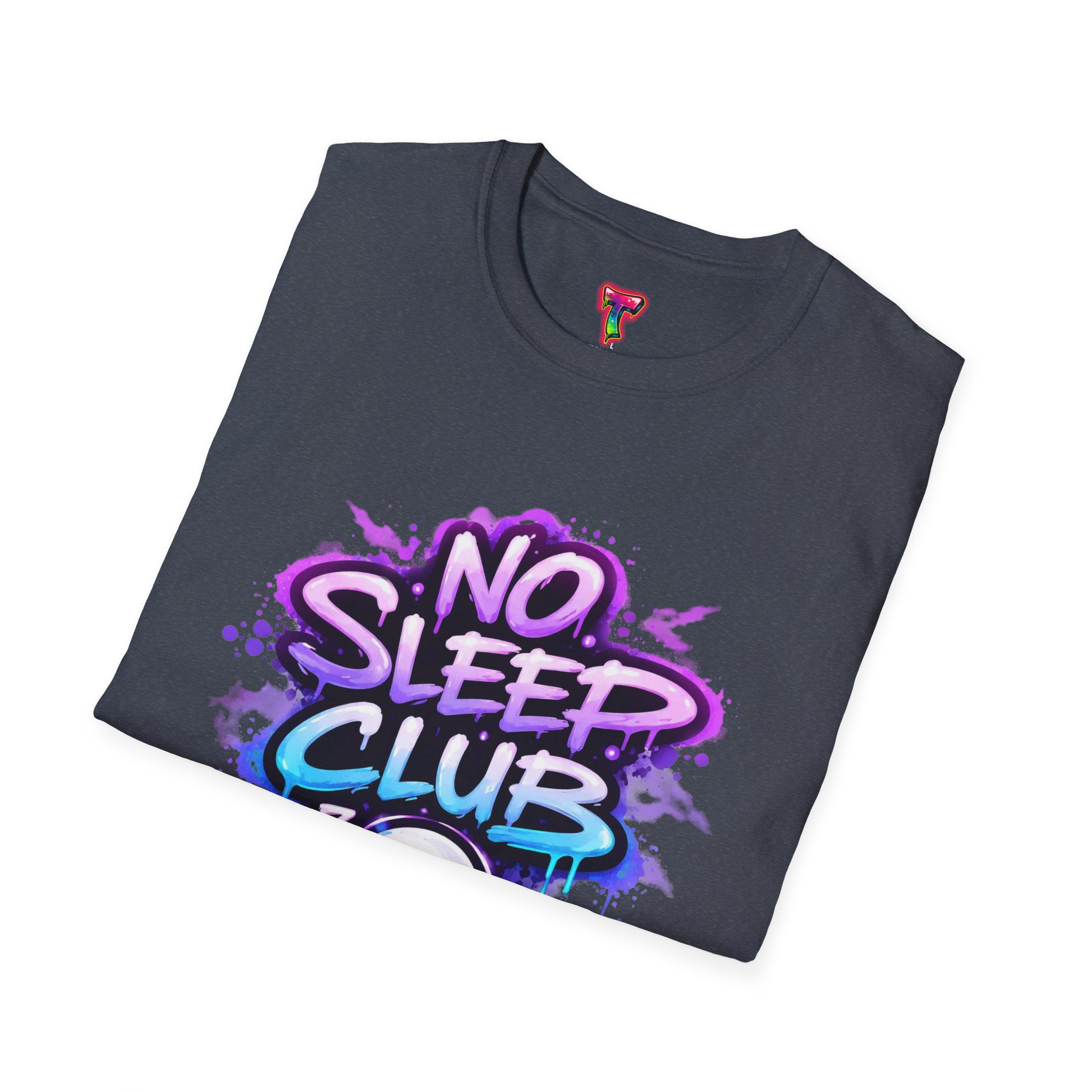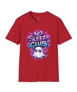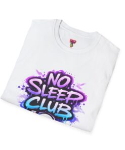 This soft, breathable tee wears like a cozy late-night ritual. A playful graffiti-style “No Sleep Club” headline bursts across the chest in neon purples and blues, with a sleepy ghost mascot peeking out beneath—equal parts cheeky and low-key spooky. The lightweight ring-spun cotton drapes cleanly from a classic crew neck, so the design stays front-and-center whether you’re gaming through the dawn, pulling an all-nighter at a studio session, or lounging with friends after midnight. It feels lived-in from the first wear and keeps its shape thanks to ribbed collar and shoulder tape. Subtle natural flecks appear on unprocessed colorways, adding an organic, worn-in character that complements the street-art vibe.