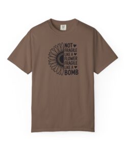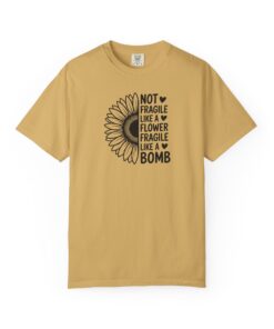 This relaxed-fit garment-dyed tee blends soft, lived-in comfort with a bold, unexpected message. A half-sunflower/half-typographic design reads “Not fragile like a flower, fragile like a bomb,” balancing gentle floral imagery with fierce attitude. The heavyweight cotton drapes casually and breaks in beautifully after wear and wash, so the design becomes part of your everyday rhythm — whether you’re layering it under a jacket, wearing it to a rally, or lounging at home. It feels soft against the skin, holds its shape thanks to double-needle stitching, and comes in a wide range of colors so the statement can match your mood. Sized broadly from S to 4XL, this tee suits people who want clothing that looks simple at a glance but speaks clearly when you’move.