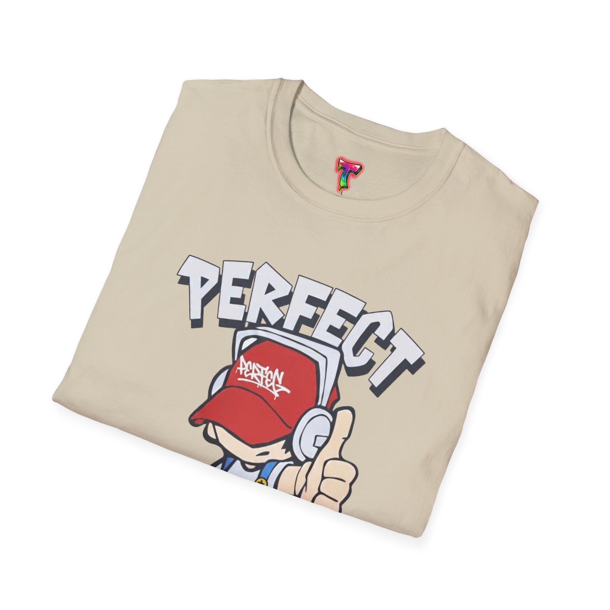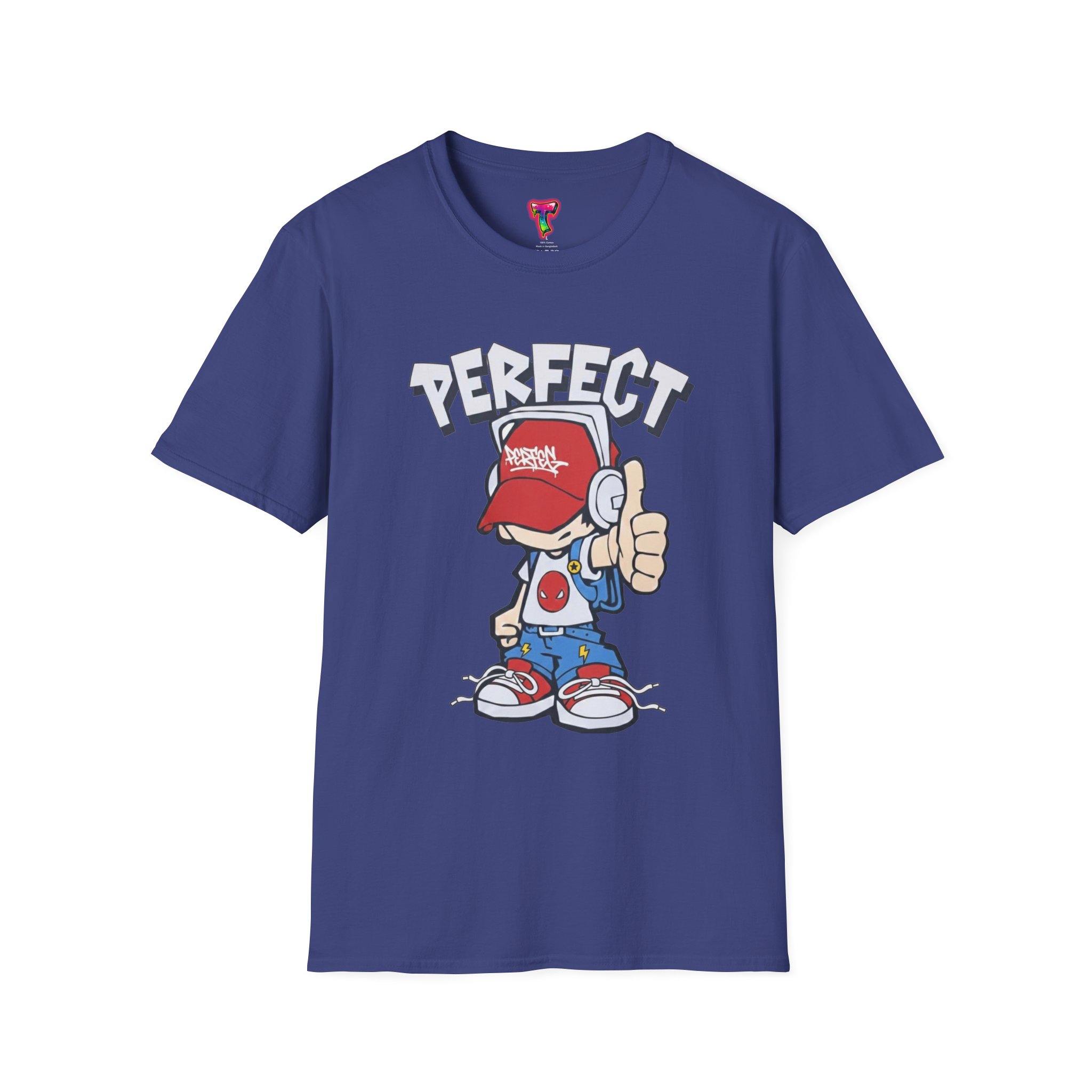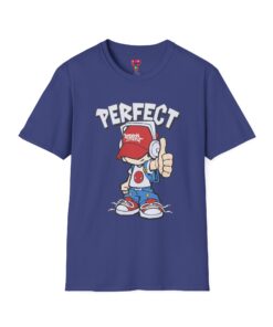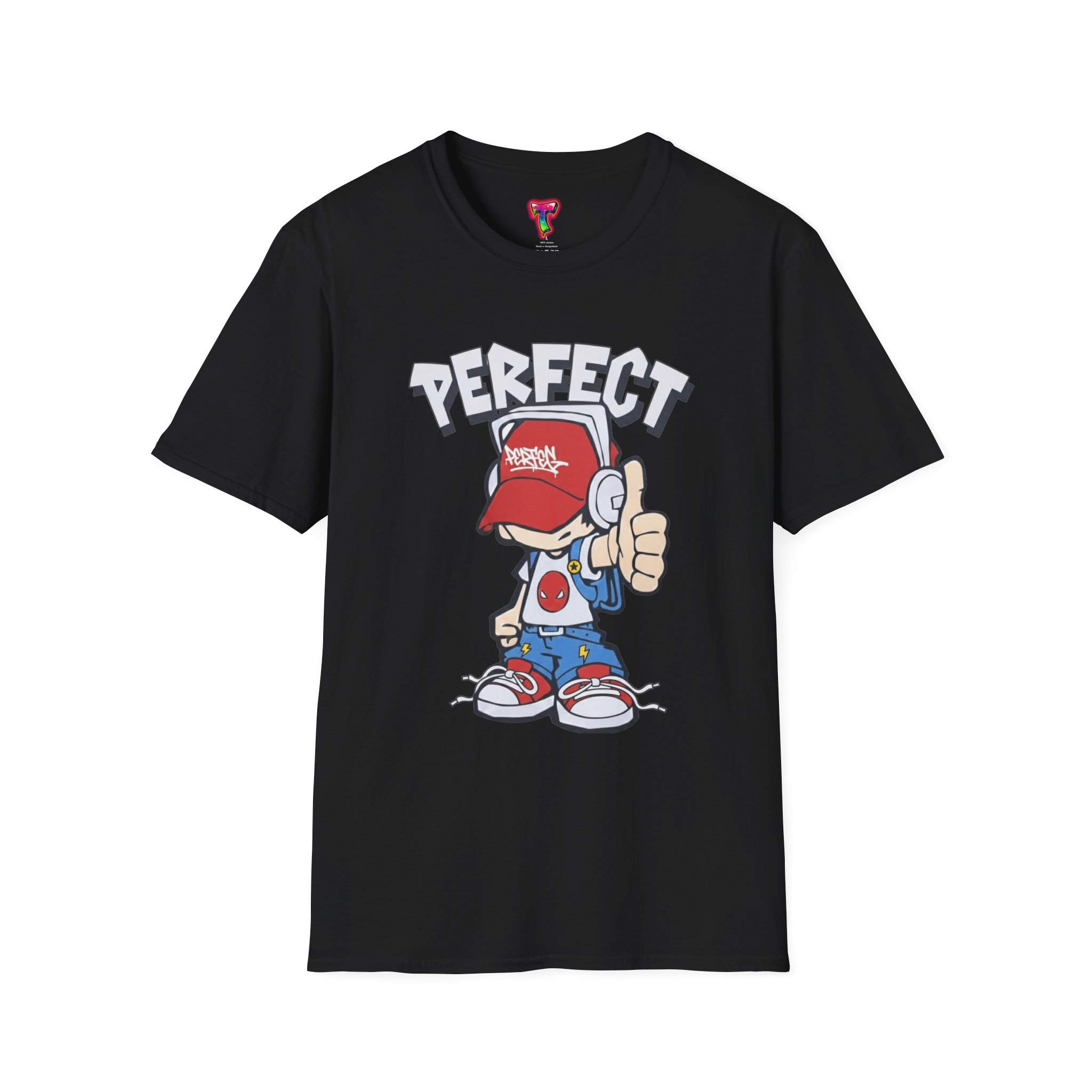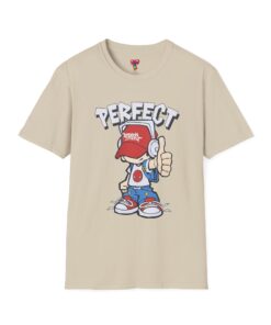 A laid-back graphic tee that channels old-school street vibes with a modern softwear feel. The bold cartoon character — cap pulled low, headphones on, thumbs up beneath the word “PERFECT” — reads like a confident nod to music, skate spots, and late-night hangs. Lightweight ring-spun cotton keeps the shirt breathable and comfortable through city walks, studio sessions, or couch-side beat checks. Clean crew neckline and classic cut make it easy to layer under a hoodie or wear solo when you want the art to speak. Subtle distressing in the print lines gives a lived-in look that fits naturally into a curated, casual wardrobe.