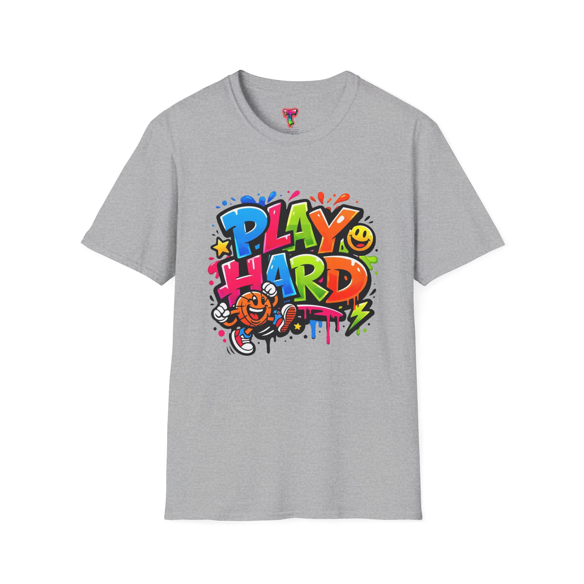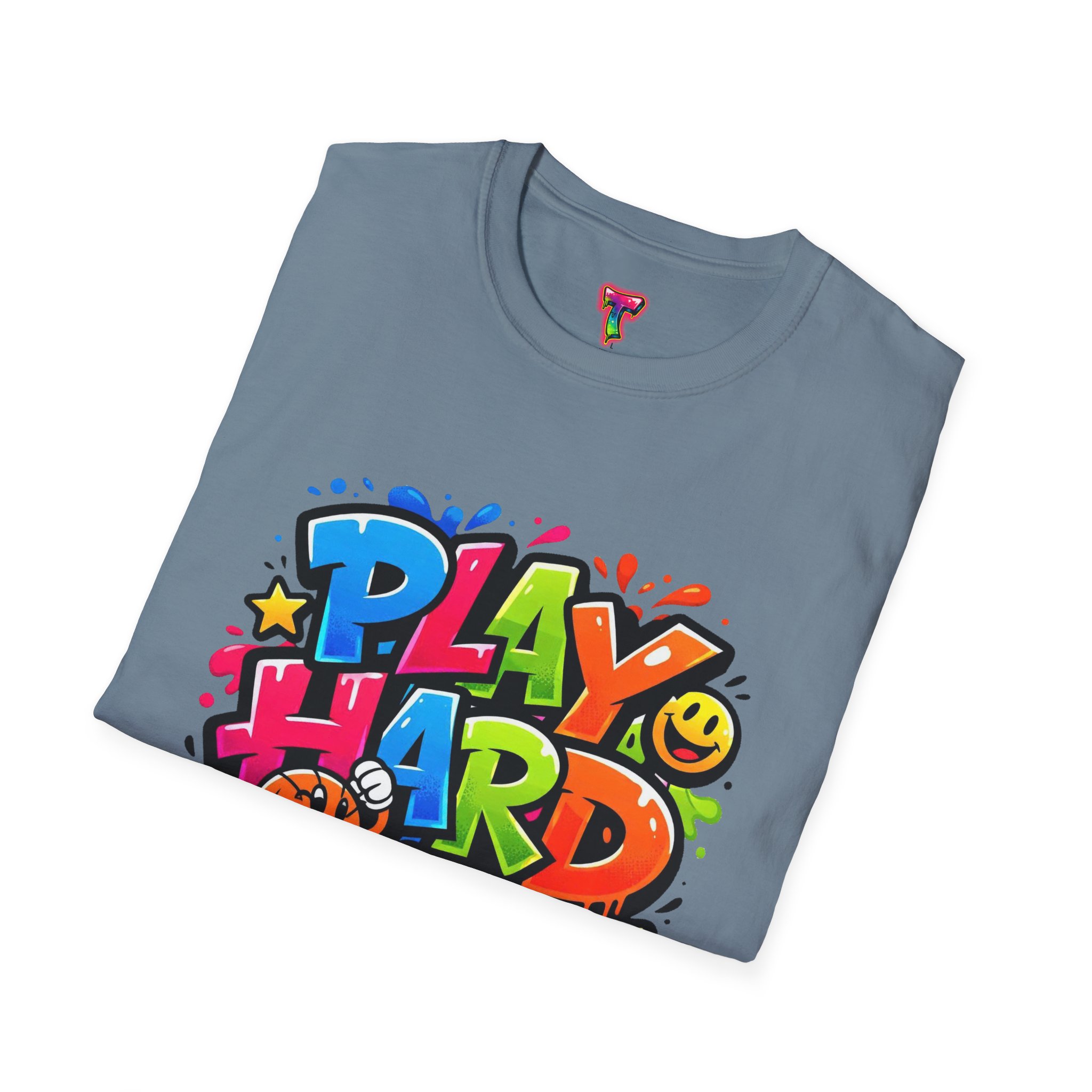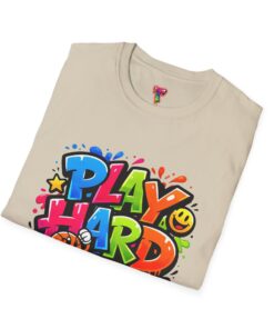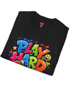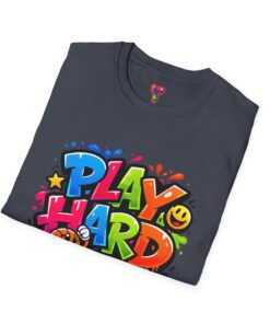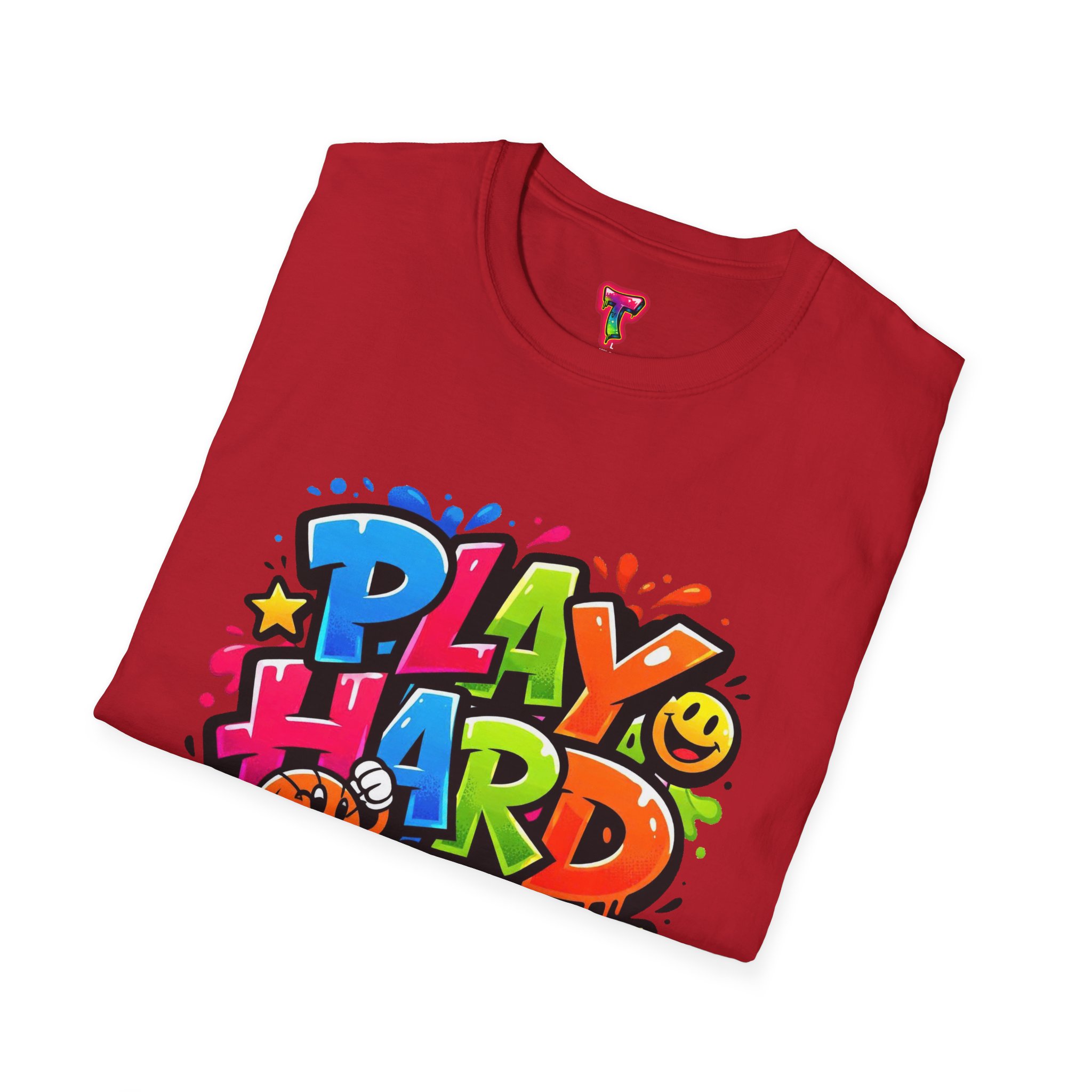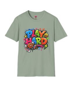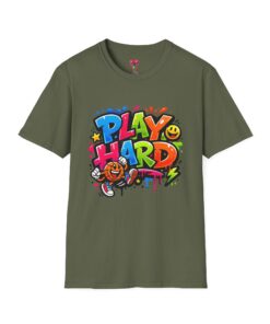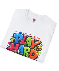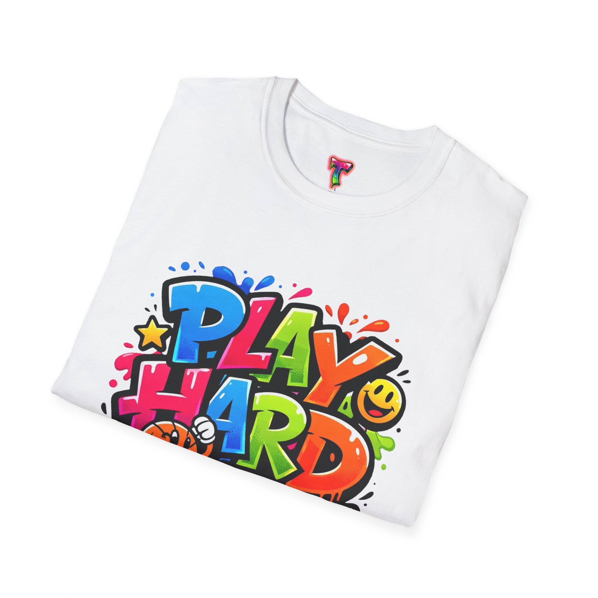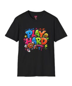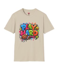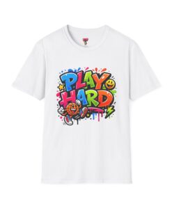 Bright, playful, and unapologetically fun — this tee carries energy into every day. The colorful graffiti-style “PLAY HARD” artwork pops against a clean white backdrop, with smiling characters, stars and paint drips that feel like a spontaneous block-party mural. It sits comfortably with a relaxed crew neckline and lightweight cotton that breathes during long days of play or casual hangouts. Wear it to skate parks, weekend game nights, or whenever you want to bring a little bold joy to the moment. The durable print methods keep the colors lively through washes, while the soft ring-spun cotton and tear-away label keep you comfortable from morning until night.