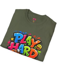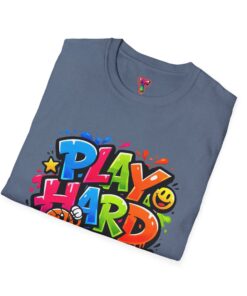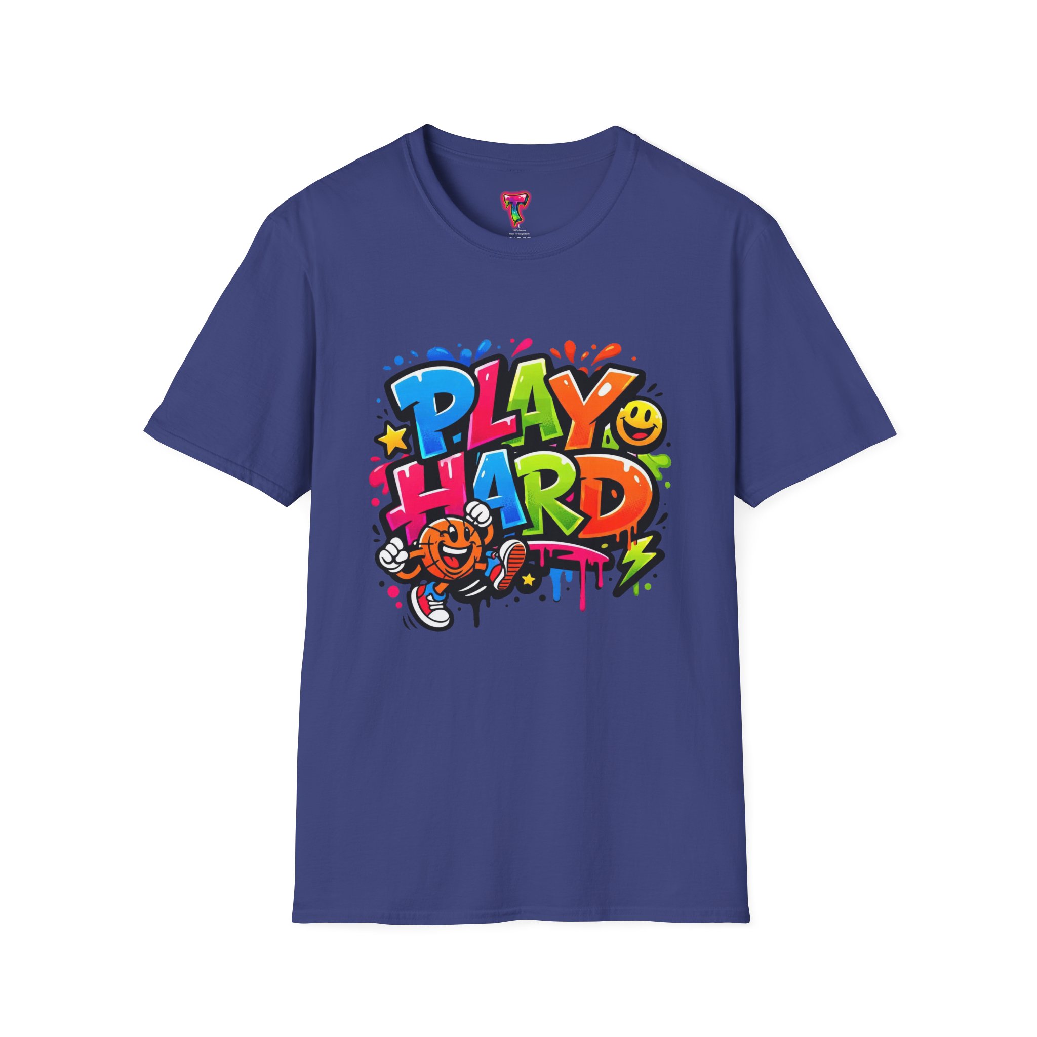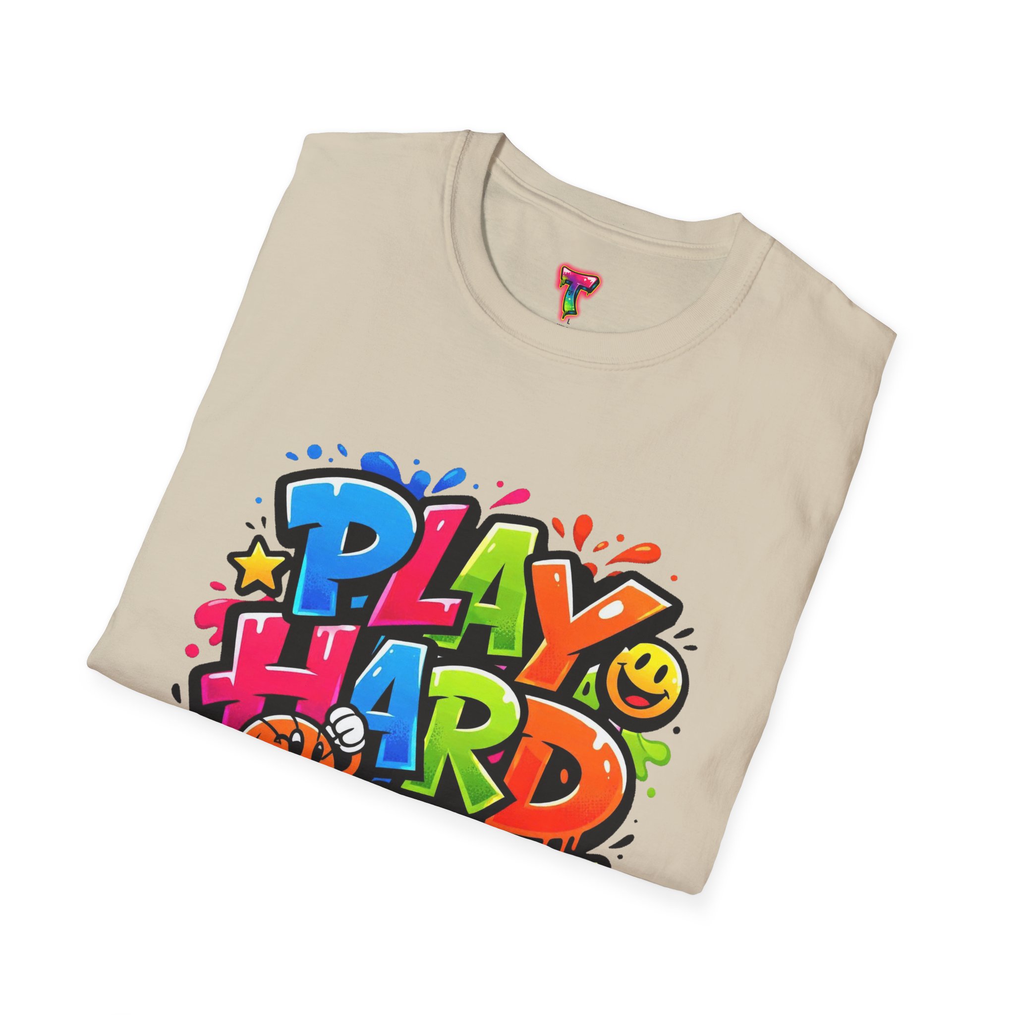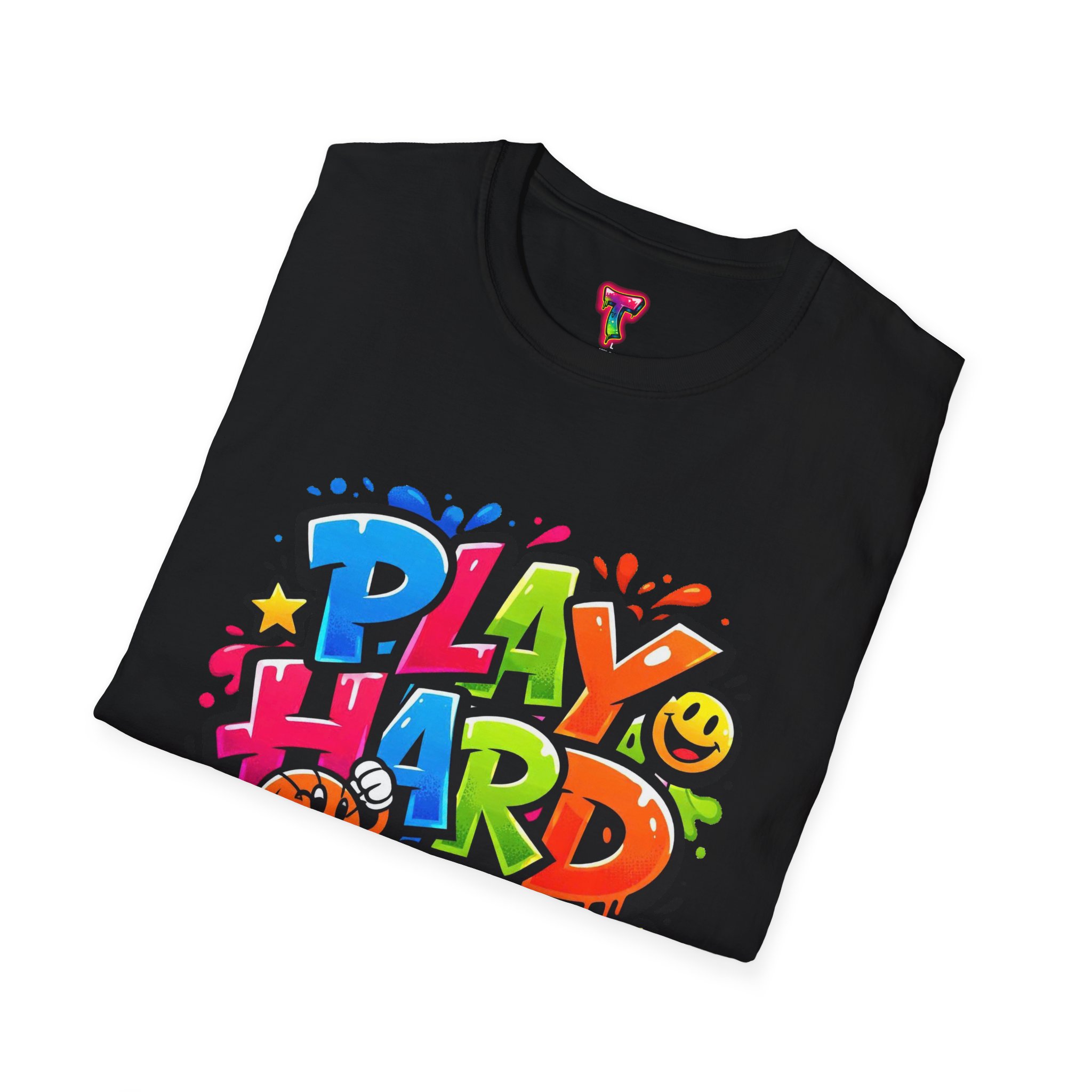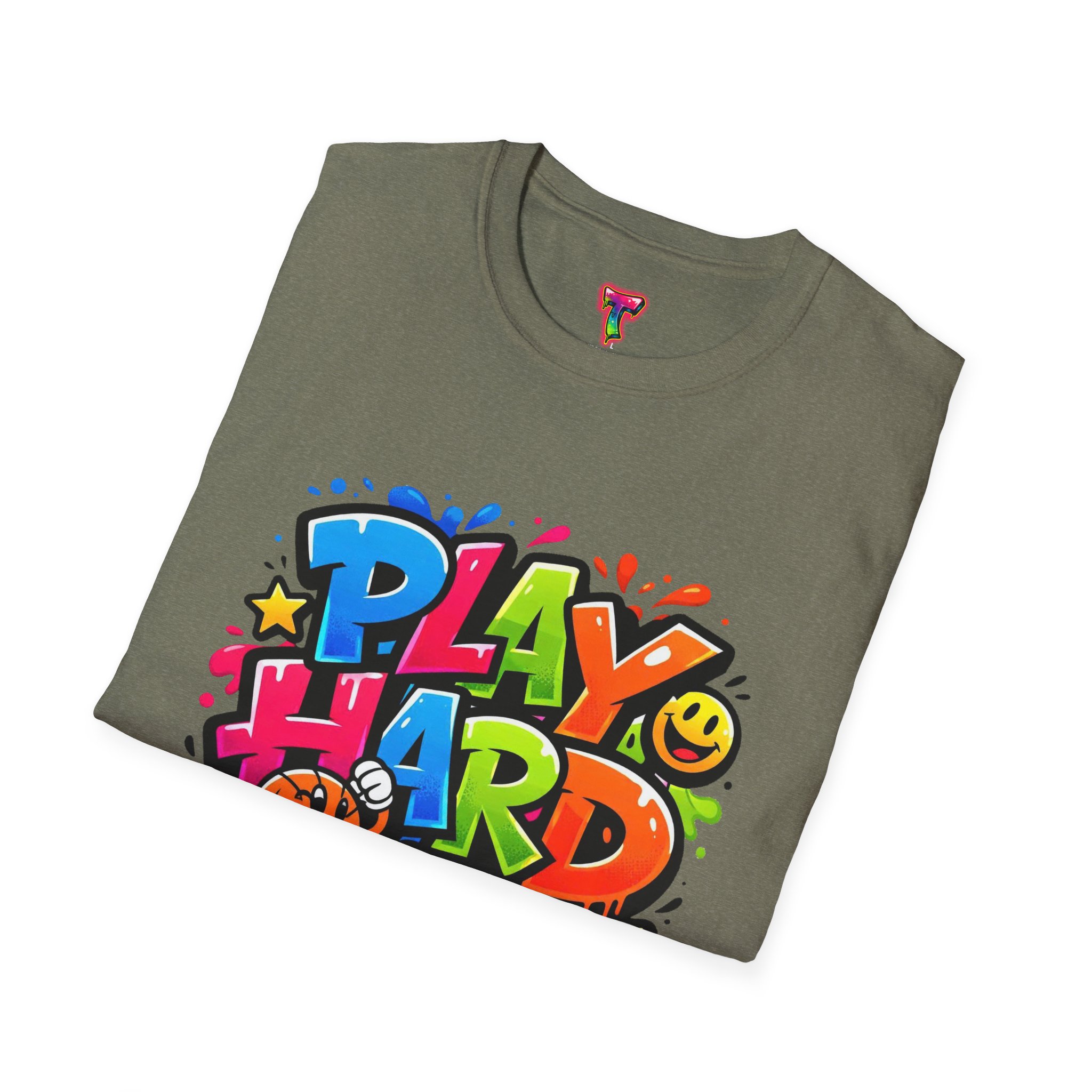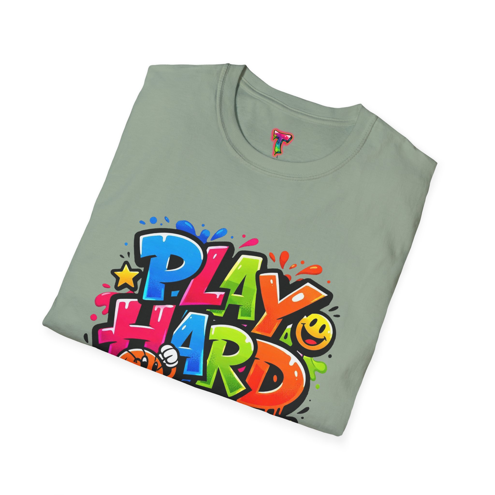 Bright, playful, and unapologetically fun — this tee carries energy into every day. The colorful graffiti-style “PLAY HARD” artwork pops against a clean white backdrop, with smiling characters, stars and paint drips that feel like a spontaneous block-party mural. It sits comfortably with a relaxed crew neckline and lightweight cotton that breathes during long days of play or casual hangouts. Wear it to skate parks, weekend game nights, or whenever you want to bring a little bold joy to the moment. The durable print methods keep the colors lively through washes, while the soft ring-spun cotton and tear-away label keep you comfortable from morning until night.