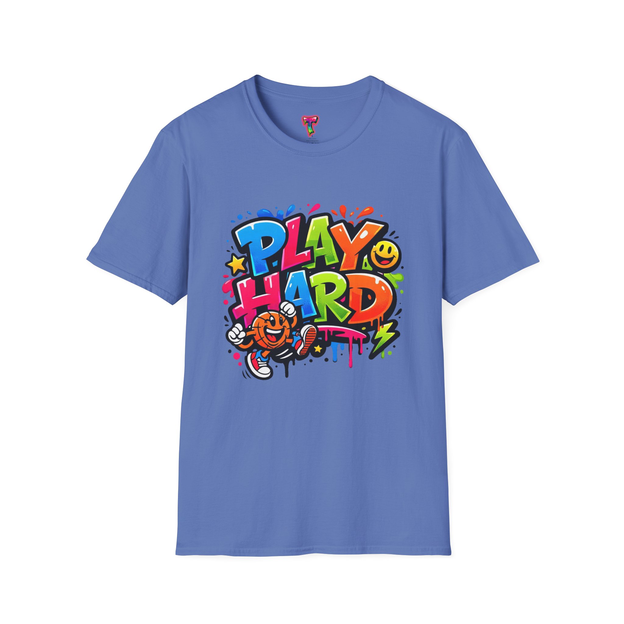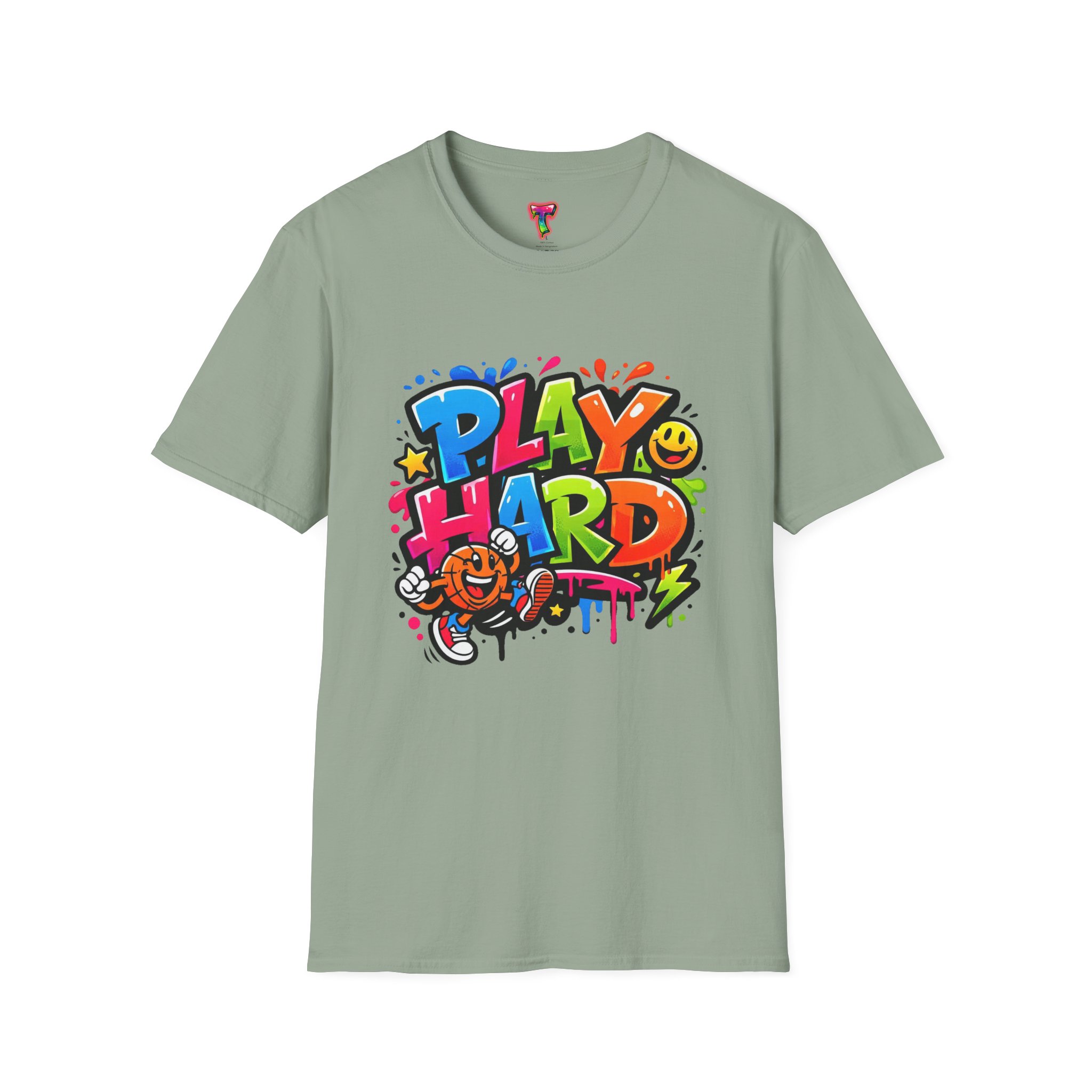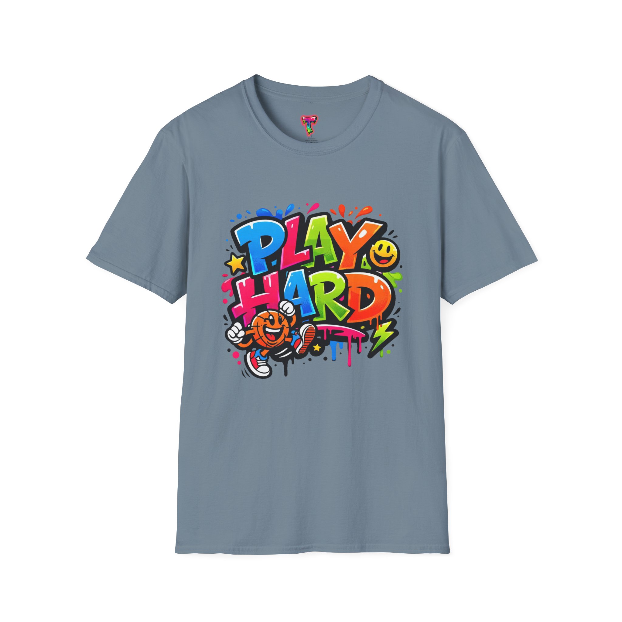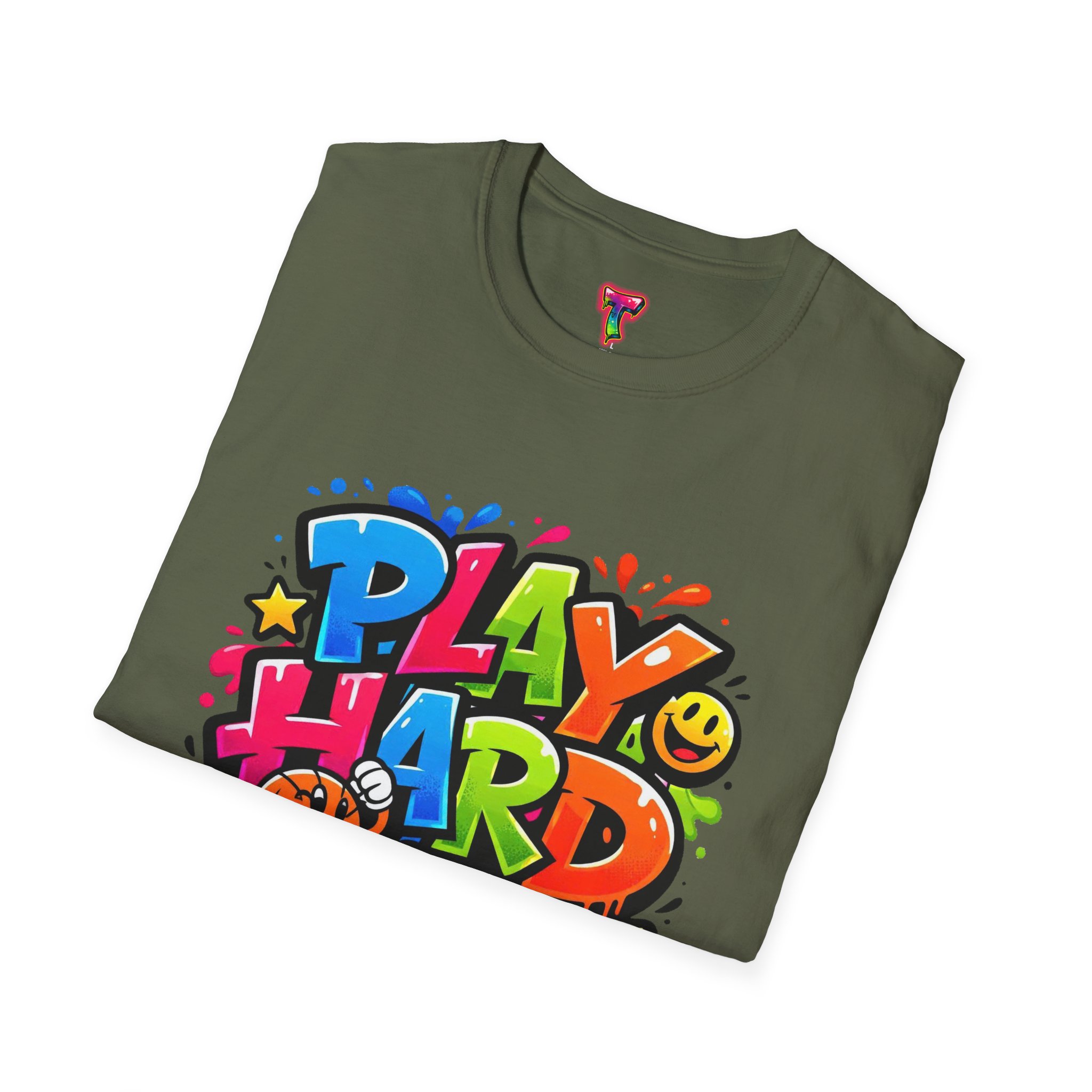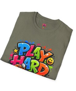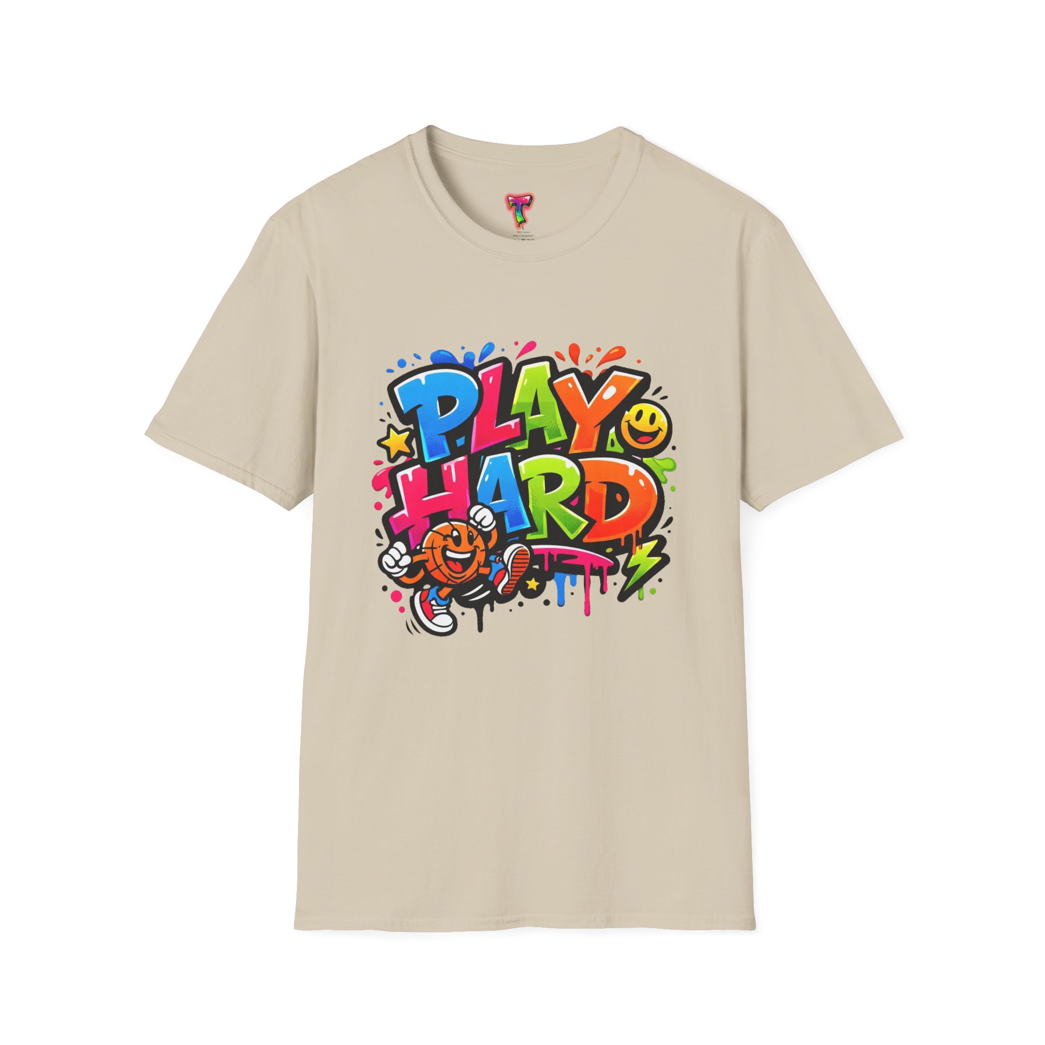 Bright, playful, and unapologetically fun — this tee carries energy into every day. The colorful graffiti-style “PLAY HARD” artwork pops against a clean white backdrop, with smiling characters, stars and paint drips that feel like a spontaneous block-party mural. It sits comfortably with a relaxed crew neckline and lightweight cotton that breathes during long days of play or casual hangouts. Wear it to skate parks, weekend game nights, or whenever you want to bring a little bold joy to the moment. The durable print methods keep the colors lively through washes, while the soft ring-spun cotton and tear-away label keep you comfortable from morning until night.