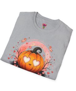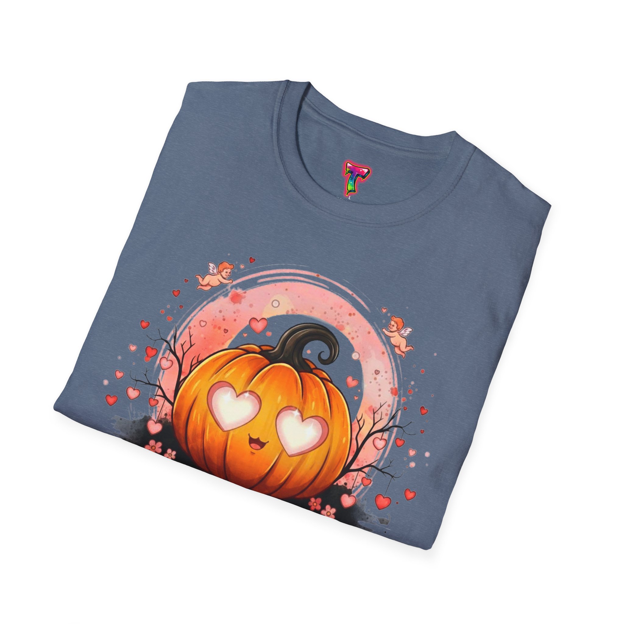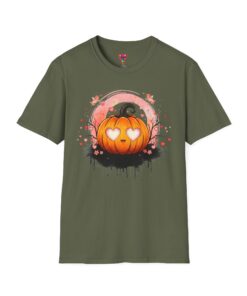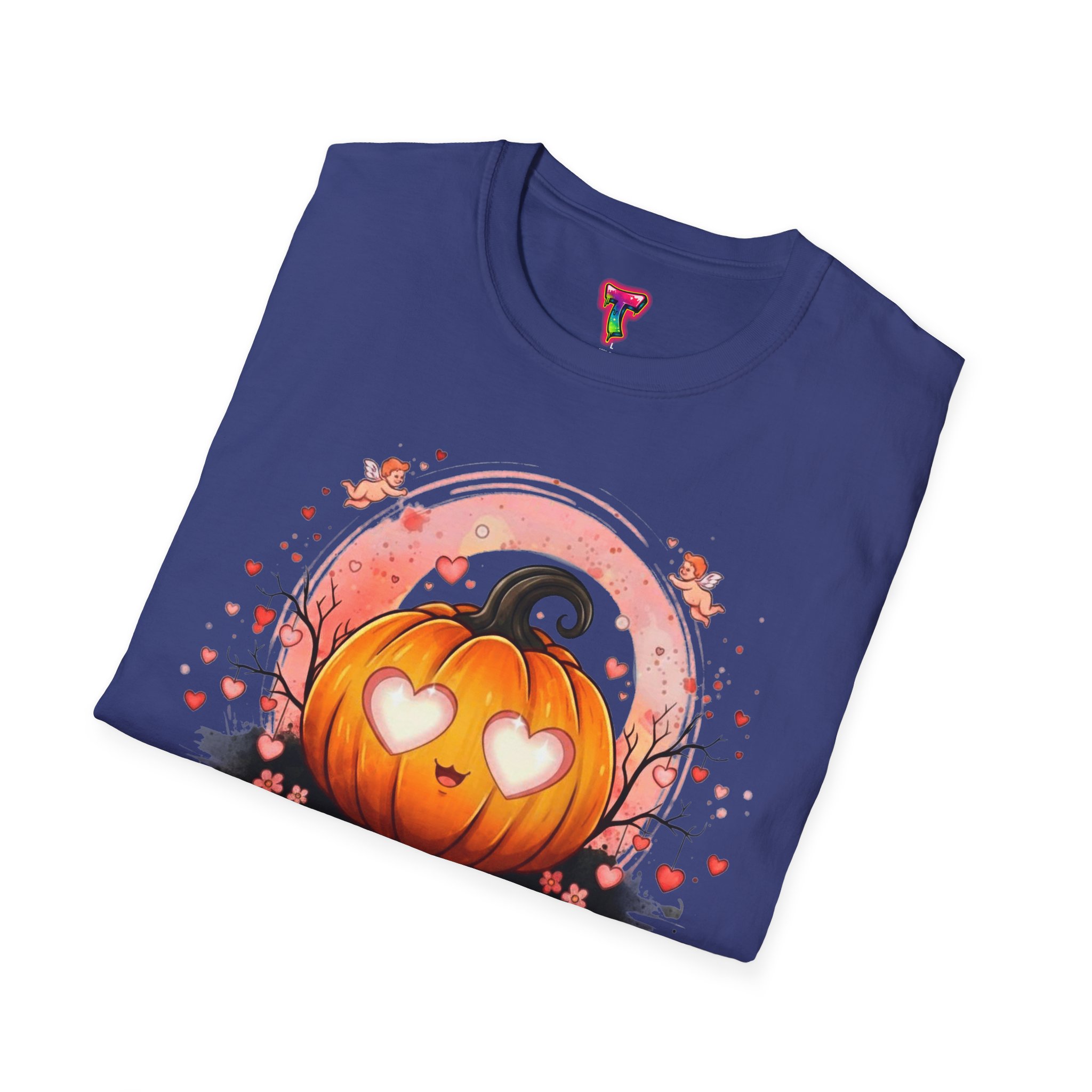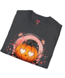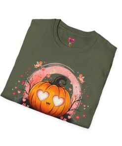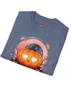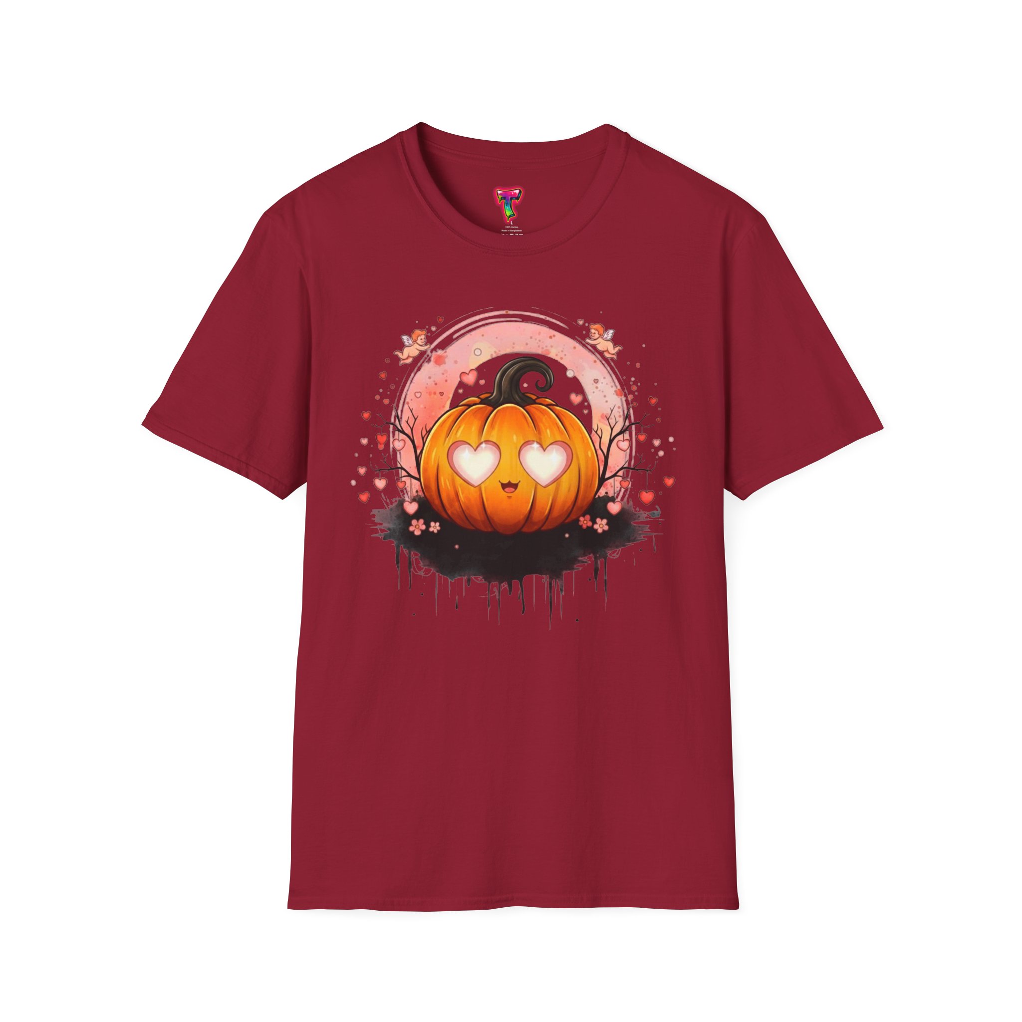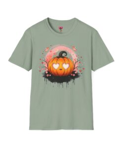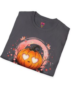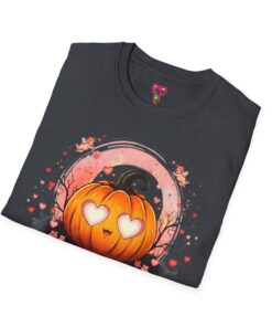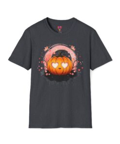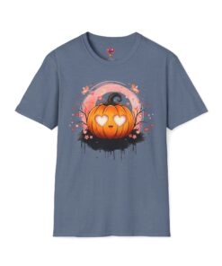A lightweight, everyday tee that brings a warm, whimsical touch to autumn evenings. The soft, ring-spun cotton drapes easily and holds a vivid pumpkin illustration—heart-shaped eyes glowing against a moonlit, floral-splatter backdrop. Wear it on crisp walks, at low-key fall gatherings, or while carving pumpkins; it settles into your routine without fuss and keeps the artwork front-and-center. Subtle details like a tear-away label and reinforced shoulders mean comfort that lasts through repeated wears and washes. The neutral crew silhouette pairs with layered flannels, denim jackets, or cozy scarves for an easy seasonal look.