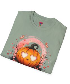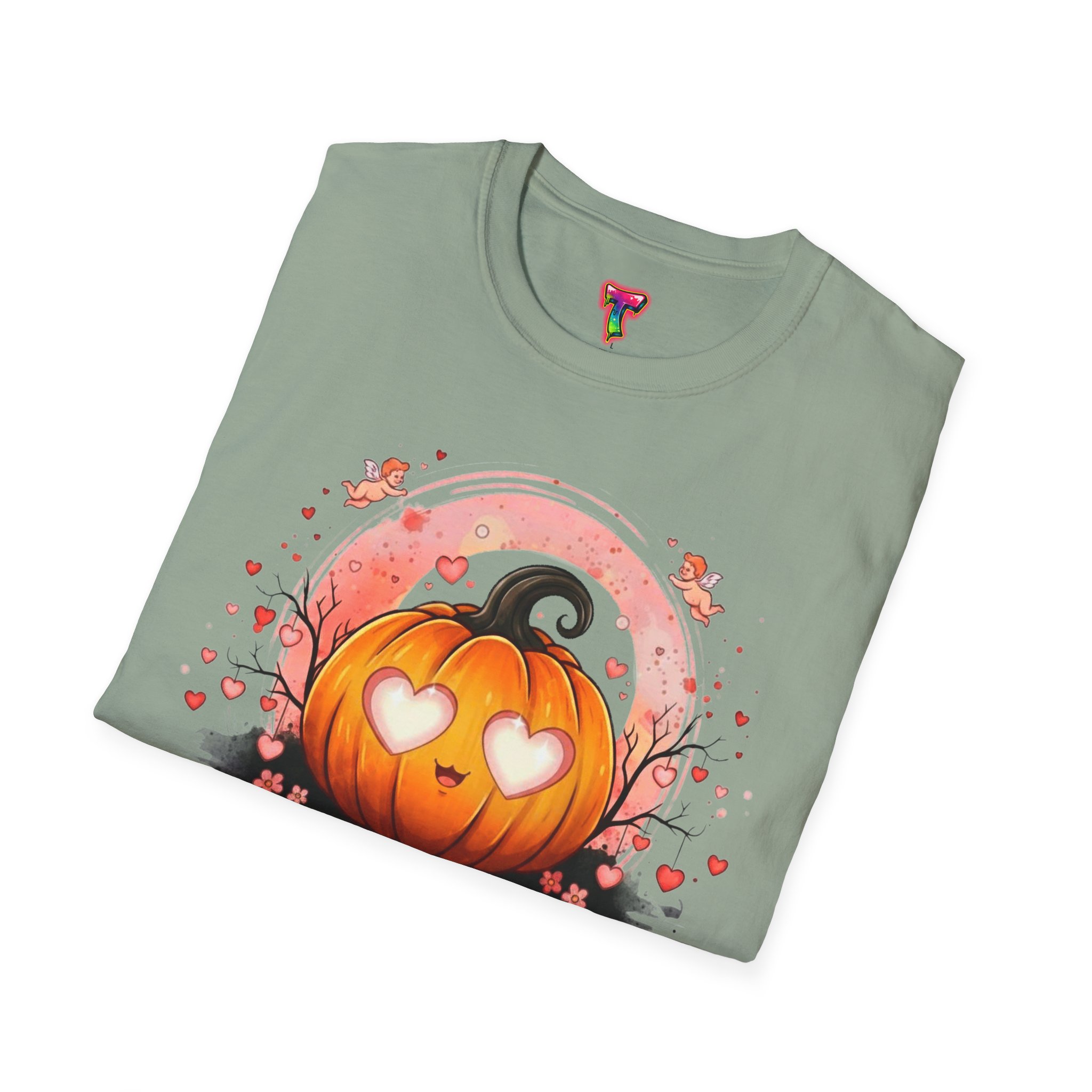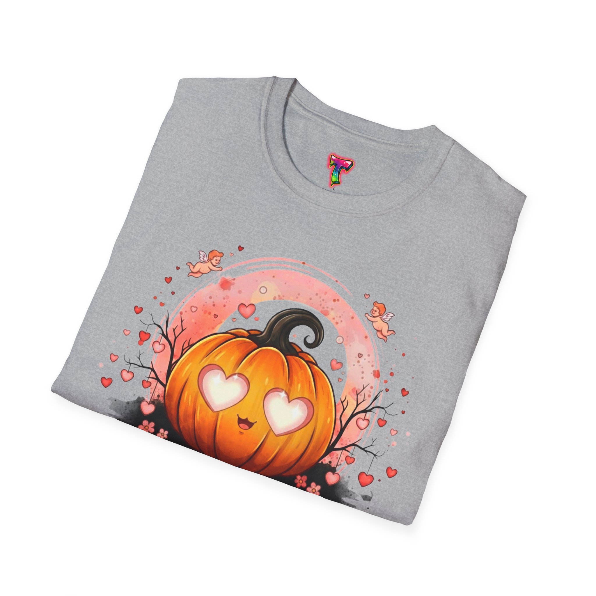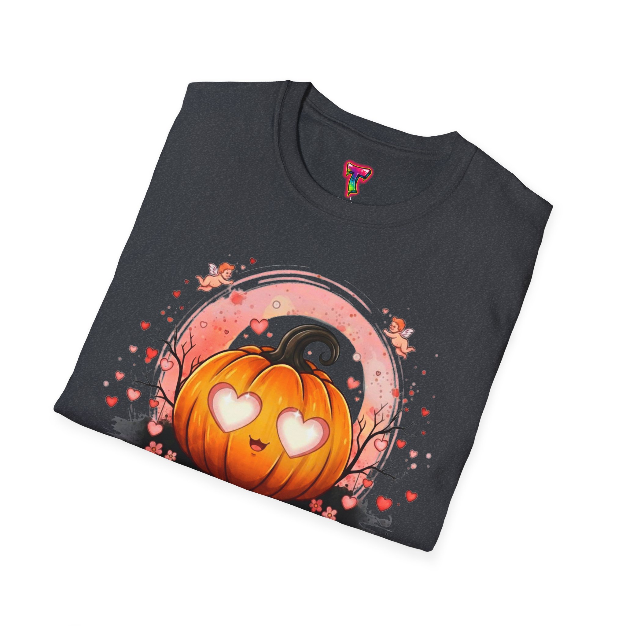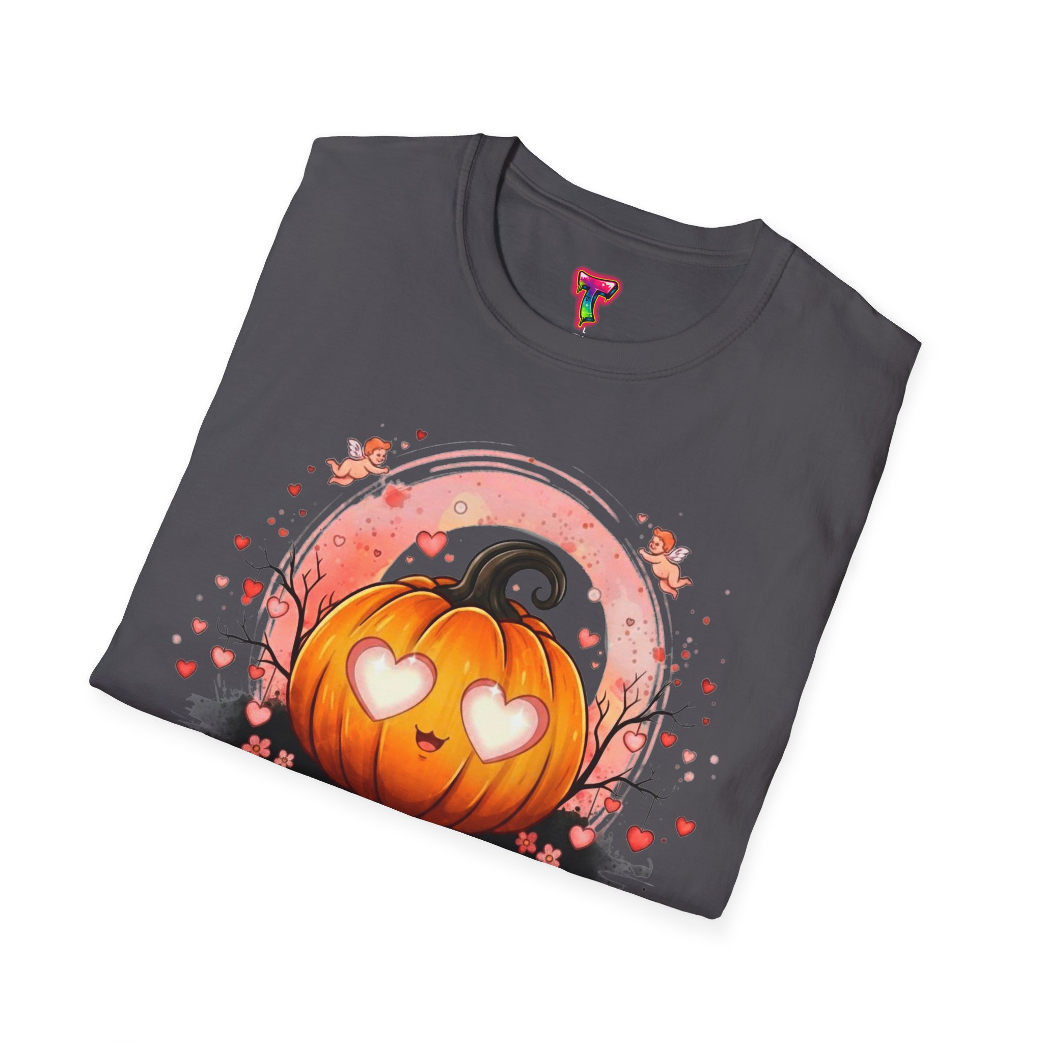 A lightweight, everyday tee that brings a warm, whimsical touch to autumn evenings. The soft, ring-spun cotton drapes easily and holds a vivid pumpkin illustration—heart-shaped eyes glowing against a moonlit, floral-splatter backdrop. Wear it on crisp walks, at low-key fall gatherings, or while carving pumpkins; it settles into your routine without fuss and keeps the artwork front-and-center. Subtle details like a tear-away label and reinforced shoulders mean comfort that lasts through repeated wears and washes. The neutral crew silhouette pairs with layered flannels, denim jackets, or cozy scarves for an easy seasonal look.