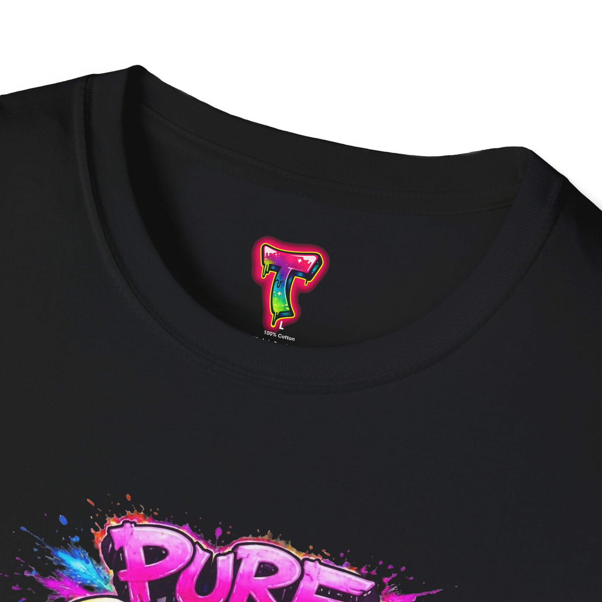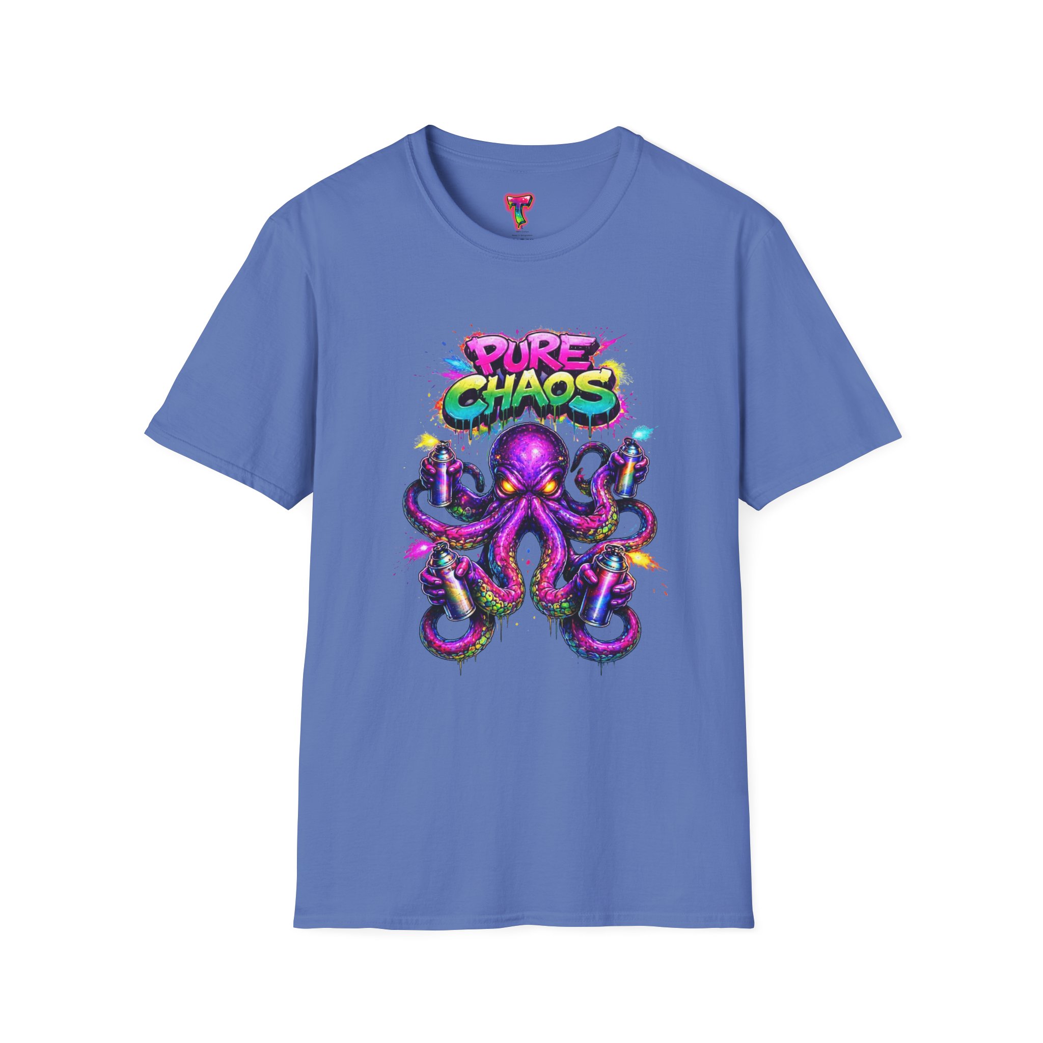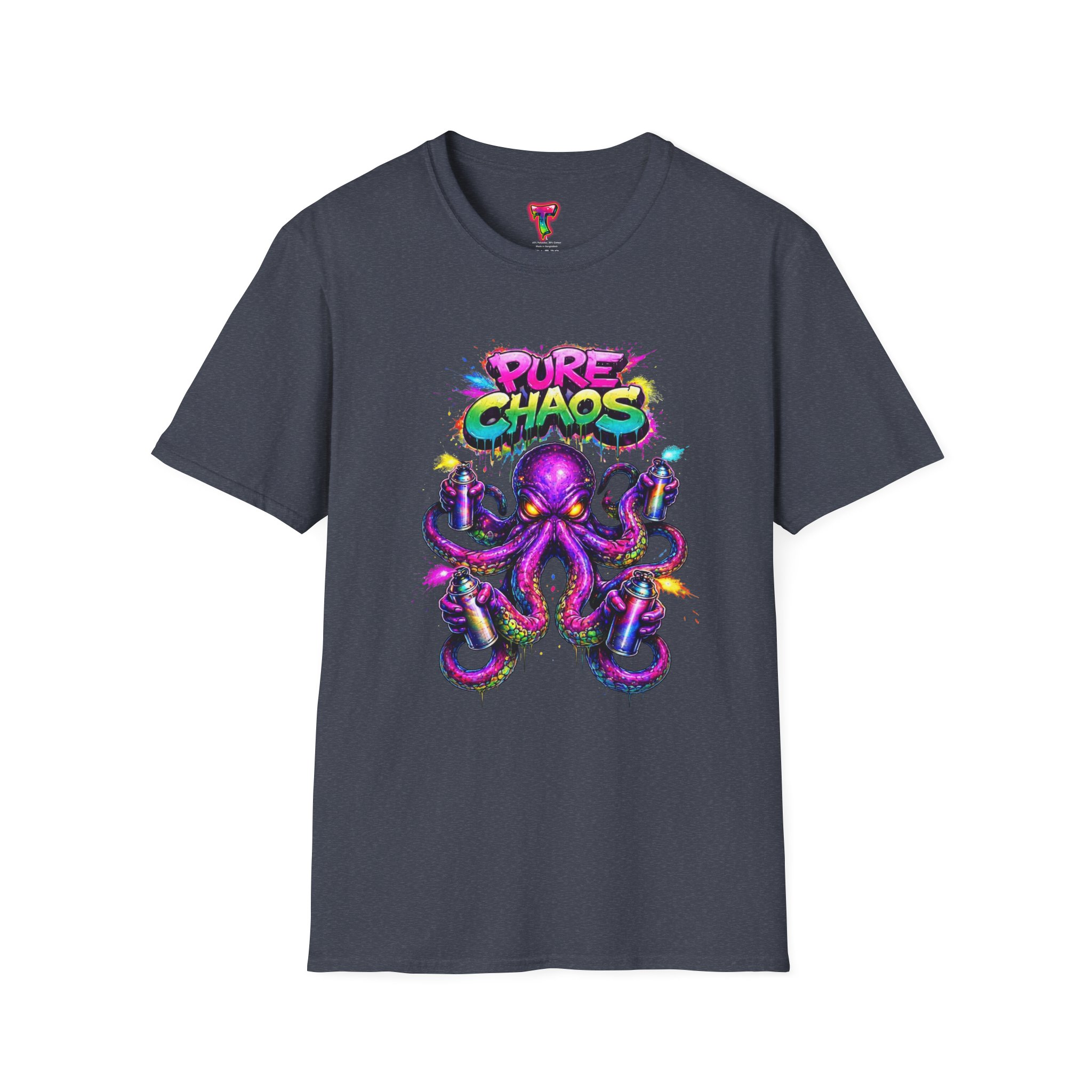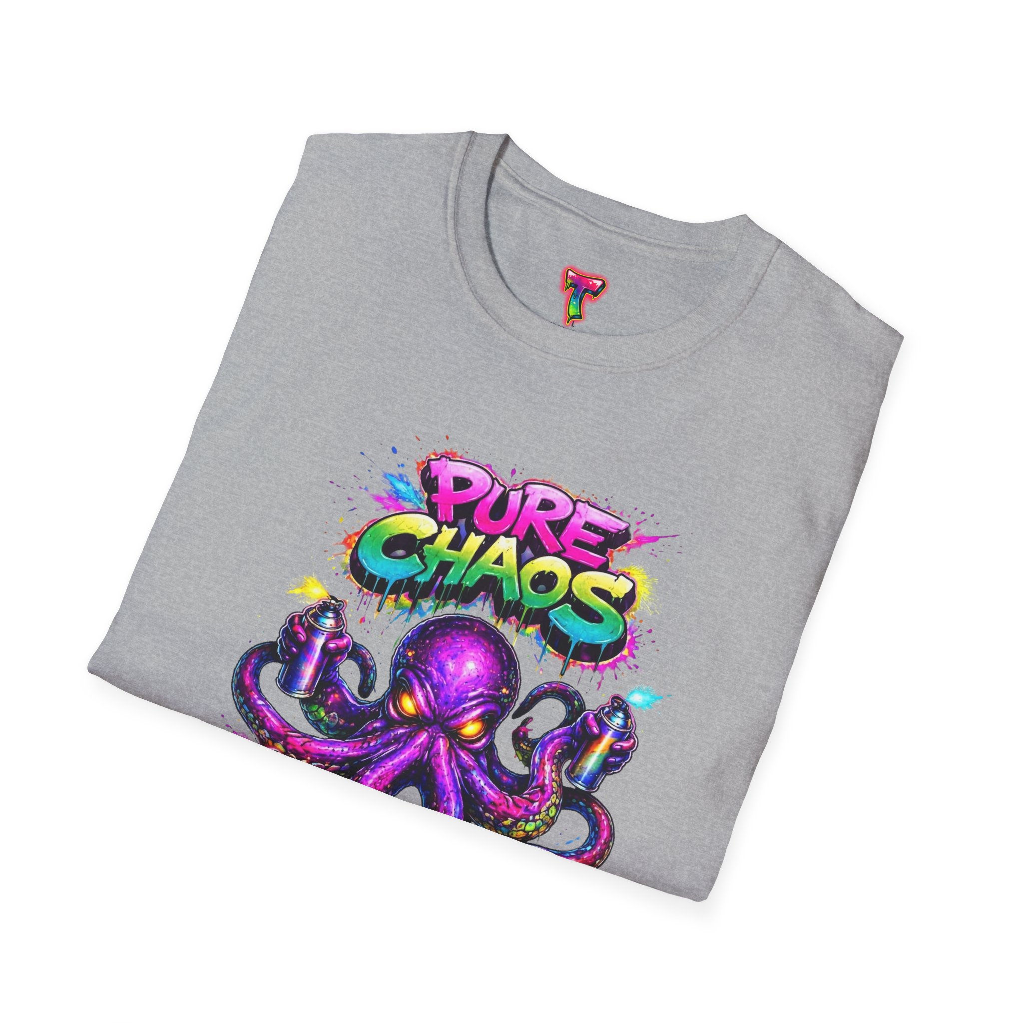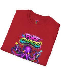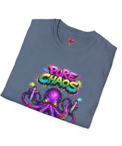 This lightweight crew-neck tee brings bold street-art energy to everyday wear. A vibrant, graffiti-style octopus splashes across the chest in neon purples, pinks and turquoise, with the playful “Pure Chaos” tag arcing above. The printed artwork feels fresh and chaotic in the best way—loud, confident, and full of personality—while the shirt’s soft ring-spun cotton and classic cut keep it comfortable and easy to move in. Wear it to stand out at shows, skate sessions, or casual nights out; it layers cleanly under jackets and sits comfortably alone when you want the art to do the talking.