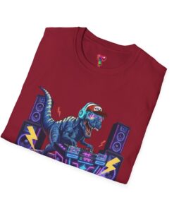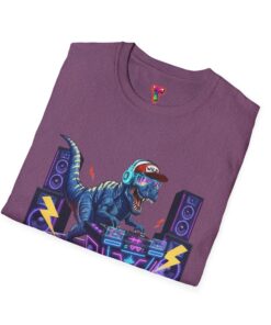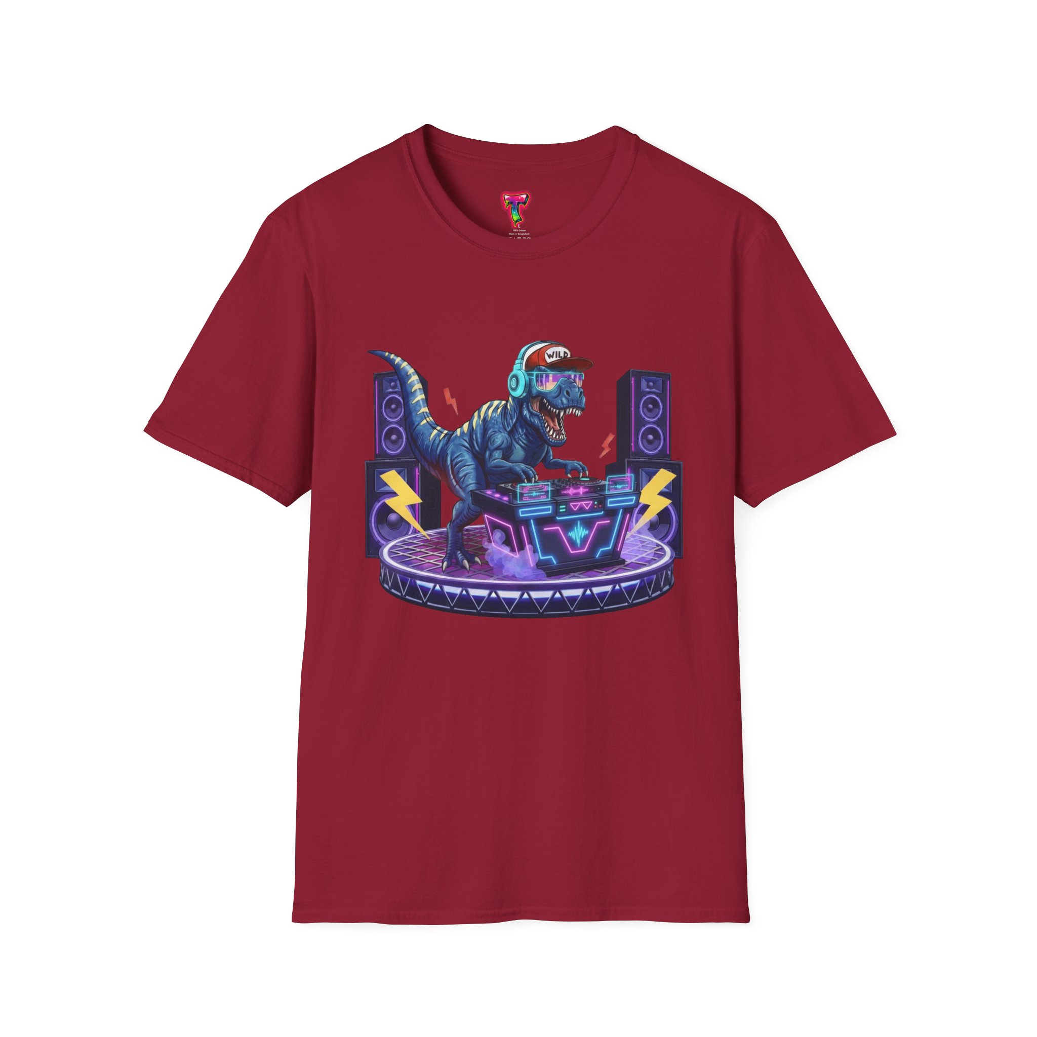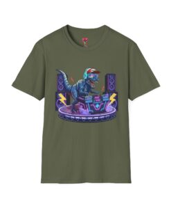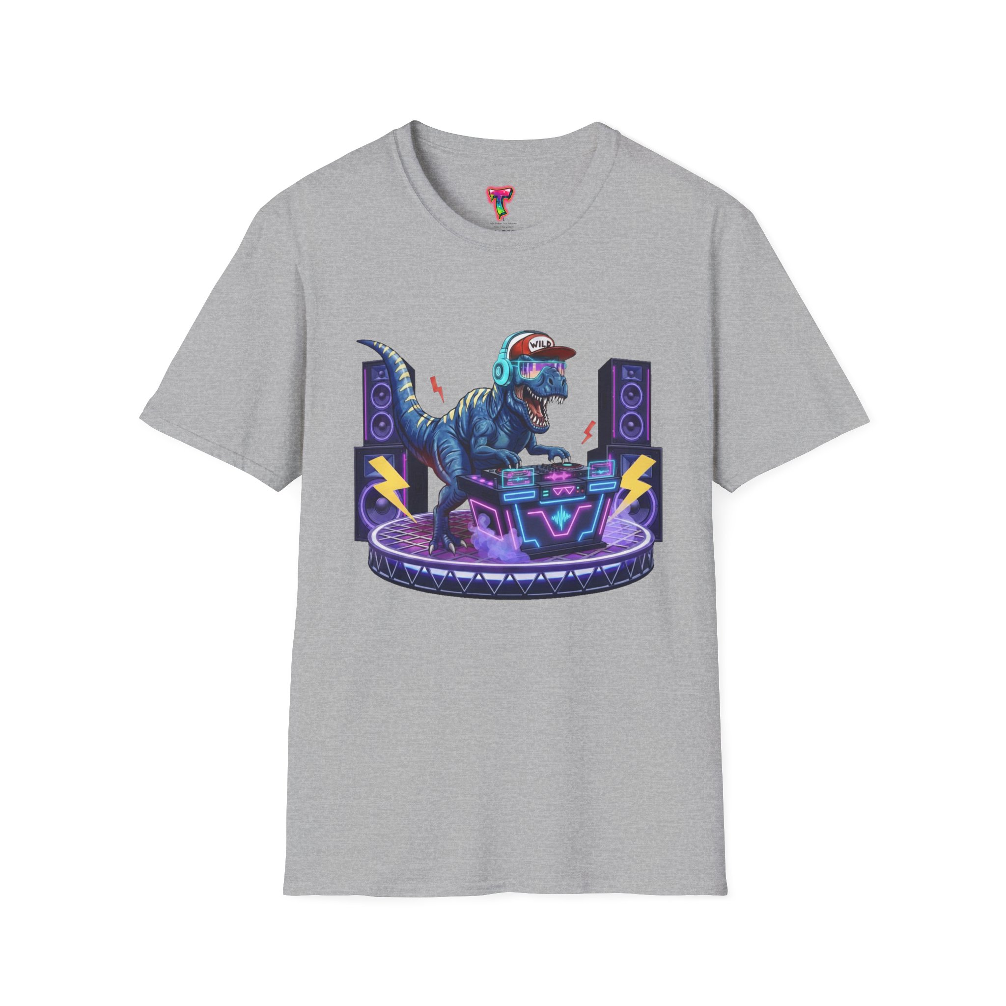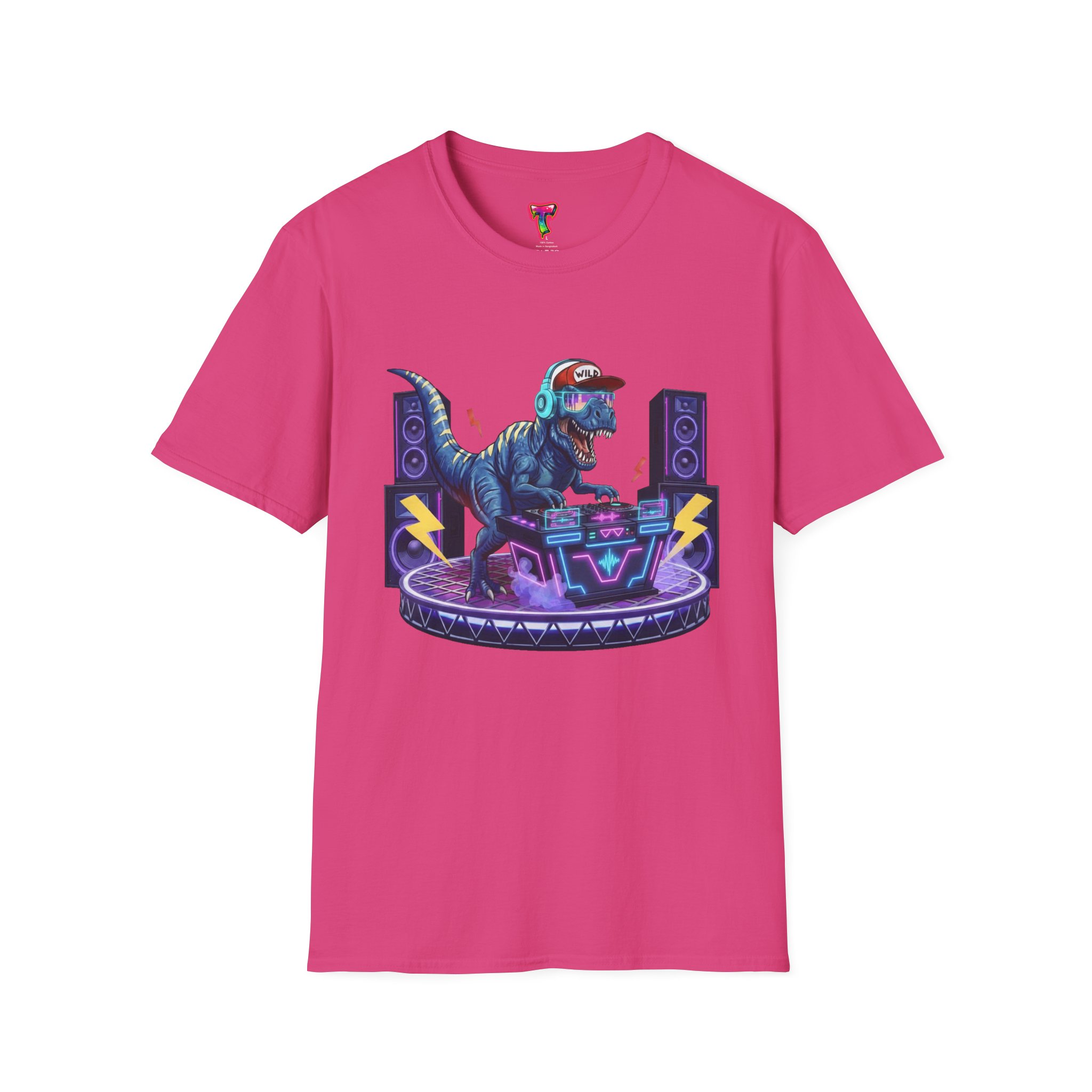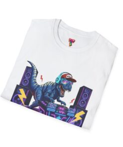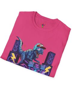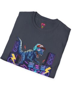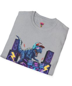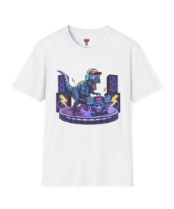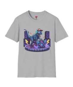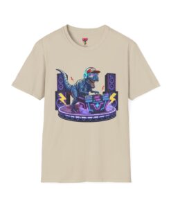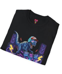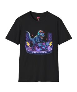 Feel the bass and the grin of pure nostalgia with this lightweight crew tee. A neon-drenched T-Rex drops beats from a retro DJ booth — vivid DTG prints keep the colors sharp while the soft ring-spun cotton sits cool and comfortable against your skin. Wear it to late-night vinyl runs, arcade meetups, or when you want a playful statement that reads loud without saying a word. The clean crew neckline and classic fit layer easily under jackets or stand alone as the centerpiece of a casual outfit.