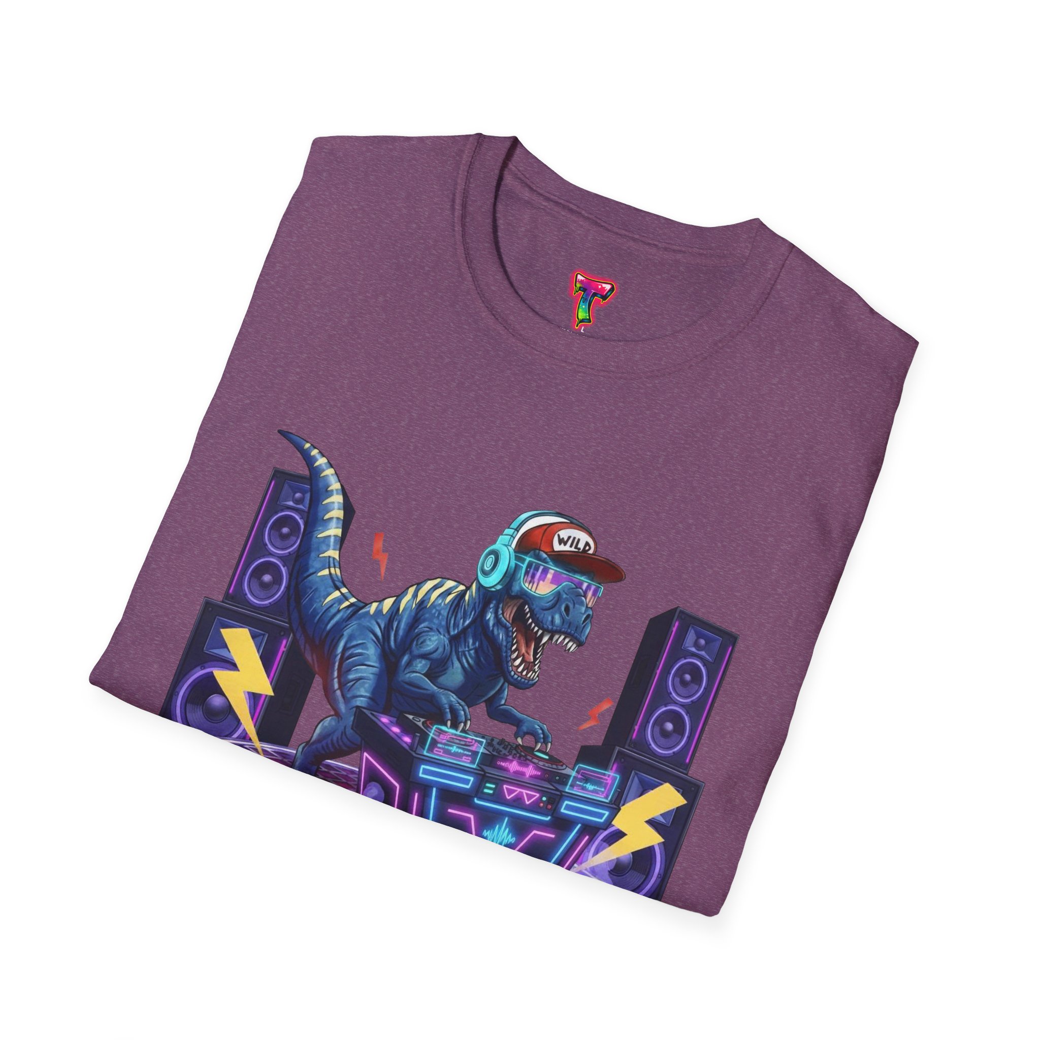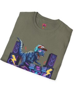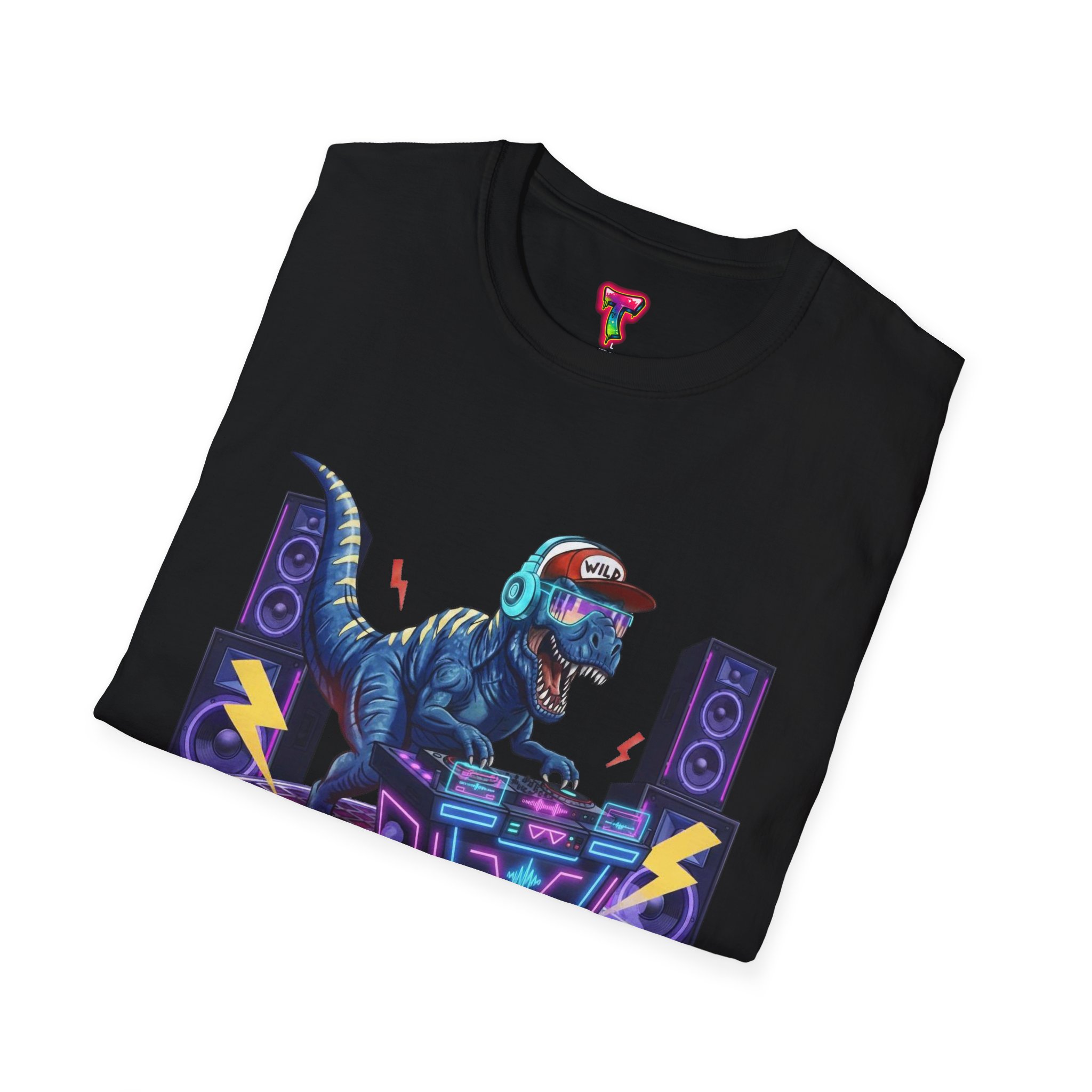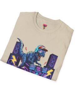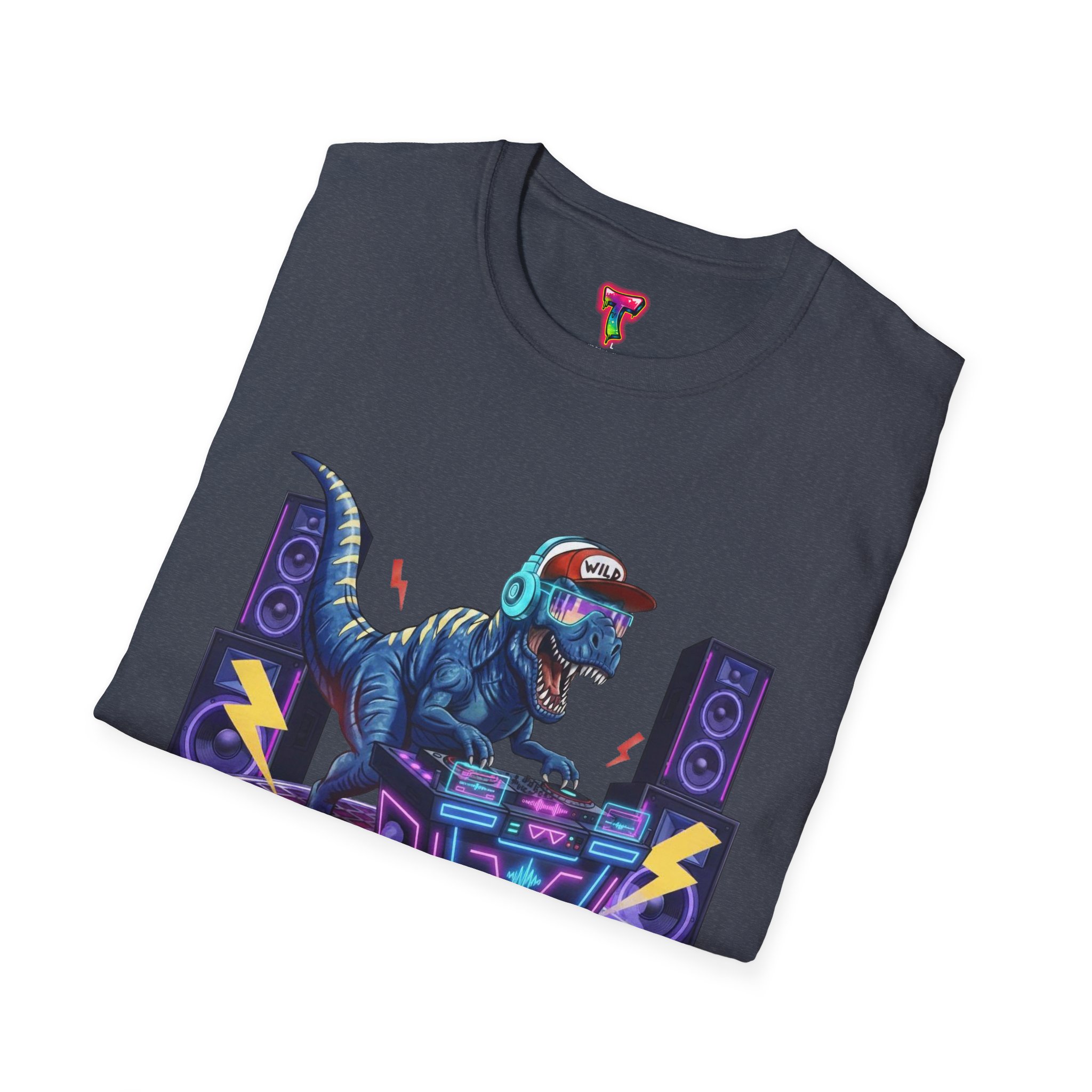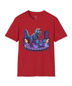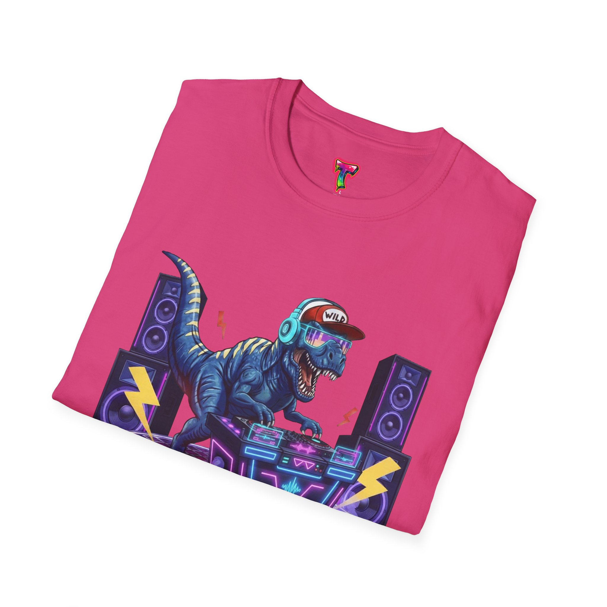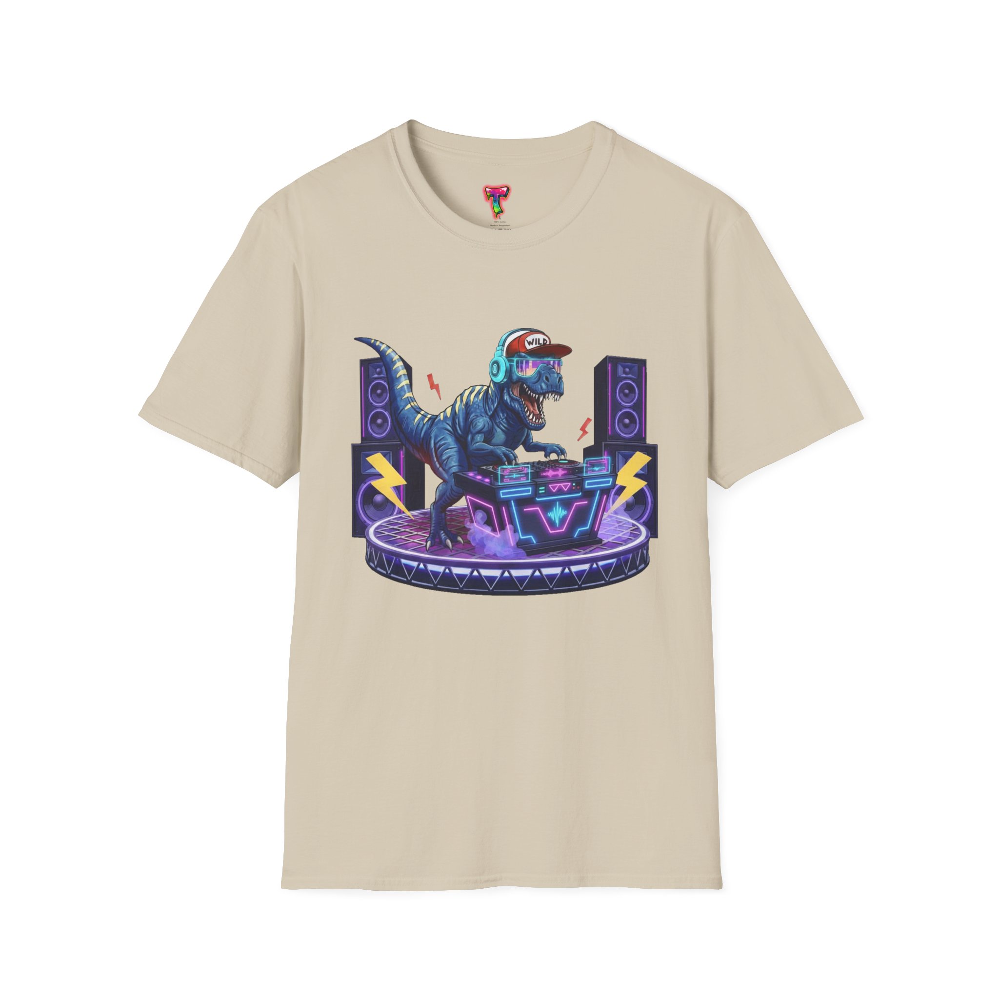 Feel the bass and the grin of pure nostalgia with this lightweight crew tee. A neon-drenched T-Rex drops beats from a retro DJ booth — vivid DTG prints keep the colors sharp while the soft ring-spun cotton sits cool and comfortable against your skin. Wear it to late-night vinyl runs, arcade meetups, or when you want a playful statement that reads loud without saying a word. The clean crew neckline and classic fit layer easily under jackets or stand alone as the centerpiece of a casual outfit.