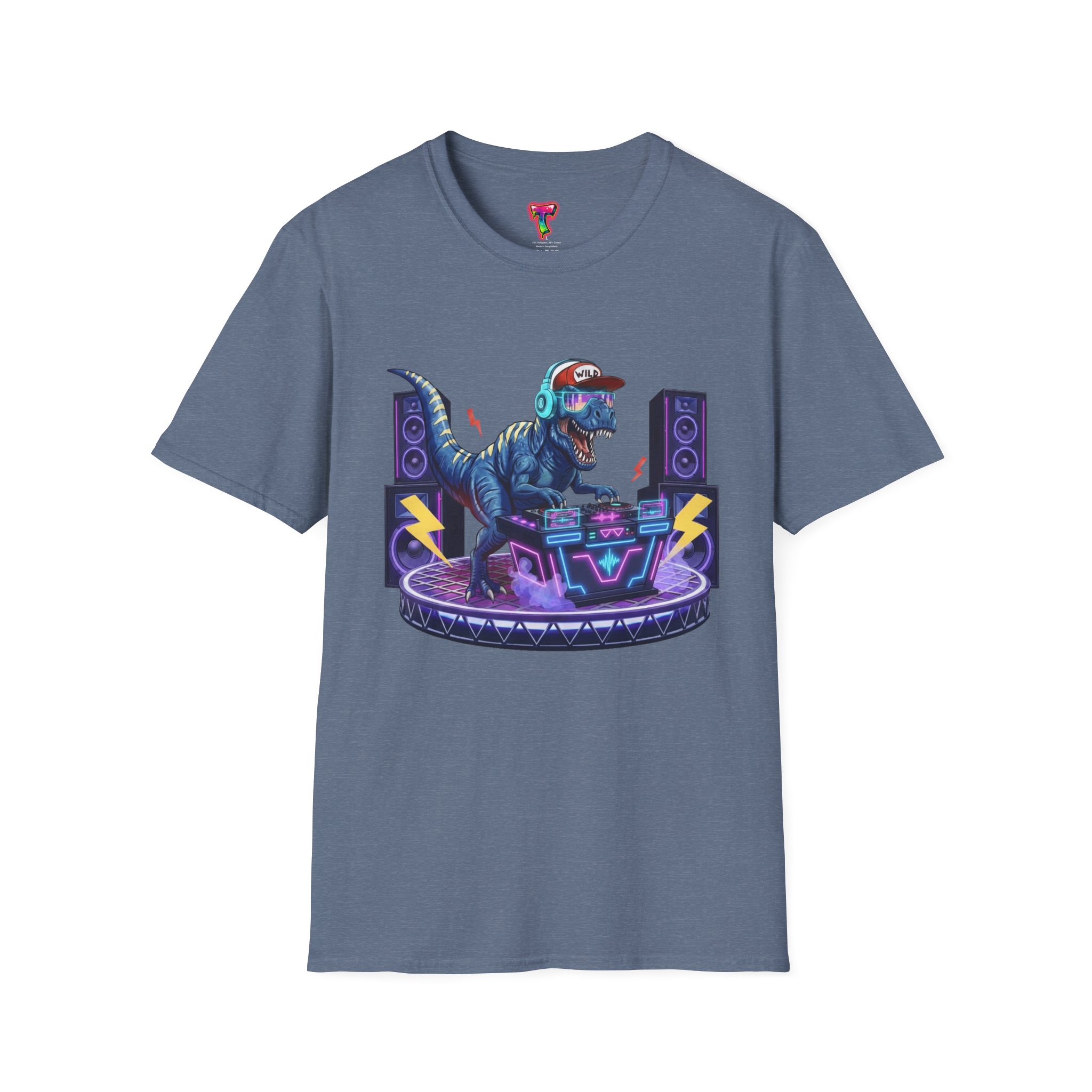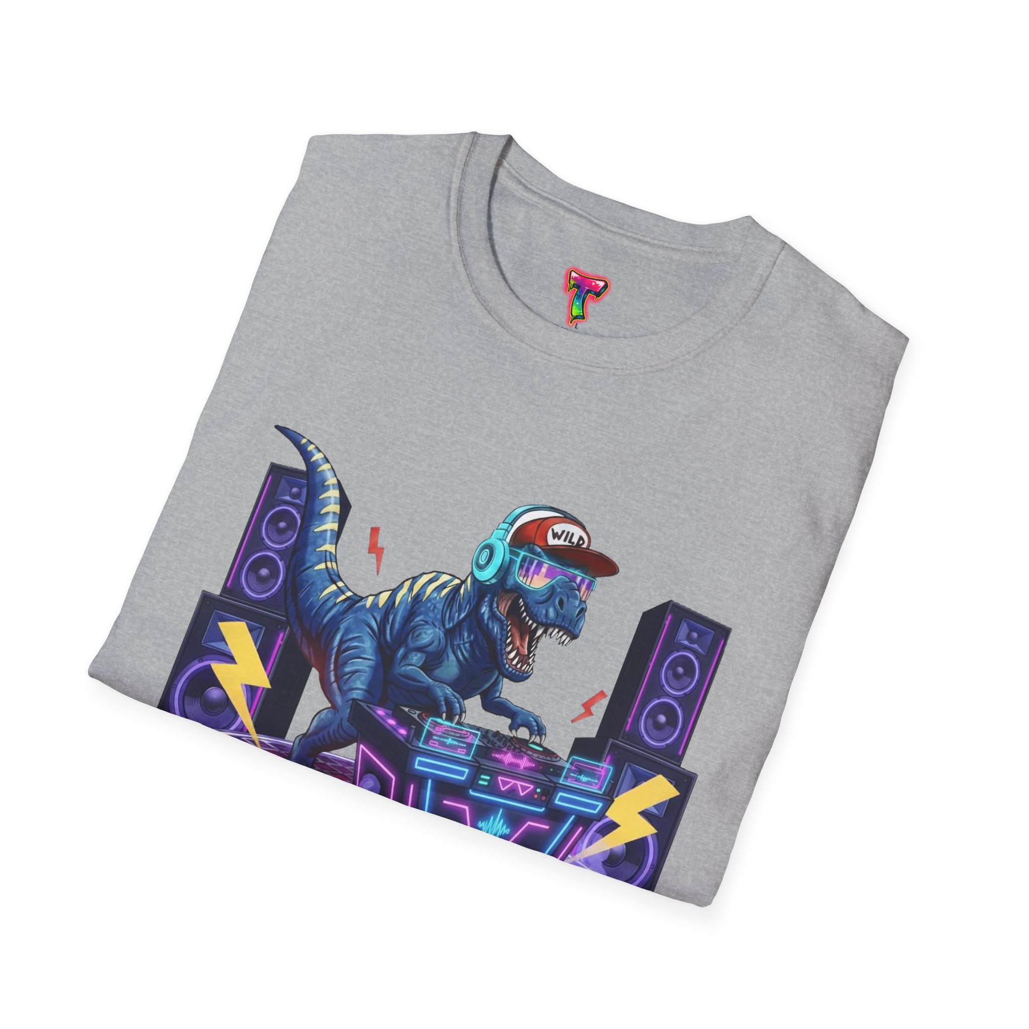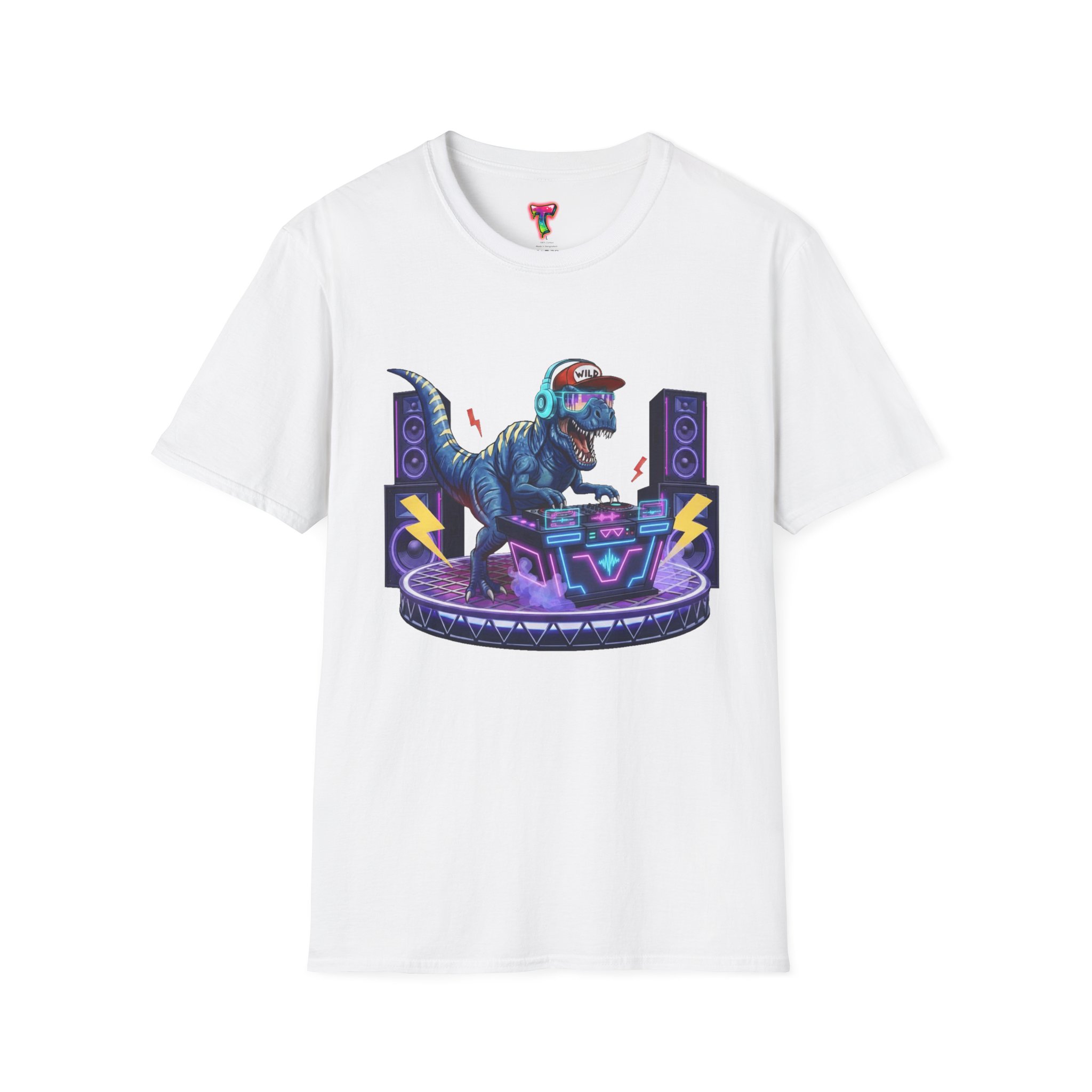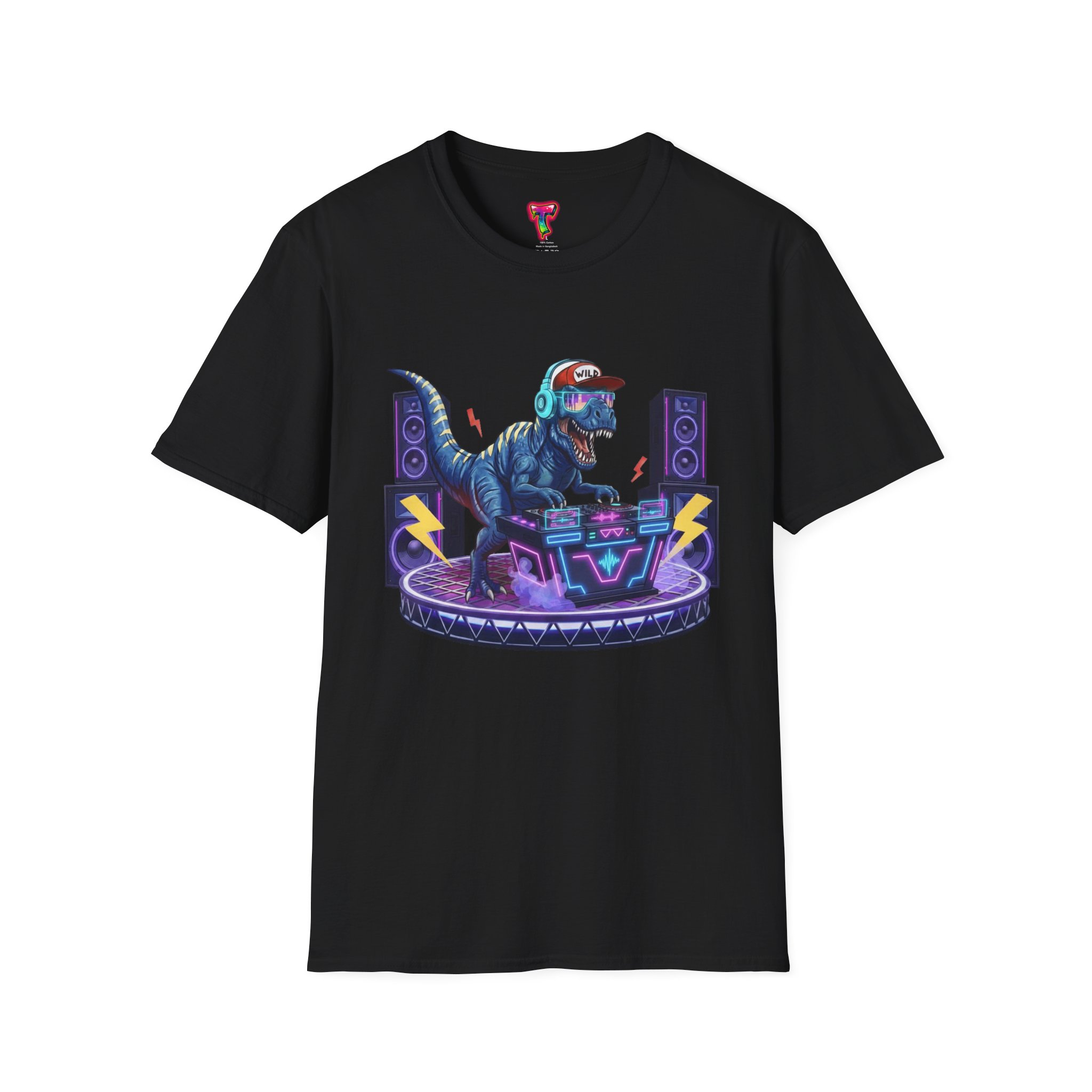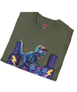 Feel the bass and the grin of pure nostalgia with this lightweight crew tee. A neon-drenched T-Rex drops beats from a retro DJ booth — vivid DTG prints keep the colors sharp while the soft ring-spun cotton sits cool and comfortable against your skin. Wear it to late-night vinyl runs, arcade meetups, or when you want a playful statement that reads loud without saying a word. The clean crew neckline and classic fit layer easily under jackets or stand alone as the centerpiece of a casual outfit.