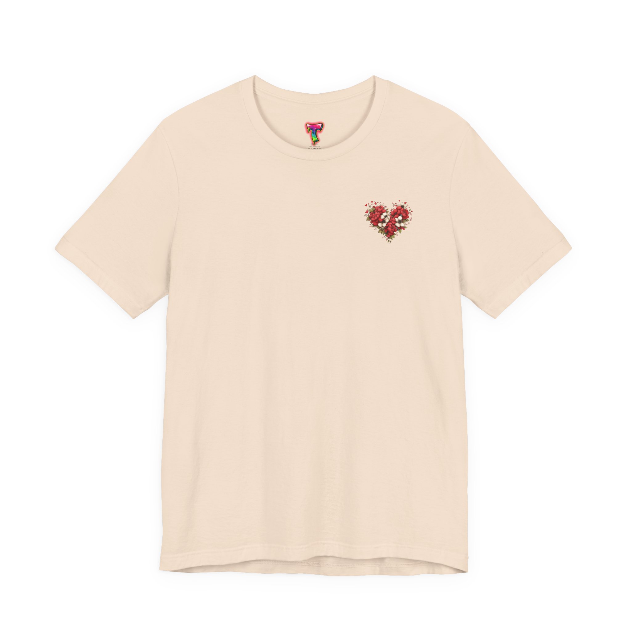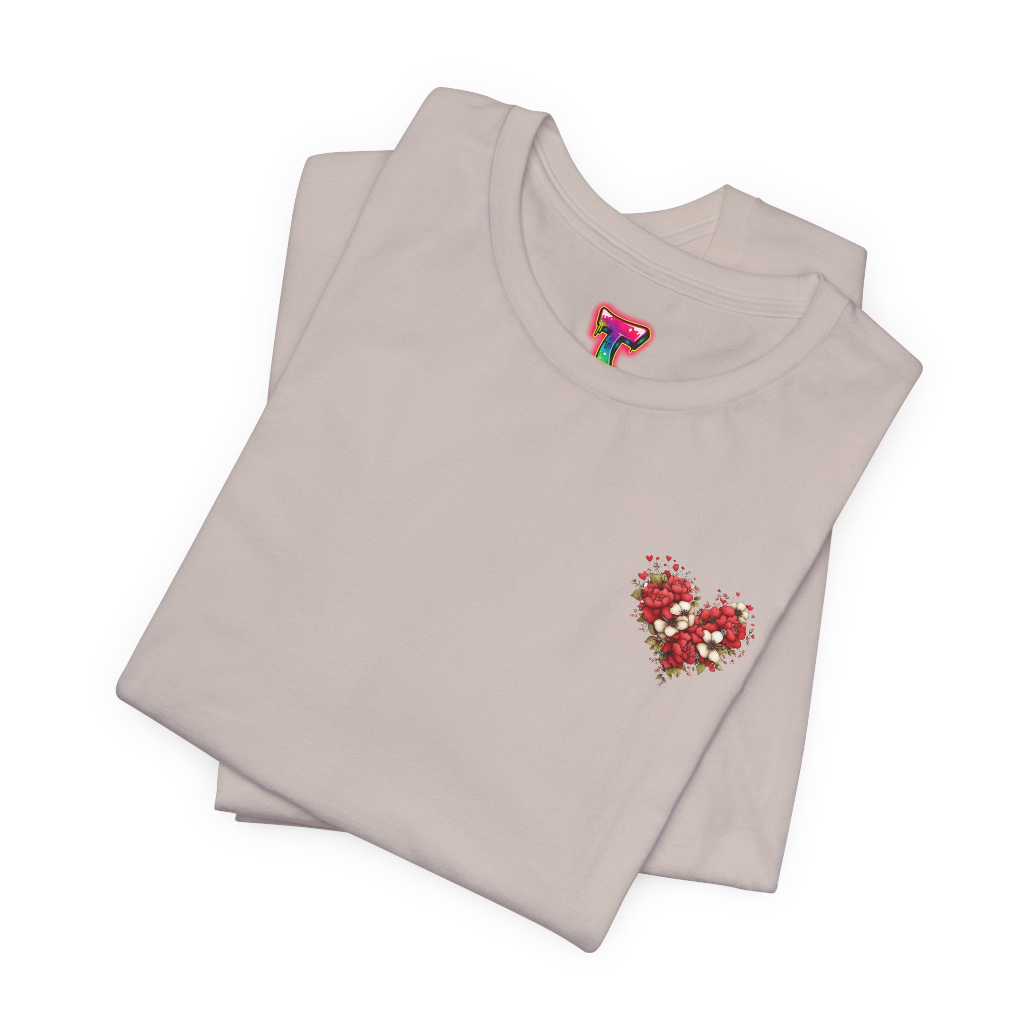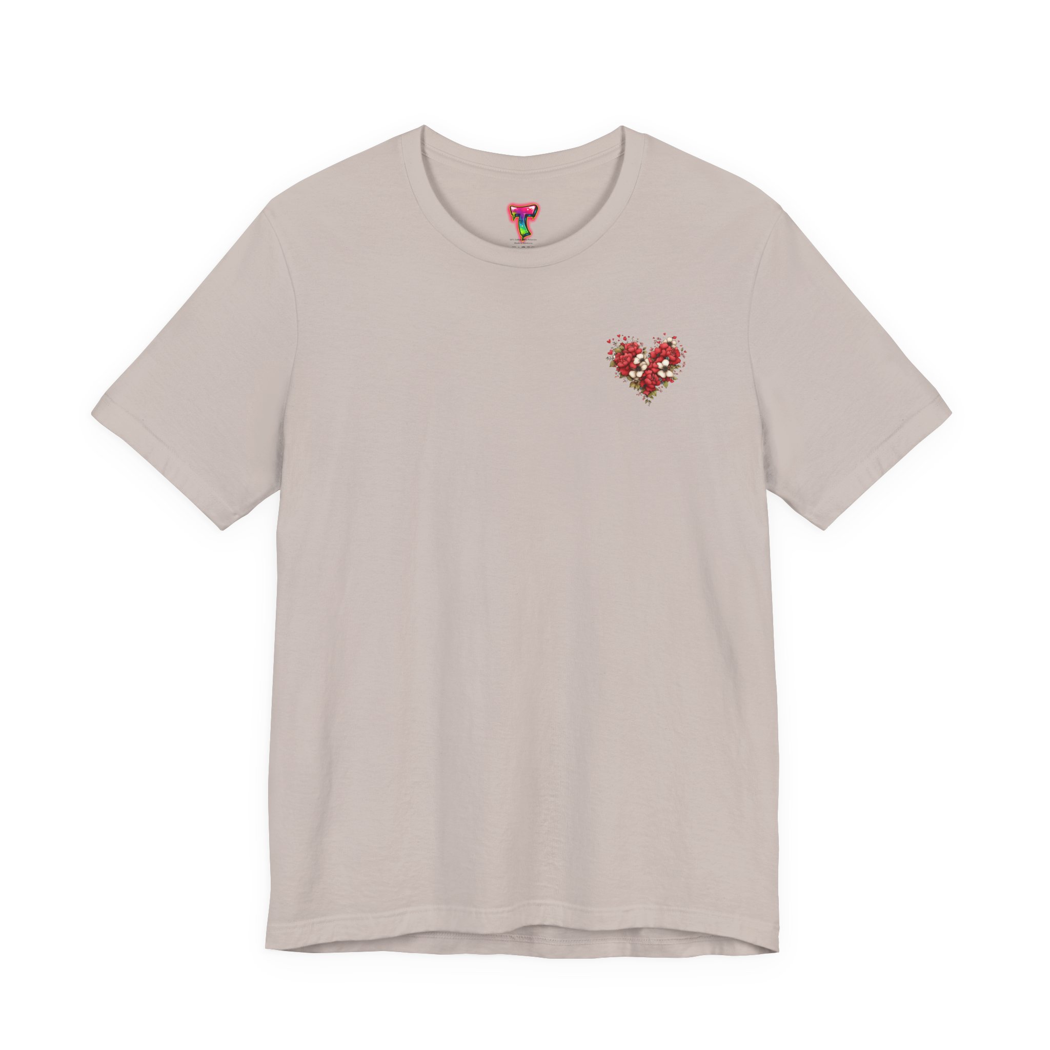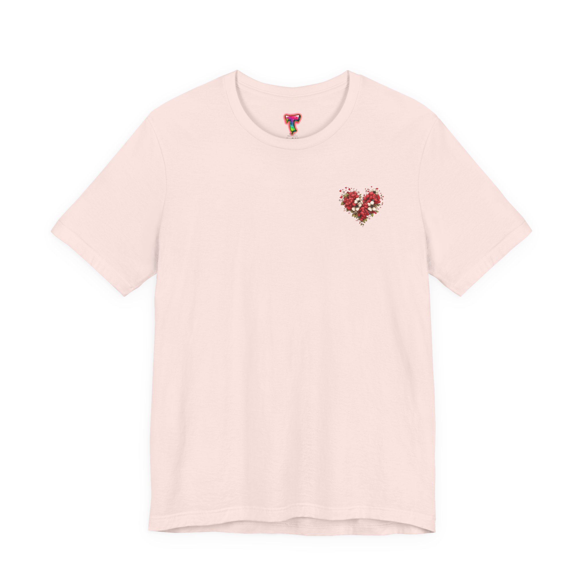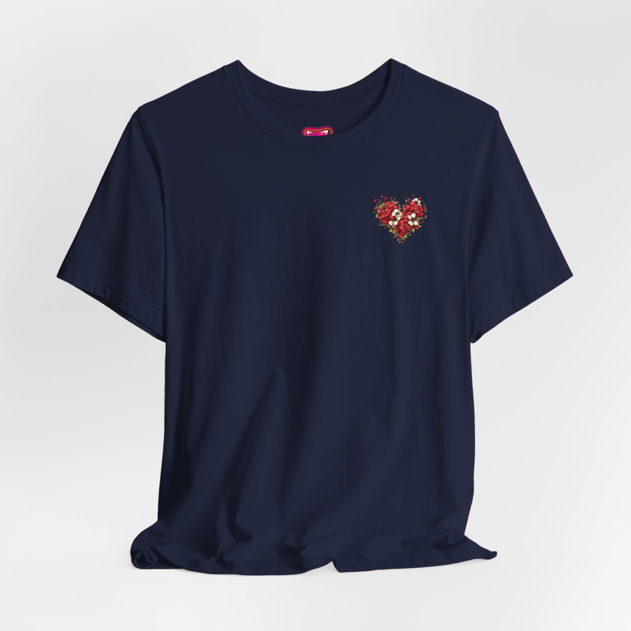 – Small floral heart chest design with crisp print/embroidery look for understated detail