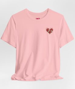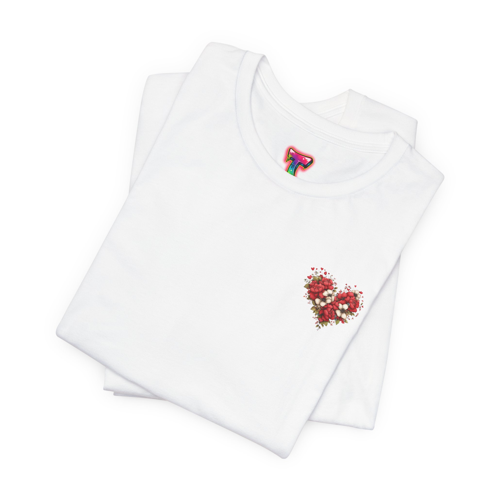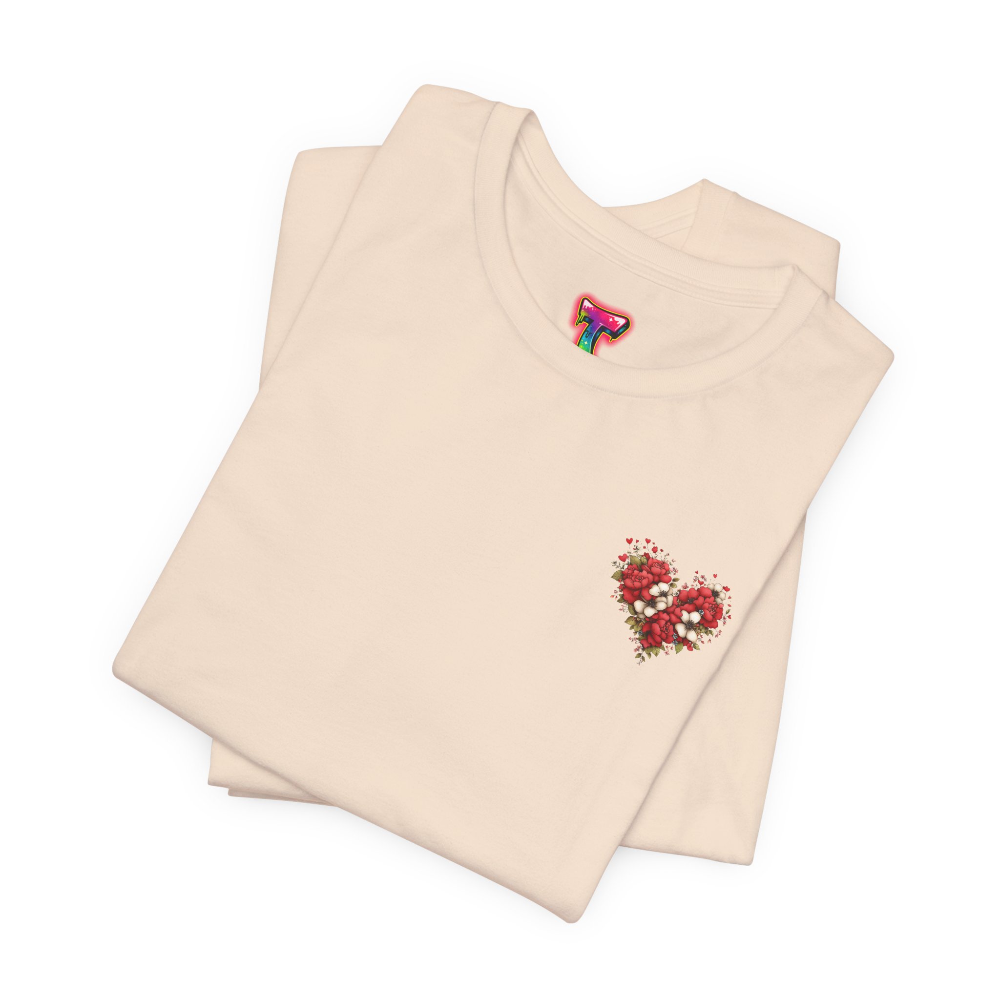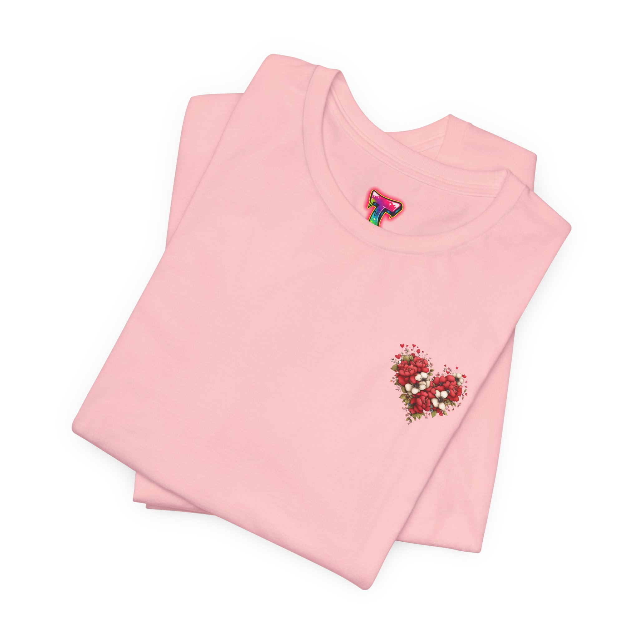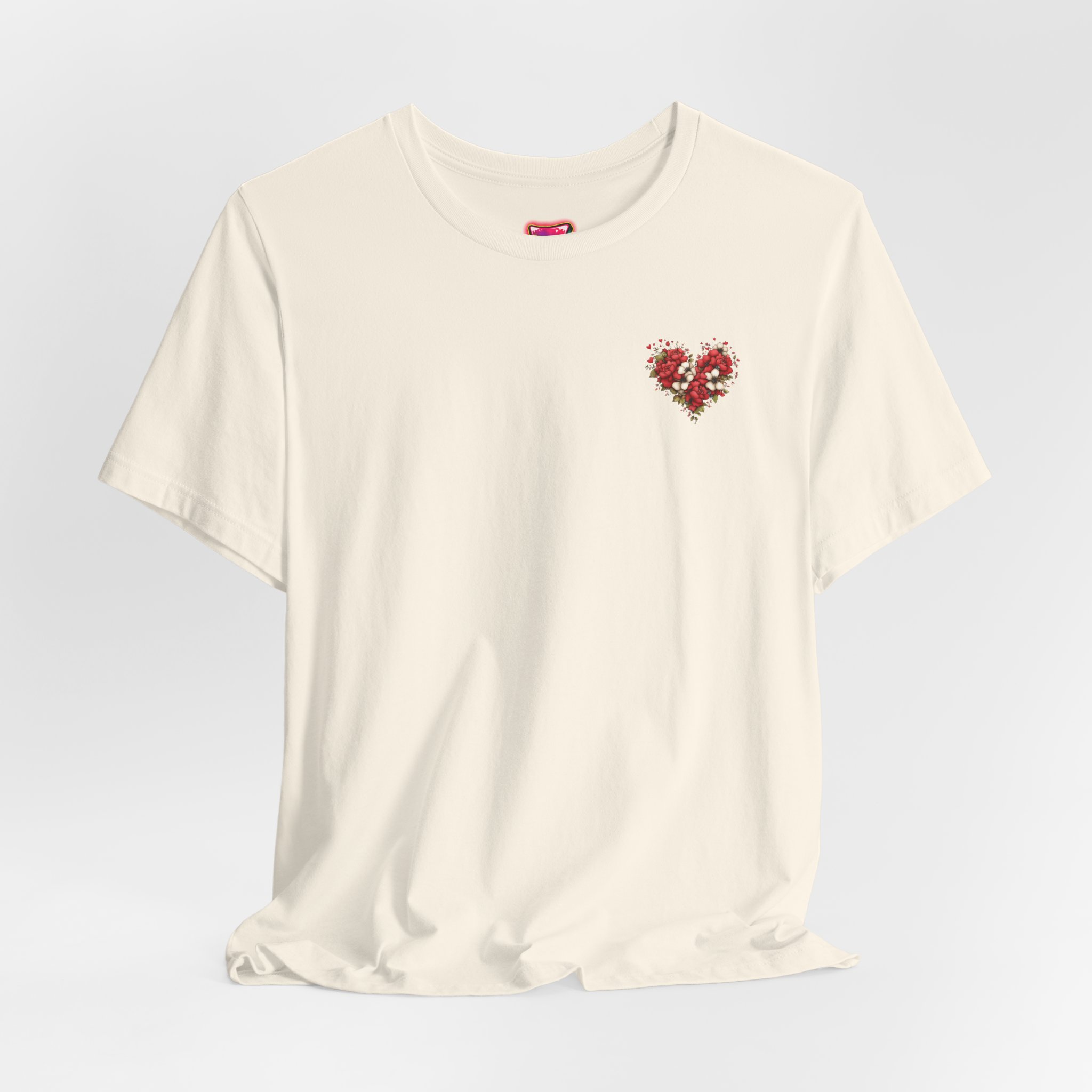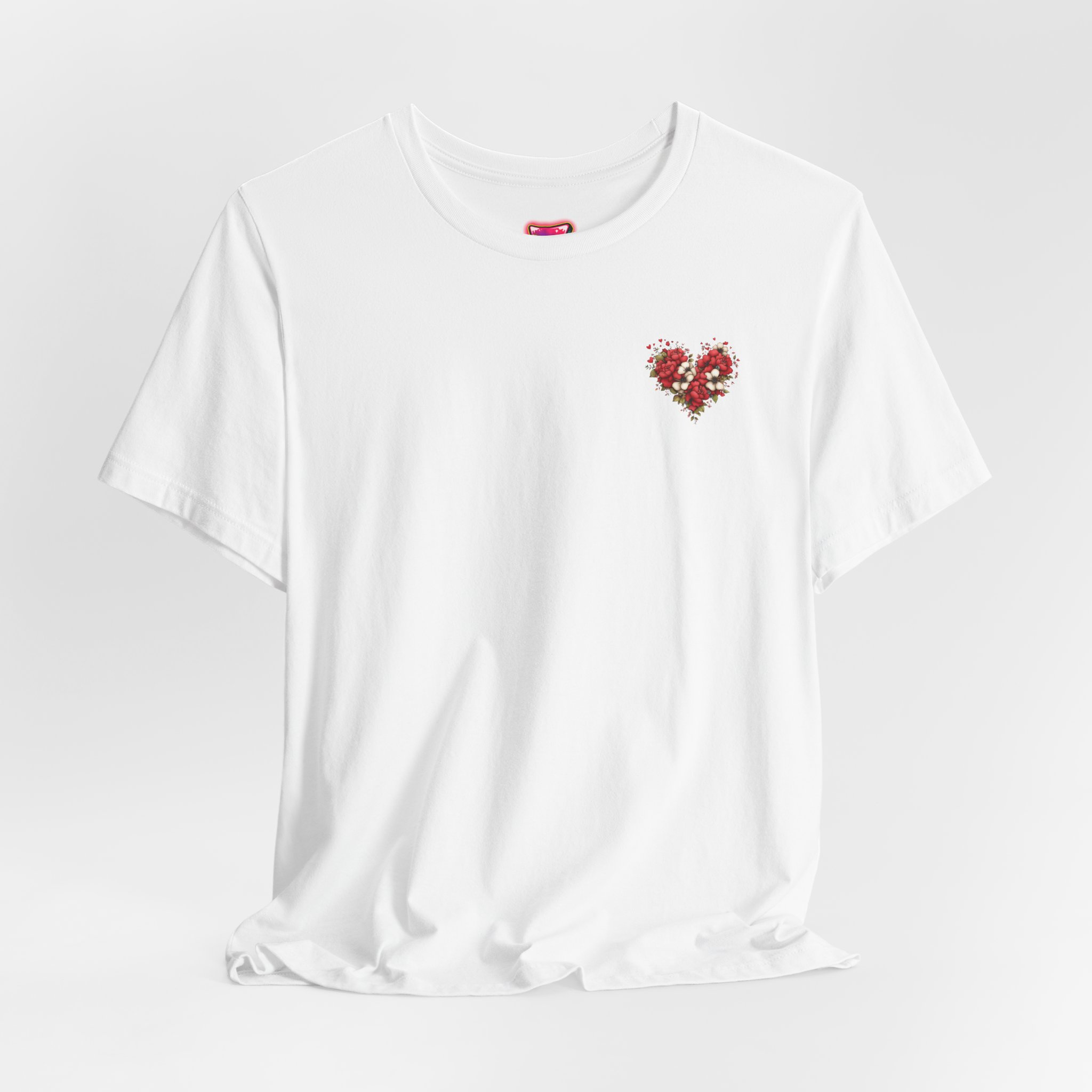 – Small floral heart chest design with crisp print/embroidery look for understated detail