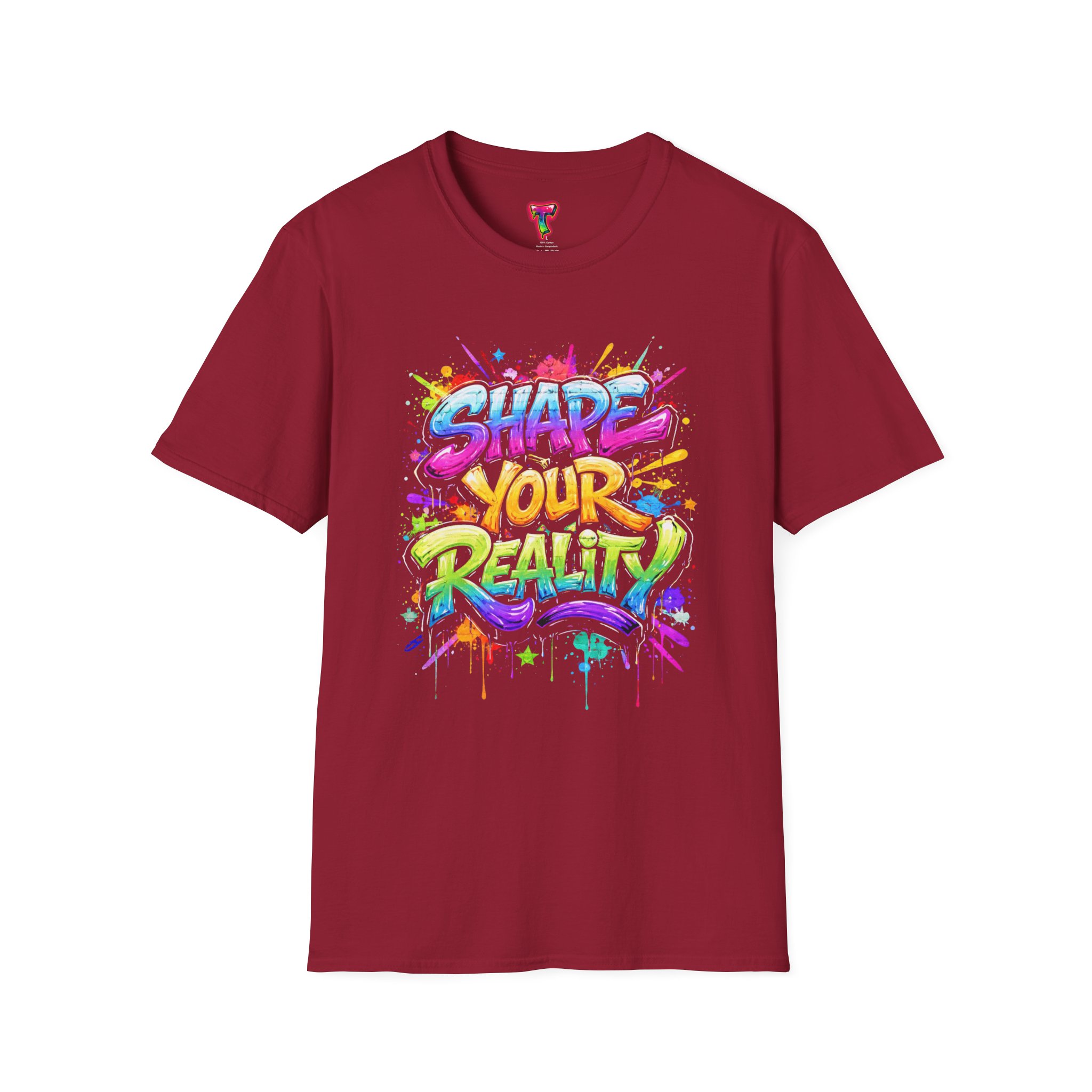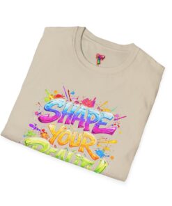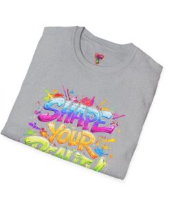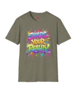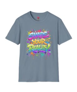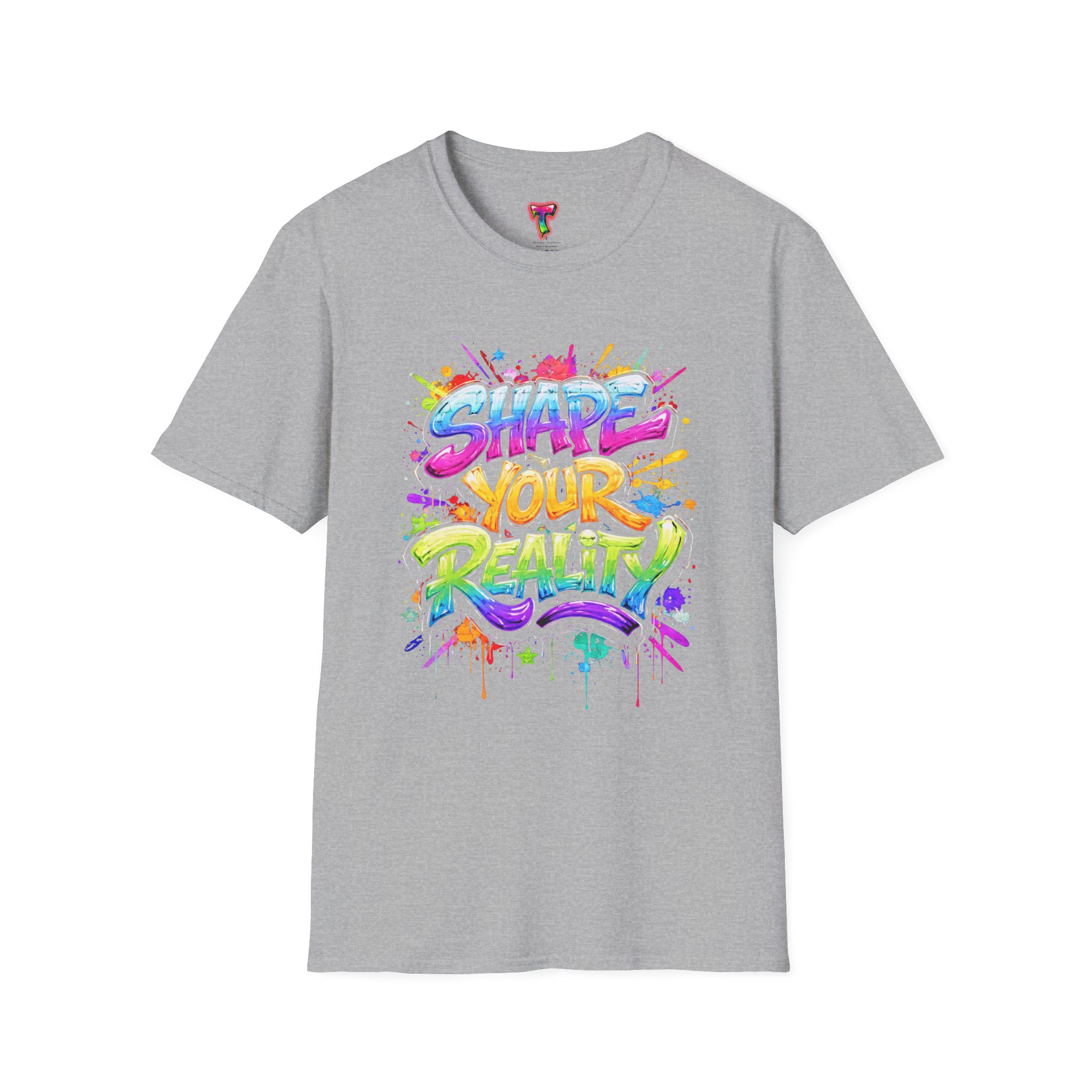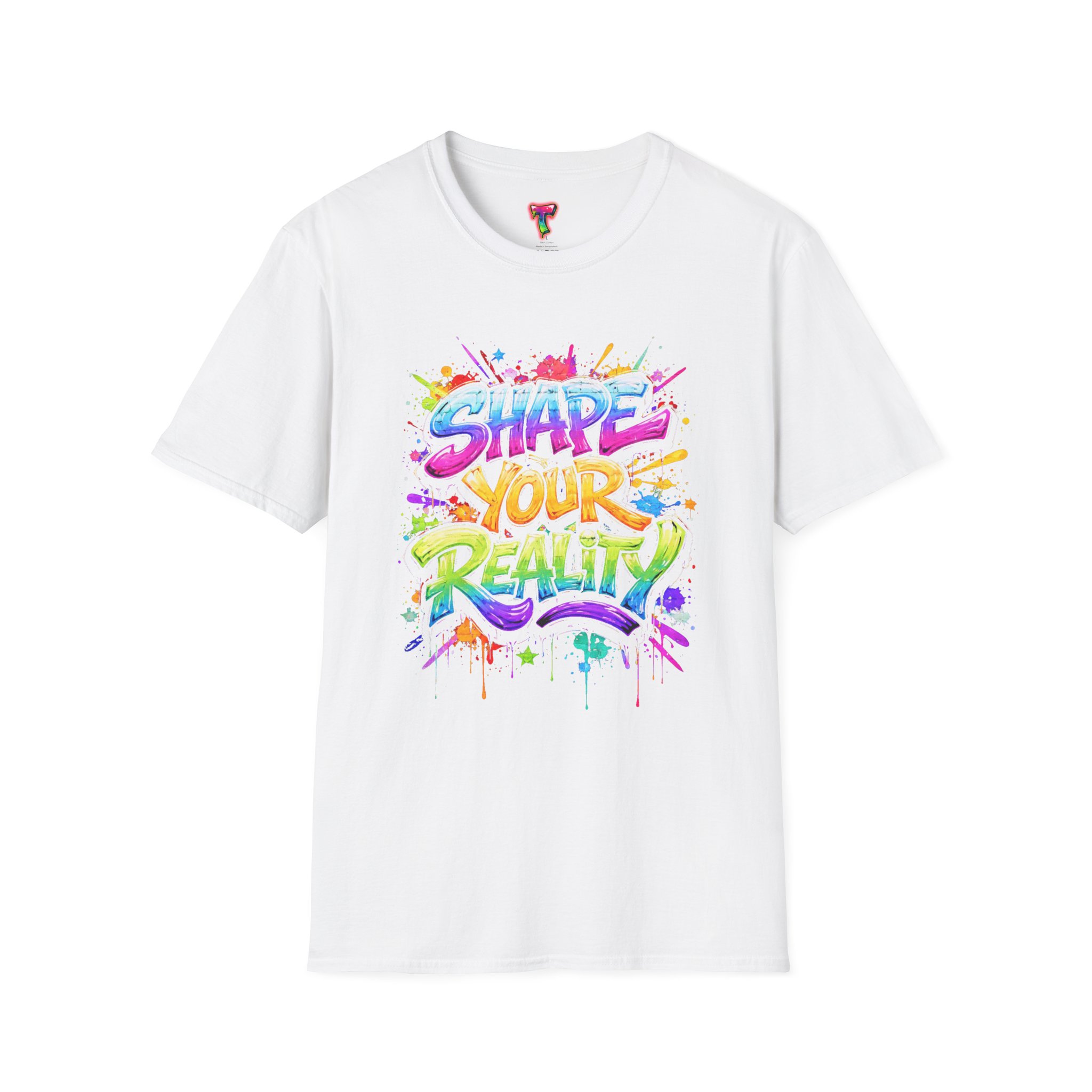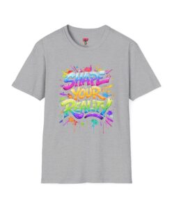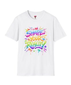 This lightweight crew-neck tee brings bold optimism to everyday wear. A vivid, watercolor-style graphic splashes across the chest with the phrase “Shape Your Reality,” blending neon pinks, greens, blues and yellows into an energetic hand-lettered design. The clean white canvas keeps the artwork front-and-center, while the classic fit and soft ring-spun cotton feel relaxed and breathable from morning coffee to evening walks. Wear it layered under a jacket or solo on warm days — it’s a casual statement piece for someone who likes to carry bright, motivating energy wherever they go.