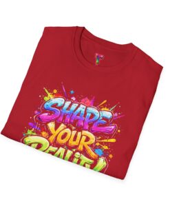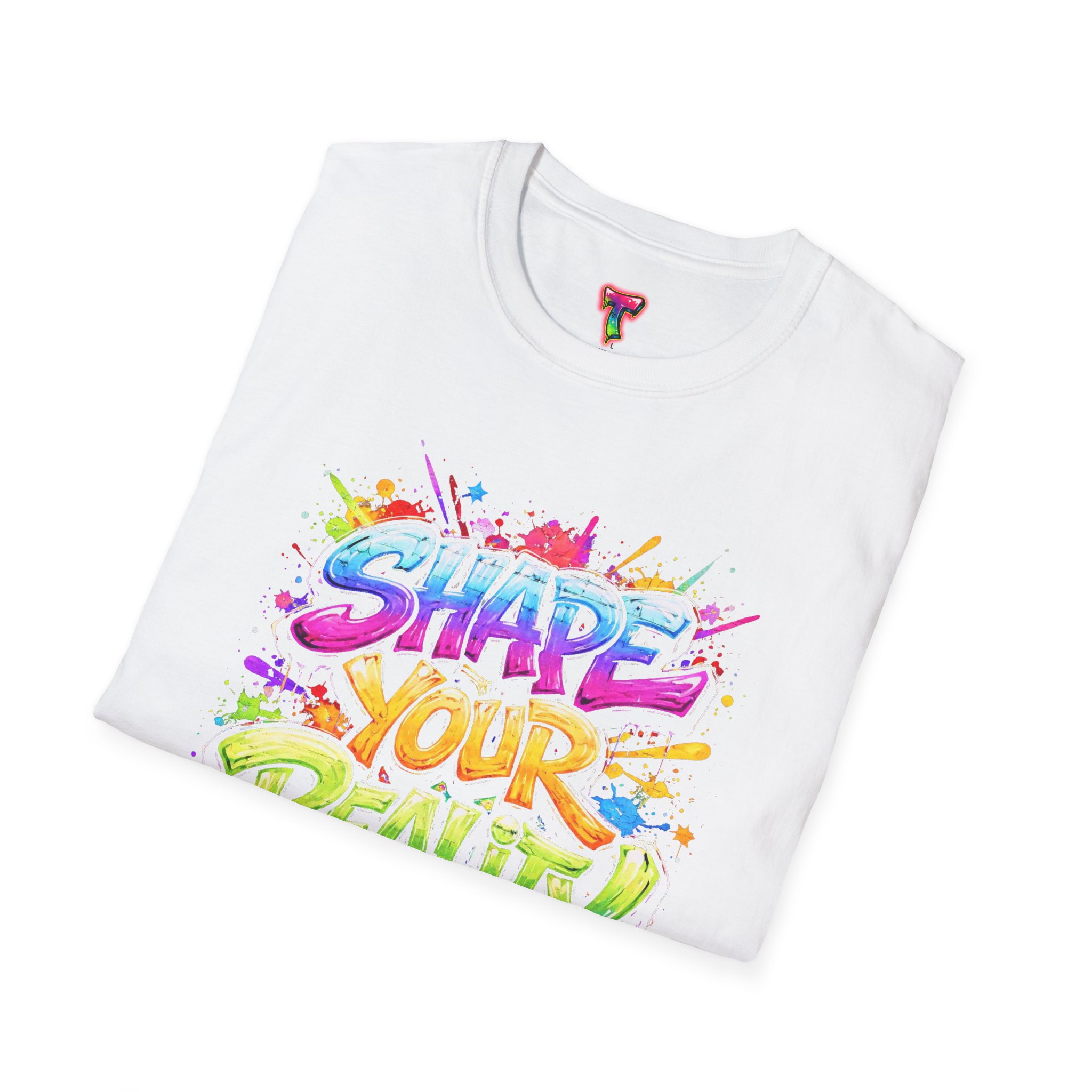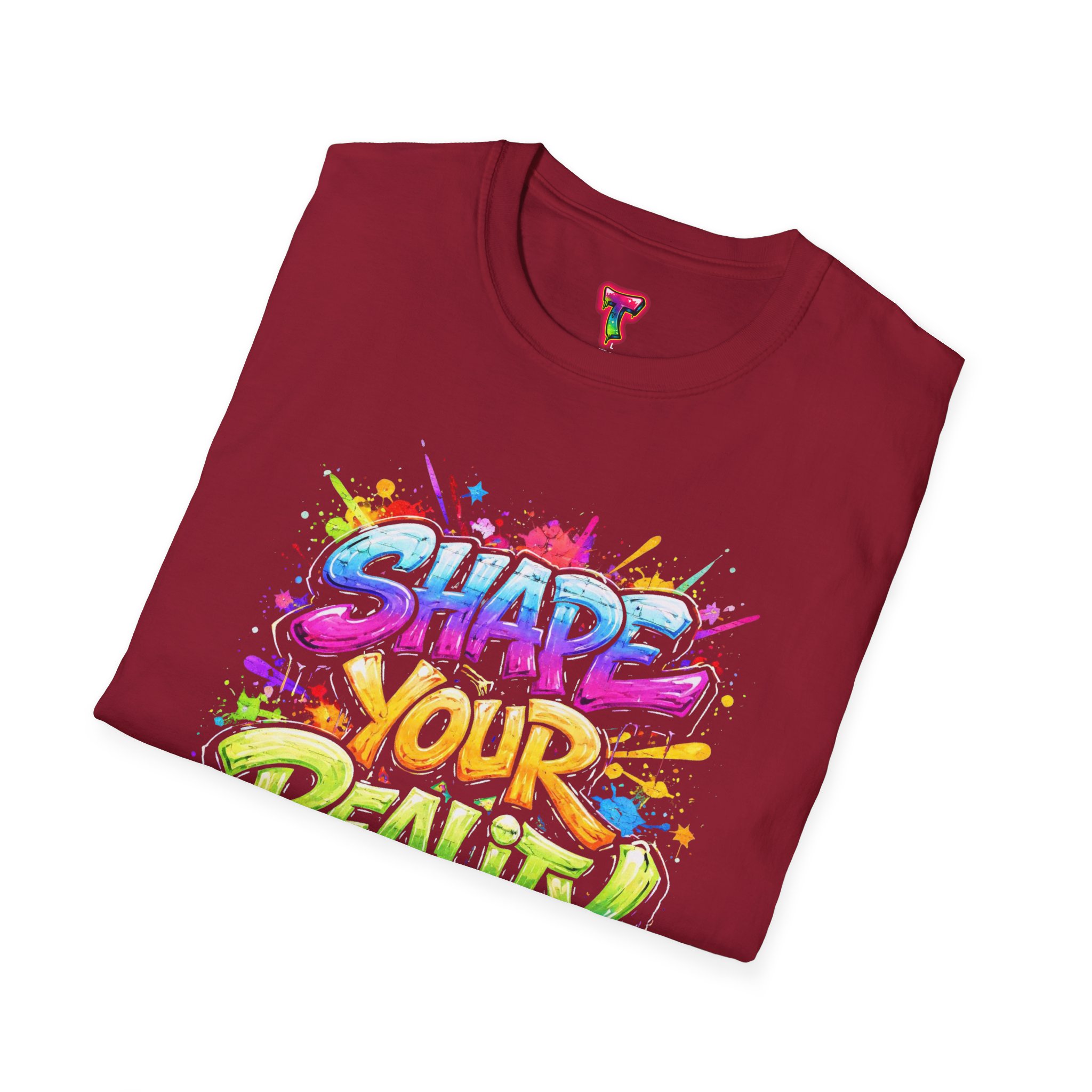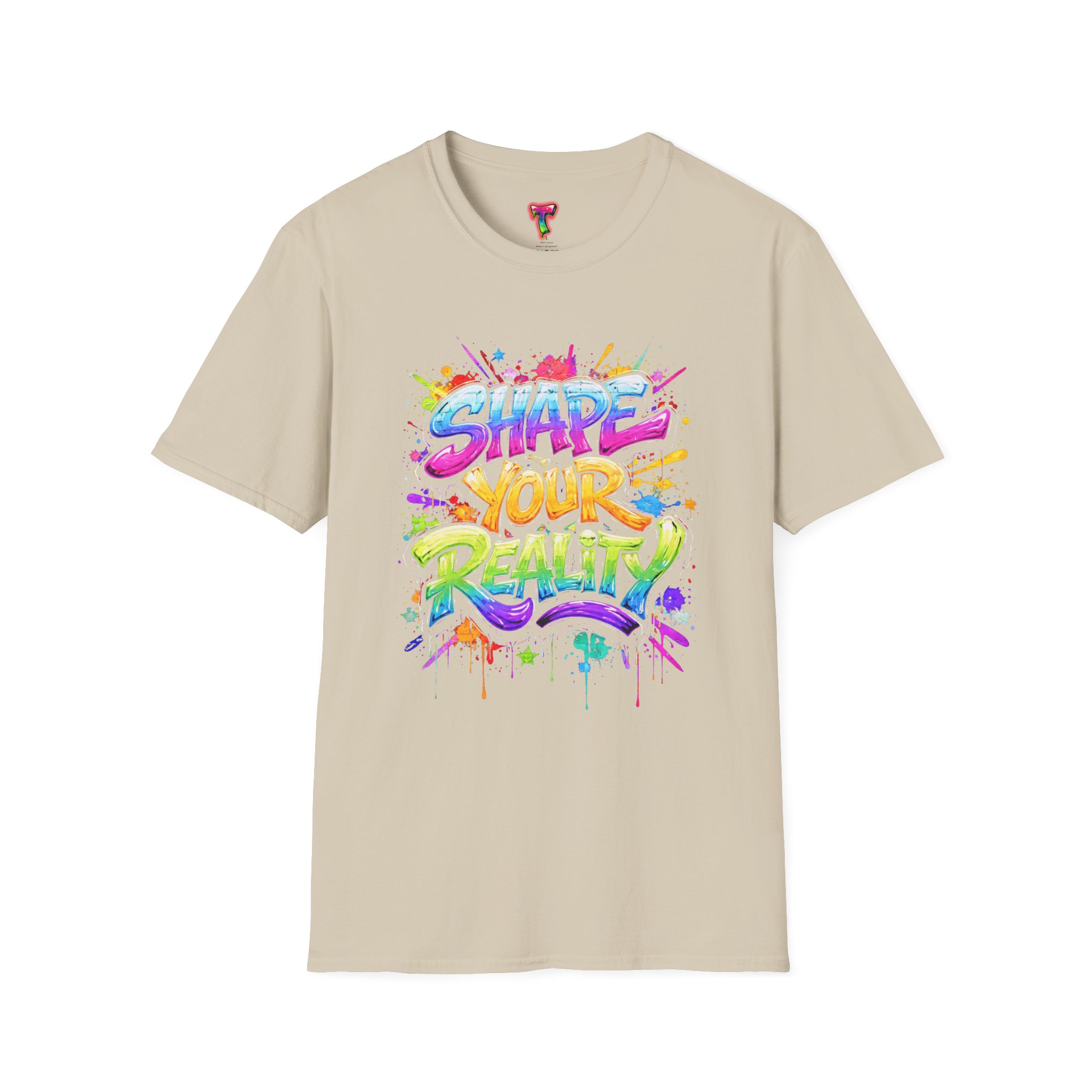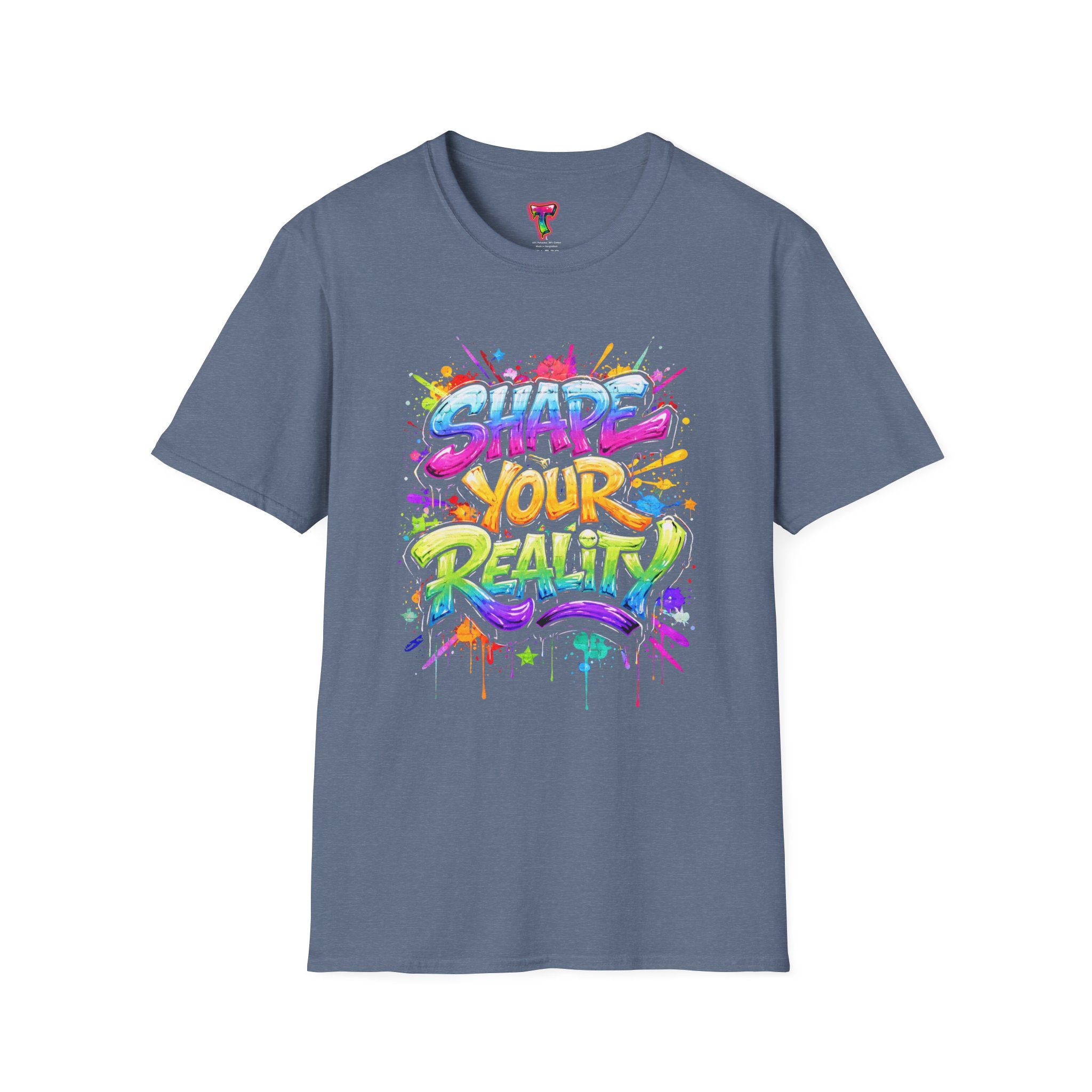 This lightweight crew-neck tee brings bold optimism to everyday wear. A vivid, watercolor-style graphic splashes across the chest with the phrase “Shape Your Reality,” blending neon pinks, greens, blues and yellows into an energetic hand-lettered design. The clean white canvas keeps the artwork front-and-center, while the classic fit and soft ring-spun cotton feel relaxed and breathable from morning coffee to evening walks. Wear it layered under a jacket or solo on warm days — it’s a casual statement piece for someone who likes to carry bright, motivating energy wherever they go.