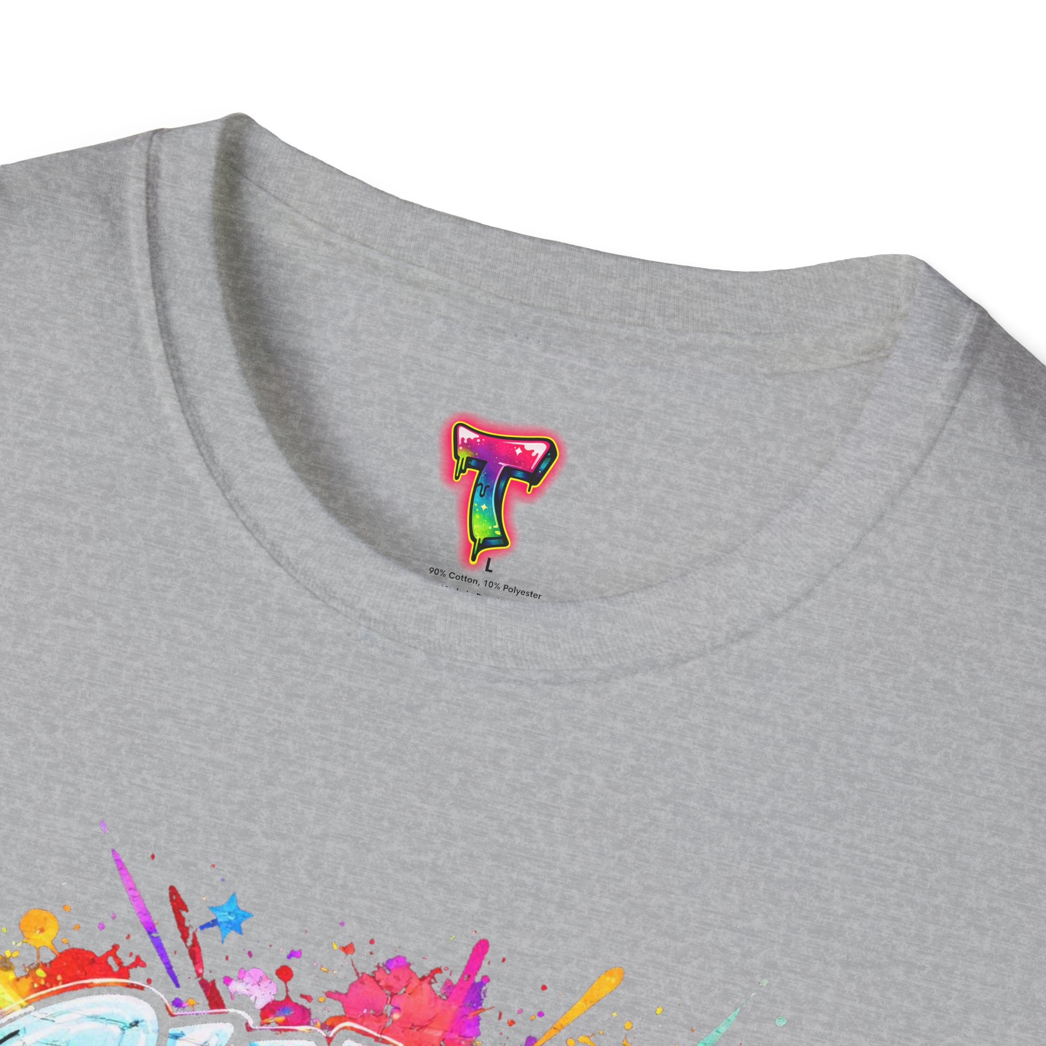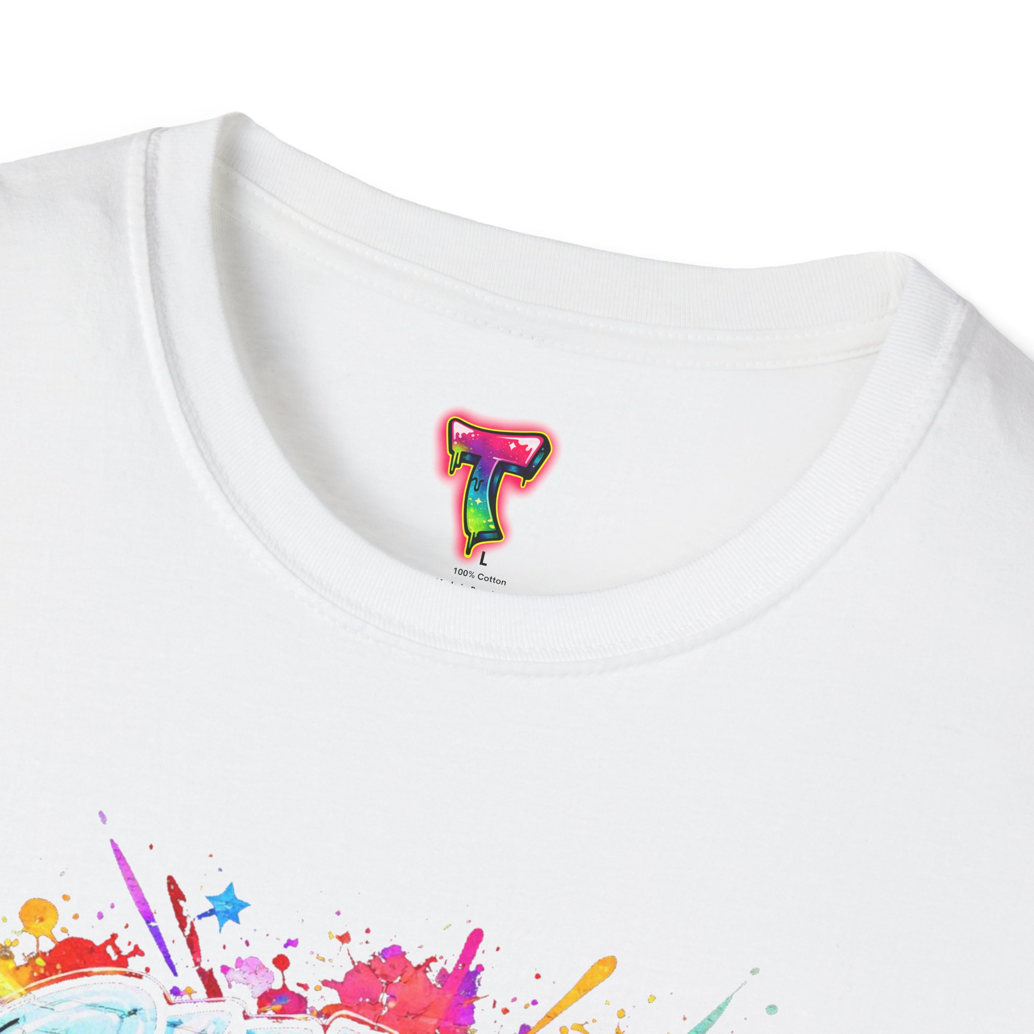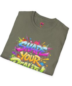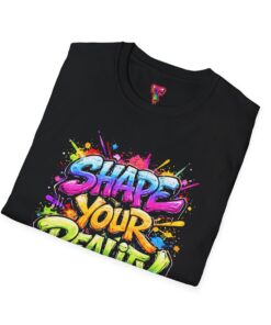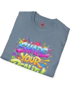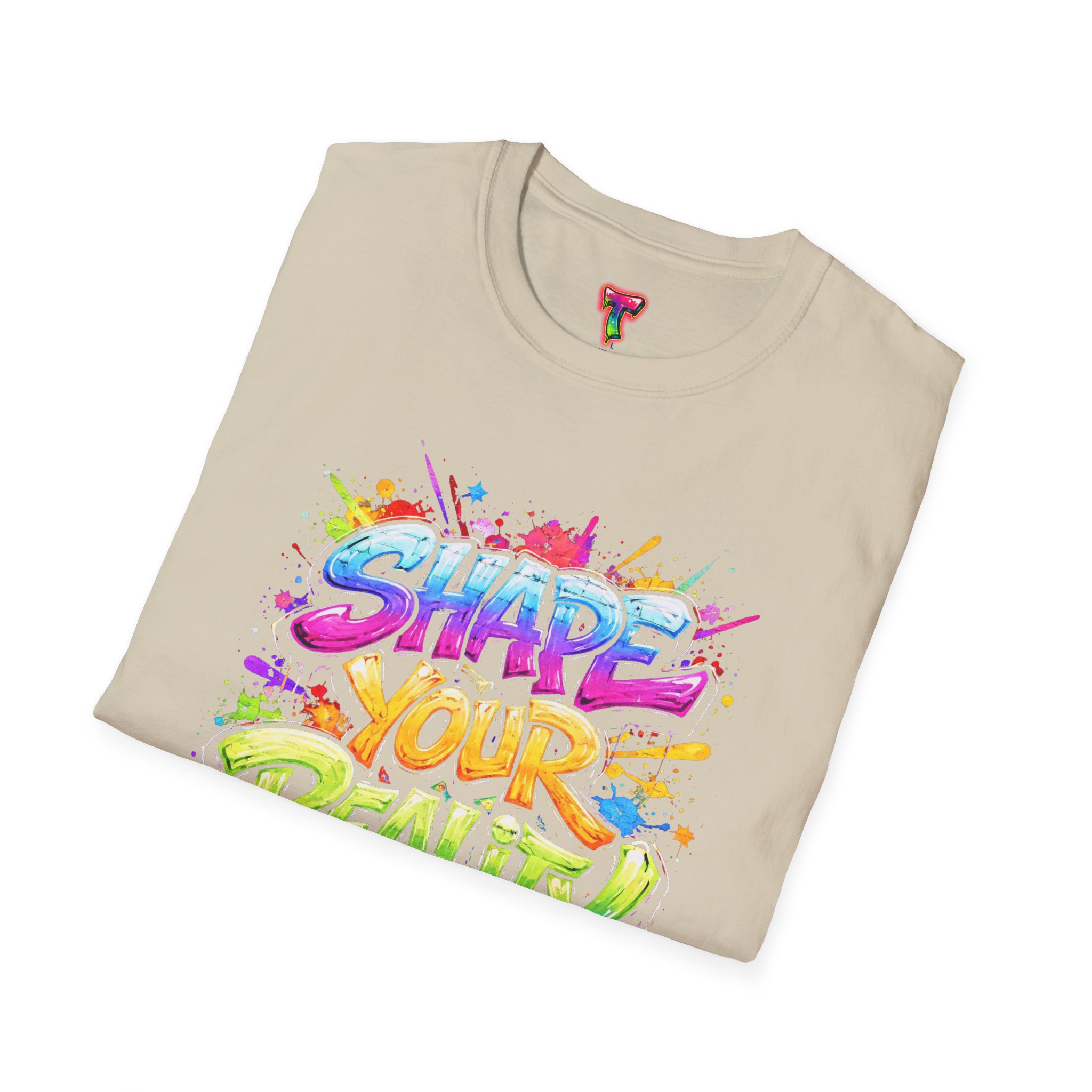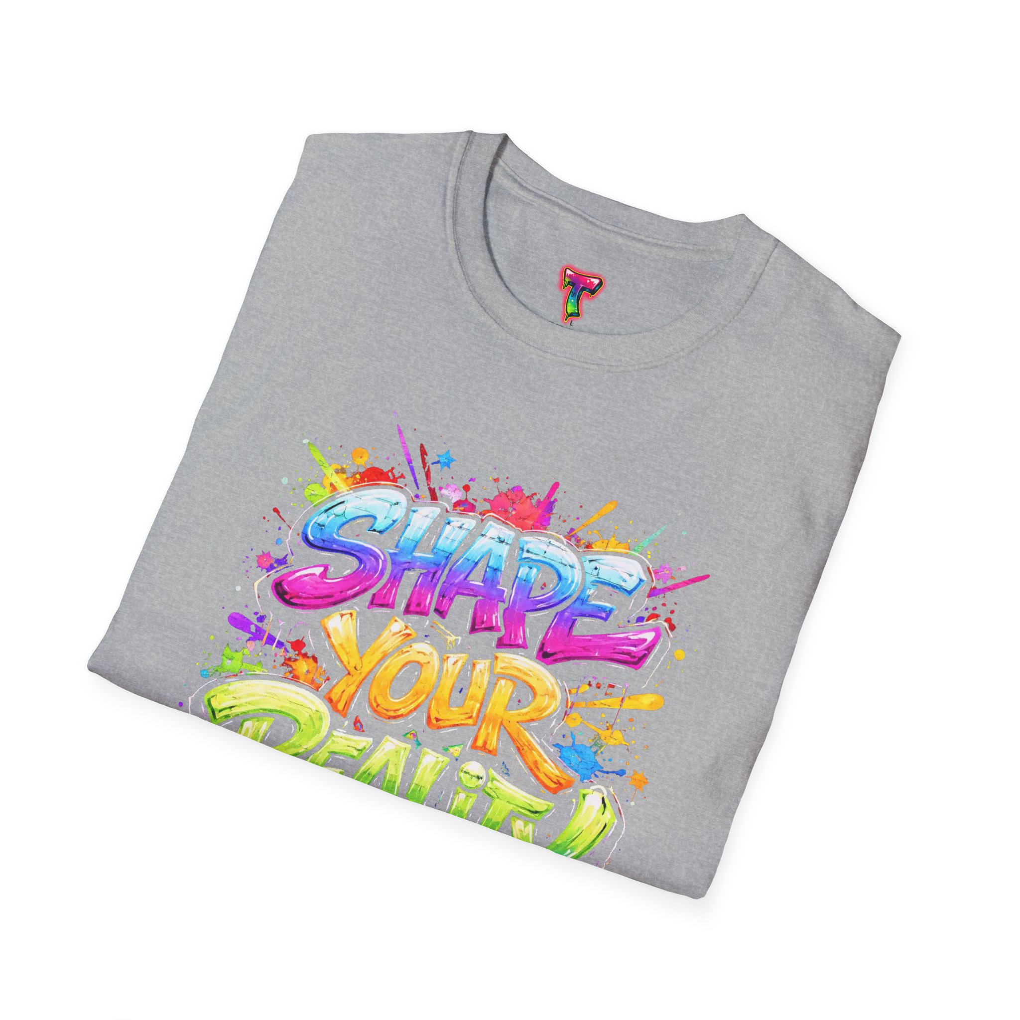 This lightweight crew-neck tee brings bold optimism to everyday wear. A vivid, watercolor-style graphic splashes across the chest with the phrase “Shape Your Reality,” blending neon pinks, greens, blues and yellows into an energetic hand-lettered design. The clean white canvas keeps the artwork front-and-center, while the classic fit and soft ring-spun cotton feel relaxed and breathable from morning coffee to evening walks. Wear it layered under a jacket or solo on warm days — it’s a casual statement piece for someone who likes to carry bright, motivating energy wherever they go.