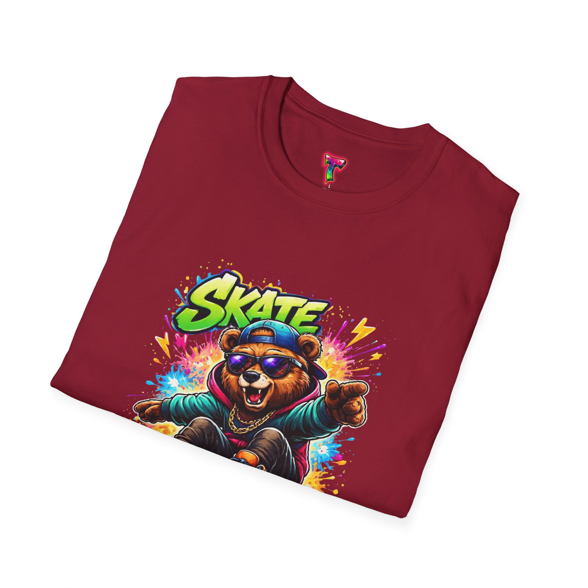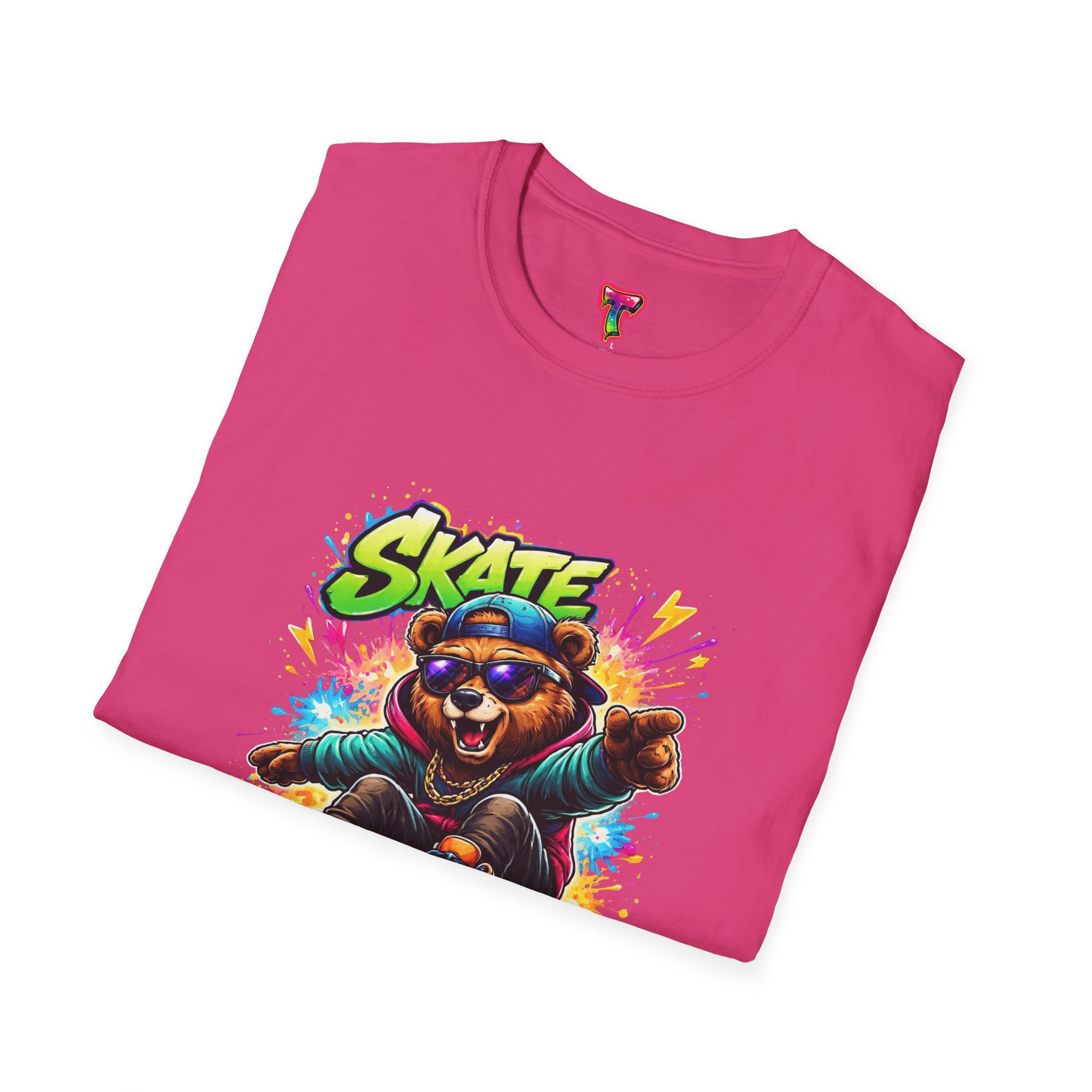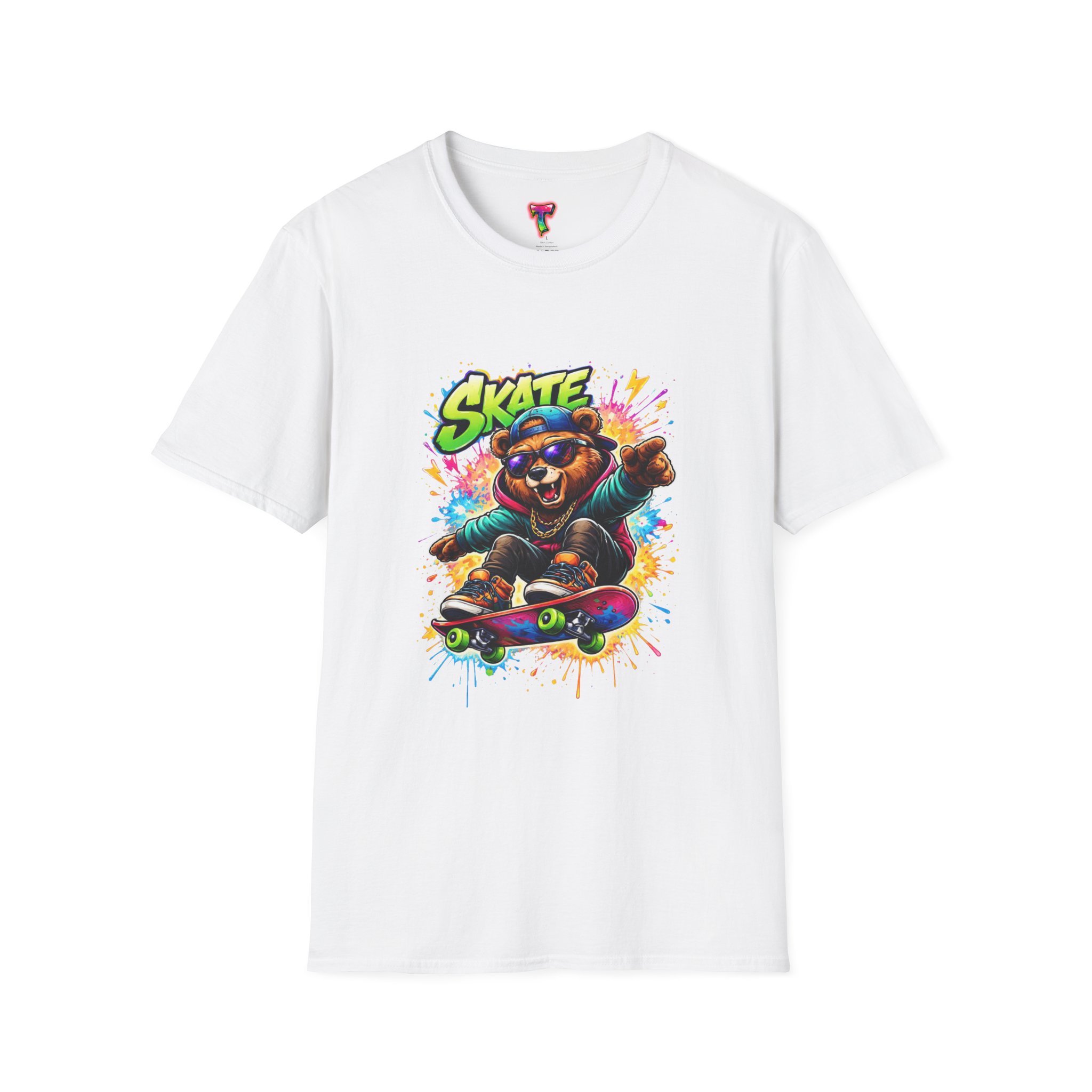 A lightweight crew-neck tee that carries a burst of street energy. The graphic shows a grinning skateboarding bear in motion—bright spray-paint colors, bold outlines, and playful motion marks that feel like a city wall come alive. Wear it to skate sessions, music nights, or lazy weekends; it eases into layers or stands out on its own. The fabric is soft, breathable ring-spun cotton with a clean classic fit and a slightly lived-in feel that settles in comfortably after the first wash. Thoughtful construction details—tubular knit without side seams, ribbed collar, shoulder tape and a tear-away label—keep the shirt looking good and feeling stable through repeats and rides. Ethically sourced cotton and Oeko-Tex certification add practical peace of mind while the DTF/DTG printing keeps the art sharp and vivid.