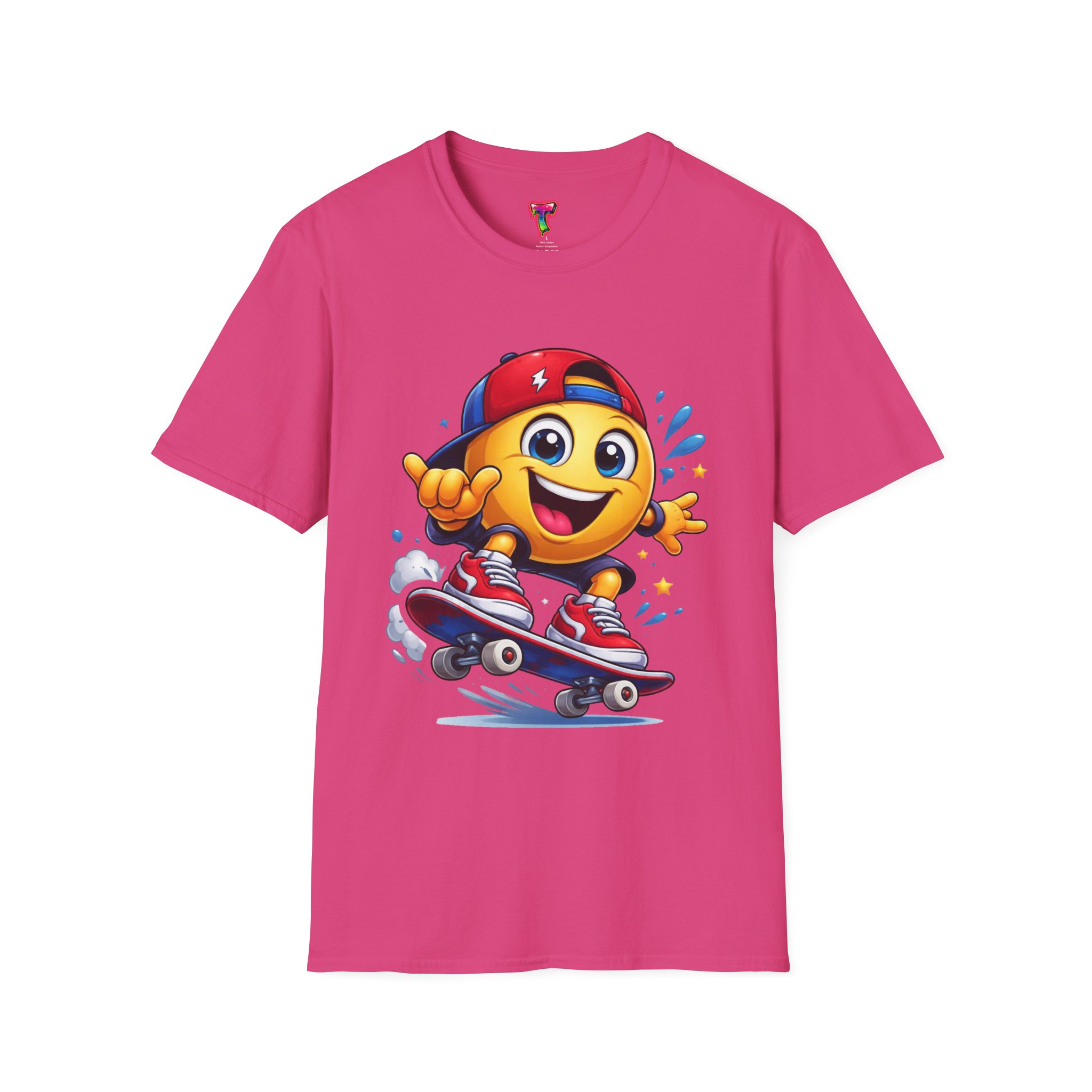 A lightweight, breathable tee that brings playful energy to casual days. The smooth, ring-spun cotton feels soft against skin while the single-piece tubular knit keeps lines clean and comfortable. A bold, colorful skateboard emoji graphic pops on the chest, giving the shirt a youthful, street-ready vibe that layers easily under a hoodie or pairs with denim. Built with reinforced shoulder tape and a ribbed, shape-retaining collar so it keeps its fit through weekend sessions and repeat washes. Safety- and quality-certified, this shirt balances spirited style with durable, responsibly sourced materials.