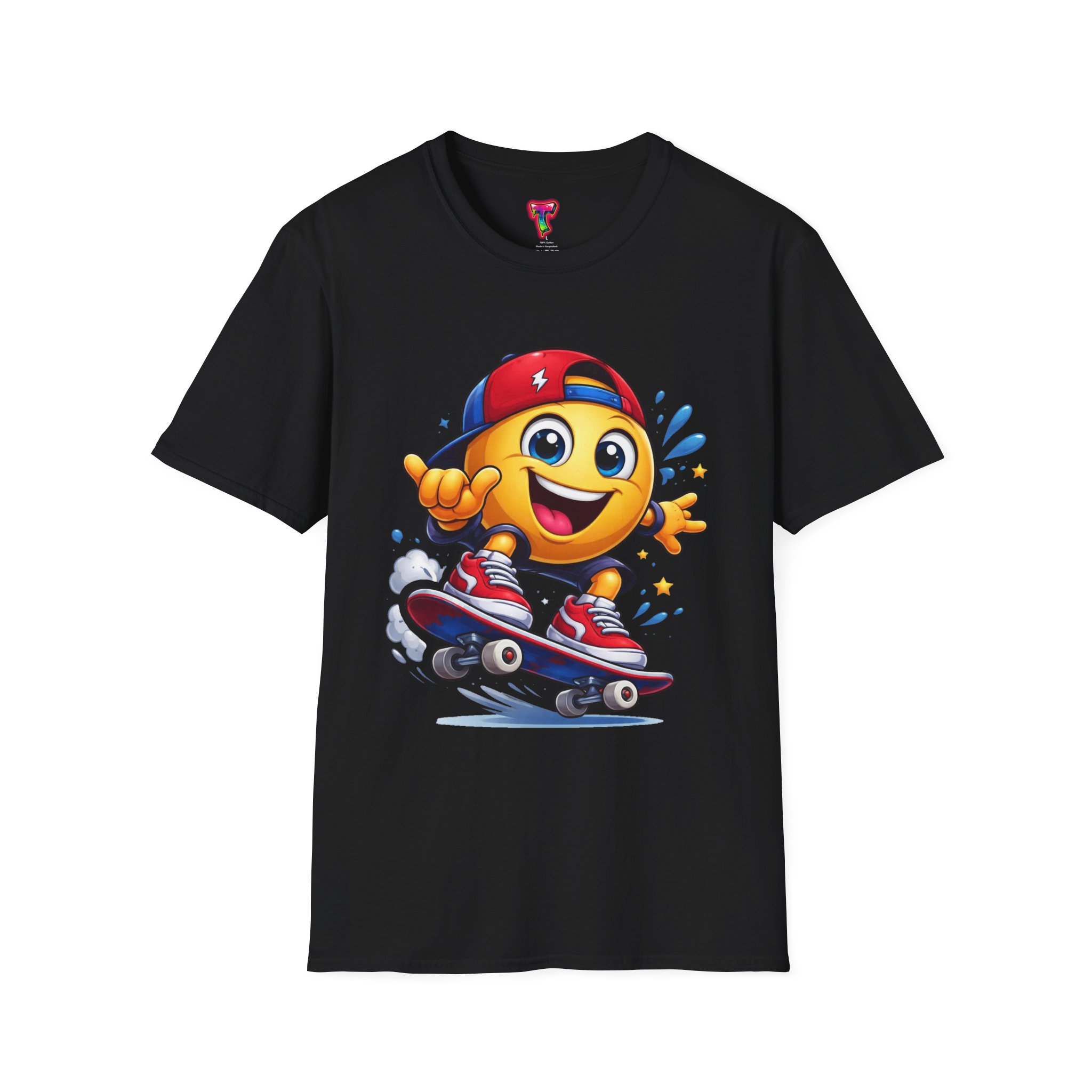 – DTG/DTF printed, vibrant skateboard emoji graphic on chest and optional sleeve prints