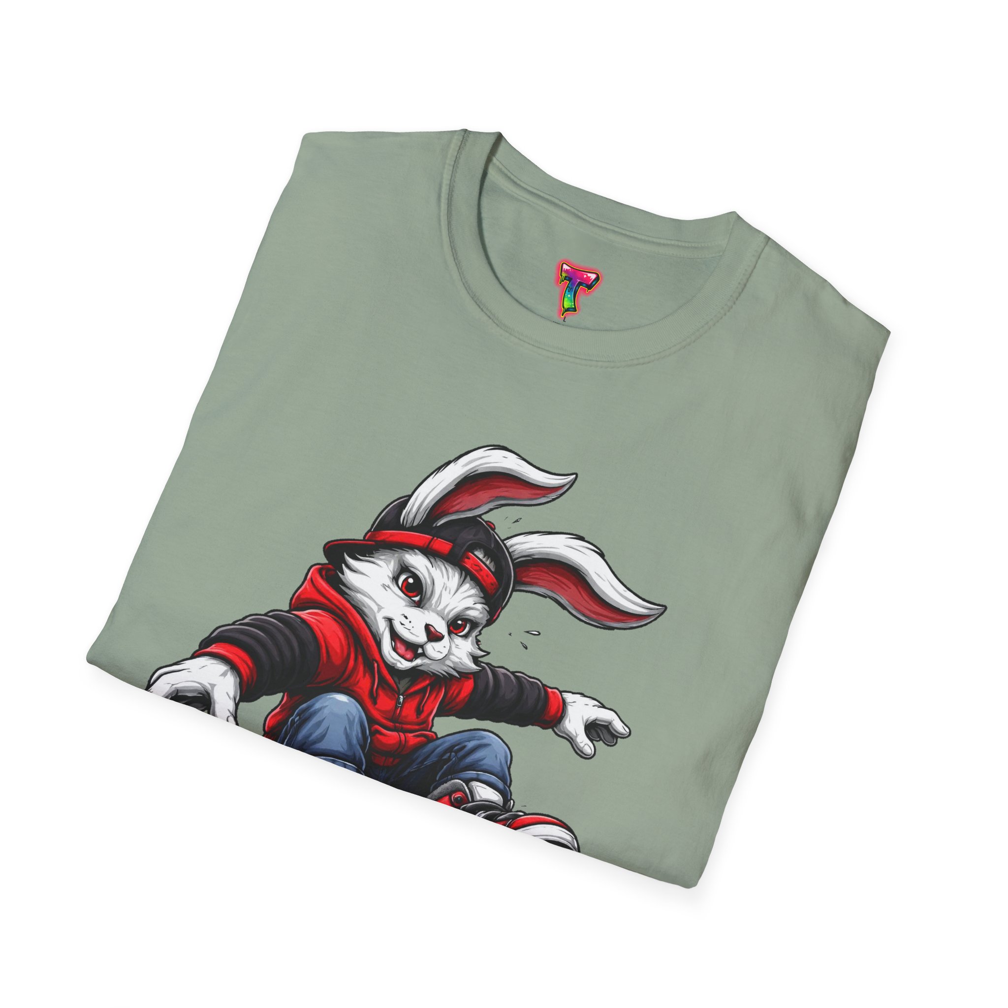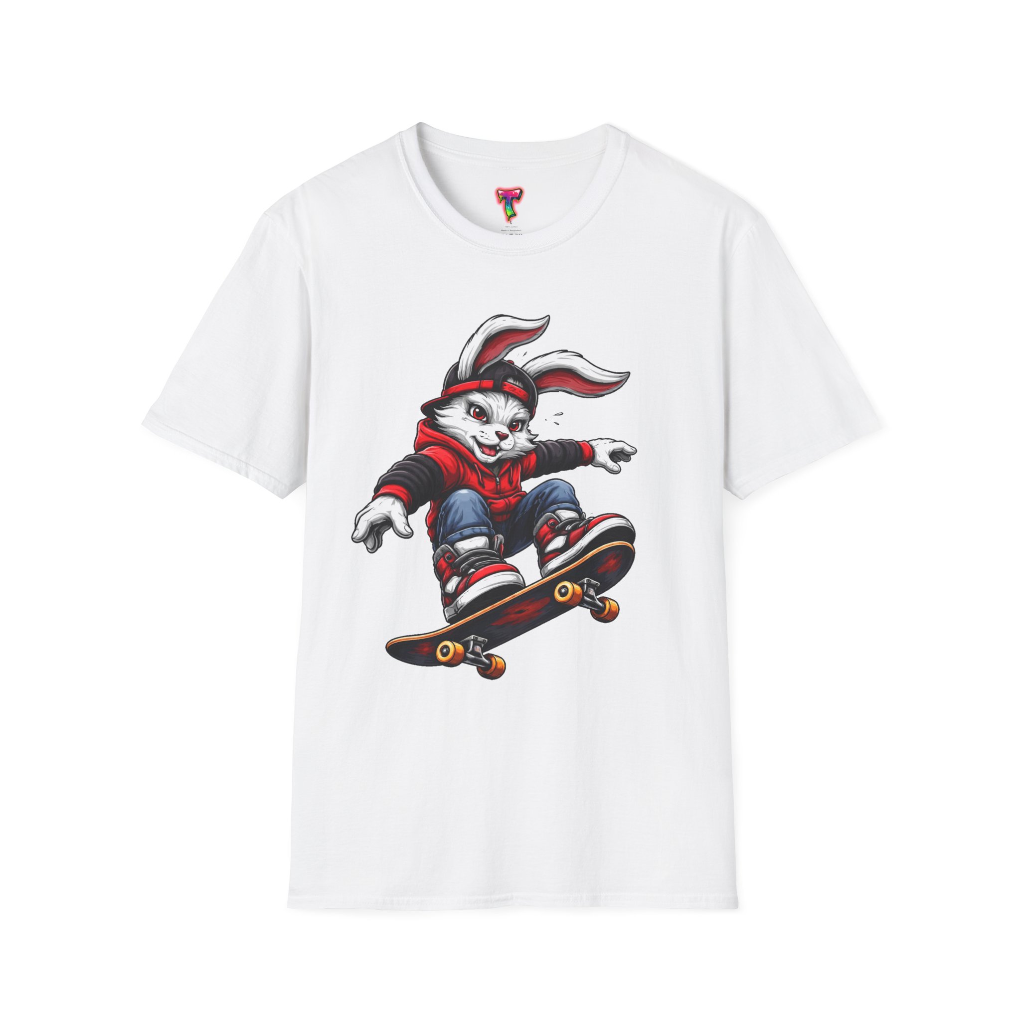 A lightweight, ring-spun cotton tee that brings playful street energy to everyday wear. The graphic shows a rebellious, hoodie-clad rabbit mid-trick on a skateboard — bold lines, rich reds and deep shadows give it a vintage skate-poster feel. Wear it layered under a flannel or alone on warm days; it reads like a favorite crew that travels from skatepark sessions to coffee runs with equal ease. The soft, smooth fabric and clean crew neckline keep the focus on the artwork while staying comfortable through repeat wears and washes. Built with thoughtful details — taped shoulders, a ribbed collar that holds its shape, and a tear-away label — this shirt feels deliberate and ready for movement.