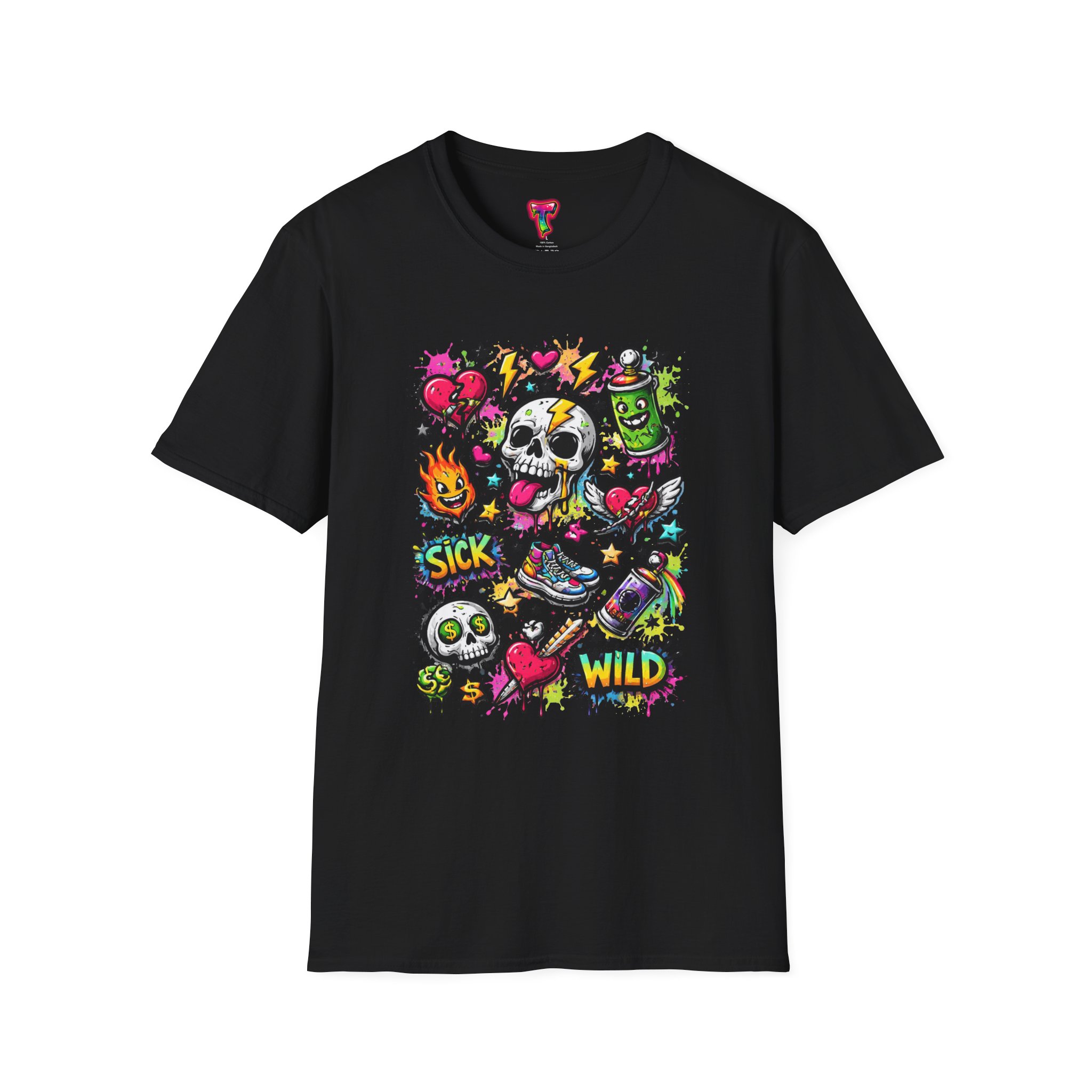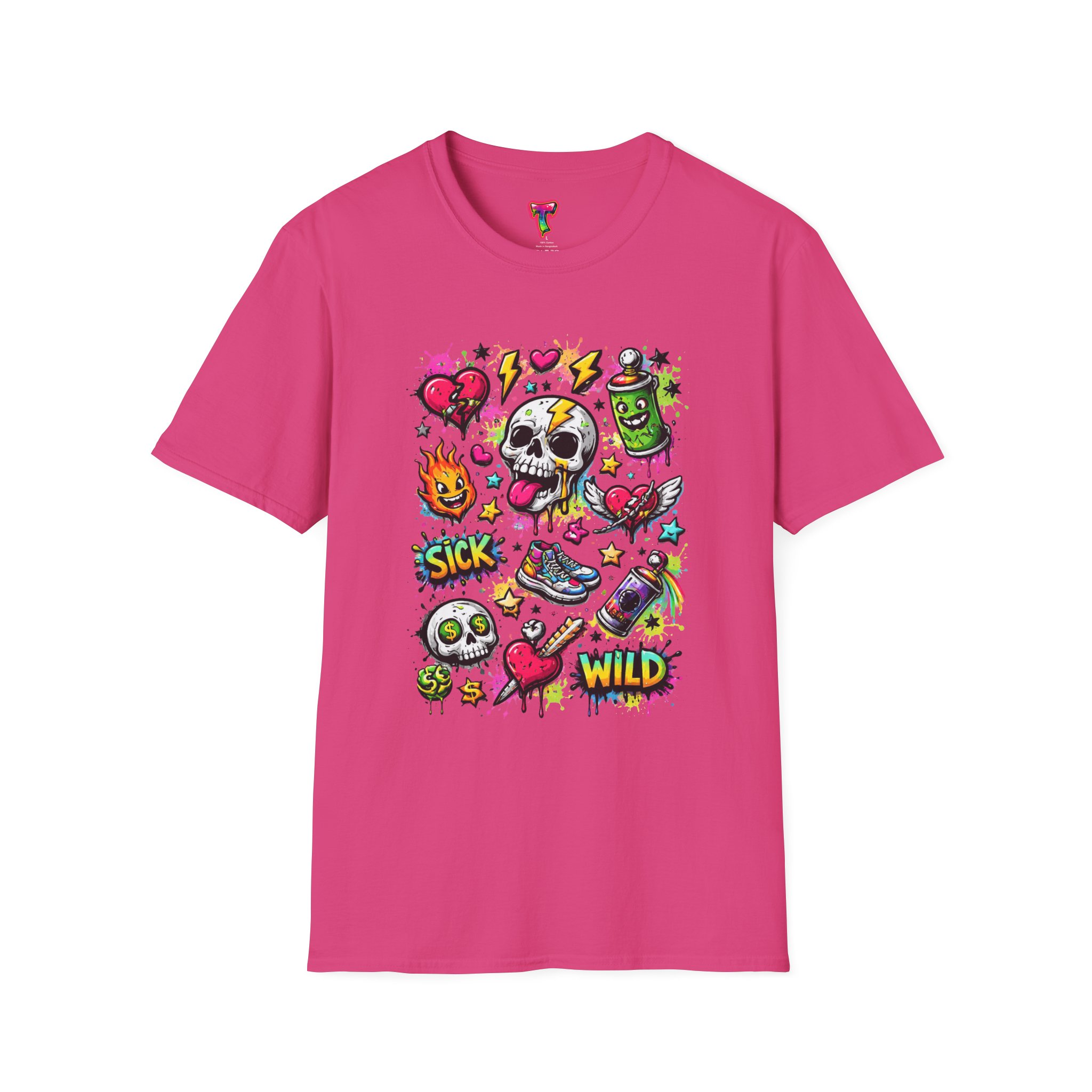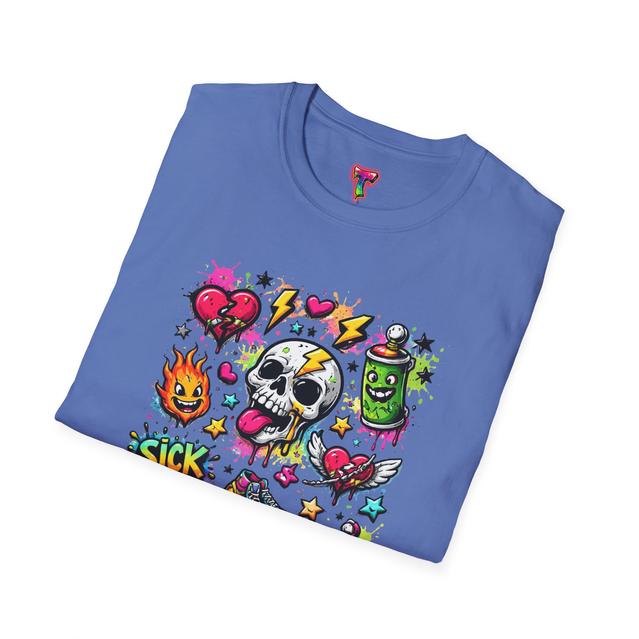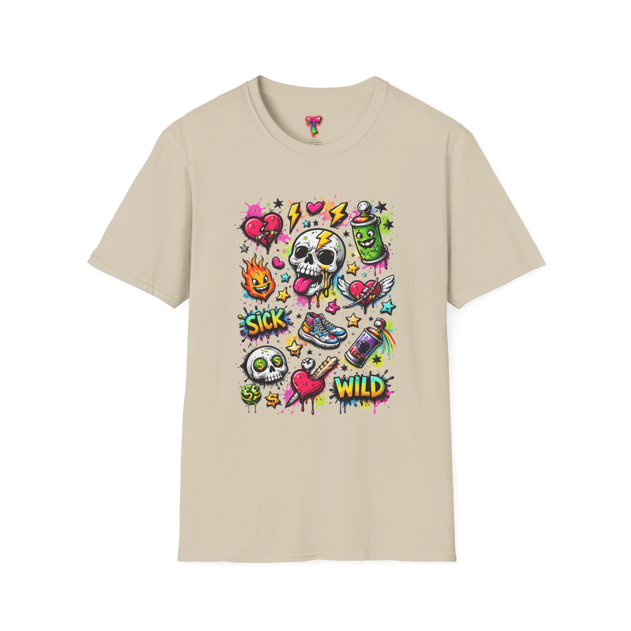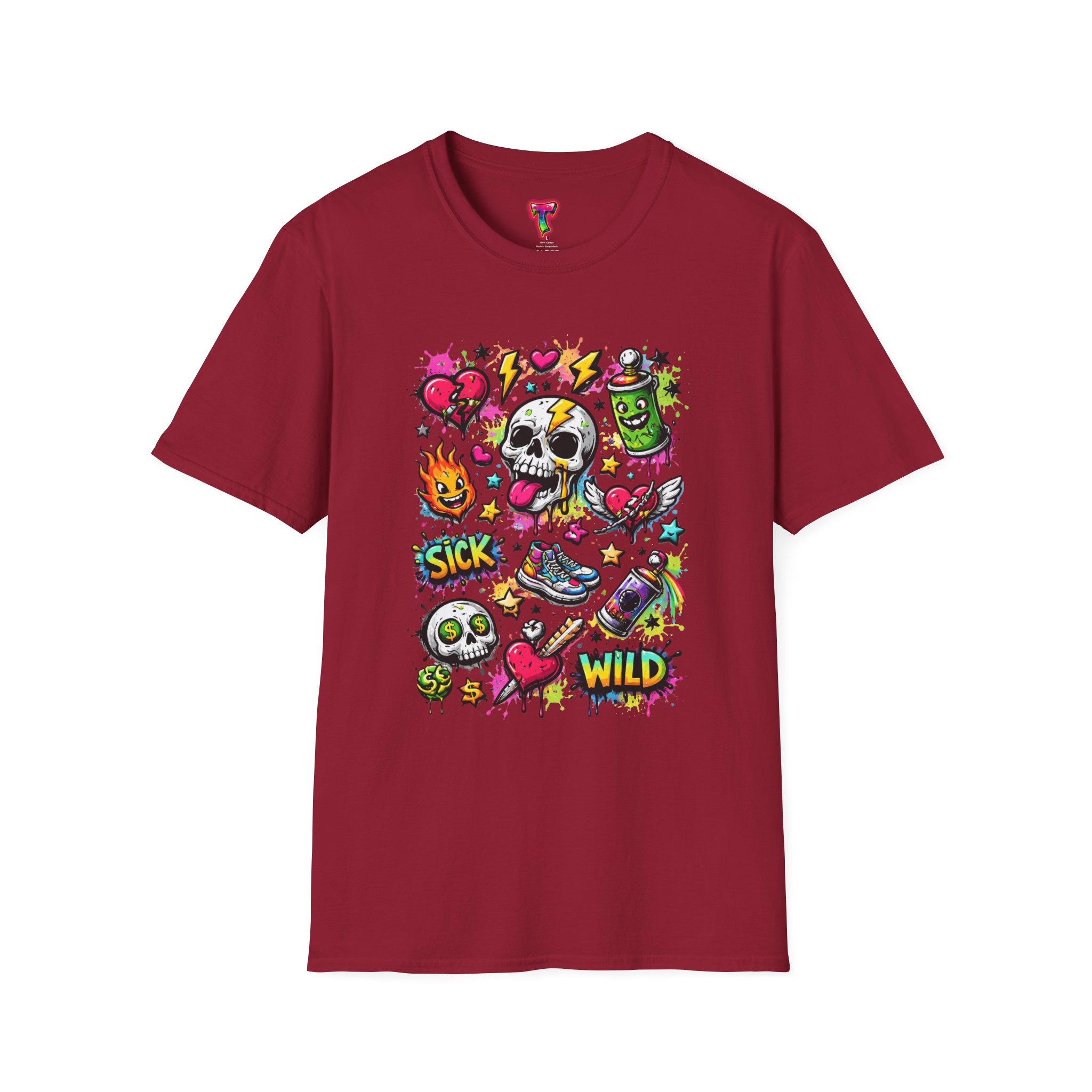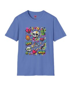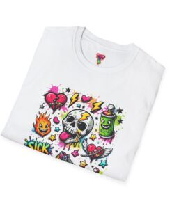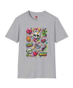A lightweight, street-ready tee built for people who live for bold color and playful edge. This soft cotton shirt carries a vibrant, skate-punk collage — skulls, spray cans, dripping hearts and neon flashes — that looks hand-sketched and splashed with paint. It sits comfortably at the crew neck and falls in a classic, relaxed silhouette that layers easily under a flannel or stands alone with jeans. Wear it to shows, skate sessions, late-night hangs, or whenever you want an outfit that says loud, creative, and a little wild. The breathable ring-spun cotton and tear-away label keep focus on comfort while the tubular knit and taped shoulders keep the shape through repeat wears and washes.