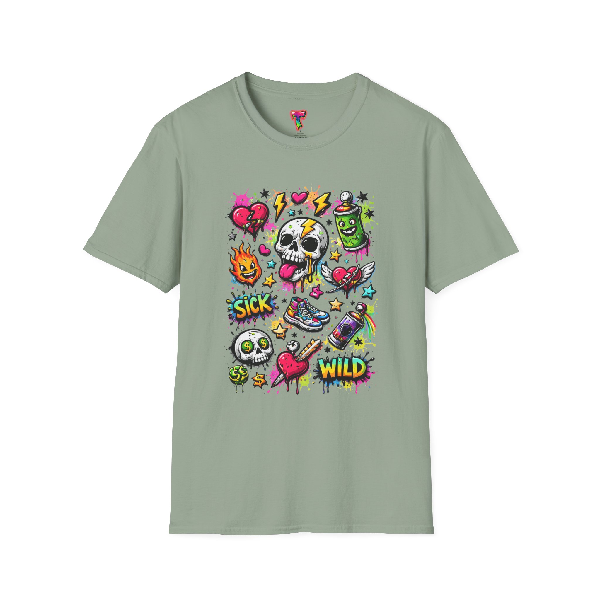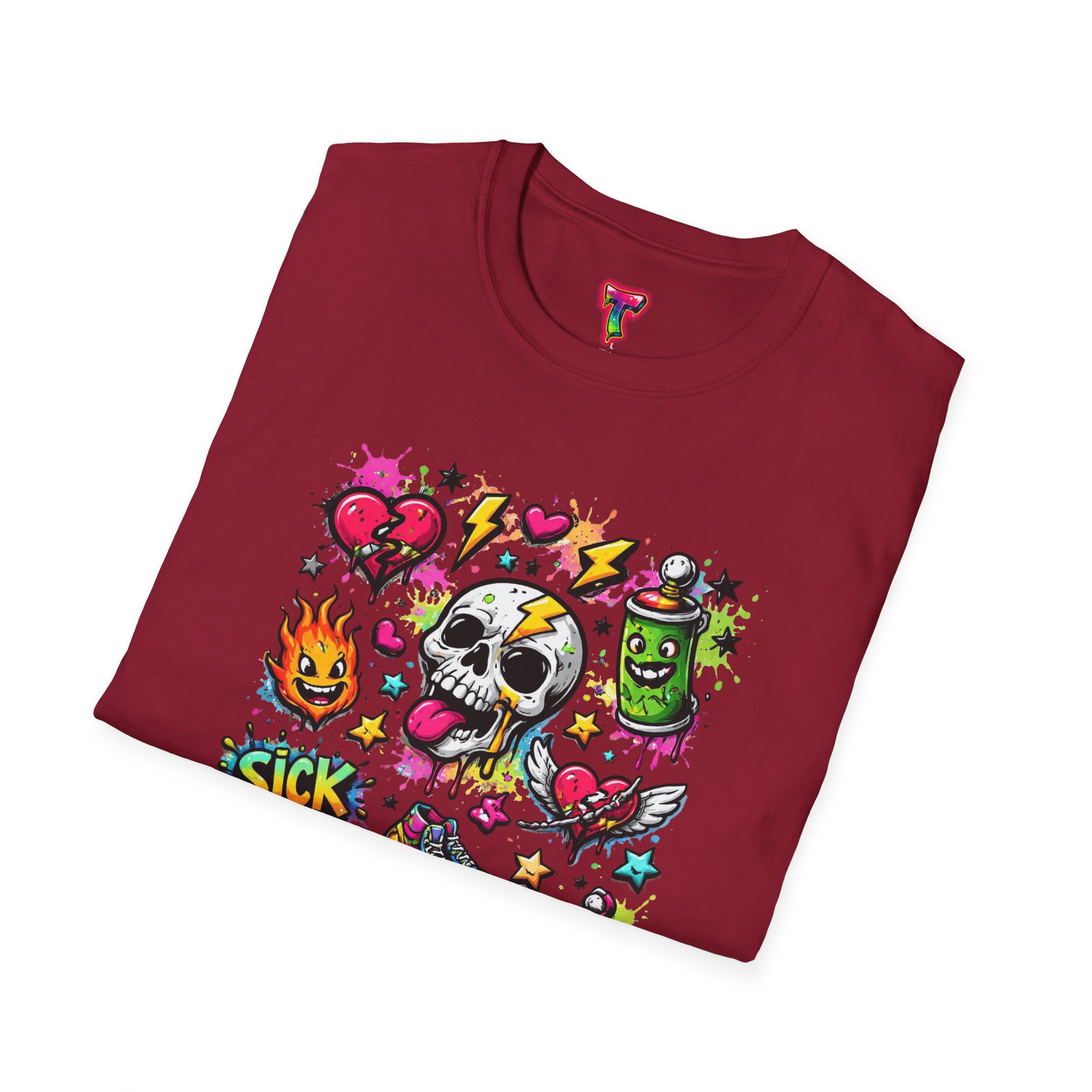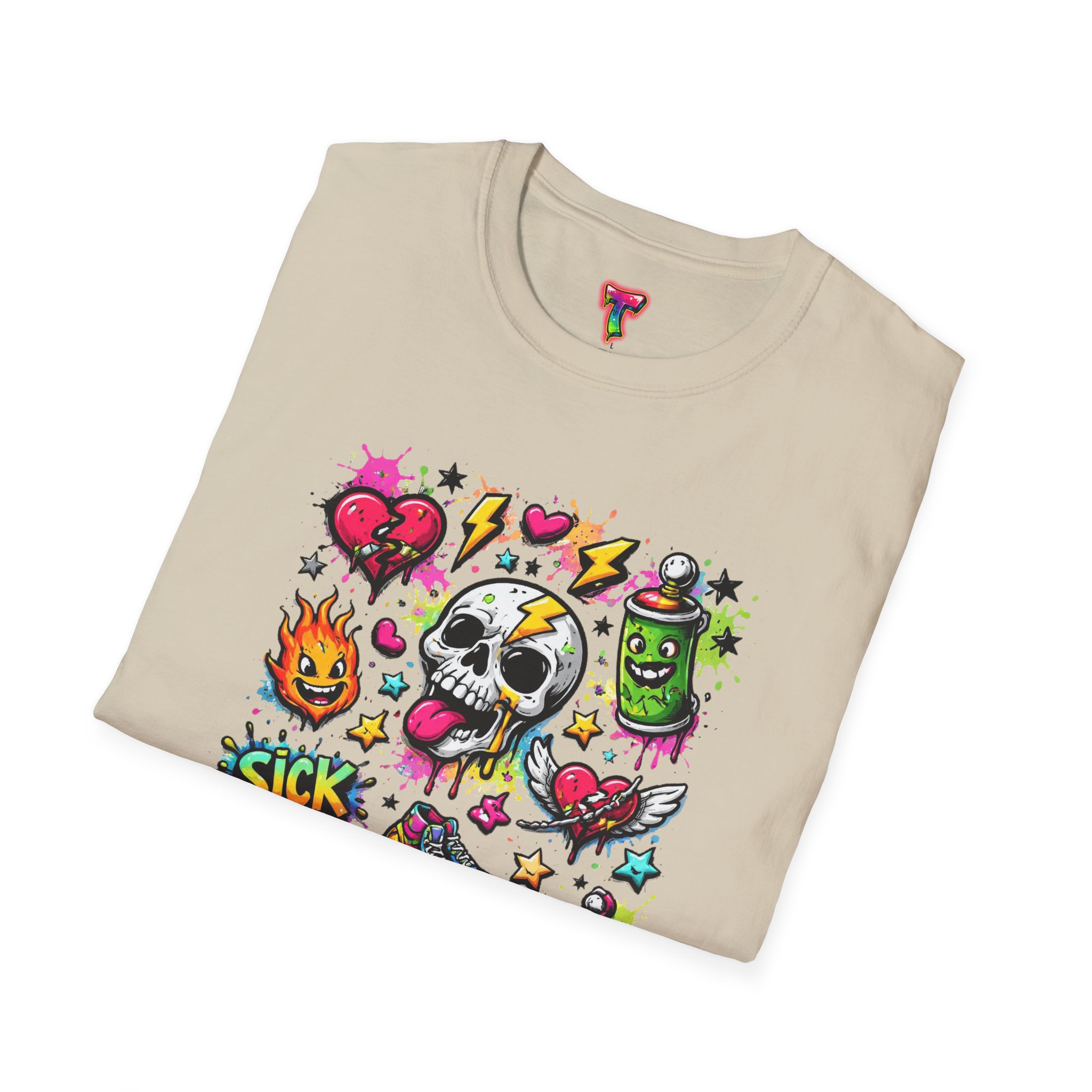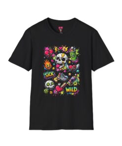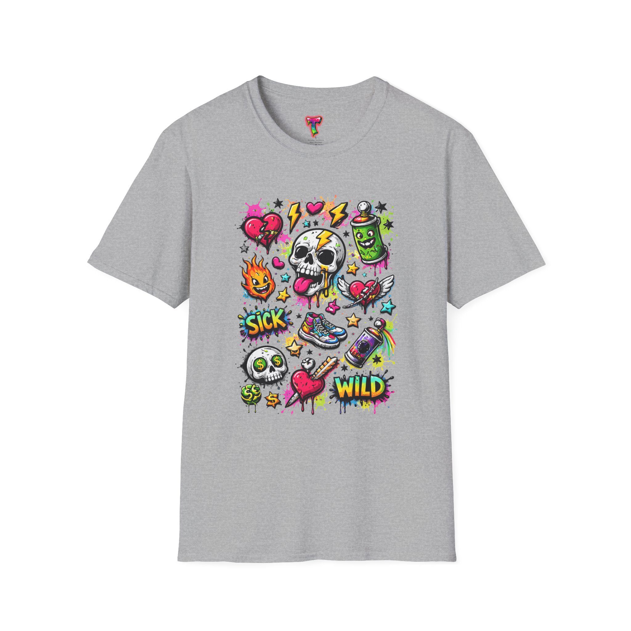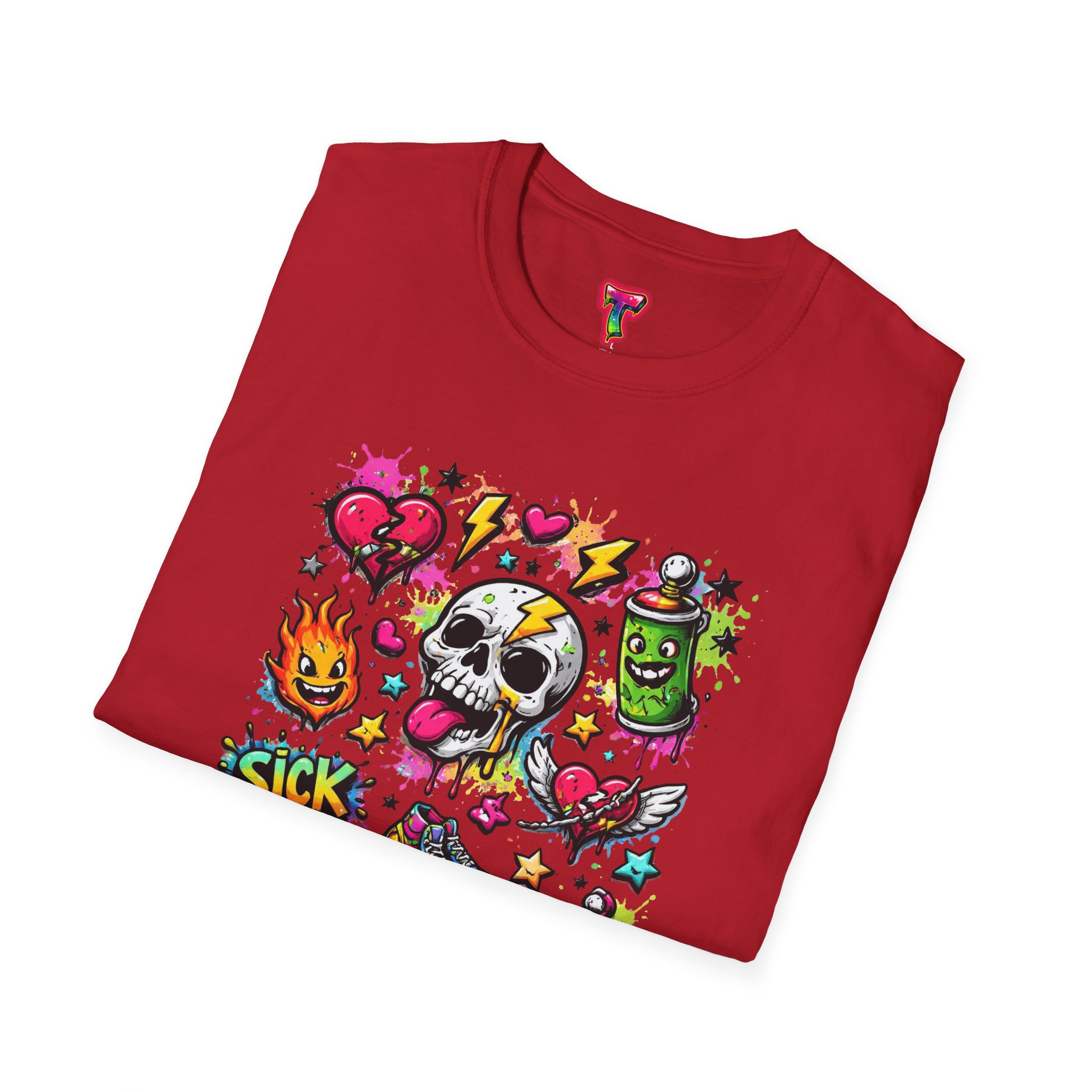 A lightweight, street-ready tee built for people who live for bold color and playful edge. This soft cotton shirt carries a vibrant, skate-punk collage — skulls, spray cans, dripping hearts and neon flashes — that looks hand-sketched and splashed with paint. It sits comfortably at the crew neck and falls in a classic, relaxed silhouette that layers easily under a flannel or stands alone with jeans. Wear it to shows, skate sessions, late-night hangs, or whenever you want an outfit that says loud, creative, and a little wild. The breathable ring-spun cotton and tear-away label keep focus on comfort while the tubular knit and taped shoulders keep the shape through repeat wears and washes.