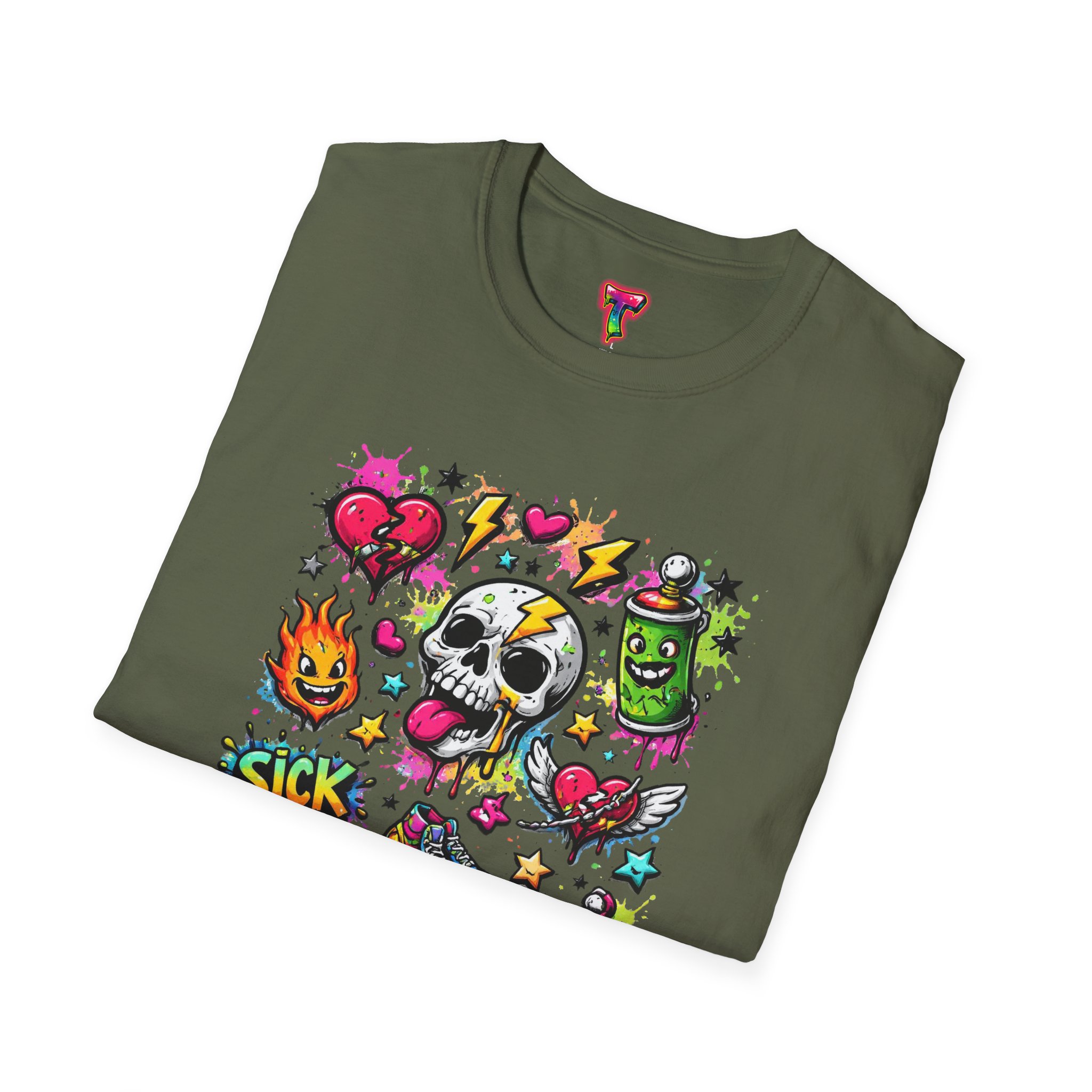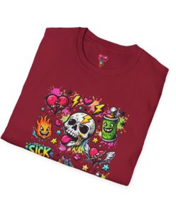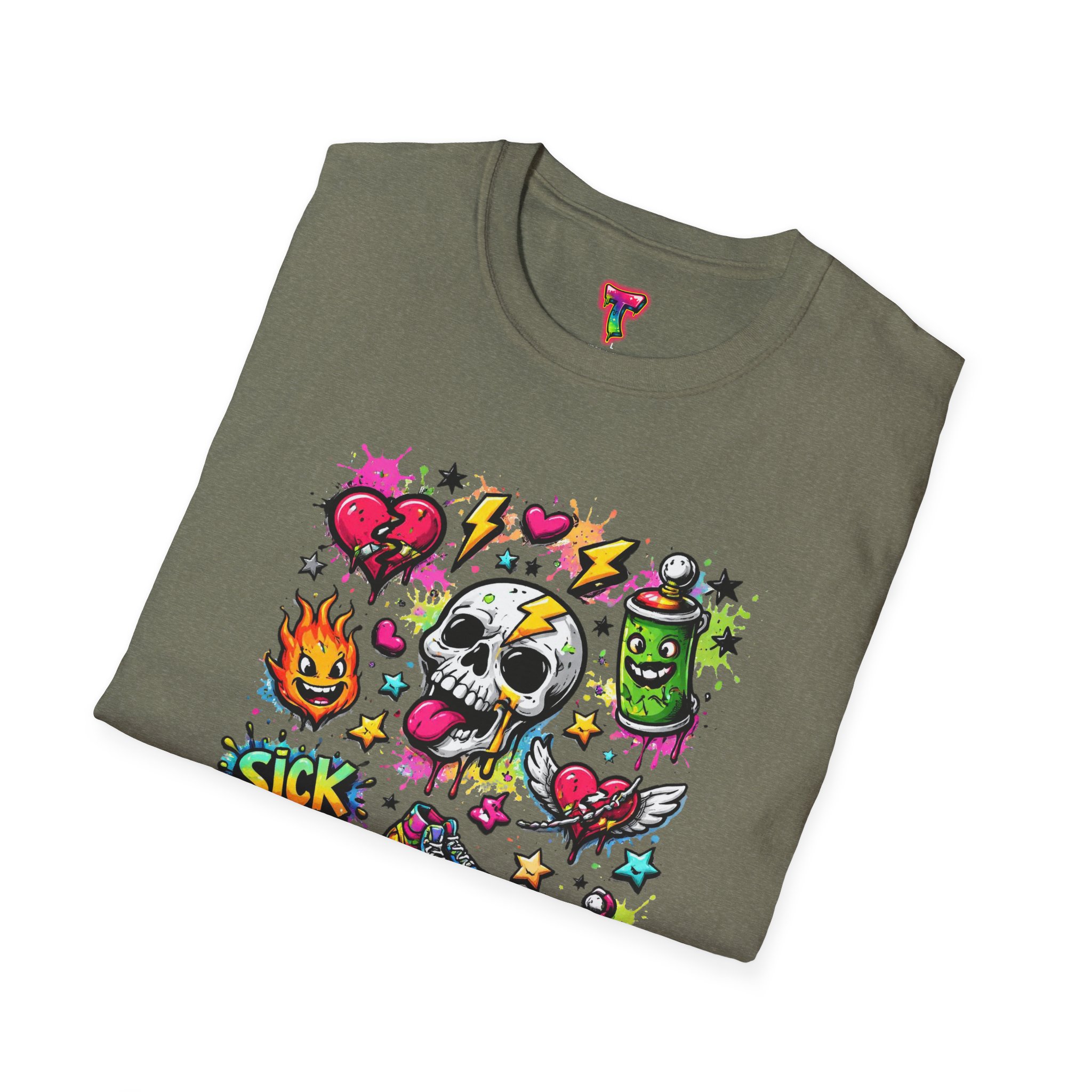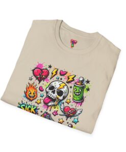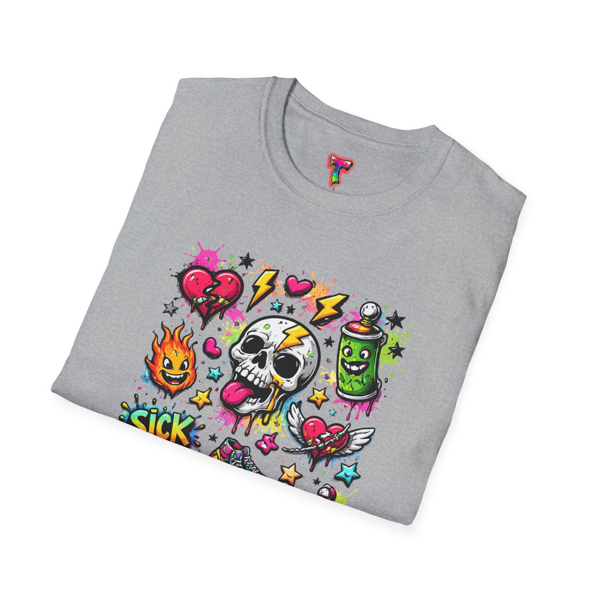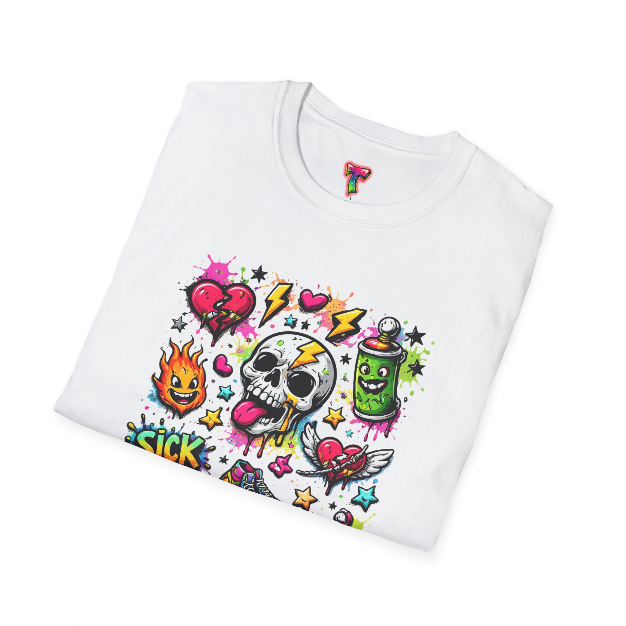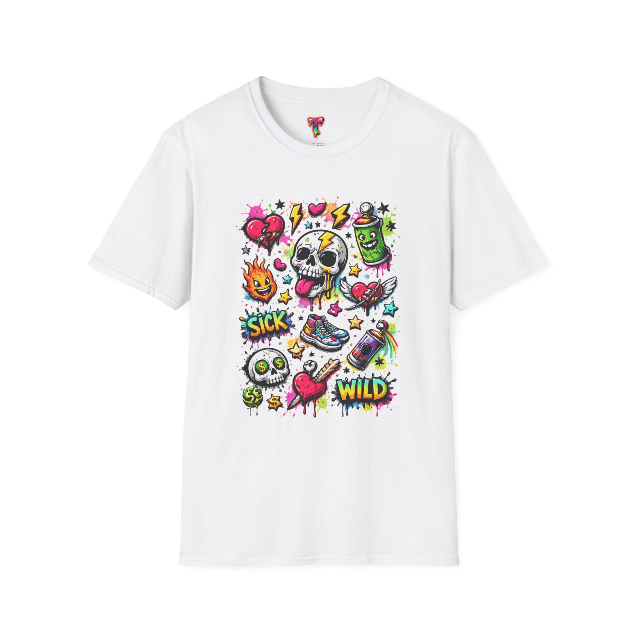 A lightweight, street-ready tee built for people who live for bold color and playful edge. This soft cotton shirt carries a vibrant, skate-punk collage — skulls, spray cans, dripping hearts and neon flashes — that looks hand-sketched and splashed with paint. It sits comfortably at the crew neck and falls in a classic, relaxed silhouette that layers easily under a flannel or stands alone with jeans. Wear it to shows, skate sessions, late-night hangs, or whenever you want an outfit that says loud, creative, and a little wild. The breathable ring-spun cotton and tear-away label keep focus on comfort while the tubular knit and taped shoulders keep the shape through repeat wears and washes.