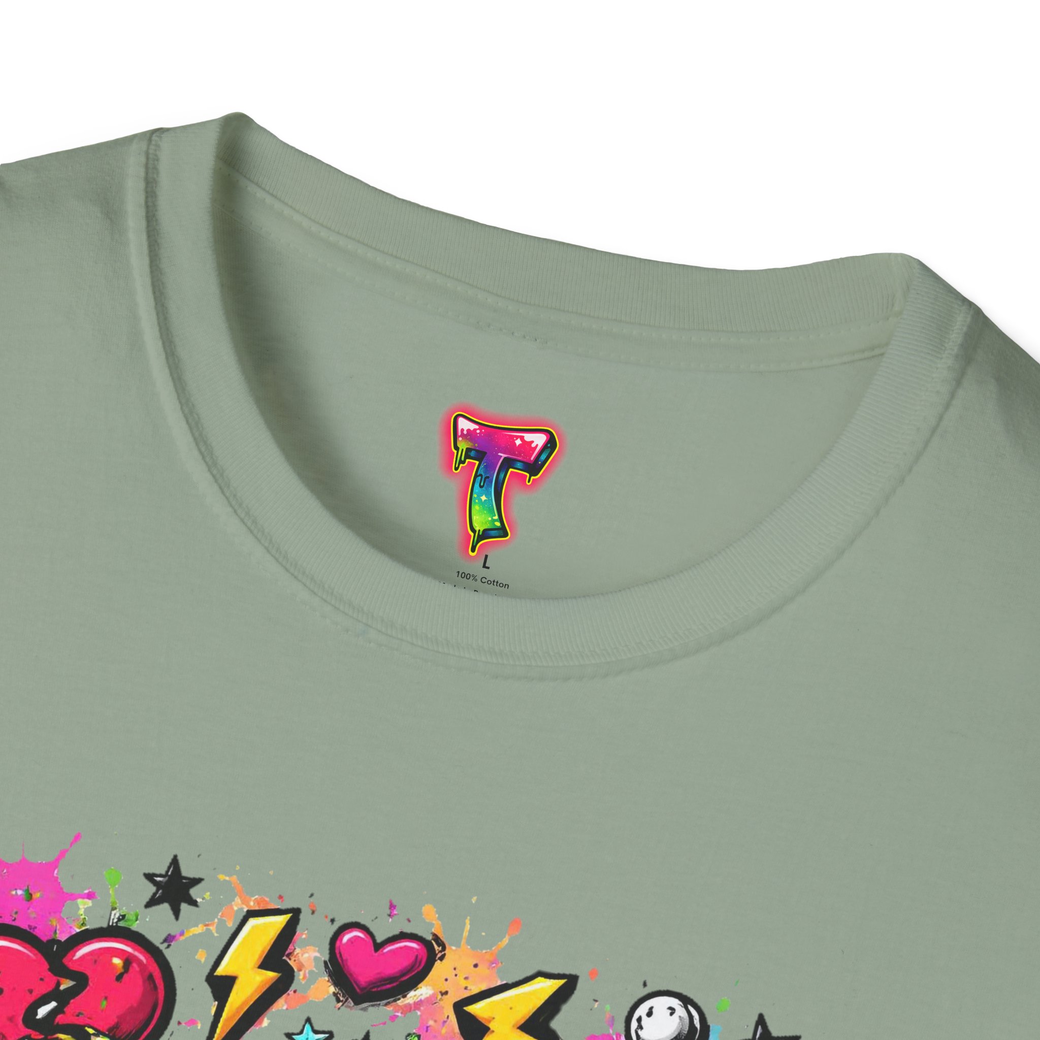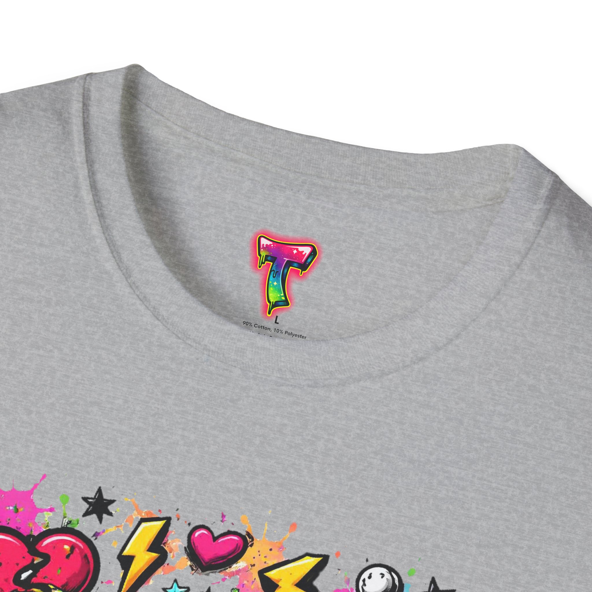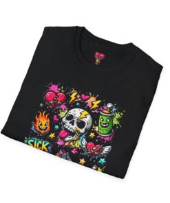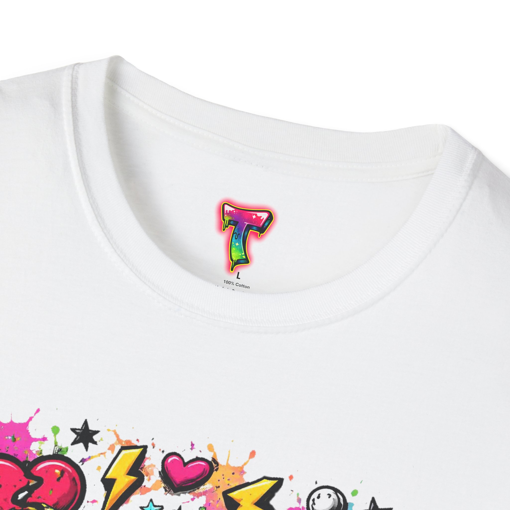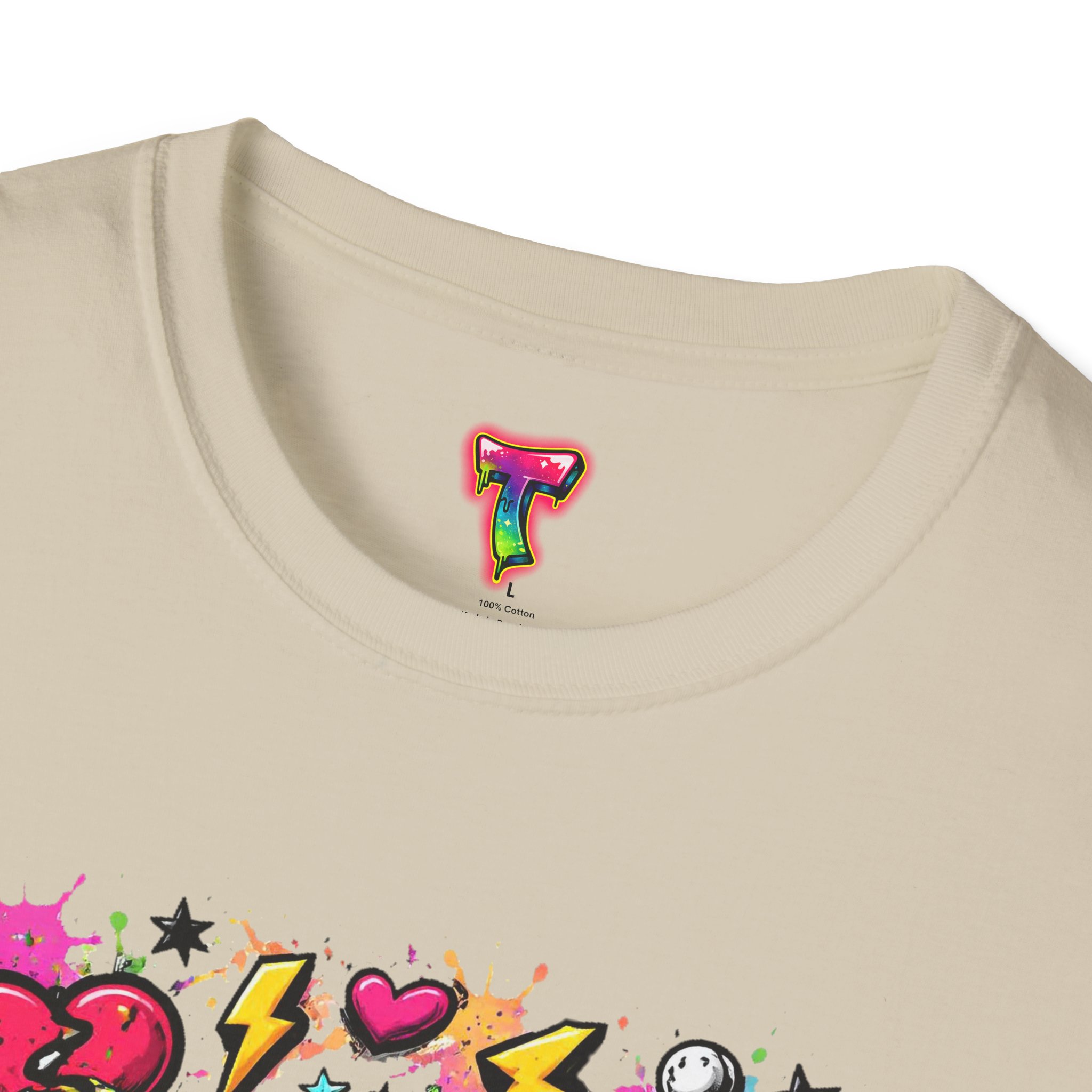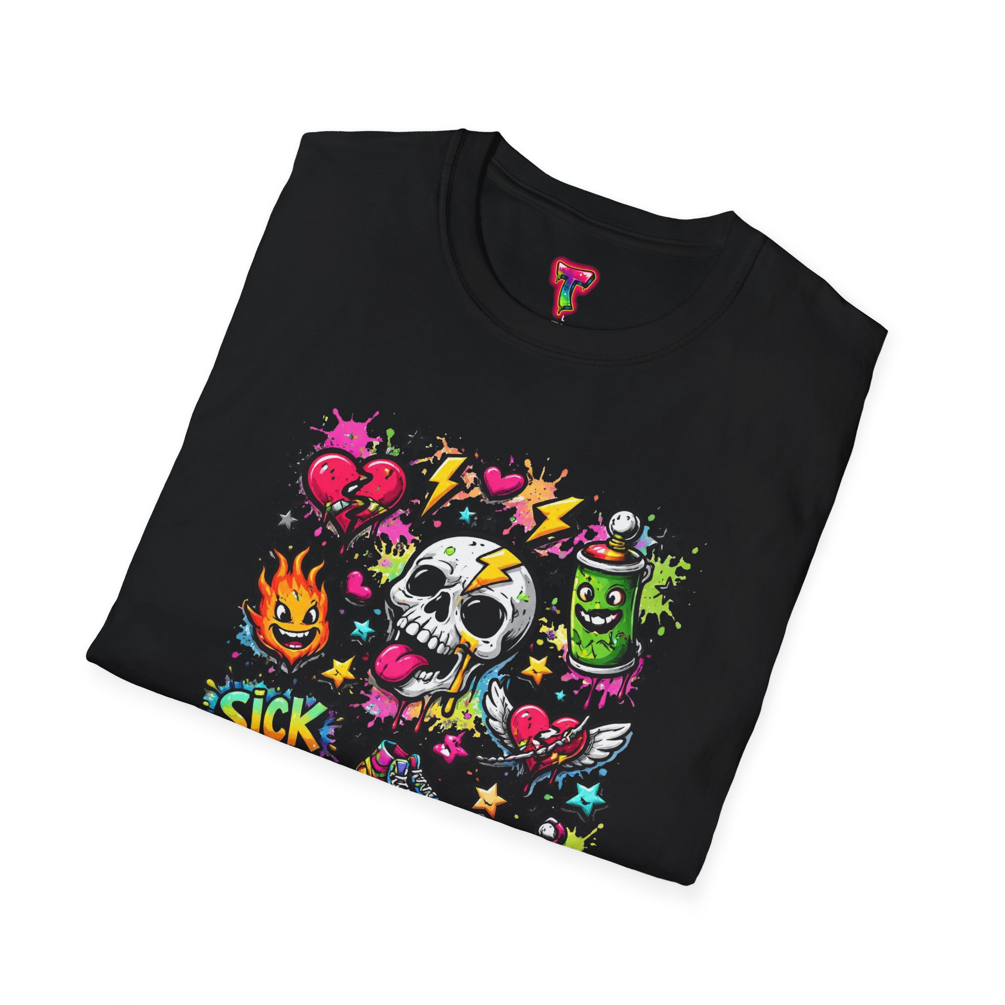 A lightweight, street-ready tee built for people who live for bold color and playful edge. This soft cotton shirt carries a vibrant, skate-punk collage — skulls, spray cans, dripping hearts and neon flashes — that looks hand-sketched and splashed with paint. It sits comfortably at the crew neck and falls in a classic, relaxed silhouette that layers easily under a flannel or stands alone with jeans. Wear it to shows, skate sessions, late-night hangs, or whenever you want an outfit that says loud, creative, and a little wild. The breathable ring-spun cotton and tear-away label keep focus on comfort while the tubular knit and taped shoulders keep the shape through repeat wears and washes.