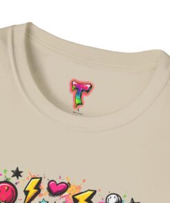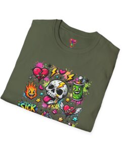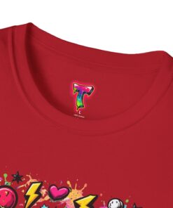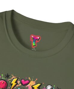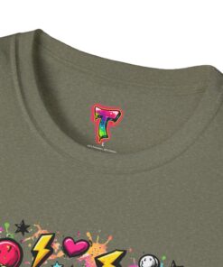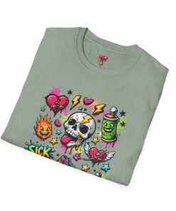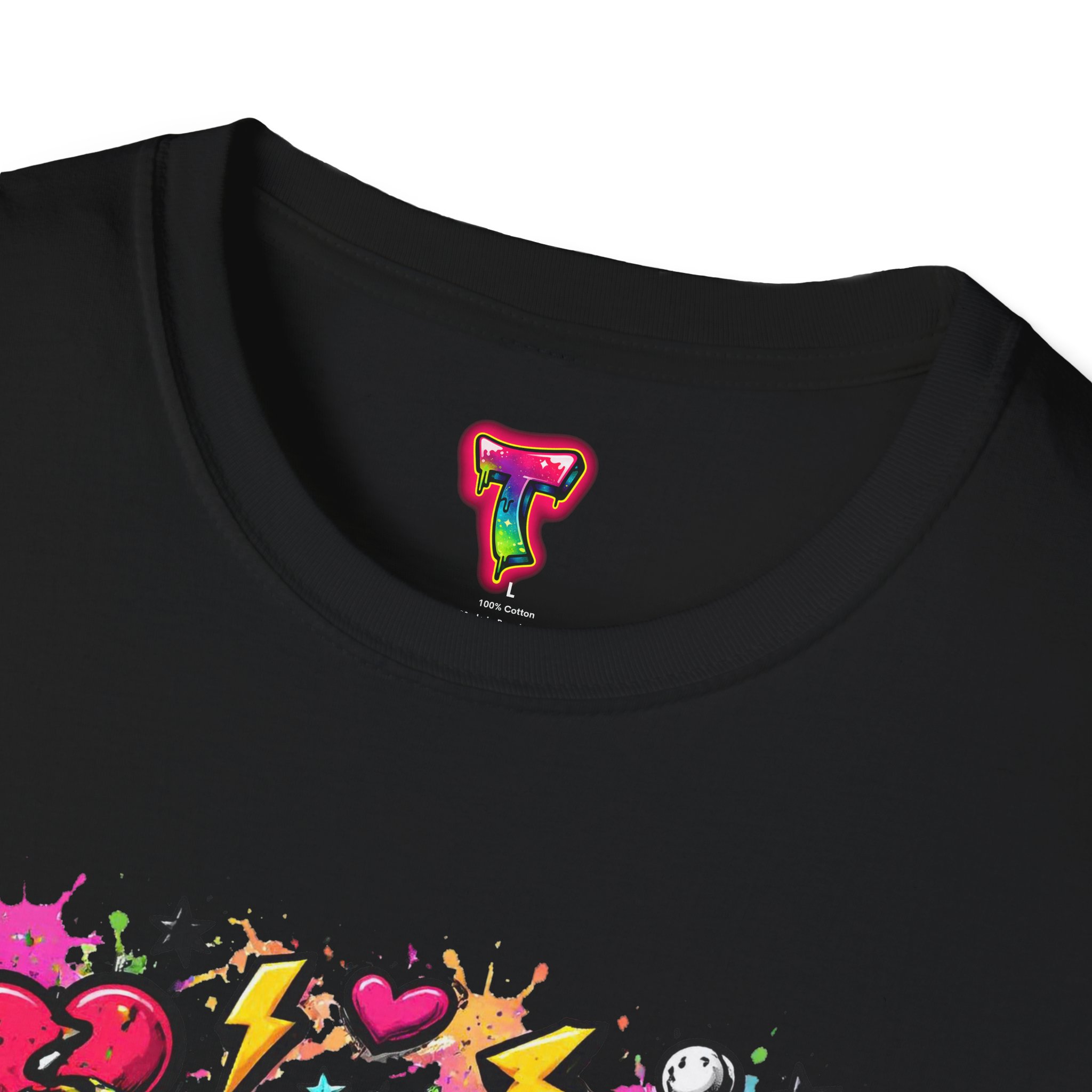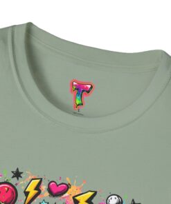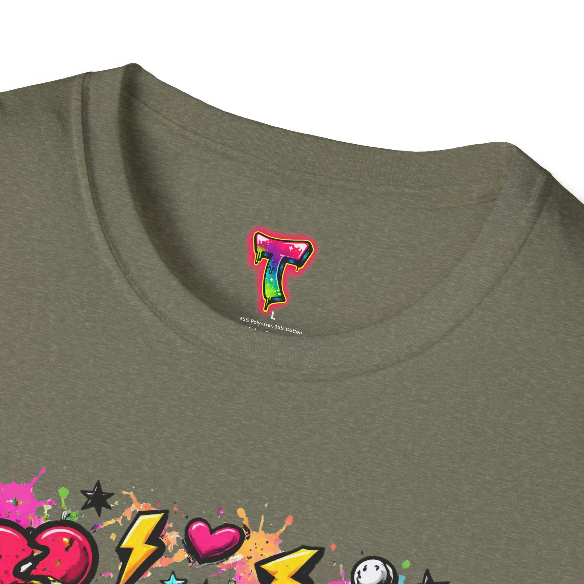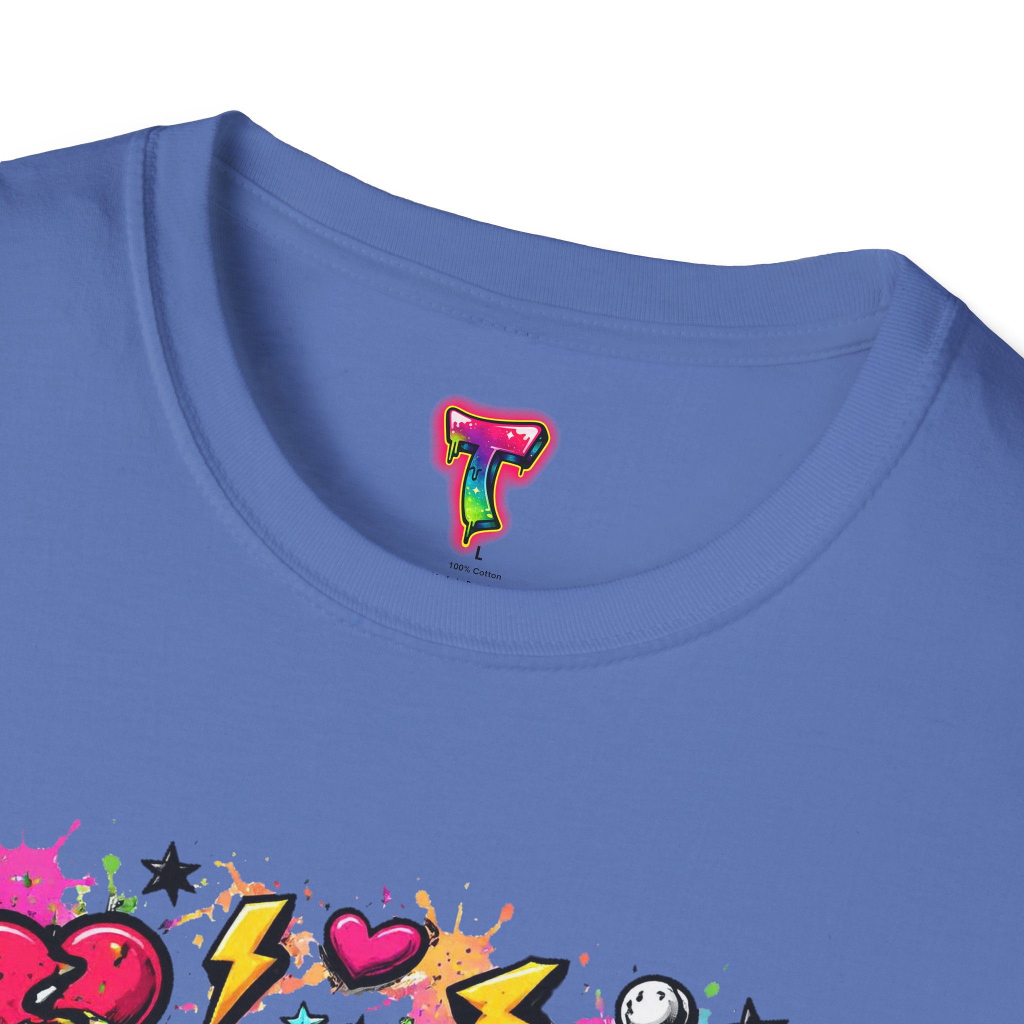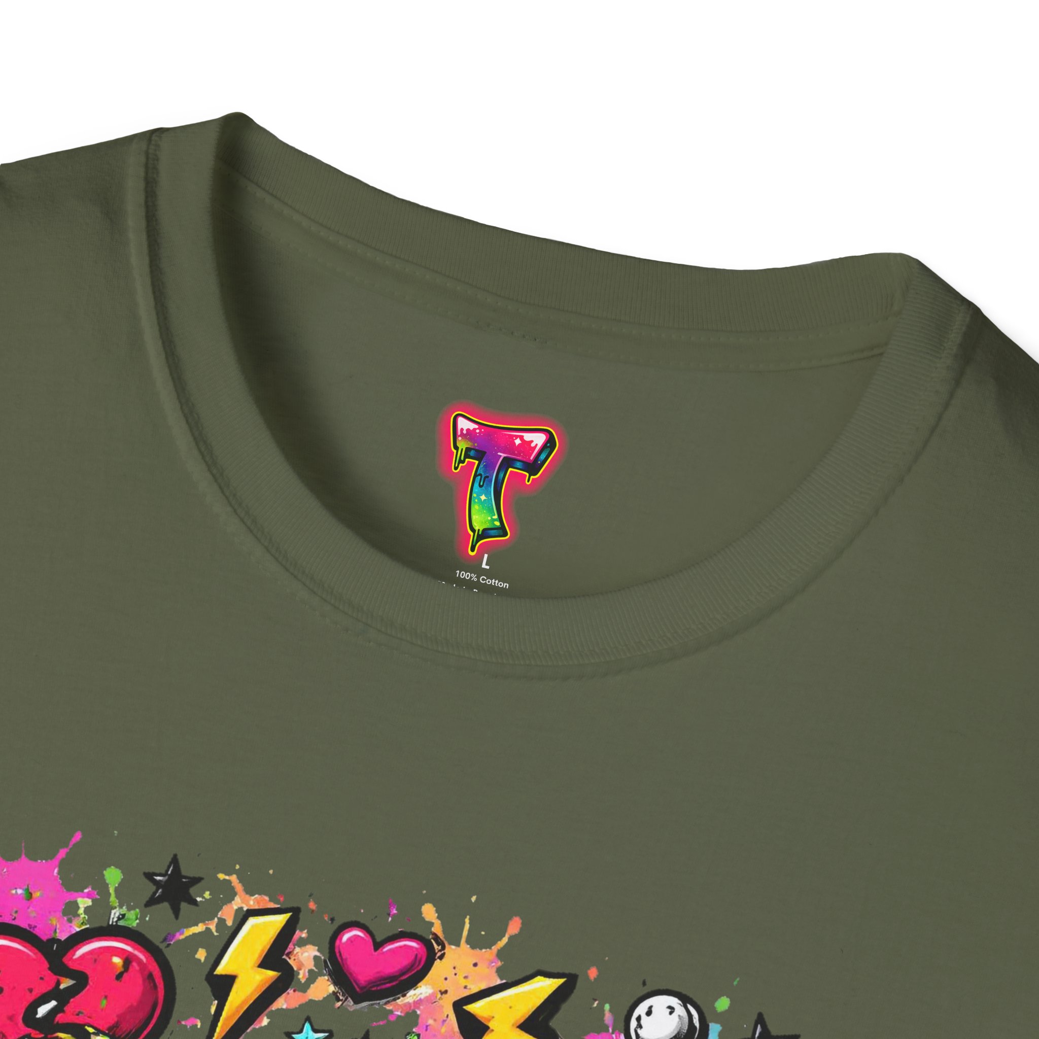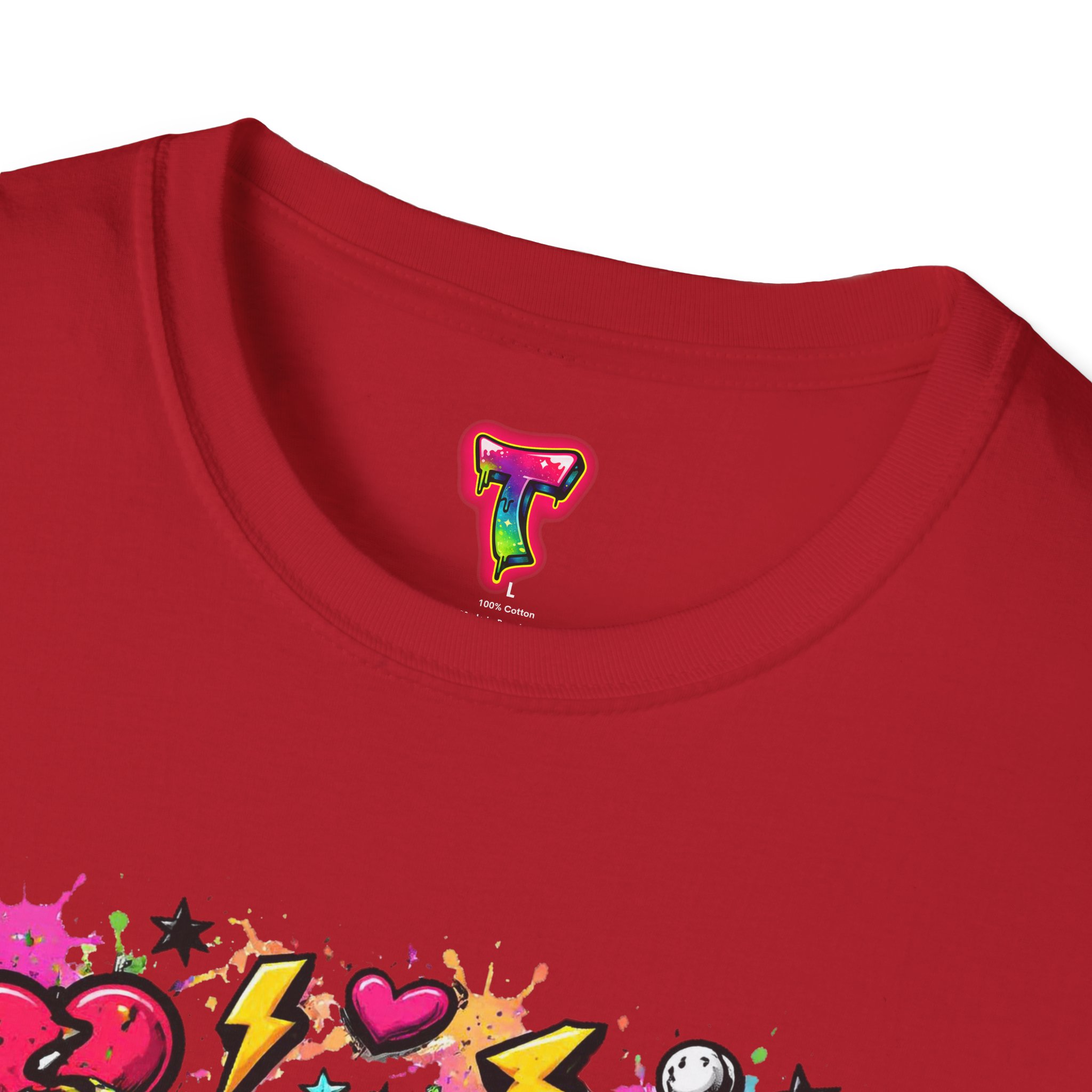 A lightweight, street-ready tee built for people who live for bold color and playful edge. This soft cotton shirt carries a vibrant, skate-punk collage — skulls, spray cans, dripping hearts and neon flashes — that looks hand-sketched and splashed with paint. It sits comfortably at the crew neck and falls in a classic, relaxed silhouette that layers easily under a flannel or stands alone with jeans. Wear it to shows, skate sessions, late-night hangs, or whenever you want an outfit that says loud, creative, and a little wild. The breathable ring-spun cotton and tear-away label keep focus on comfort while the tubular knit and taped shoulders keep the shape through repeat wears and washes.