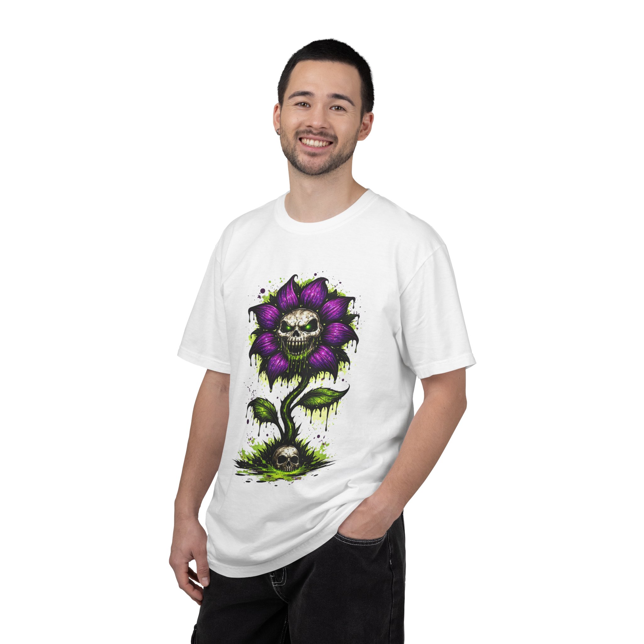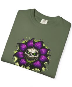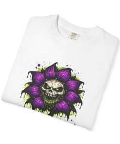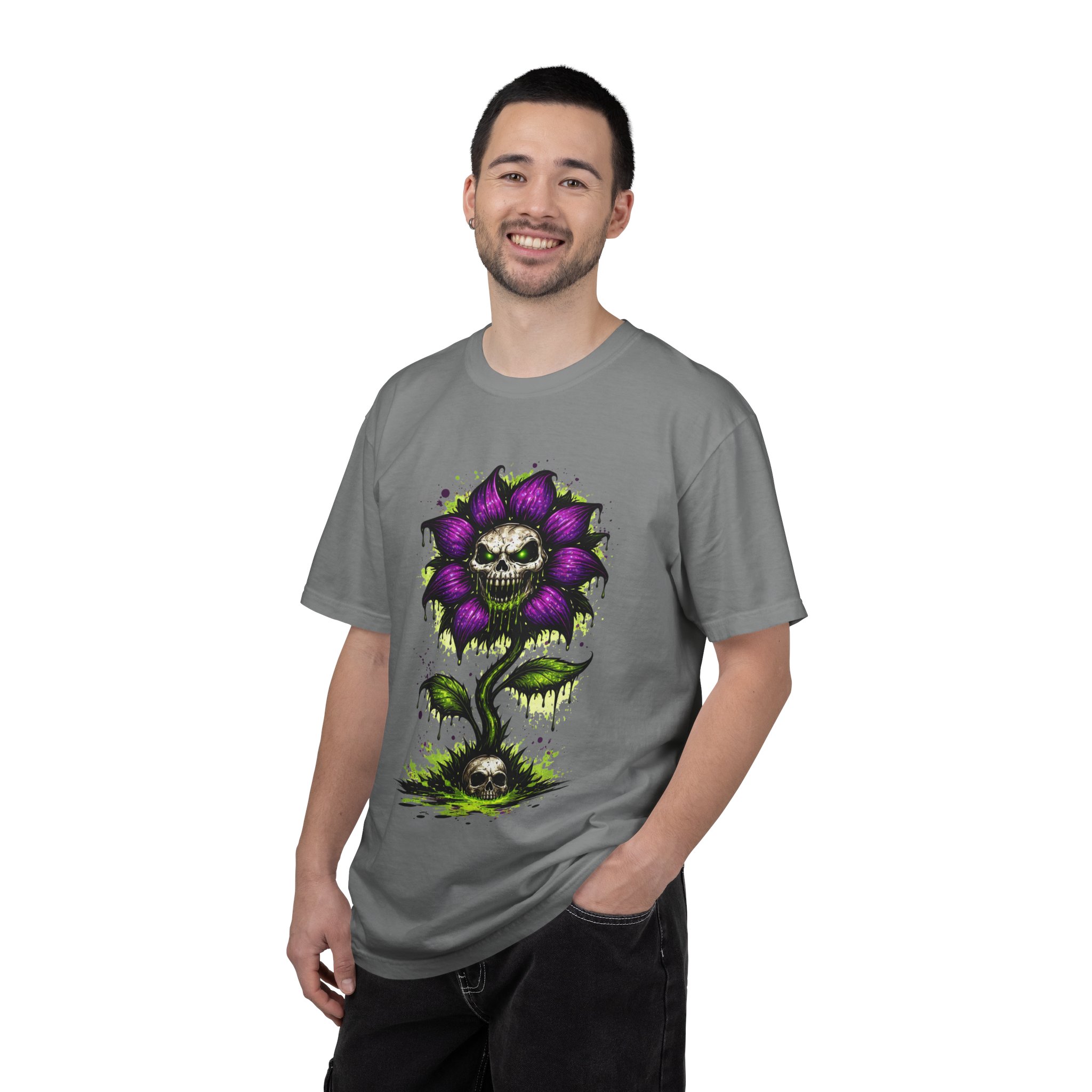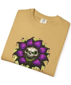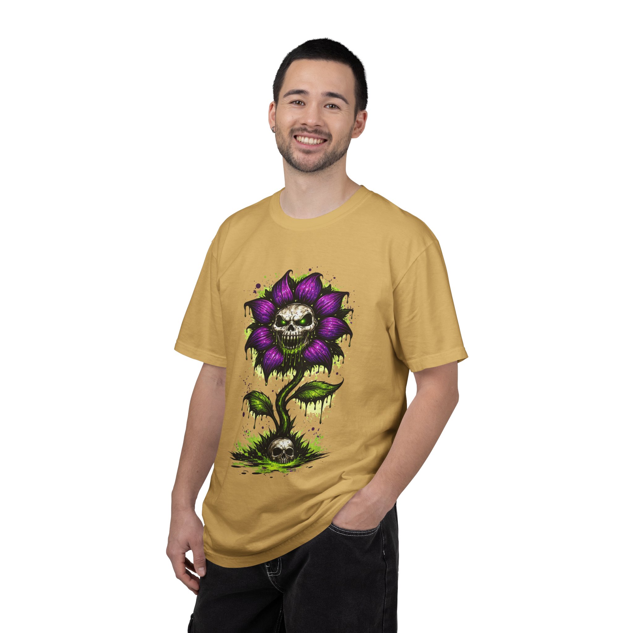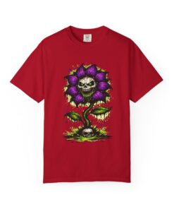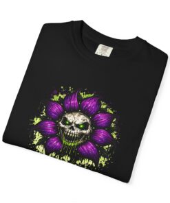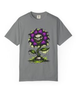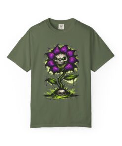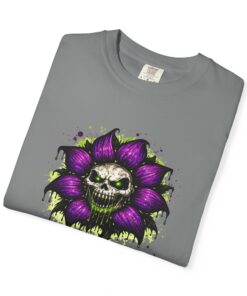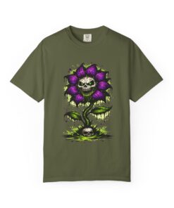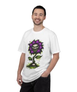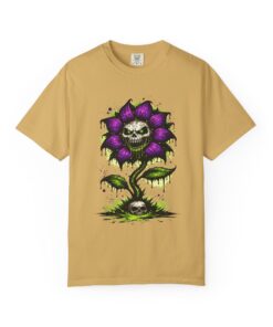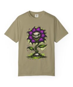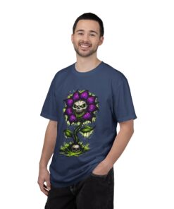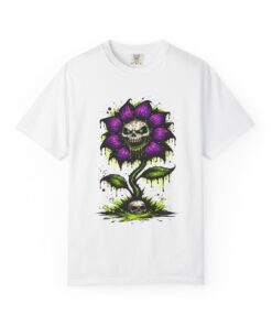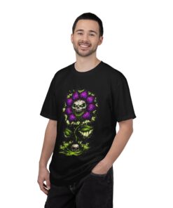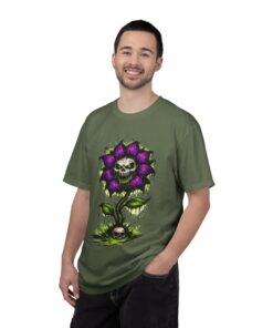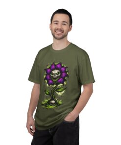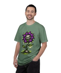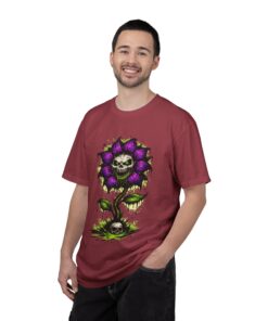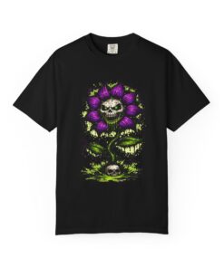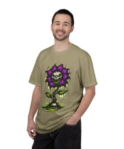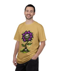 This relaxed-fit tee brings a darkly whimsical edge to everyday wear. The garment-dyed, heavyweight cotton feels soft and lived-in from the first wear, while a bold illustrated bloom—petals in deep purple and a grinning skull center—adds a splash of macabre charm. It sits casually over jeans or layered under a flannel for cooler nights, carrying an offbeat attitude without trying too hard. The tubular, no-side-seam construction and double-needle stitching give it a clean silhouette and lasting structure, while the wide size range and pre-shrunk cotton make it easy to find a comfortable fit. Wear it to show a playful, slightly spooky side at gatherings, art shows, or late-night hangs in the city.