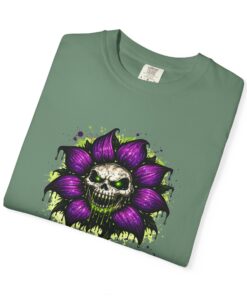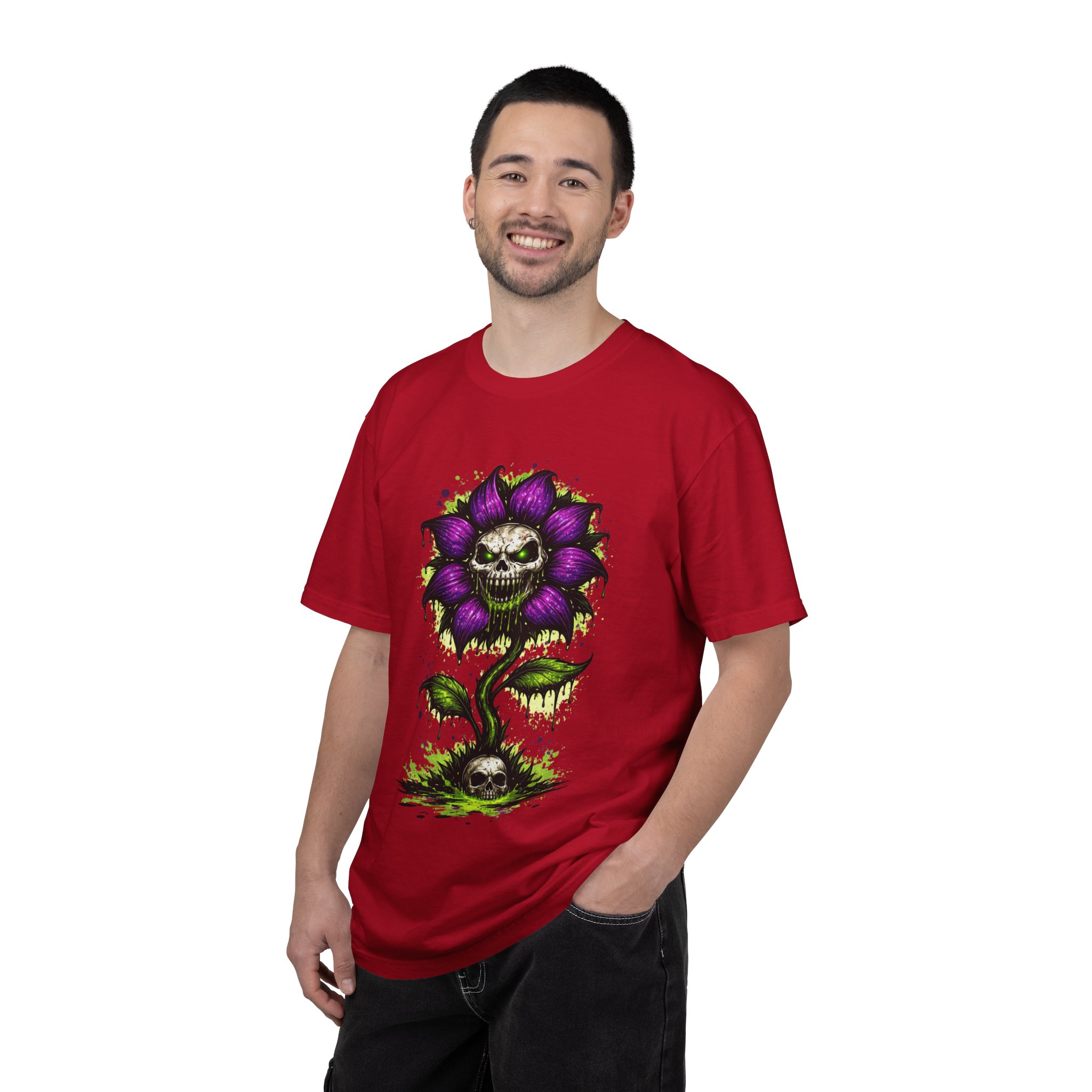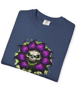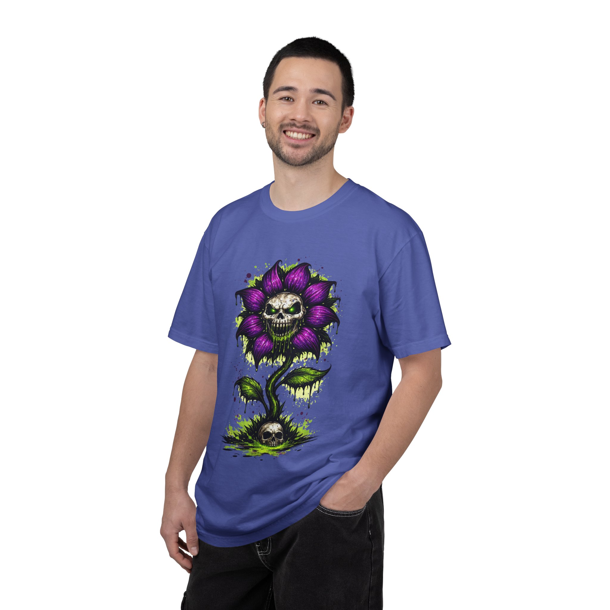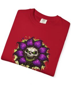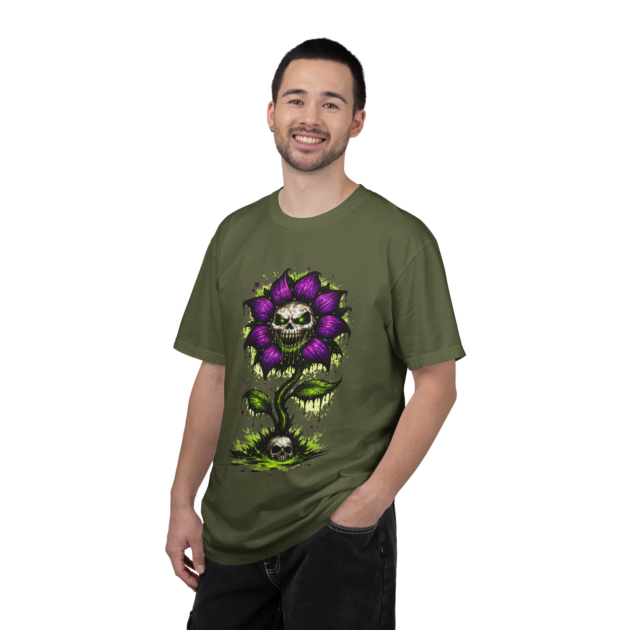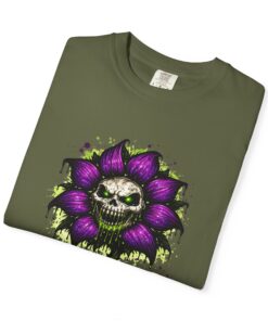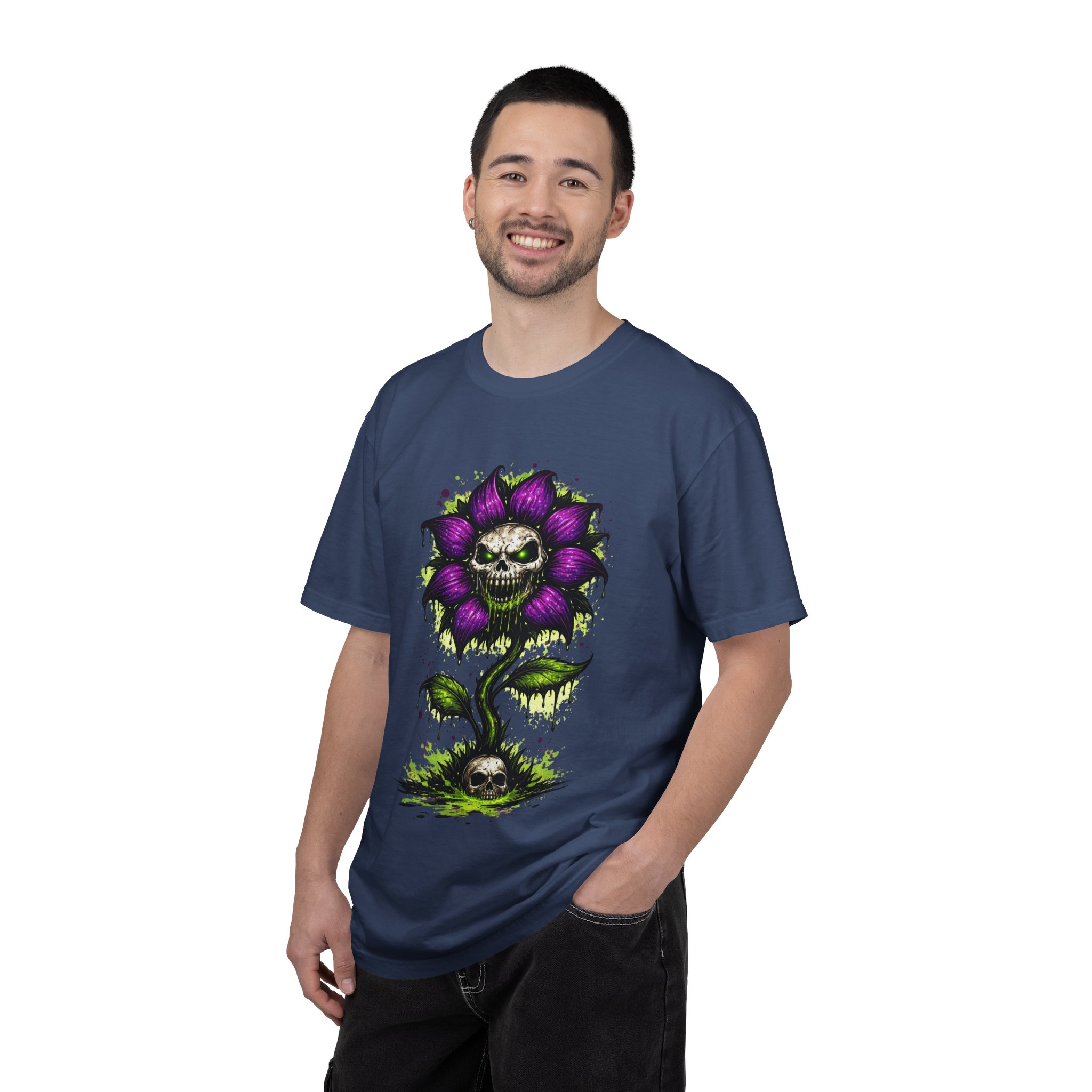 This relaxed-fit tee brings a darkly whimsical edge to everyday wear. The garment-dyed, heavyweight cotton feels soft and lived-in from the first wear, while a bold illustrated bloom—petals in deep purple and a grinning skull center—adds a splash of macabre charm. It sits casually over jeans or layered under a flannel for cooler nights, carrying an offbeat attitude without trying too hard. The tubular, no-side-seam construction and double-needle stitching give it a clean silhouette and lasting structure, while the wide size range and pre-shrunk cotton make it easy to find a comfortable fit. Wear it to show a playful, slightly spooky side at gatherings, art shows, or late-night hangs in the city.