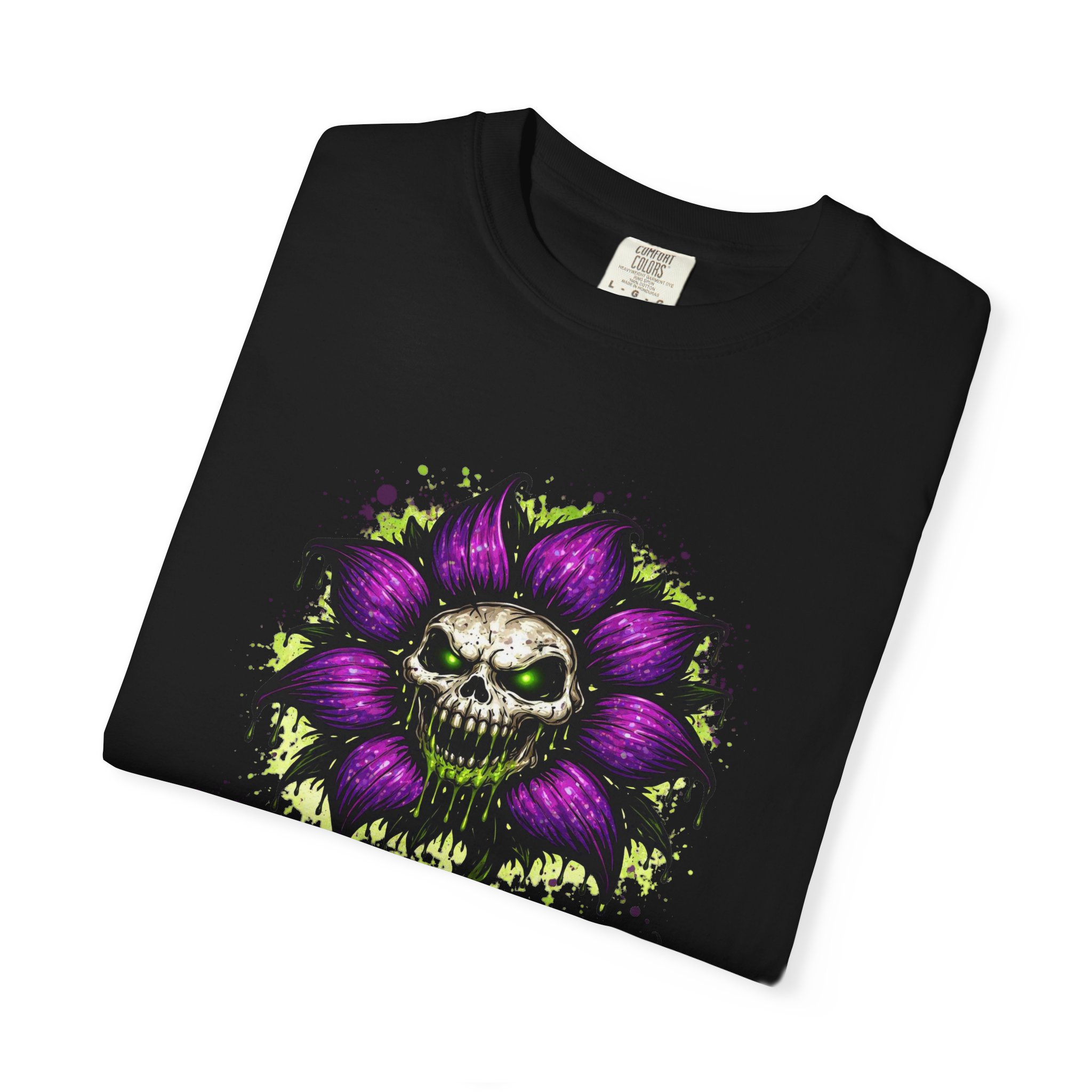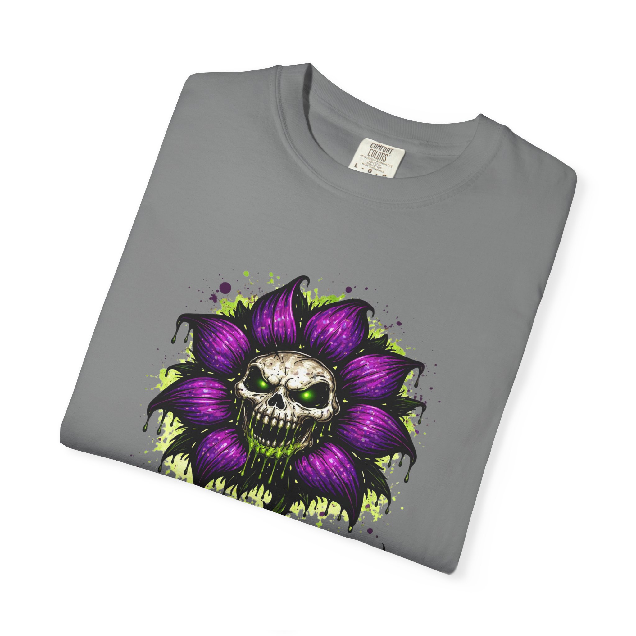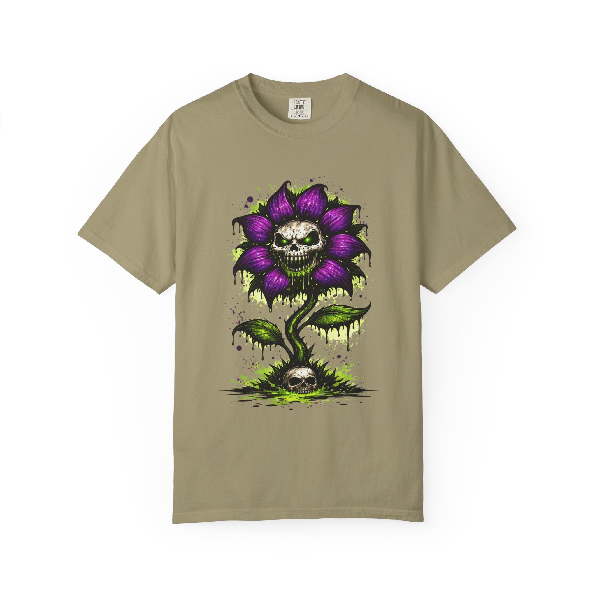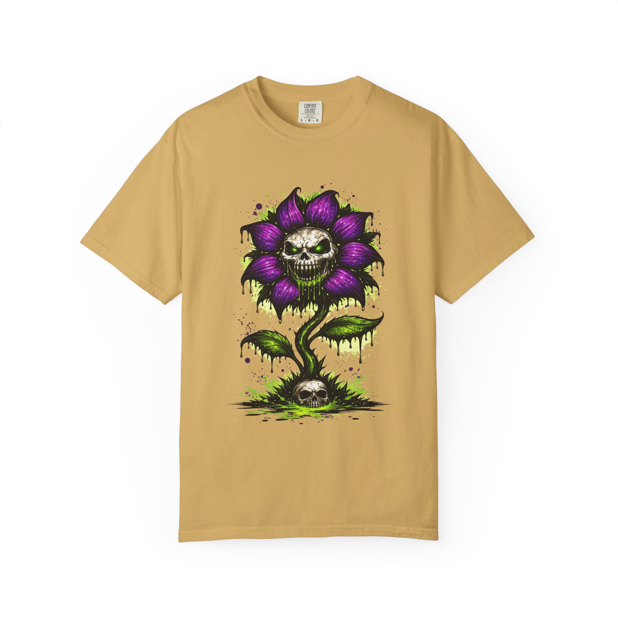 This relaxed-fit tee brings a darkly whimsical edge to everyday wear. The garment-dyed, heavyweight cotton feels soft and lived-in from the first wear, while a bold illustrated bloom—petals in deep purple and a grinning skull center—adds a splash of macabre charm. It sits casually over jeans or layered under a flannel for cooler nights, carrying an offbeat attitude without trying too hard. The tubular, no-side-seam construction and double-needle stitching give it a clean silhouette and lasting structure, while the wide size range and pre-shrunk cotton make it easy to find a comfortable fit. Wear it to show a playful, slightly spooky side at gatherings, art shows, or late-night hangs in the city.
