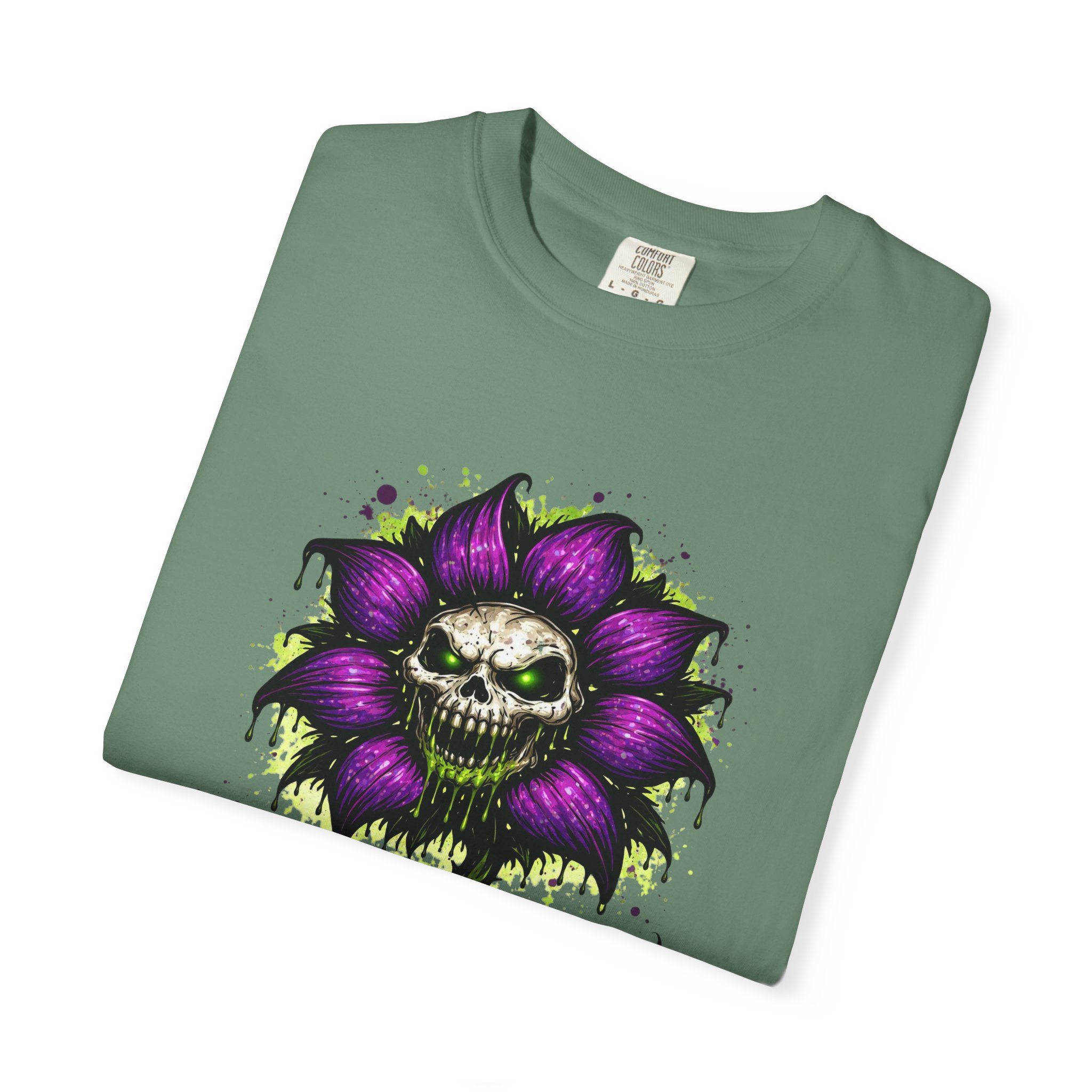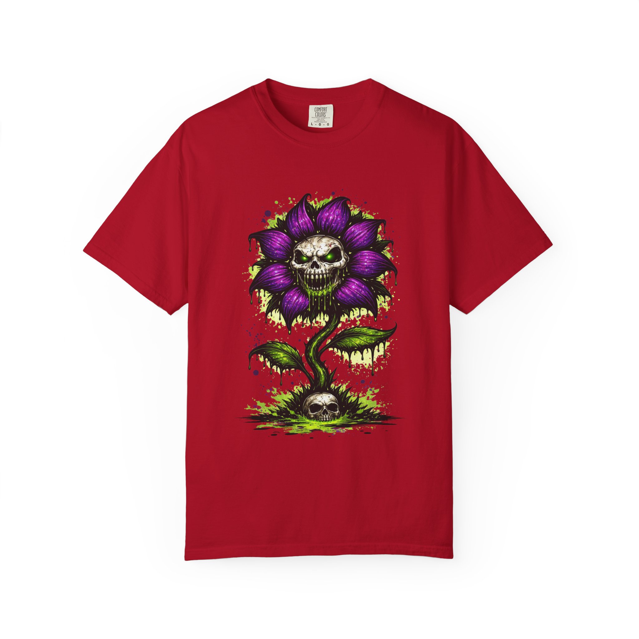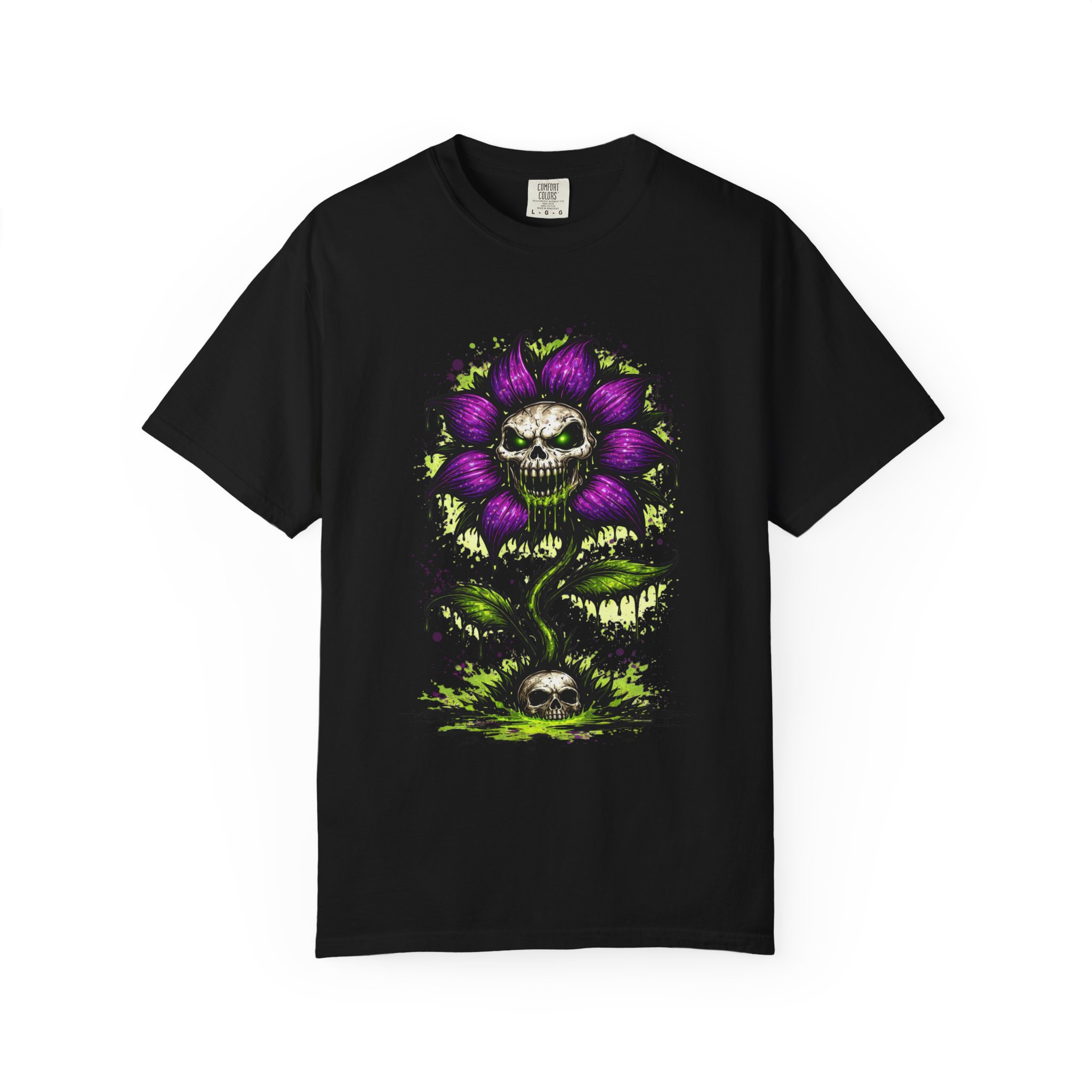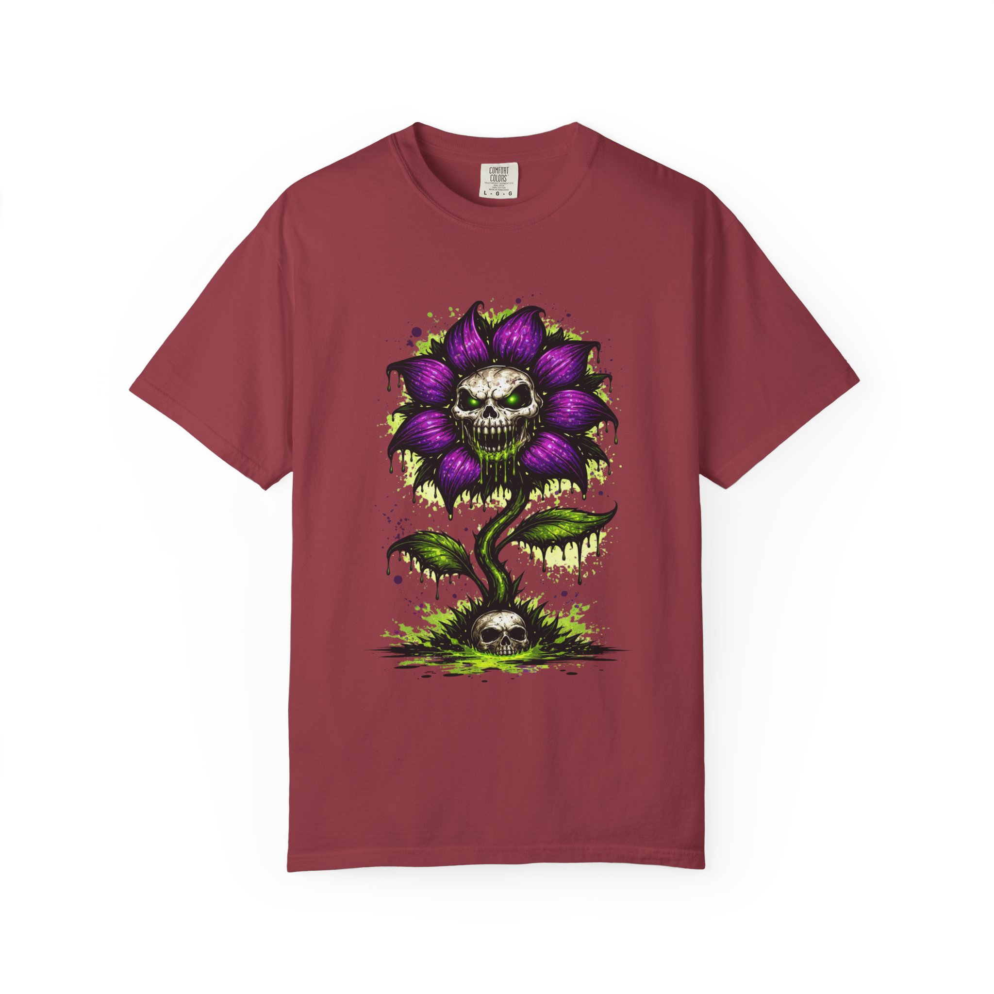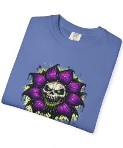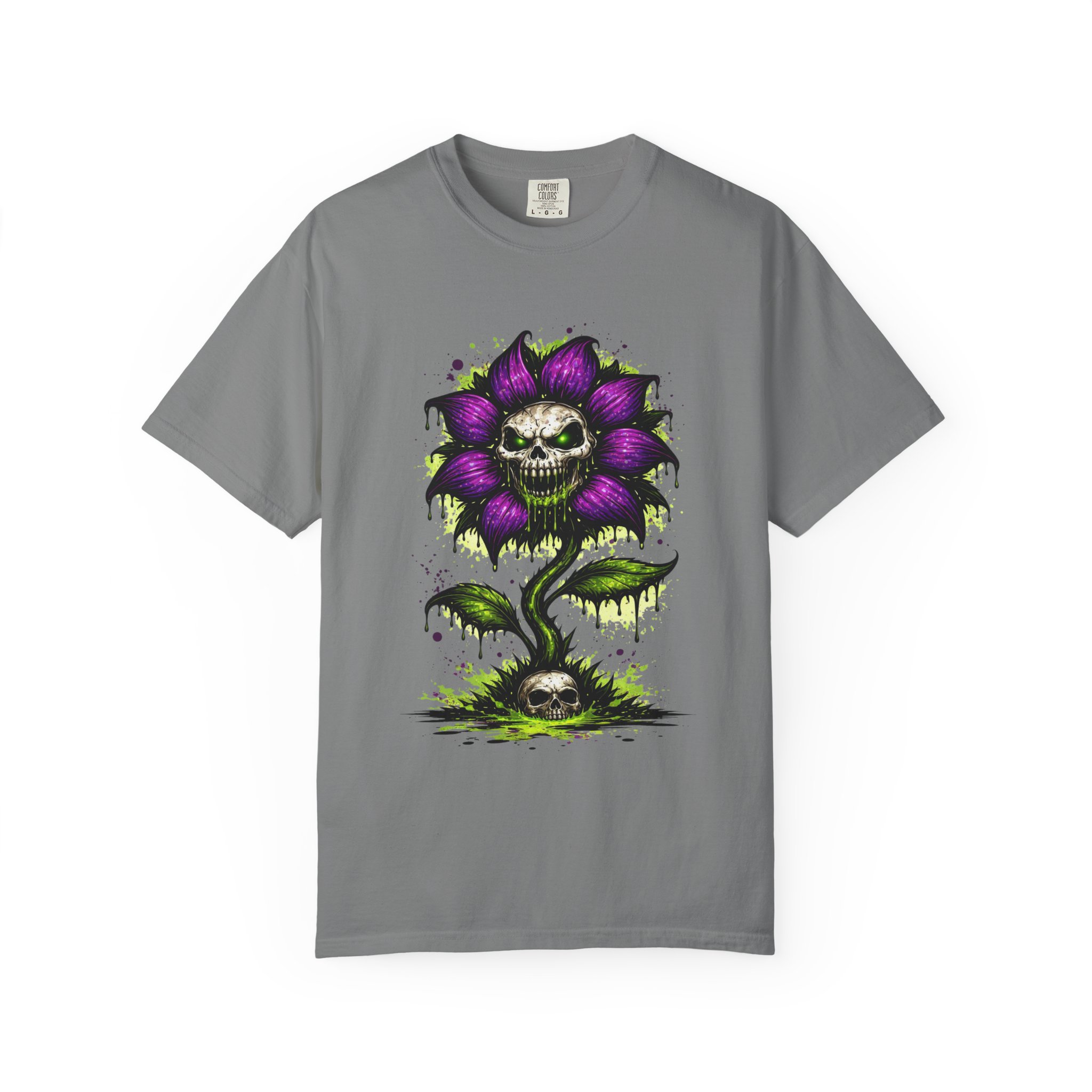 This relaxed-fit tee brings a darkly whimsical edge to everyday wear. The garment-dyed, heavyweight cotton feels soft and lived-in from the first wear, while a bold illustrated bloom—petals in deep purple and a grinning skull center—adds a splash of macabre charm. It sits casually over jeans or layered under a flannel for cooler nights, carrying an offbeat attitude without trying too hard. The tubular, no-side-seam construction and double-needle stitching give it a clean silhouette and lasting structure, while the wide size range and pre-shrunk cotton make it easy to find a comfortable fit. Wear it to show a playful, slightly spooky side at gatherings, art shows, or late-night hangs in the city.