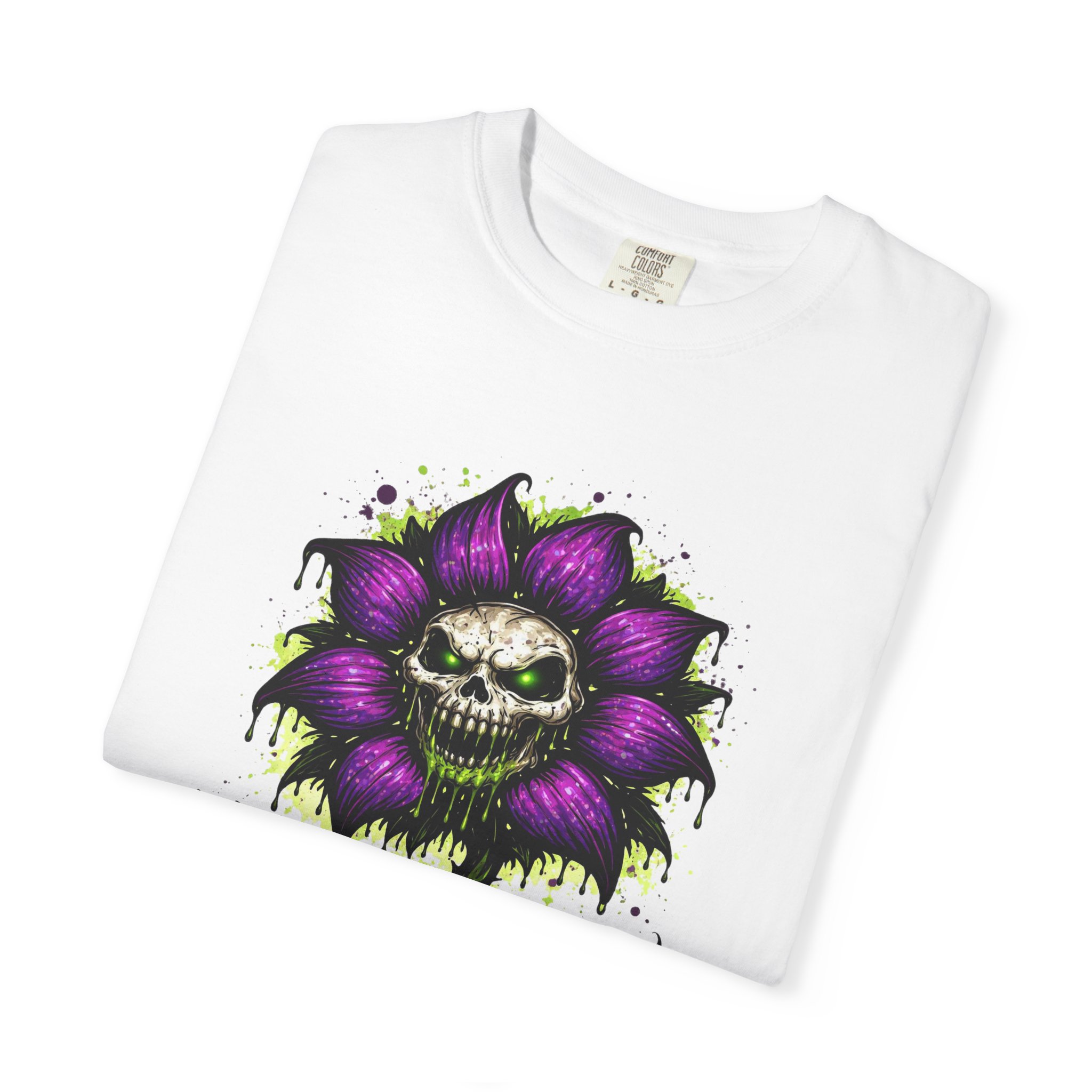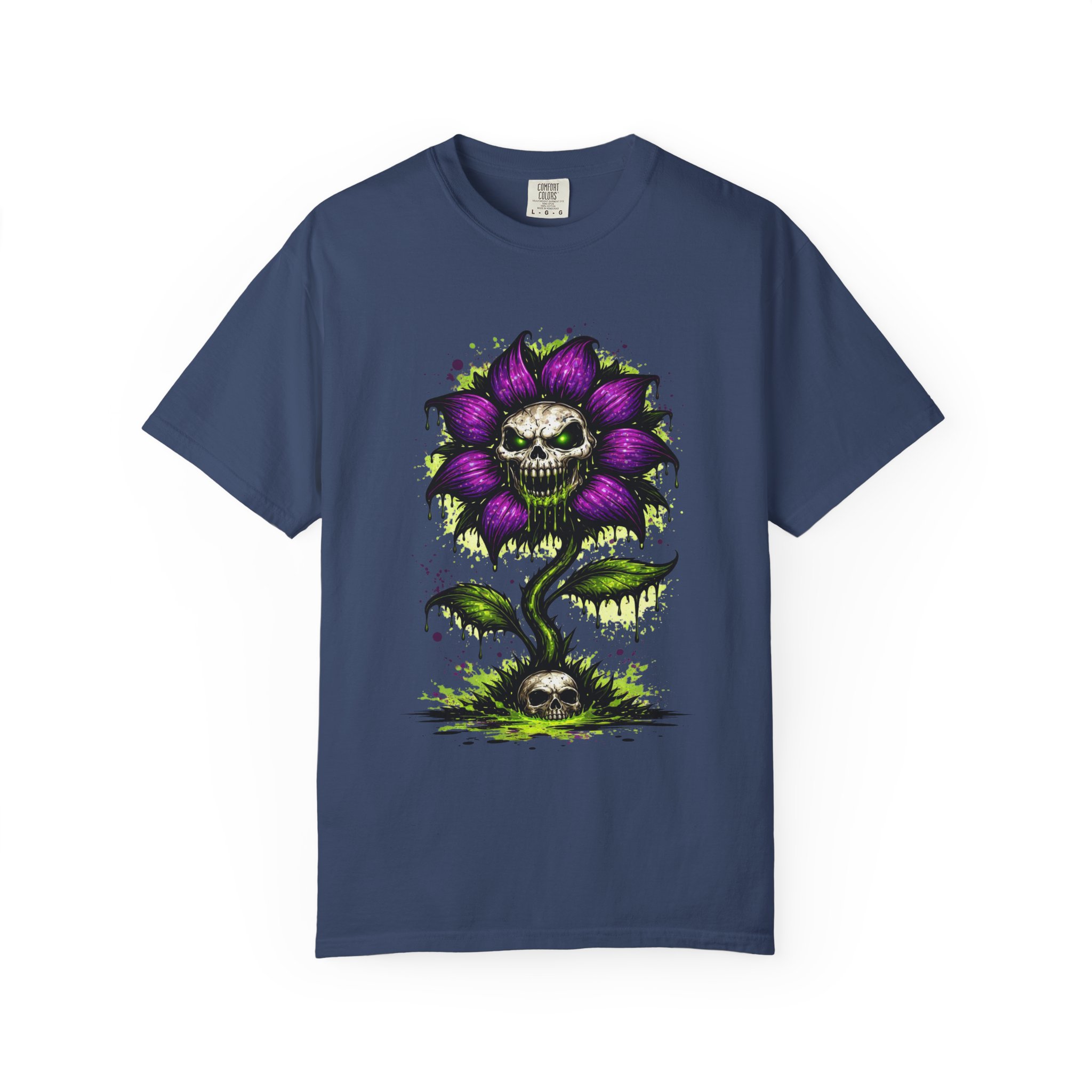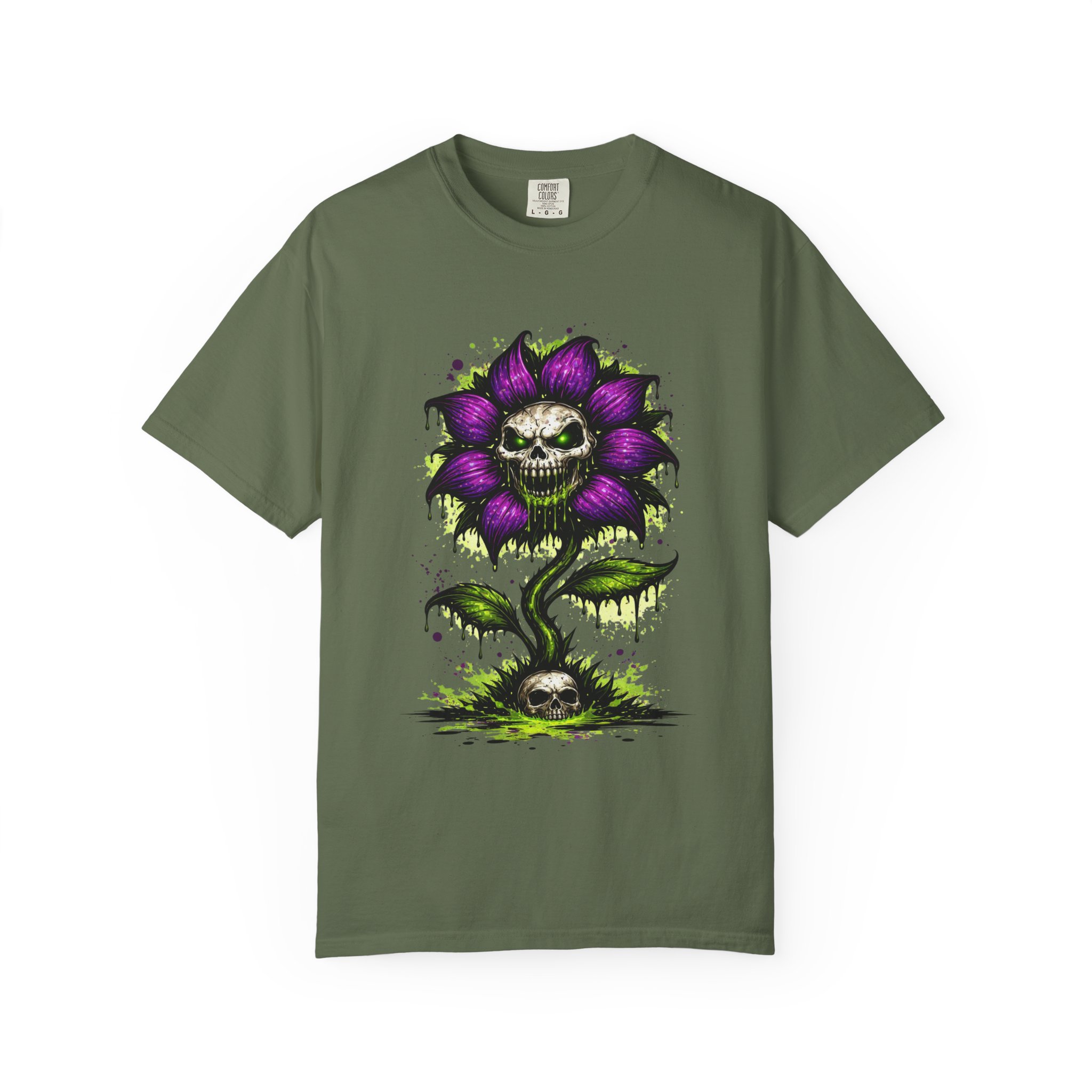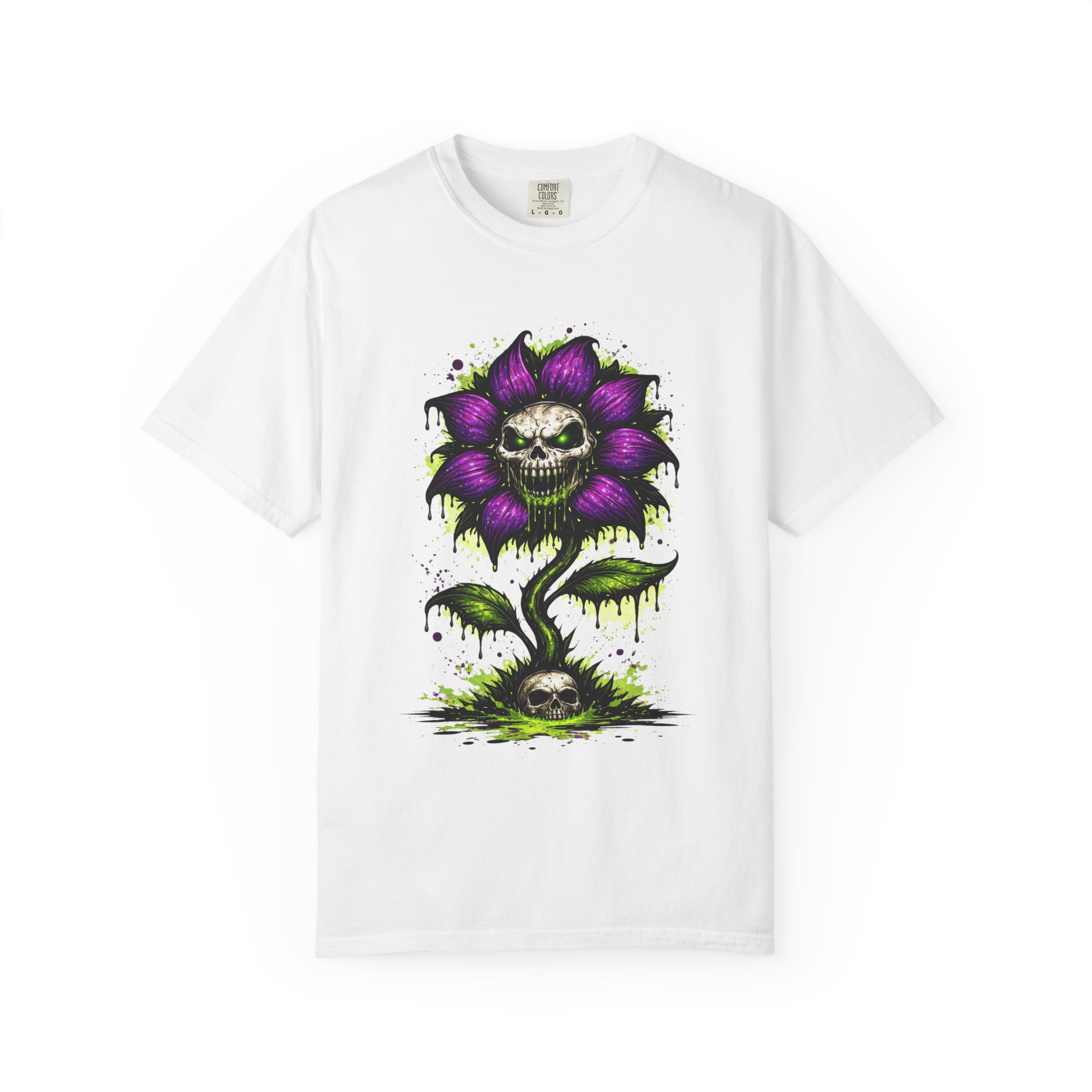 This relaxed-fit tee brings a darkly whimsical edge to everyday wear. The garment-dyed, heavyweight cotton feels soft and lived-in from the first wear, while a bold illustrated bloom—petals in deep purple and a grinning skull center—adds a splash of macabre charm. It sits casually over jeans or layered under a flannel for cooler nights, carrying an offbeat attitude without trying too hard. The tubular, no-side-seam construction and double-needle stitching give it a clean silhouette and lasting structure, while the wide size range and pre-shrunk cotton make it easy to find a comfortable fit. Wear it to show a playful, slightly spooky side at gatherings, art shows, or late-night hangs in the city.
