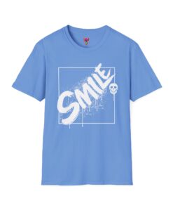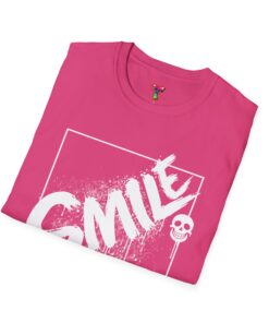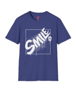 A bold, streetwise tee that speaks with a cheeky edge. The deep red crew keeps the focus on the high-contrast white graphic: the word “SMILE” scrawled with paint-splatter texture across a thin boxed frame, finished with a tiny skull on a stick — playful, a little dark, and unapologetically expressive. Lightweight and soft against the skin, this shirt works as a layered statement piece for late-night walks, art shows, or casual hangouts with people who read irony as well as style. It drapes cleanly, holds its shape, and moves with you — the kind of tee you reach for when you want to say something without saying much at all.