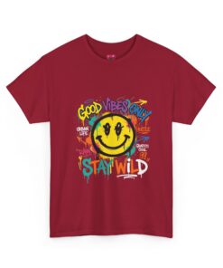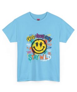 Bright, playful, and a little rebellious — this cotton tee wears its mood on the chest. A hand-sketched smiley sits at the center, splashed with paint drips, scribbled tags, and the phrase STAY WL beneath a lively “Good Vibes Only” banner. The artwork reads like a street-canvas: imperfect edges, bold marker strokes, and layered colors that feel energetic and spontaneous. Wear it when you want to lift the room, sketch on a café napkin, or head out for a skate session. The classic crew silhouette keeps the look simple so the graphic does all the talking.