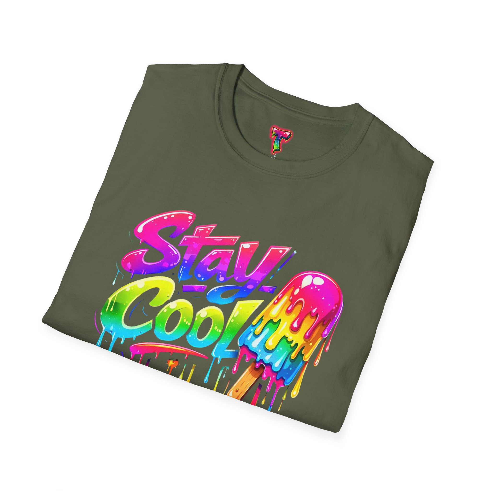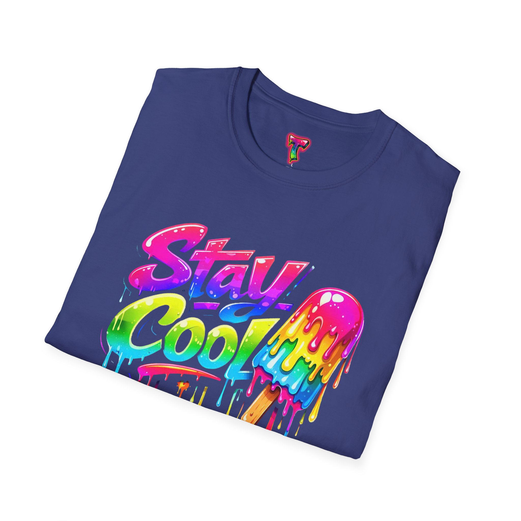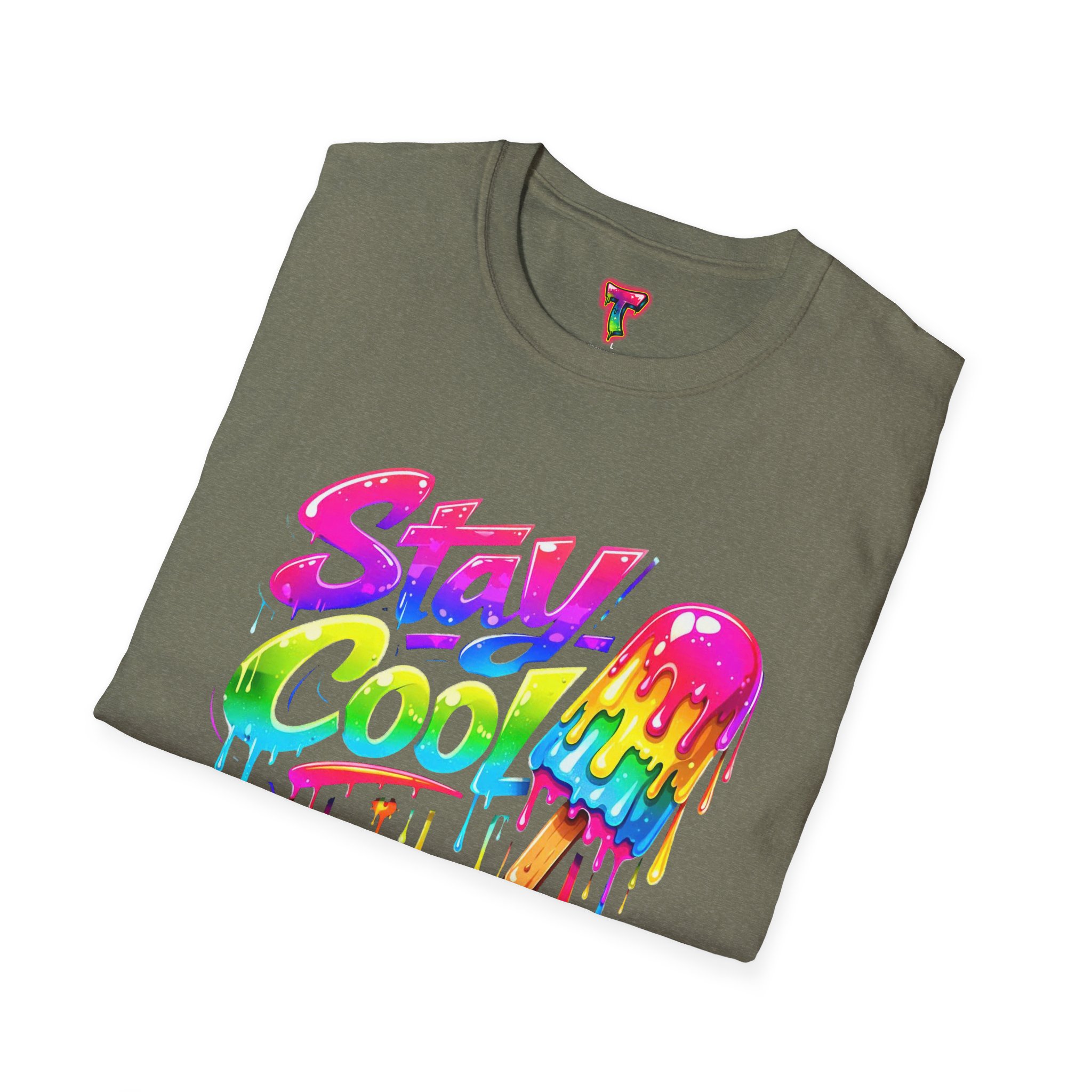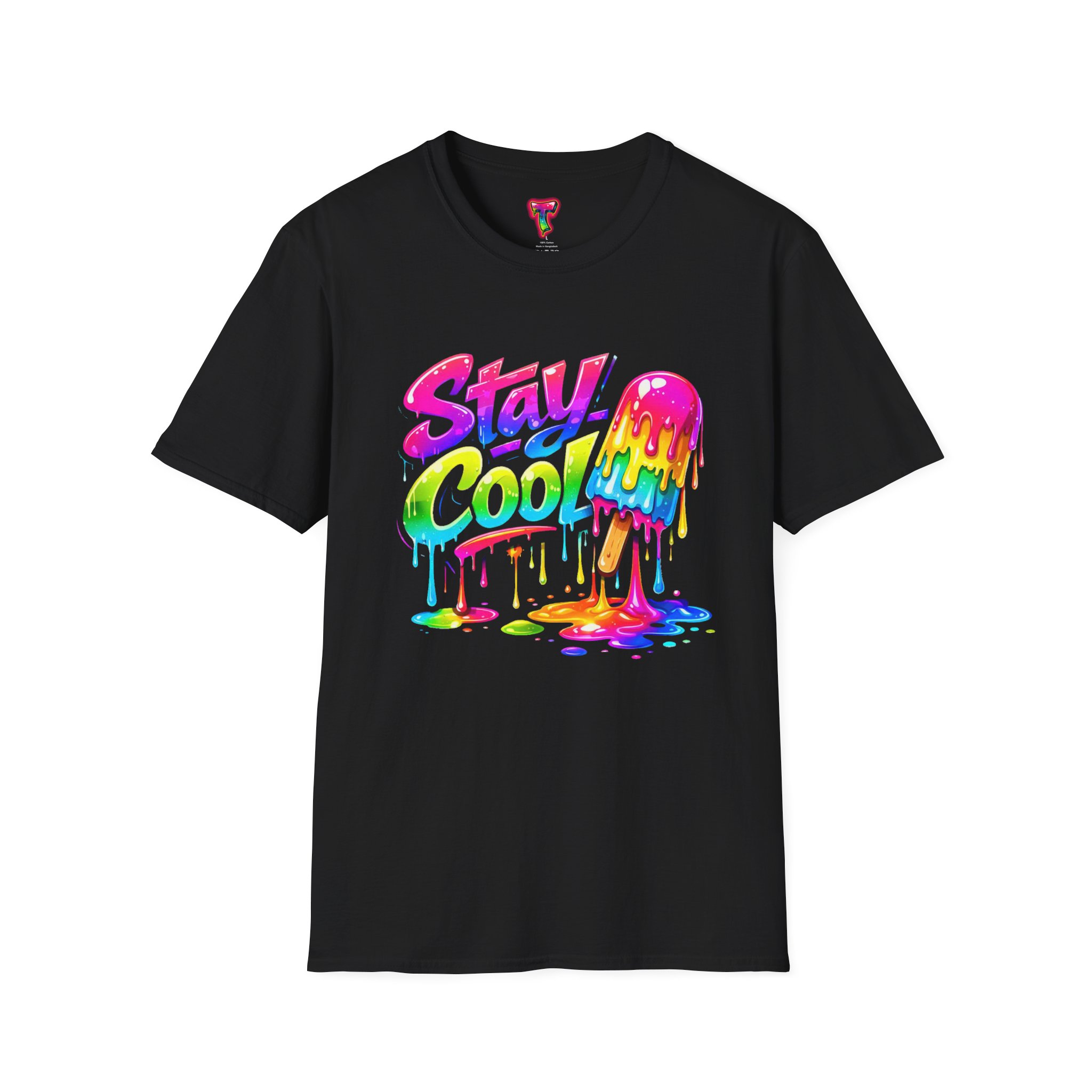 Keep your vibe fresh and colorful with this eye-catching “Stay Cool” graphic tee. Featuring bold neon-style lettering paired with a melting popsicle design, this shirt perfectly captures the fun and refreshing energy of summer. The dripping rainbow colors add a playful, modern twist that stands out in any crowd.