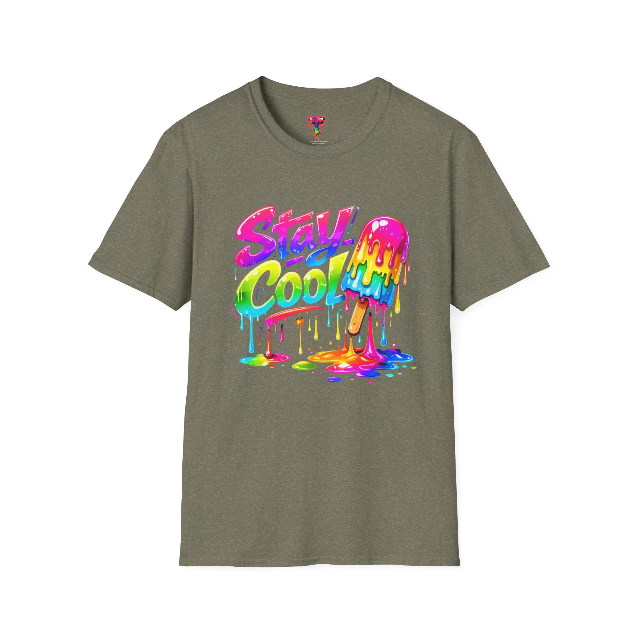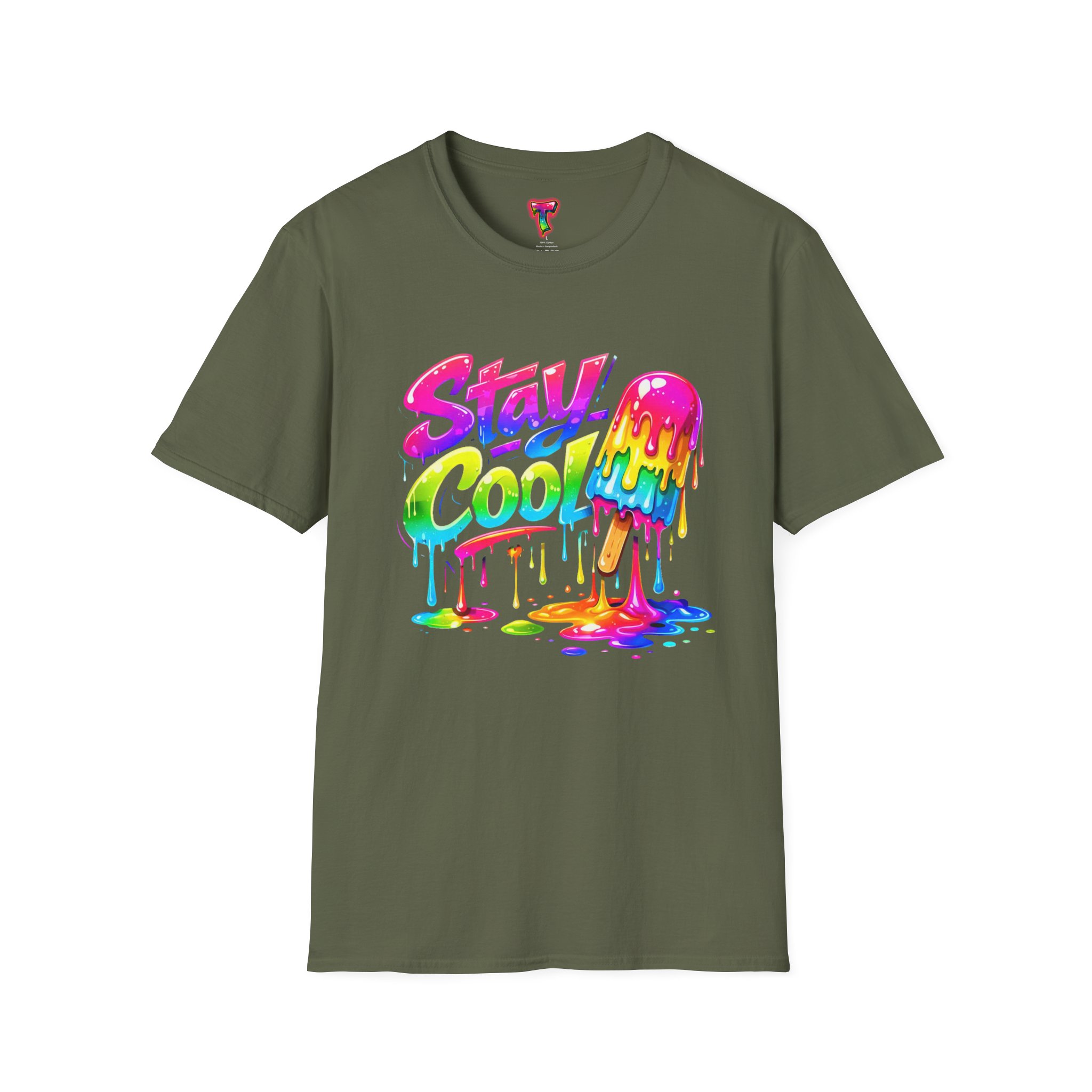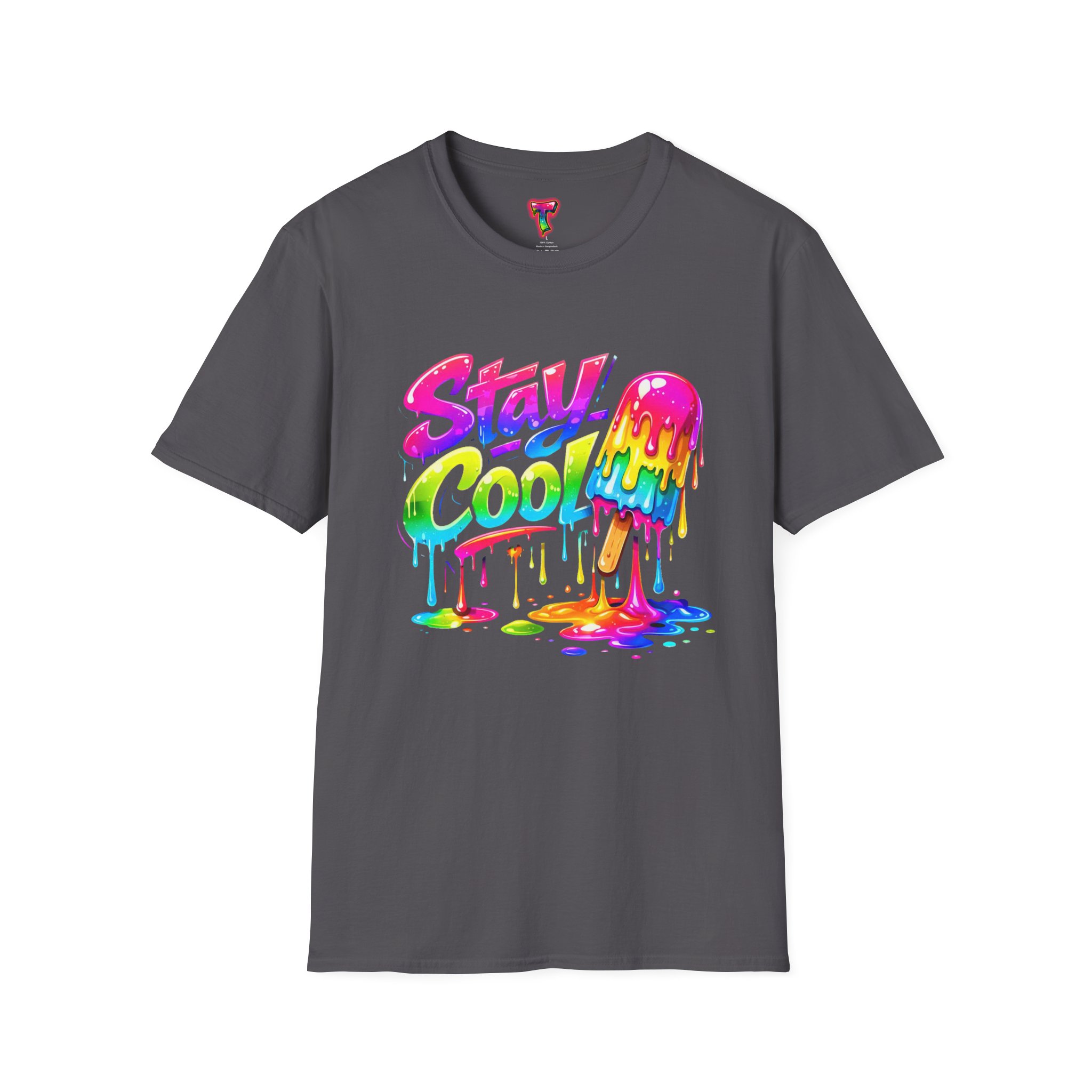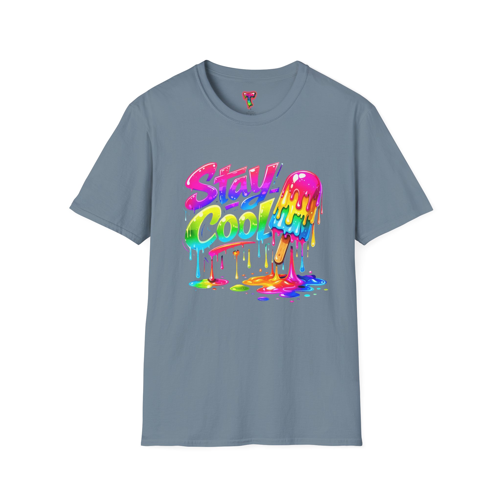 Keep your vibe fresh and colorful with this eye-catching “Stay Cool” graphic tee. Featuring bold neon-style lettering paired with a melting popsicle design, this shirt perfectly captures the fun and refreshing energy of summer. The dripping rainbow colors add a playful, modern twist that stands out in any crowd.