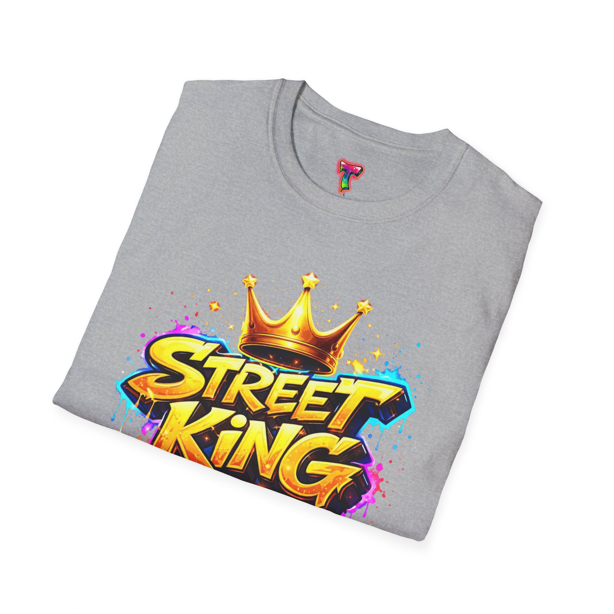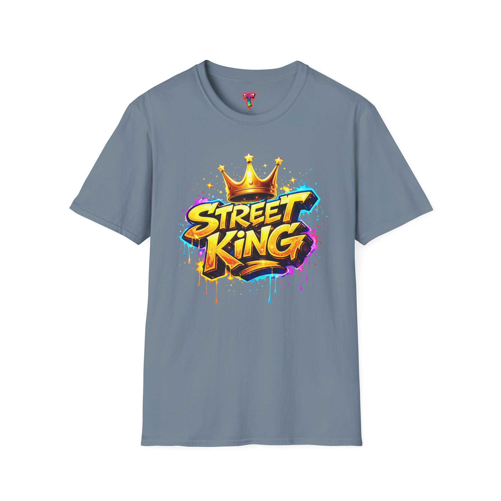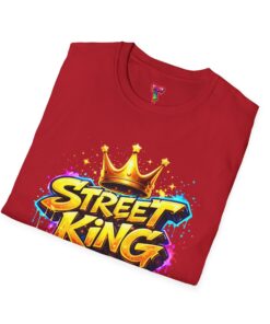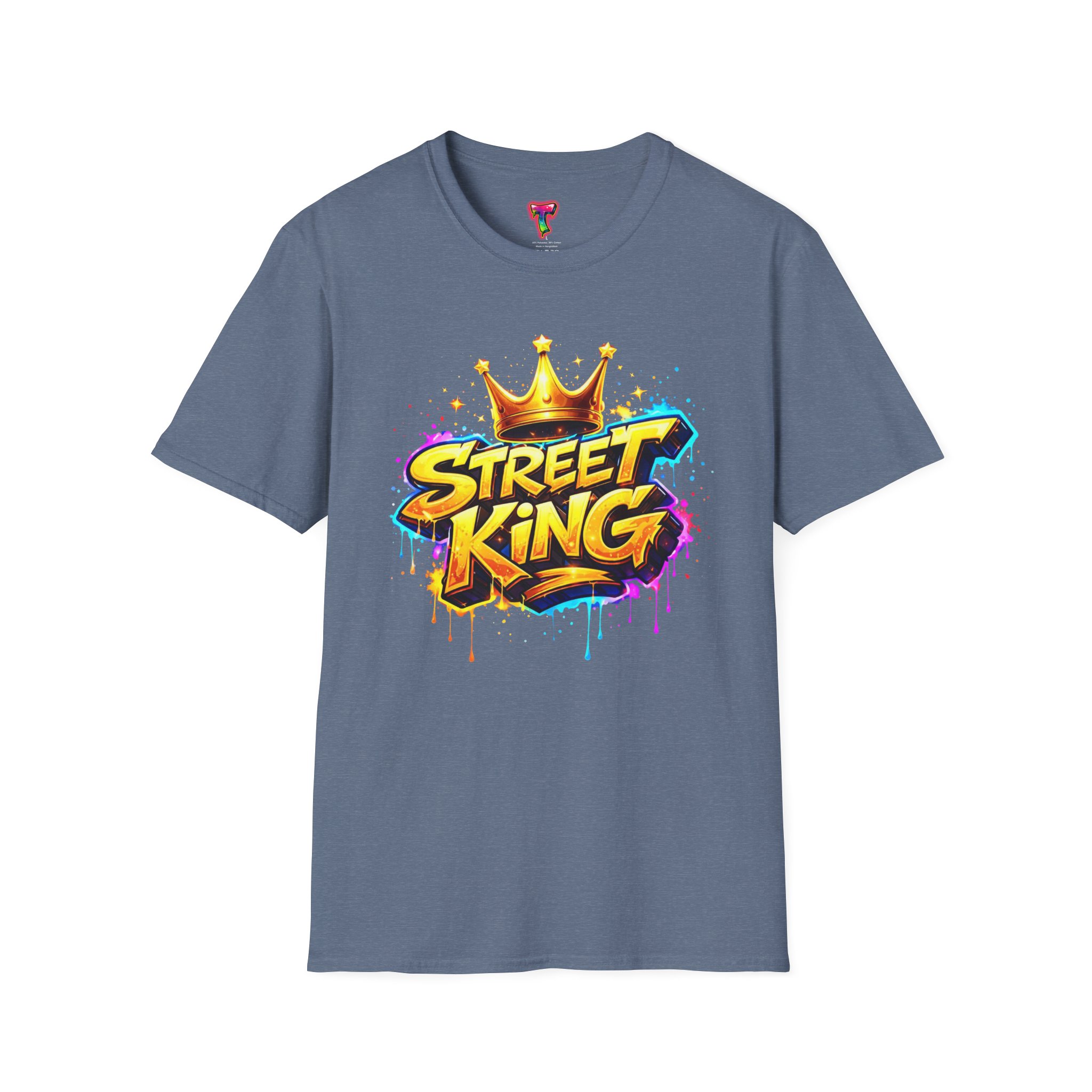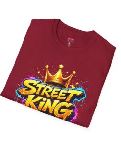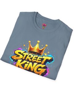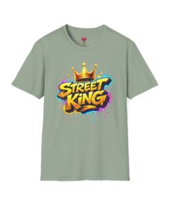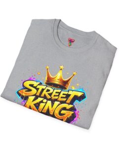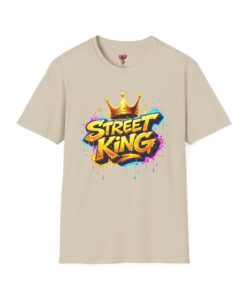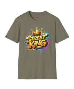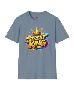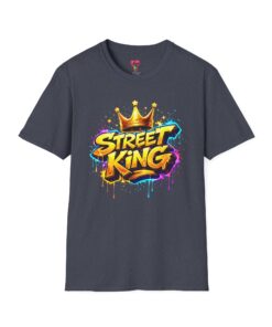 This lightweight crew-neck tee carries bold street-art energy without the weight. A vivid, graffiti-style “Street King” graphic crowns the chest with dripping paint details and a gold crown accent — it reads loud but wears comfortably. The classic fit and soft ring-spun cotton feel effortless whether layered under a jacket or worn solo on city walks. It settles into everyday rhythms: skateboard sessions, late-night meetups, mural hunts, or relaxed weekends at the café. The subtle natural flecks in unprocessed colors and tear-away label keep the focus on comfort and authenticity. This shirt sits naturally in an urban wardrobe — confident, creative, and built to last.