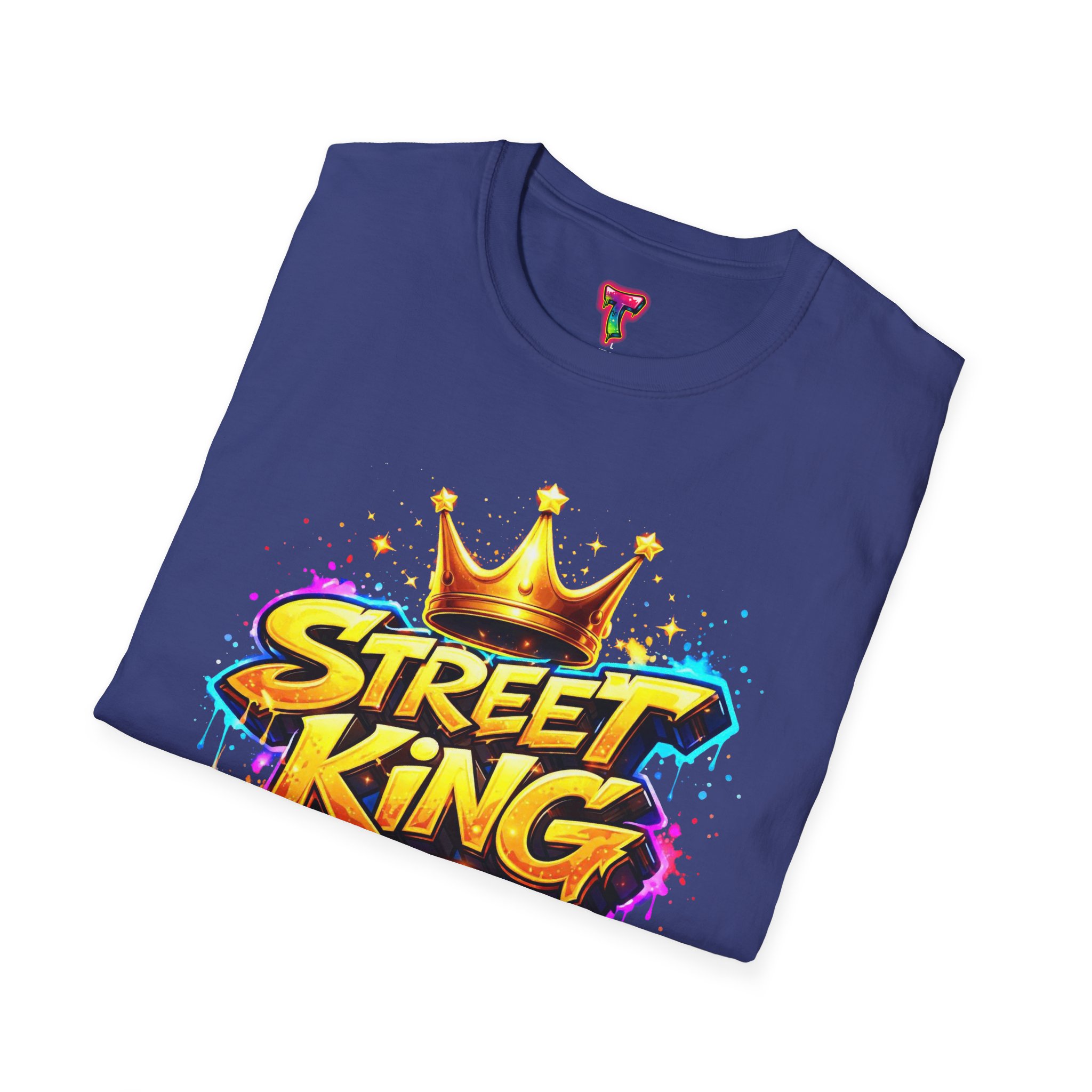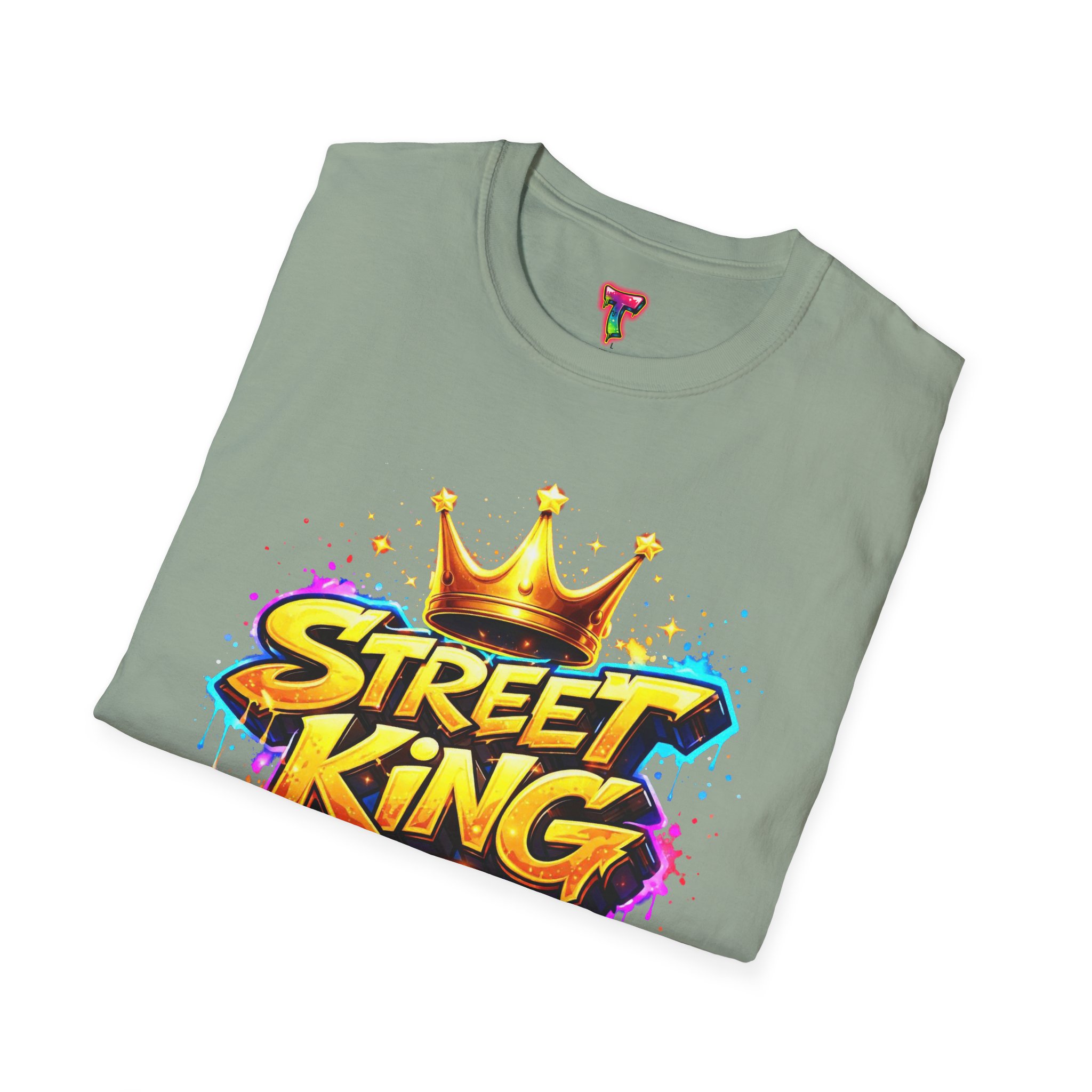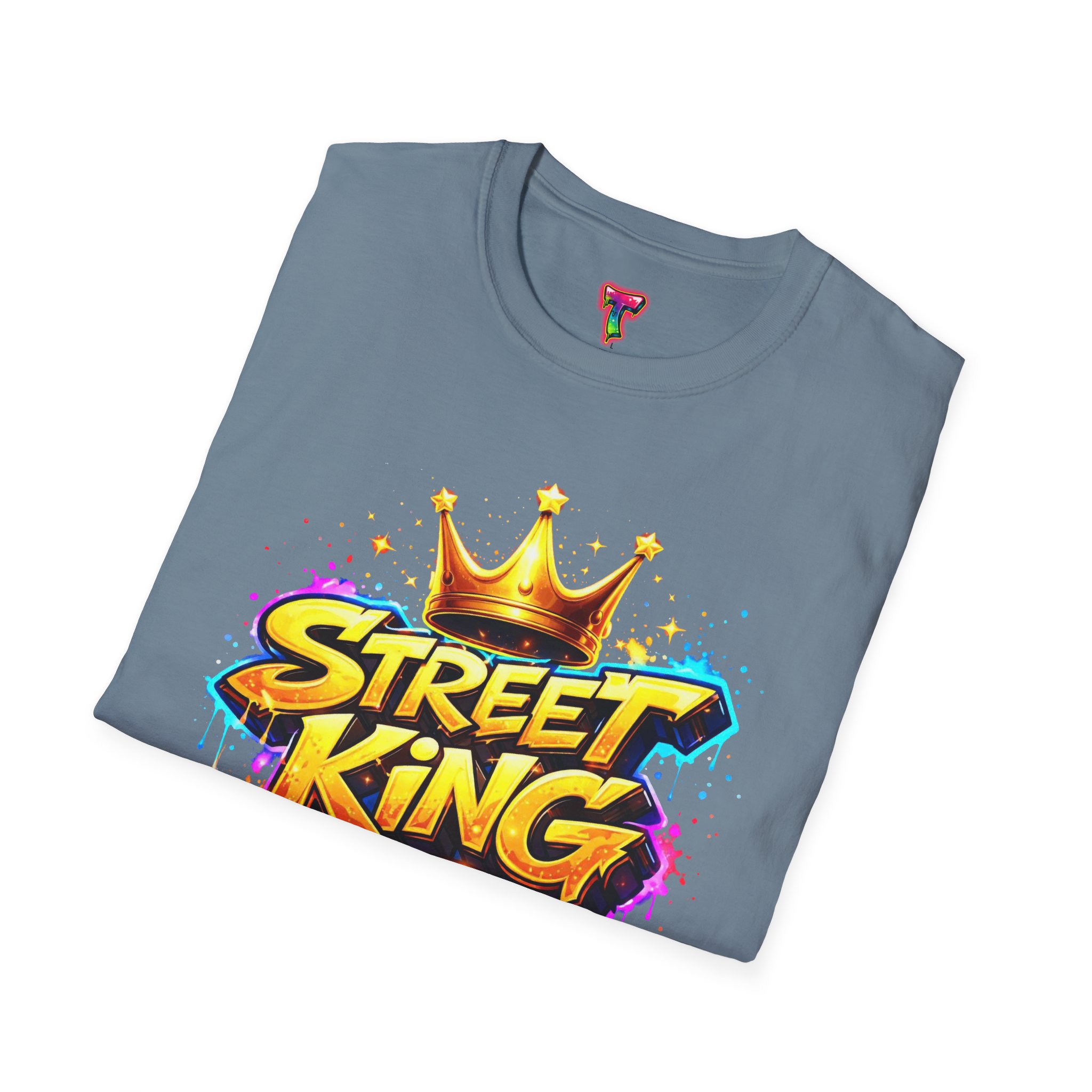 This lightweight crew-neck tee carries bold street-art energy without the weight. A vivid, graffiti-style “Street King” graphic crowns the chest with dripping paint details and a gold crown accent — it reads loud but wears comfortably. The classic fit and soft ring-spun cotton feel effortless whether layered under a jacket or worn solo on city walks. It settles into everyday rhythms: skateboard sessions, late-night meetups, mural hunts, or relaxed weekends at the café. The subtle natural flecks in unprocessed colors and tear-away label keep the focus on comfort and authenticity. This shirt sits naturally in an urban wardrobe — confident, creative, and built to last.