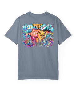 This heavyweight garment-dyed tee brings bold street-art energy into everyday wear. The soft, lived-in color and relaxed fit make it feel like an instant favorite, while the vibrant back graphic—spray-paint drips, stars, boombox and headphones—captures that bustling, creative block vibe. Wear it on long walks through the city, at late-night jam sessions, or while sketching your next mural. The sturdy construction and roomy cut let you move freely between gigs, meetups, and downtime without worrying about wear. It layers easily under a denim jacket or stands out on its own when you want to let the artwork speak.