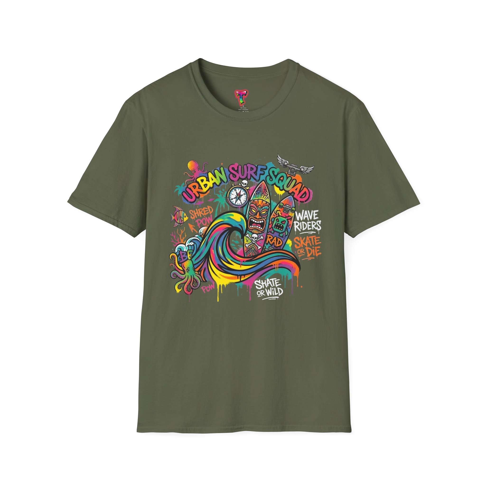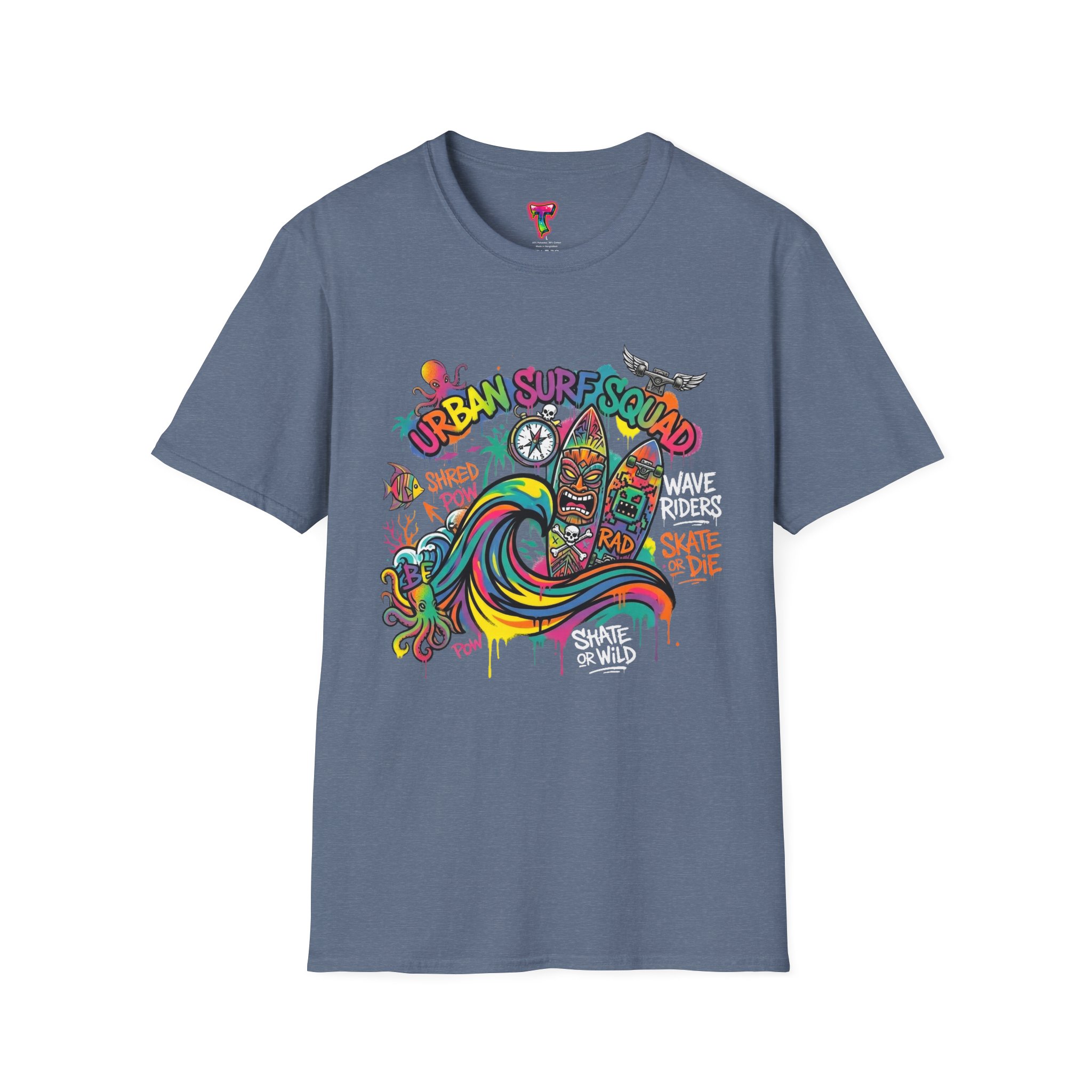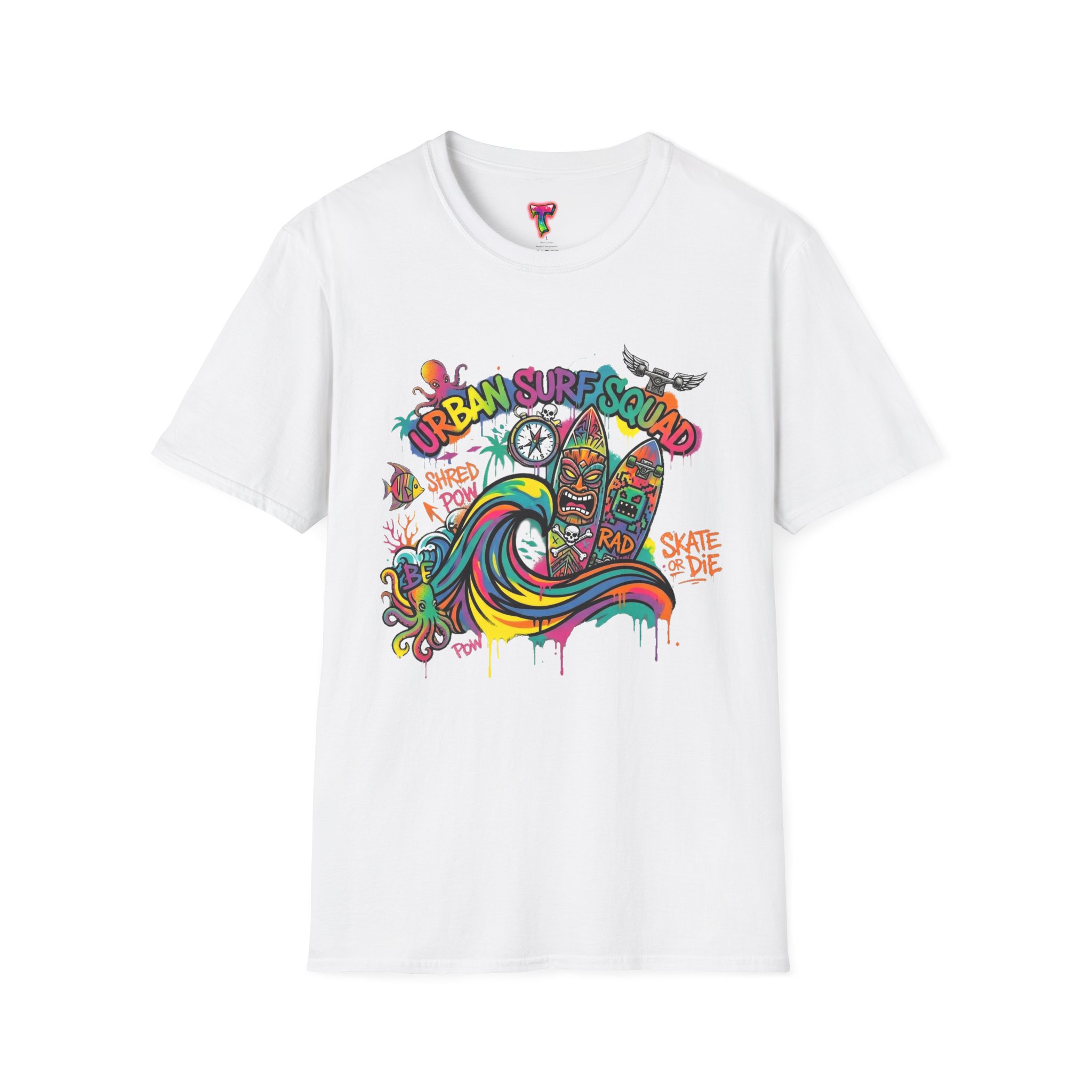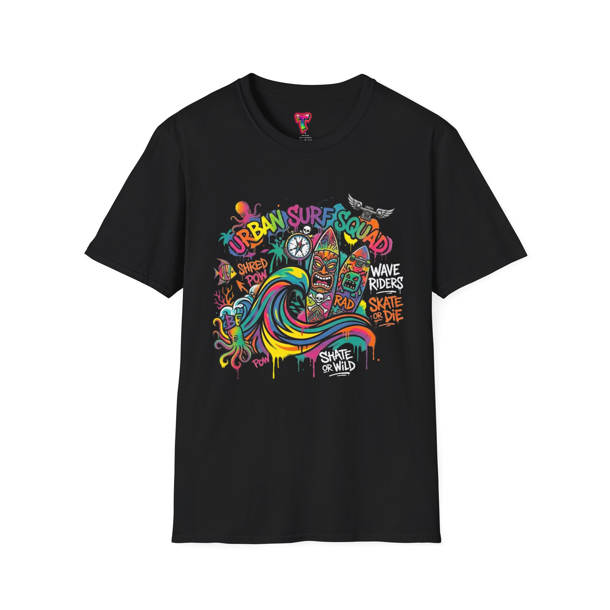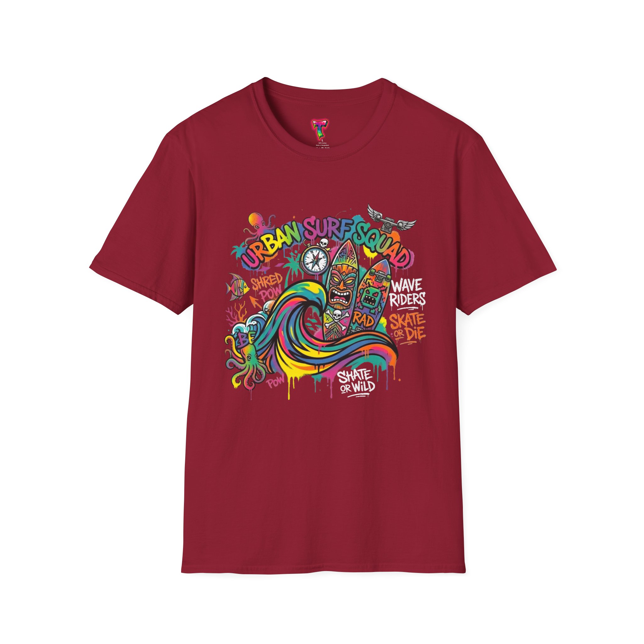 This lightweight cotton tee carries a sun-soaked skate-surf spirit in every stitch. Bright, hand-drawn artwork—colorful waves, twin longboards and graffiti accents—sits at the center chest, bringing streetwise aloha to everyday wear. The crew neck and classic cut keep the silhouette clean so the art can do the talking. Wear it to the boardwalk, a session at the skatepark, or when you want a casual, lively layer that feels broken-in from the first wear. Breathable, soft ring-spun cotton and tear-away label mean comfort without distraction. Let this shirt be the canvas for active days, salty air, and neighborhood hangouts.