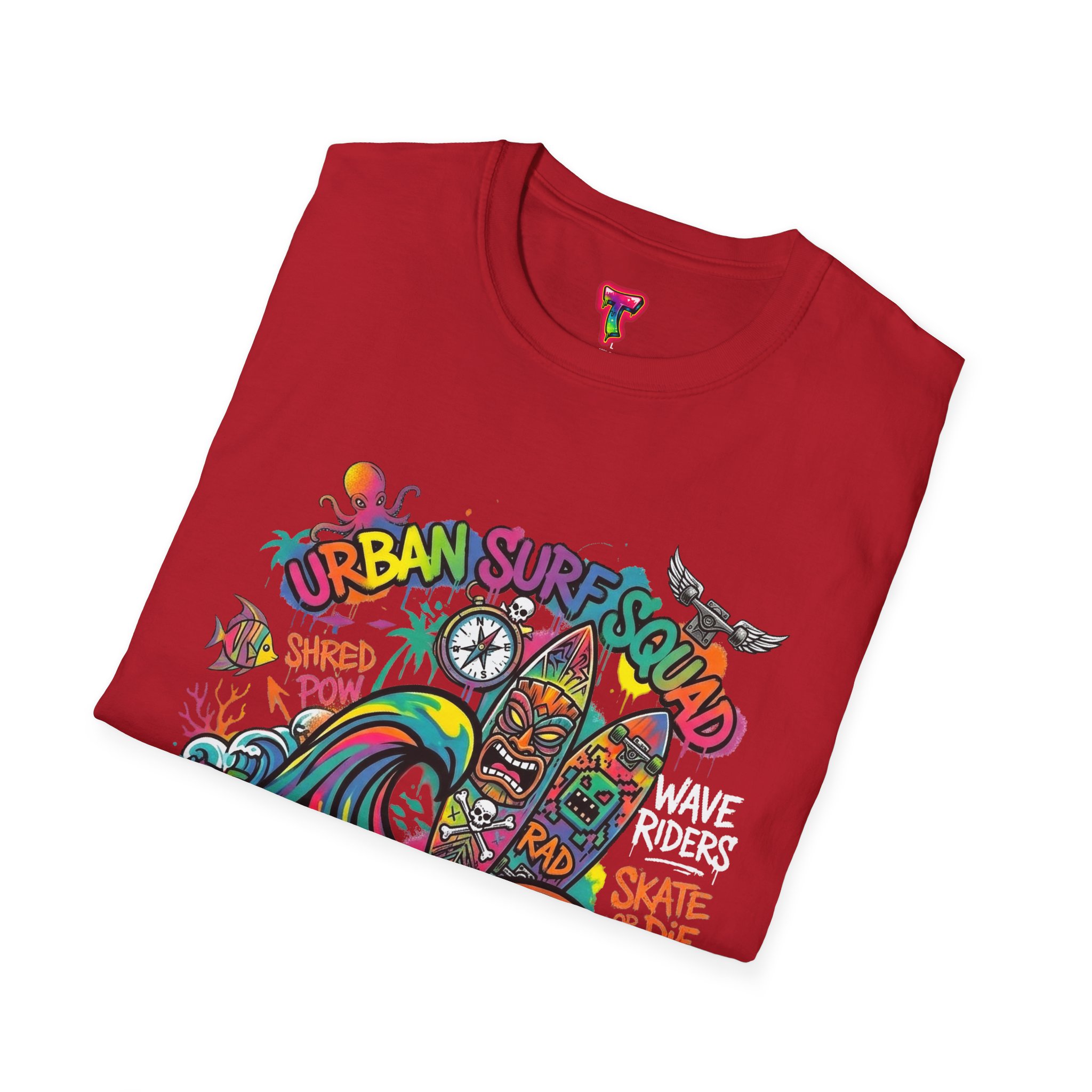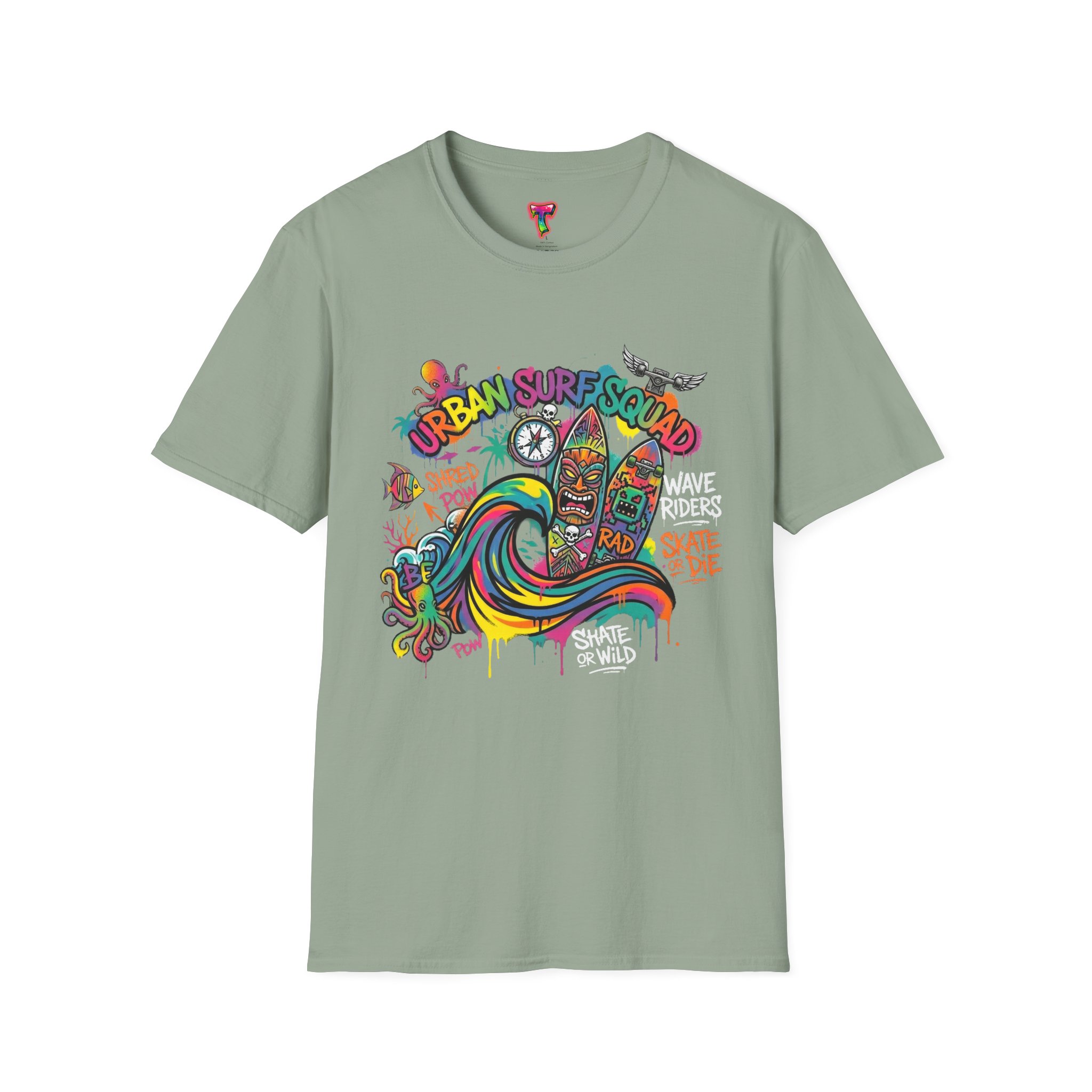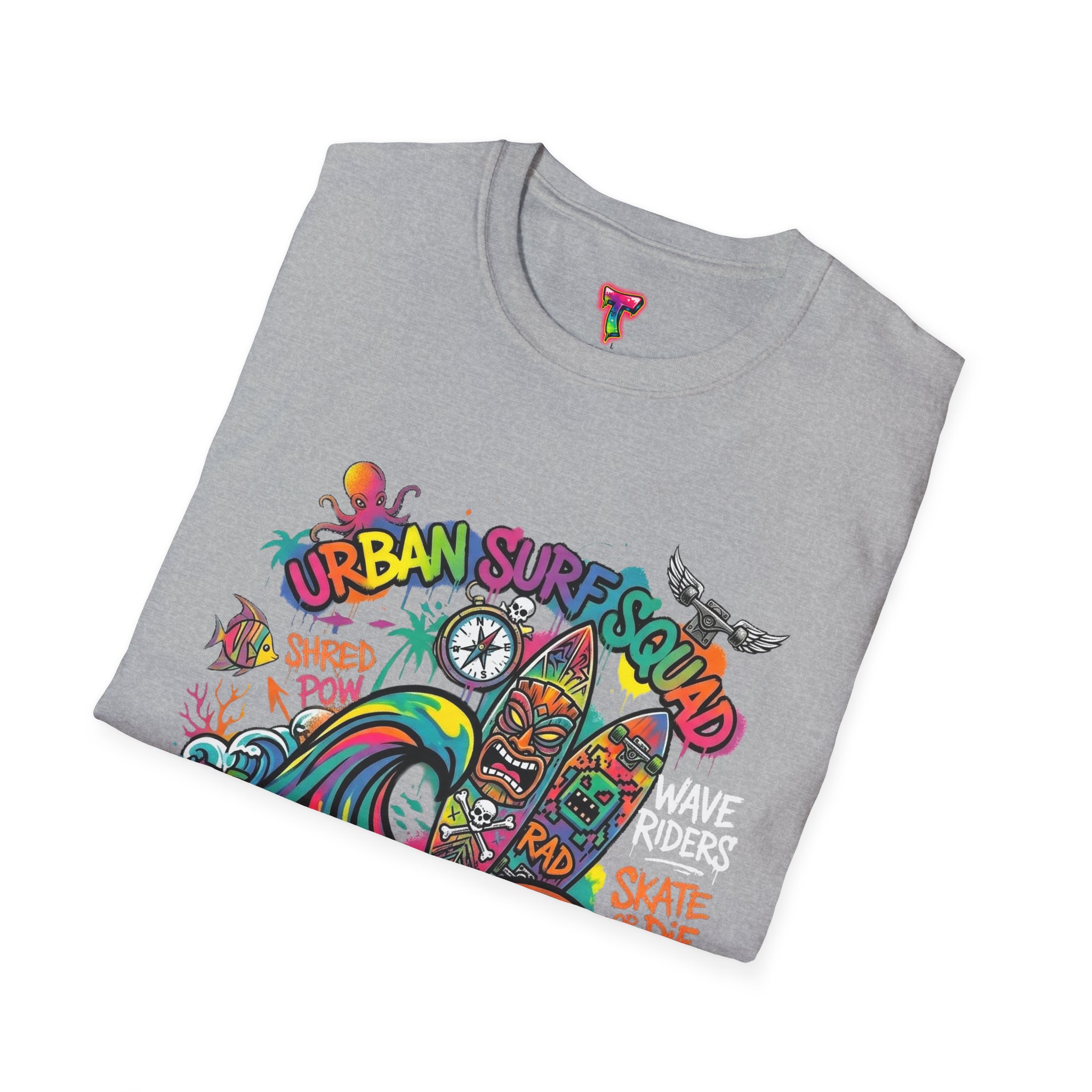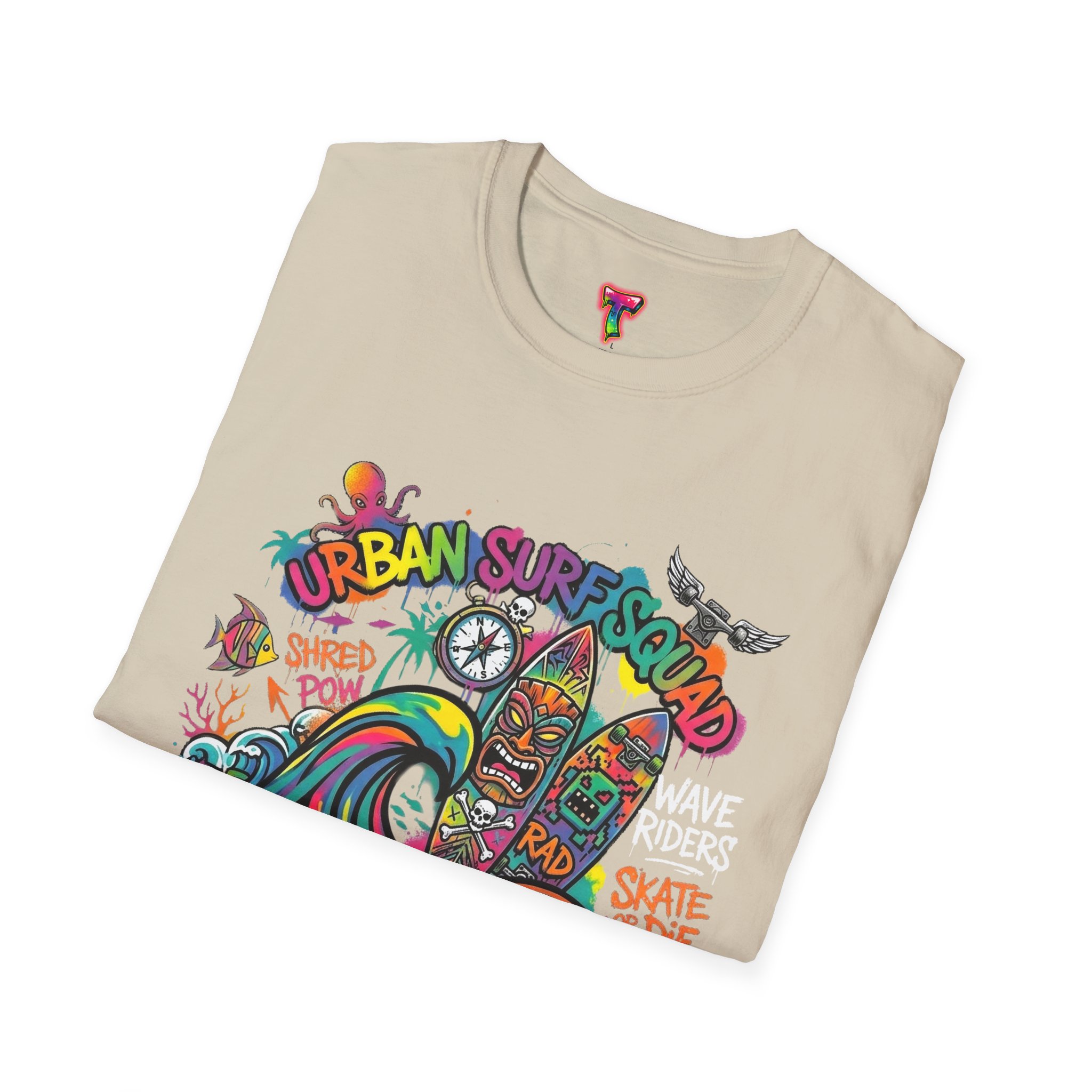 This lightweight cotton tee carries a sun-soaked skate-surf spirit in every stitch. Bright, hand-drawn artwork—colorful waves, twin longboards and graffiti accents—sits at the center chest, bringing streetwise aloha to everyday wear. The crew neck and classic cut keep the silhouette clean so the art can do the talking. Wear it to the boardwalk, a session at the skatepark, or when you want a casual, lively layer that feels broken-in from the first wear. Breathable, soft ring-spun cotton and tear-away label mean comfort without distraction. Let this shirt be the canvas for active days, salty air, and neighborhood hangouts.