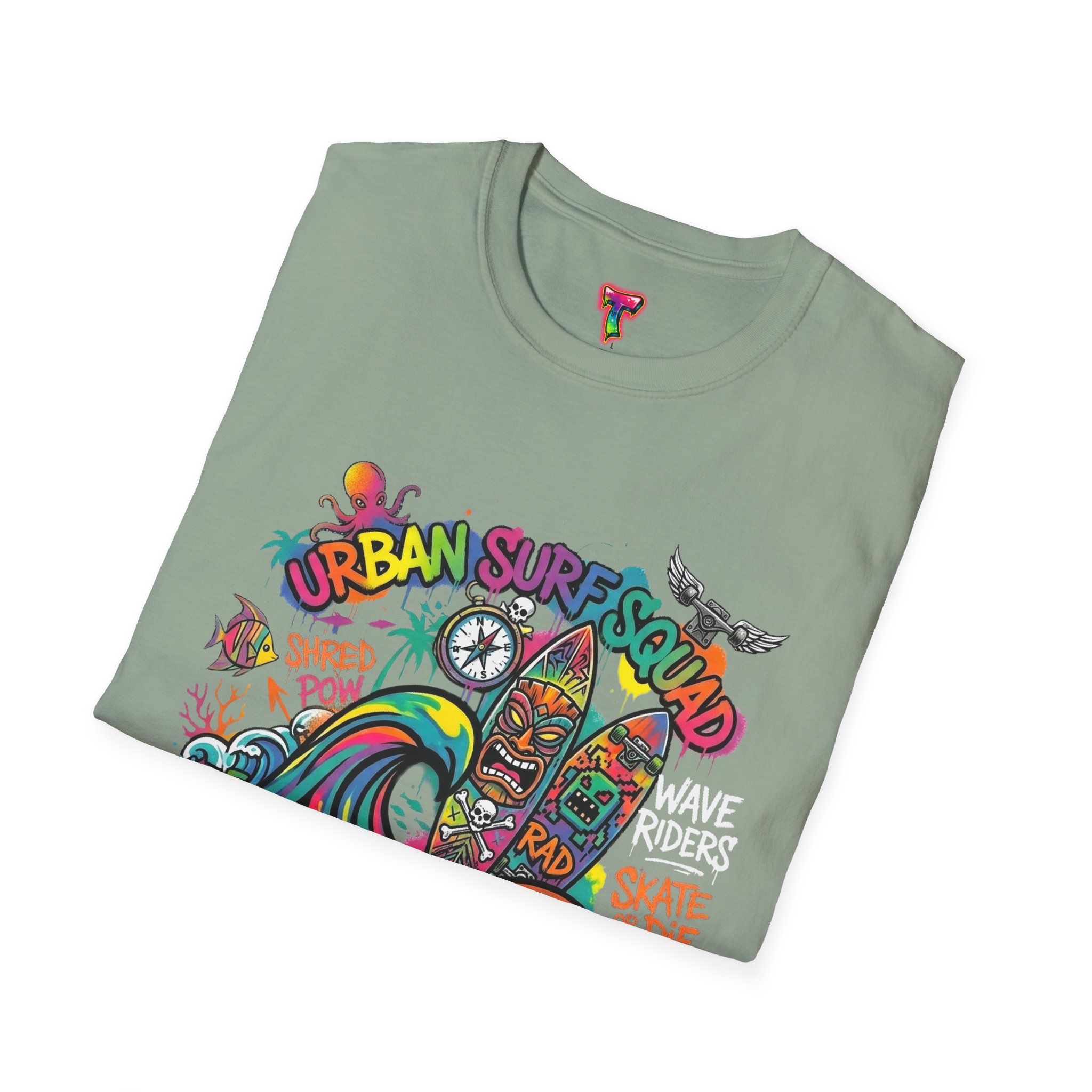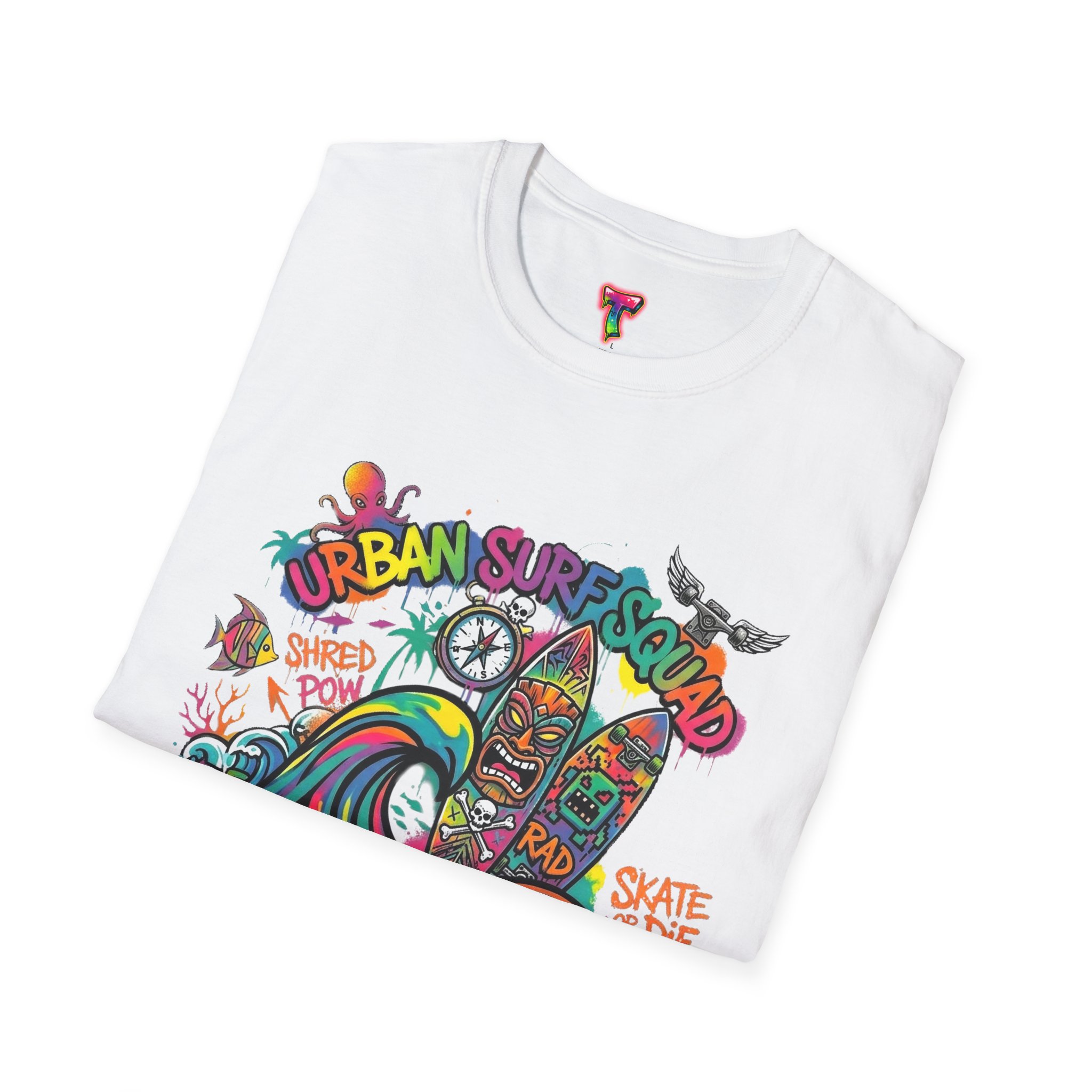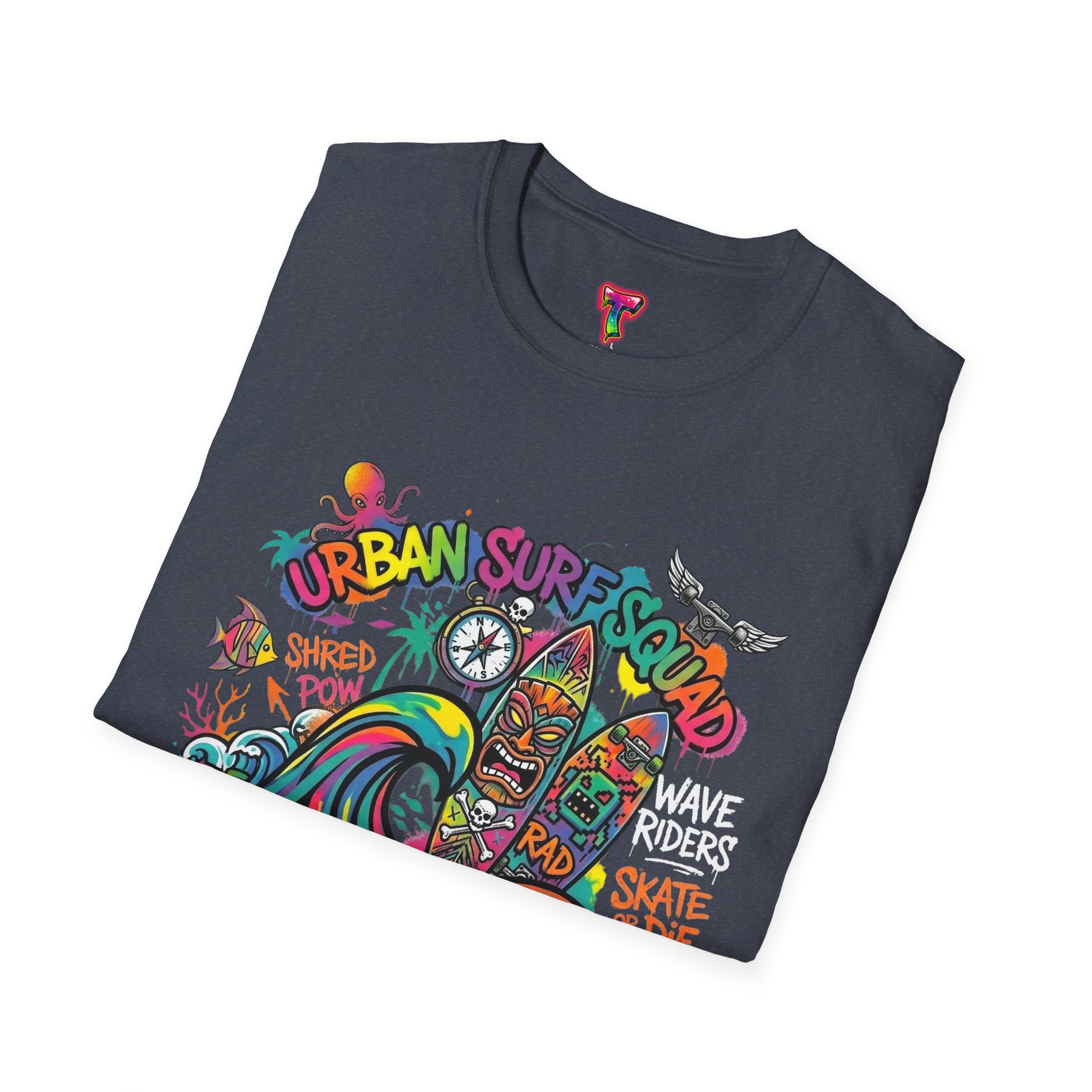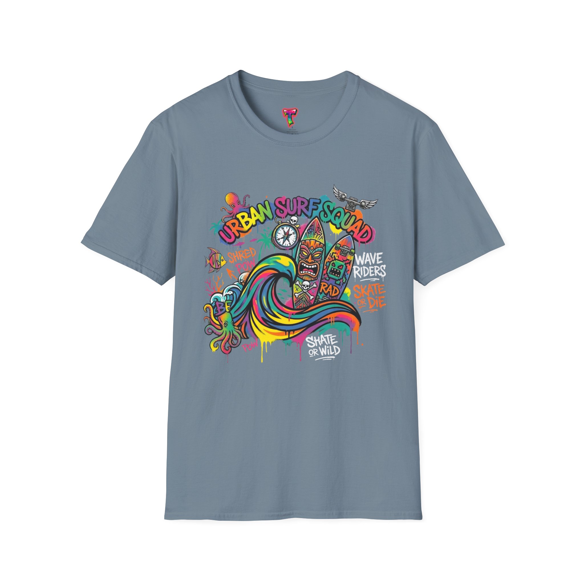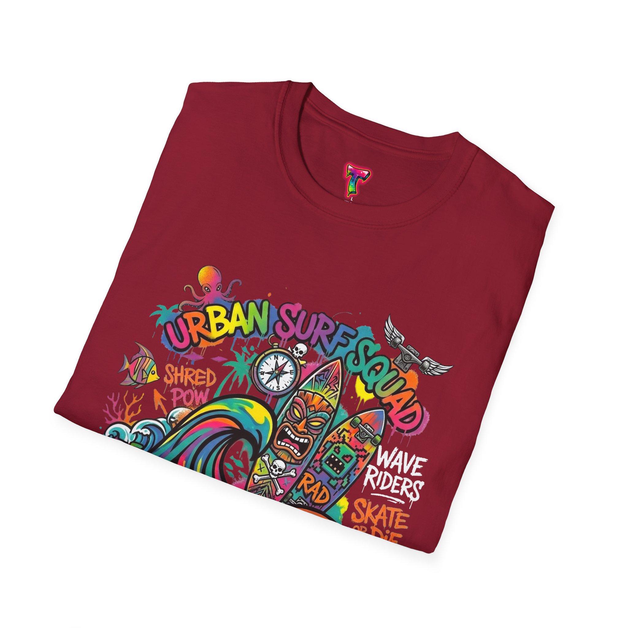 This lightweight cotton tee carries a sun-soaked skate-surf spirit in every stitch. Bright, hand-drawn artwork—colorful waves, twin longboards and graffiti accents—sits at the center chest, bringing streetwise aloha to everyday wear. The crew neck and classic cut keep the silhouette clean so the art can do the talking. Wear it to the boardwalk, a session at the skatepark, or when you want a casual, lively layer that feels broken-in from the first wear. Breathable, soft ring-spun cotton and tear-away label mean comfort without distraction. Let this shirt be the canvas for active days, salty air, and neighborhood hangouts.