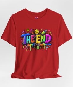 Bright, bold, and a little mischievous — this tee speaks loud without shouting. A soft, lightweight cotton canvas holds a graffiti-style “THE END” splash in neon colors, dripping paint, smiley faces and dollar signs. It feels like a last-scene mic drop: playful, ironic, and unapologetically expressive. Wear it on easy days when you want your outfit to do the talking — whether you’re meeting friends for coffee, wandering an art walk, or layering for an evening out. The clean crew neckline and straight retail fit let the artwork stay center stage while keeping comfort front and center.