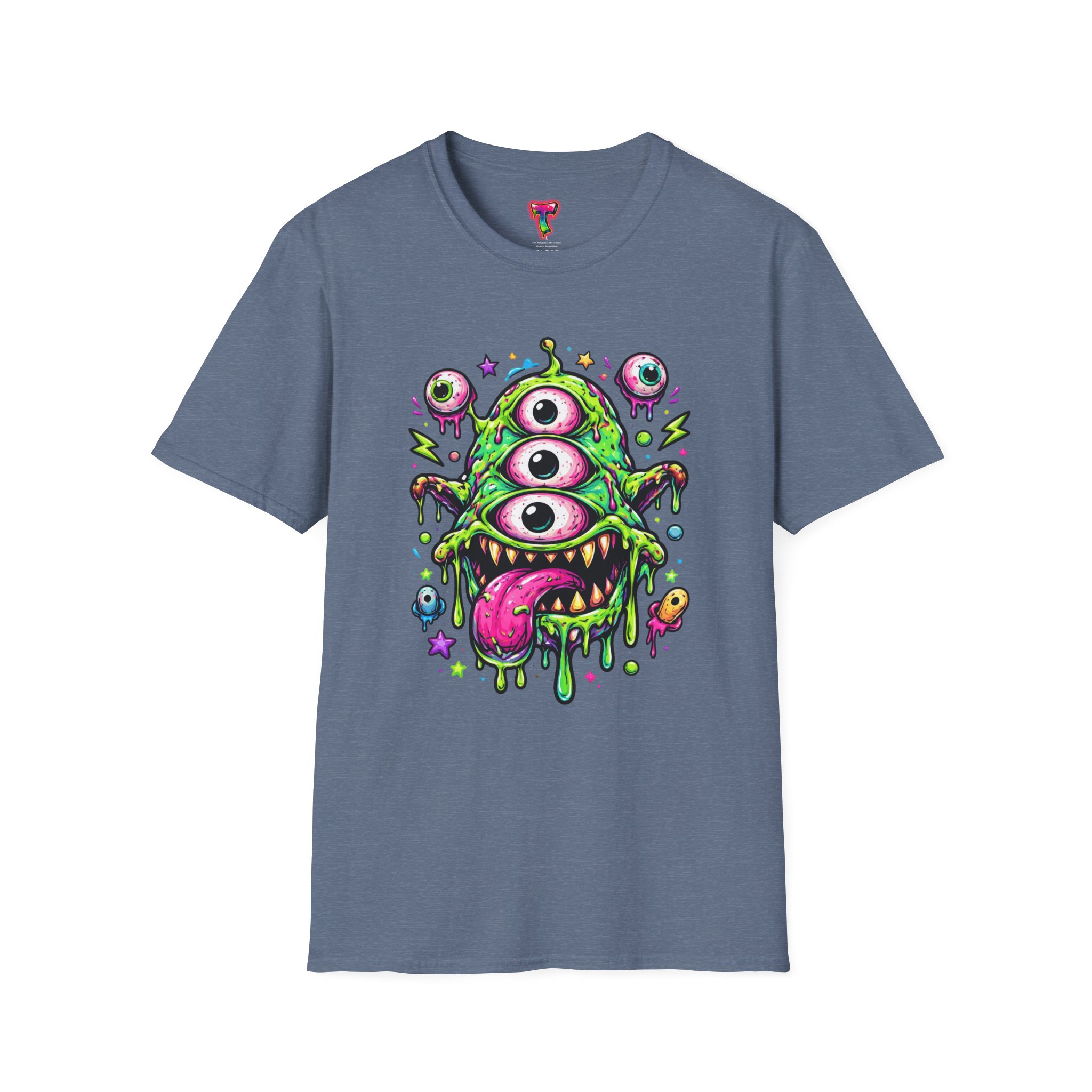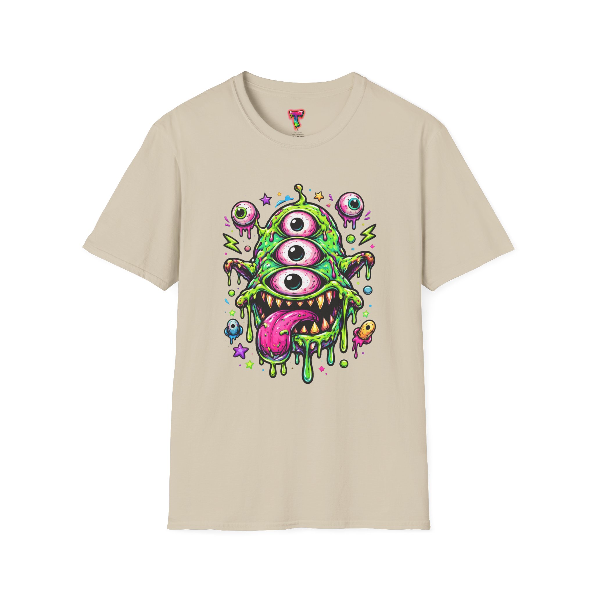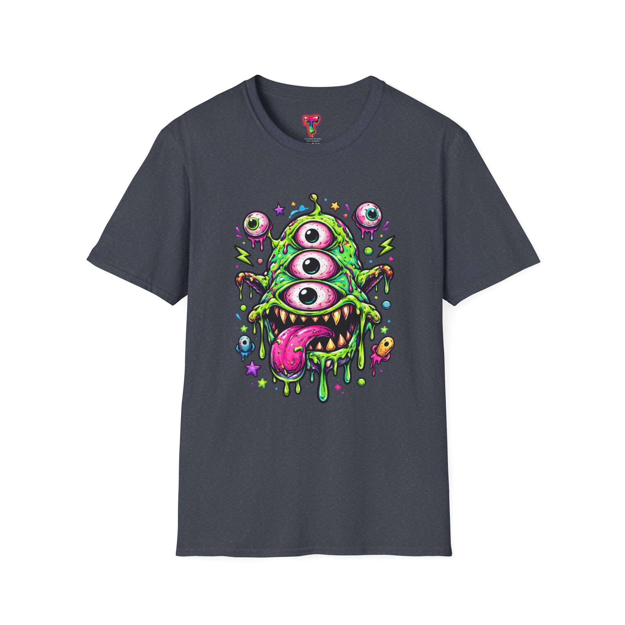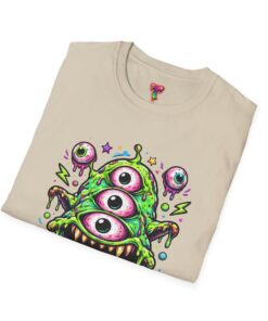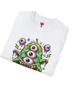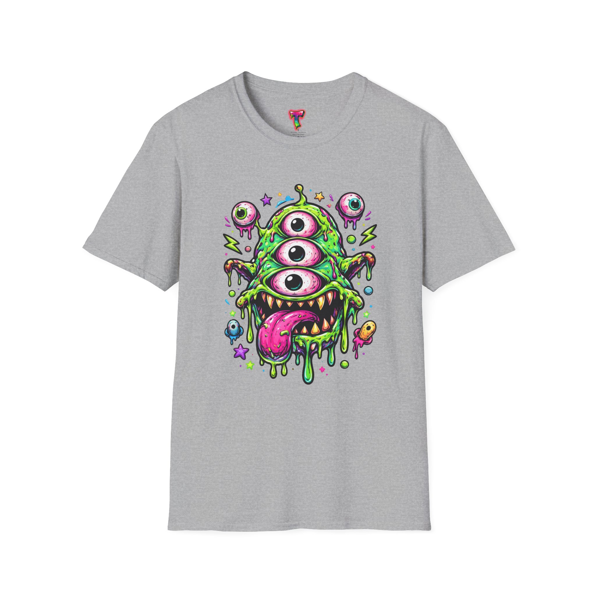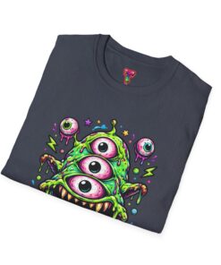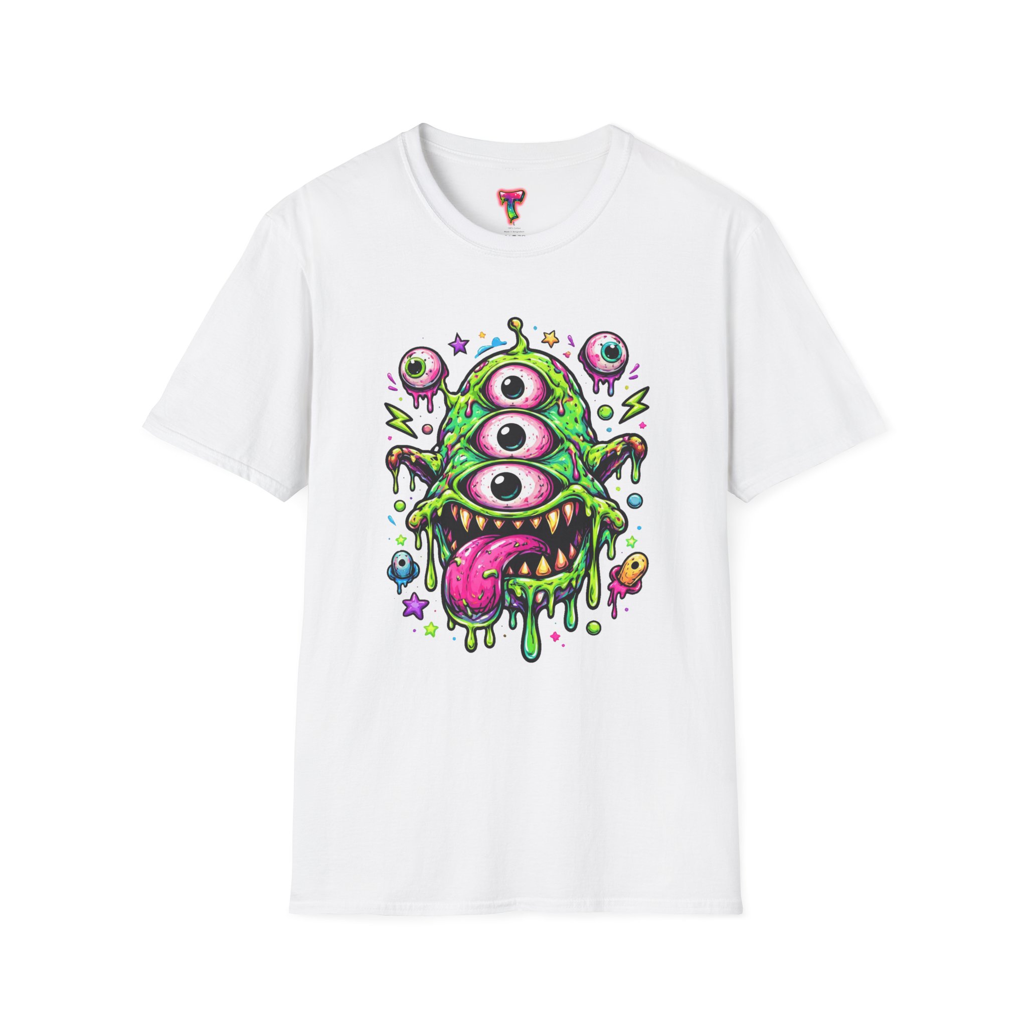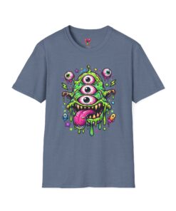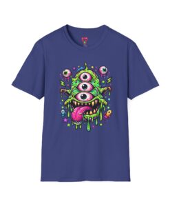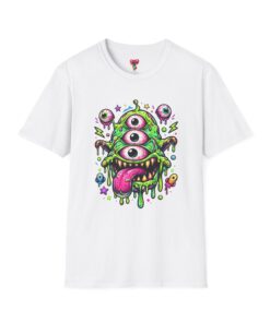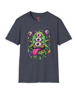 This lightweight cotton tee brings a wild, playful edge to everyday wear. A vivid, dripping three-eyed monster in neon greens and pinks bursts from the chest, its gooey textures and popped-out eyeballs giving the shirt a skate-punk, underground-art vibe. The soft ring-spun cotton feels airy against the skin while the clean crew neckline and classic fit keep the silhouette easy and wearable. Wear it to shows, late-night hangs, or while sketching in the studio — it reads loud without trying too hard and layers smoothly under a flannel or denim jacket.